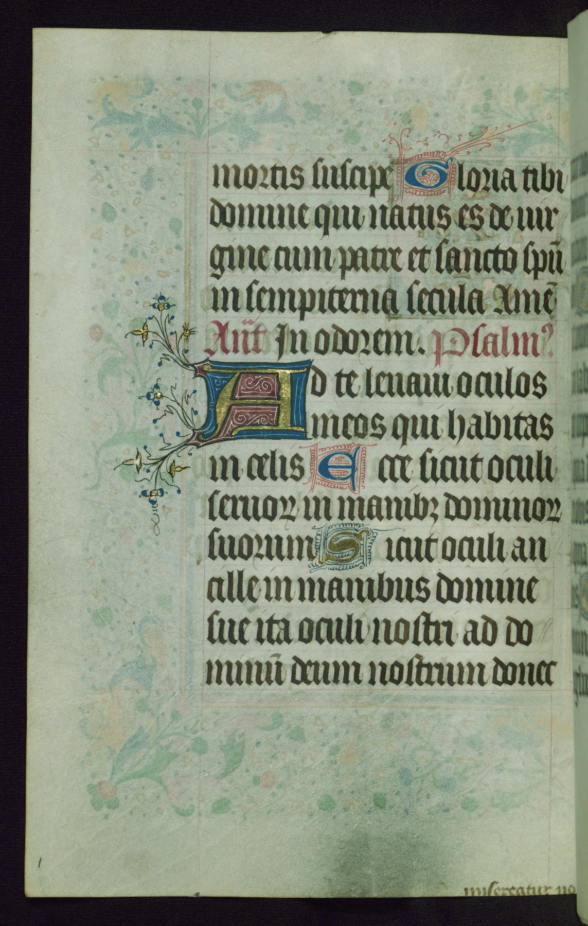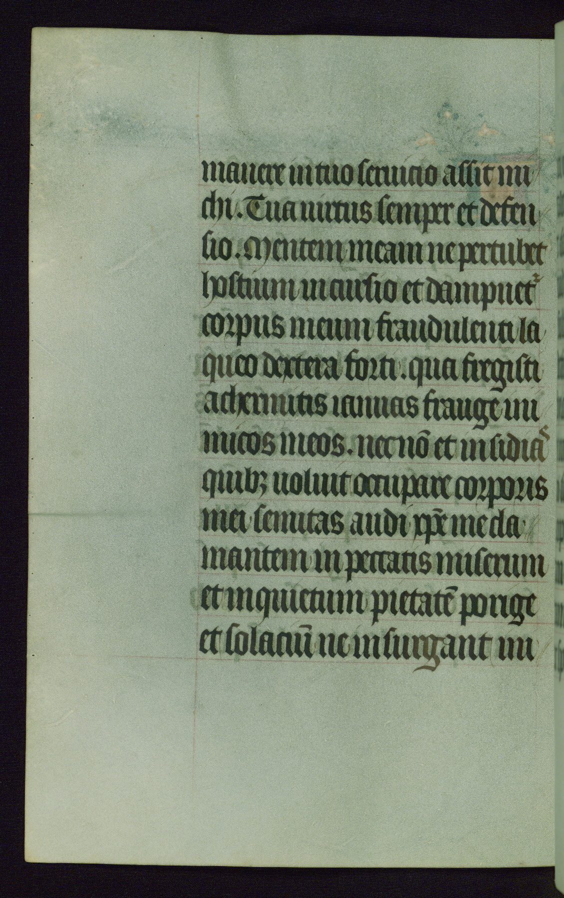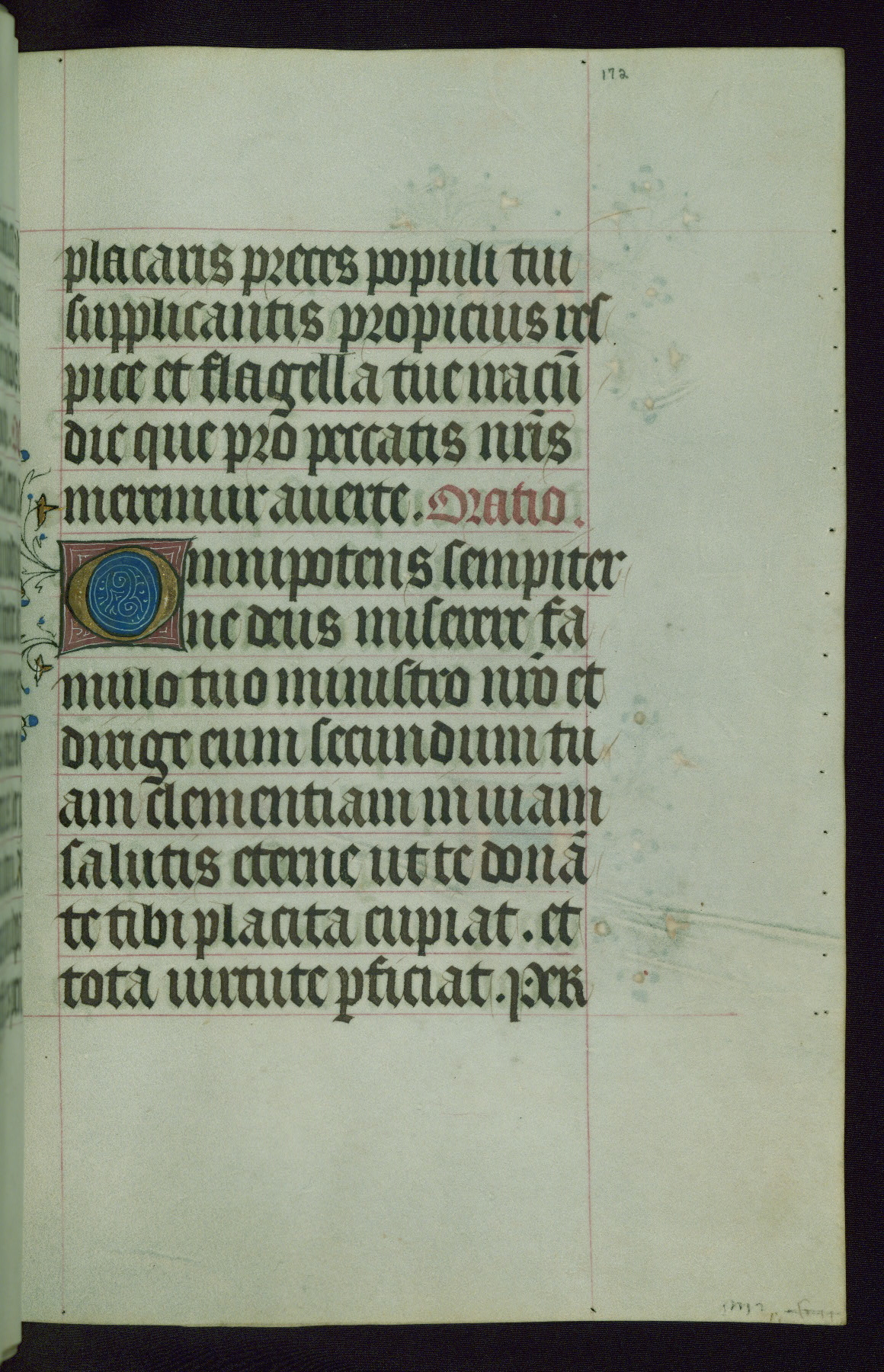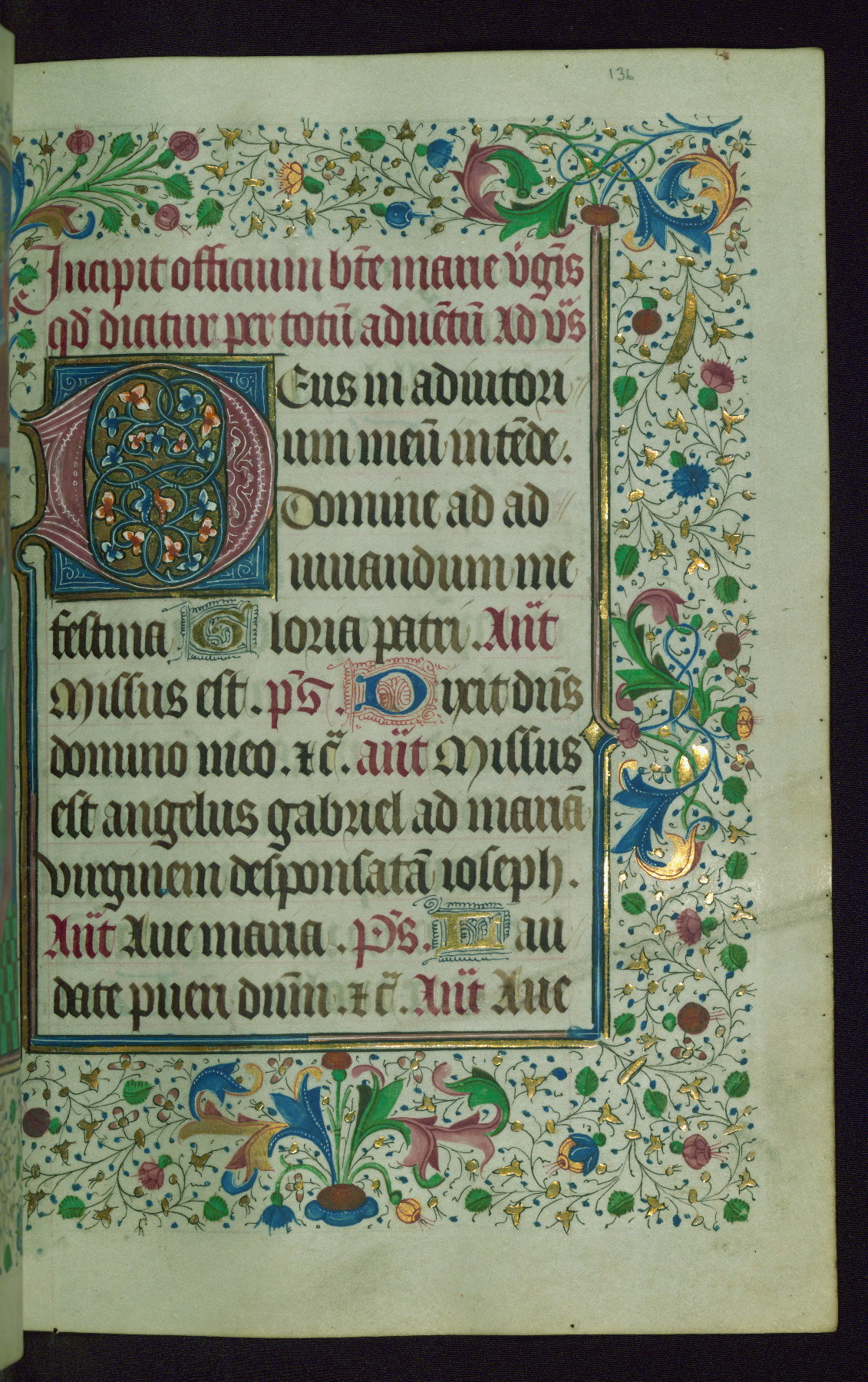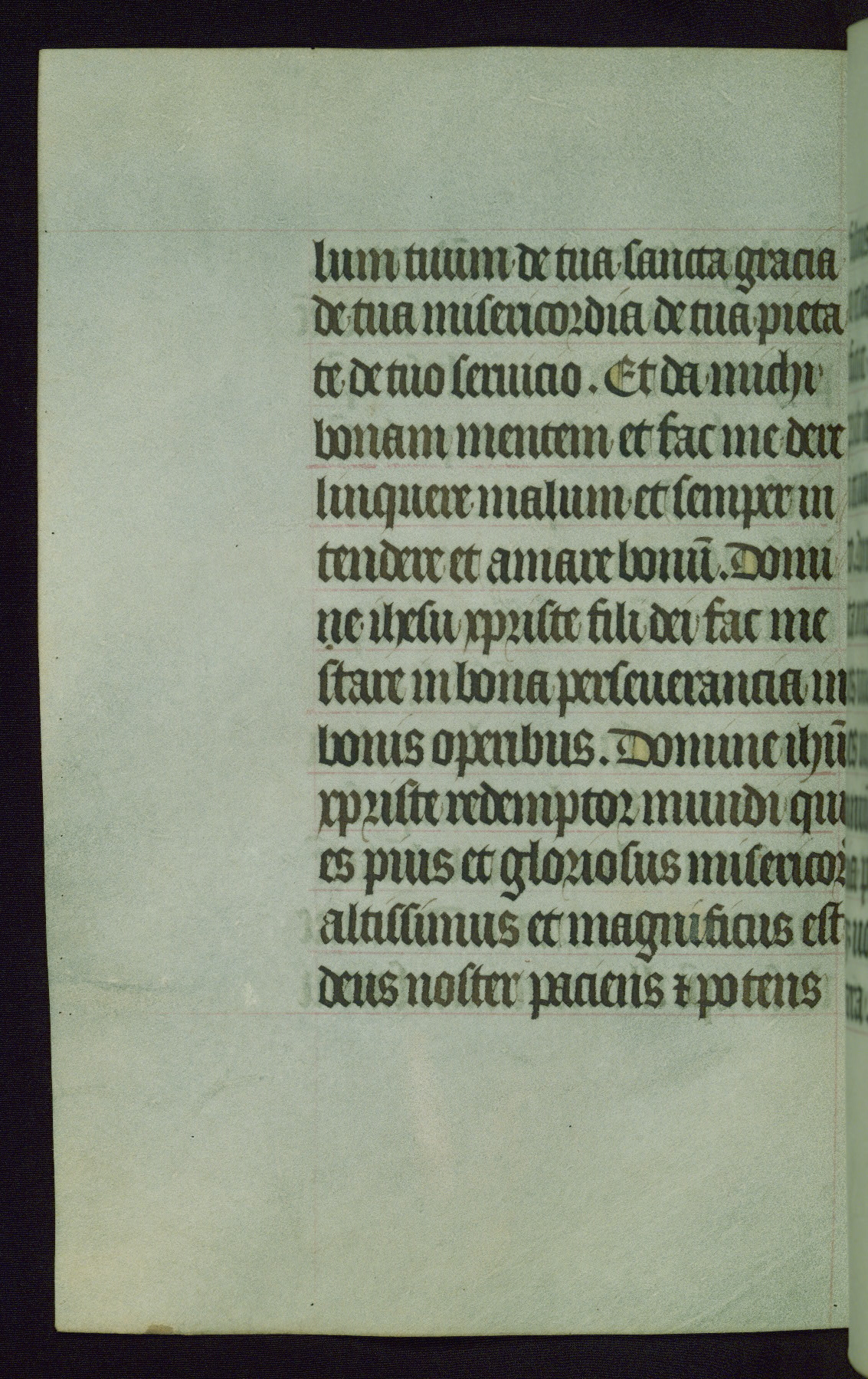 This Book of Hours, ca. 1460, was completed for use of Rome and illuminated under the influence, if not the direct participation, of Willem Vrelant. There remain twenty-two extant marginal calendar illustrations, thirteen extant full-page miniatures (many of which are paired with opening suffrages, perhaps suggesting a certain amount of significance to the owner), and one historiated initial. The contemporary binding, signed Livinus Stuaert, is dated 1477 and is most likely of Bruges or Ghent origin. It is thought that the first owner was French due to the French headings throughout and prominent fleur-de-lis figurations decorating the binding. Further, the first owner was likely female, suggested by the ways in which the book was structured to facilitate legibility. This is evinced by the large size of the script and the lack of abbreviations. While much of the text is standard, there remains evidence of personal significance and preference. This is seen in the chosen illuminations for those sections that are most significant to the owner. Most illuminations are paired with the opening page of staple Hours; however, many are accompanied by individual suffrages, constituting a large portion of the beginning of the manuscript. Personal preference is also shown in those sections of text that stray from the standard. The devotional sequence of this manuscript is notable for its sheer length and diversity of prayers as well as its inclusion of a French prayer not of official liturgy (fols. 215r-219v). The first collection of three prayers is headed and written in French. The prayer is attributed to St. Augustine and is described to guarantee a transformation of tribulation into joy through Christ's mercy, but only if the suppliant recites the prayer for thirty consecutive days. While it is not uncommon for evidence of an owner's predilections to surface in a Book of Hours, the particularly divergent features of this book allow readers to glean an intimate view of the patron.