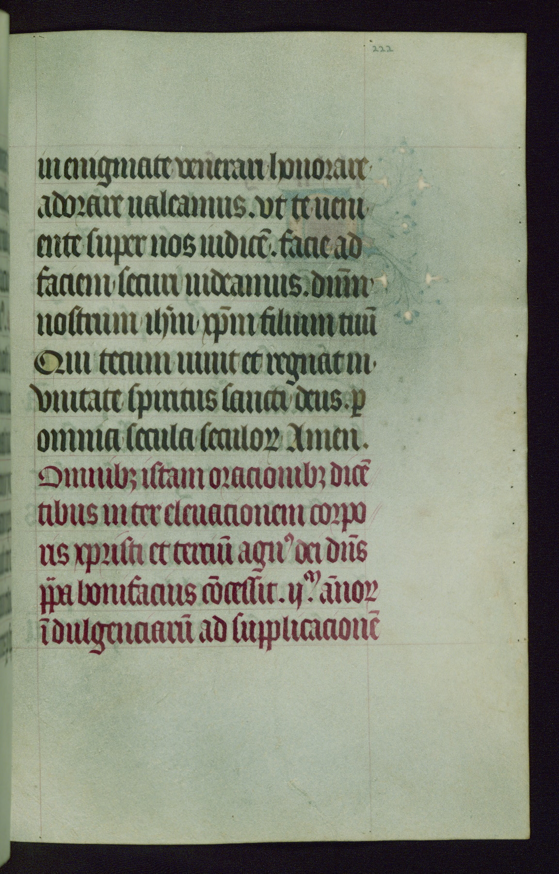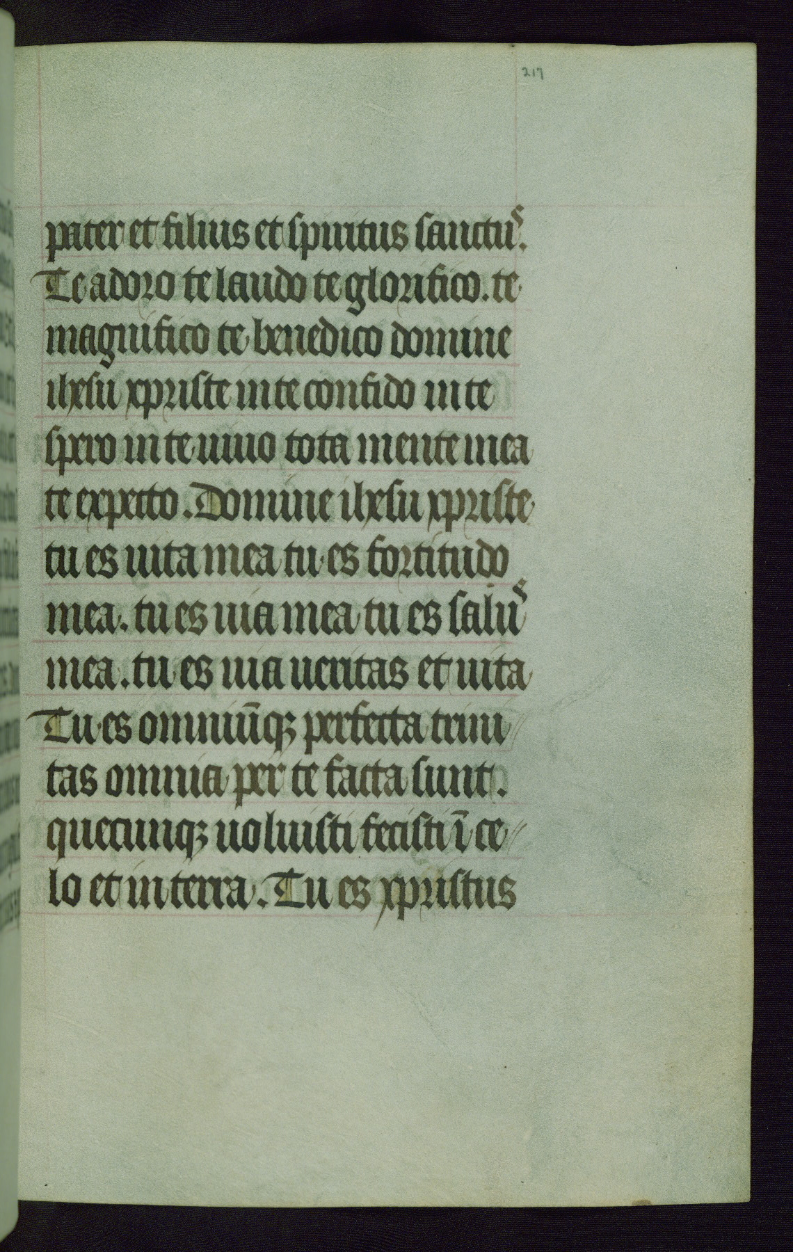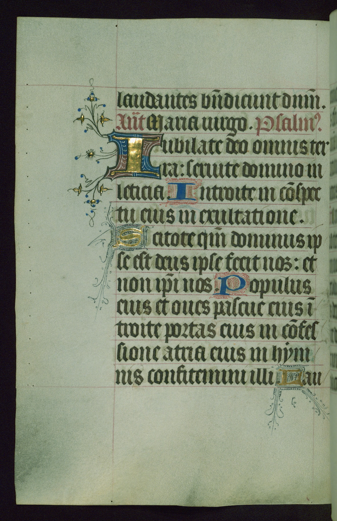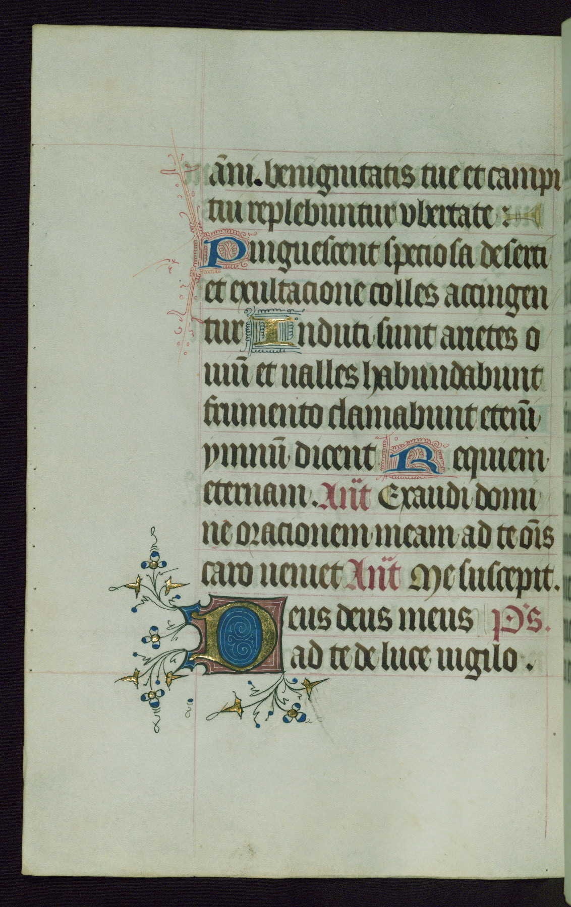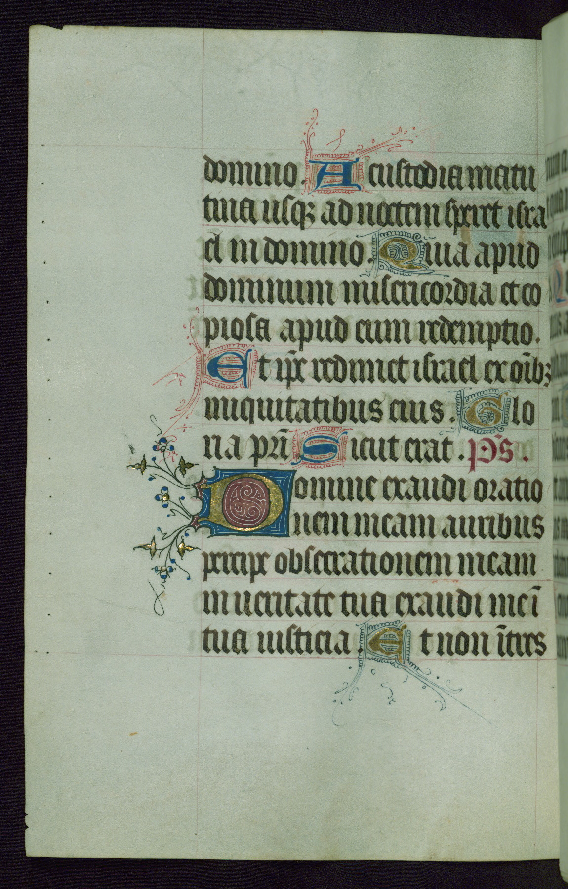 This Book of Hours, ca. 1460, was completed for use of Rome and illuminated under the influence, if not the direct participation, of Willem Vrelant. There remain twenty-two extant marginal calendar illustrations, thirteen extant full-page miniatures (many of which are paired with opening suffrages, perhaps suggesting a certain amount of significance to the owner), and one historiated initial. The contemporary binding, signed Livinus Stuaert, is dated 1477 and is most likely of Bruges or Ghent origin. It is thought that the first owner was French due to the French headings throughout and prominent fleur-de-lis figurations decorating the binding. Further, the first owner was likely female, suggested by the ways in which the book was structured to facilitate legibility. This is evinced by the large size of the script and the lack of abbreviations. While much of the text is standard, there remains evidence of personal significance and preference. This is seen in the chosen illuminations for those sections that are most significant to the owner. Most illuminations are paired with the opening page of staple Hours; however, many are accompanied by individual suffrages, constituting a large portion of the beginning of the manuscript. Personal preference is also shown in those sections of text that stray from the standard. The devotional sequence of this manuscript is notable for its sheer length and diversity of prayers as well as its inclusion of a French prayer not of official liturgy (fols. 215r-219v). The first collection of three prayers is headed and written in French. The prayer is attributed to St. Augustine and is described to guarantee a transformation of tribulation into joy through Christ's mercy, but only if the suppliant recites the prayer for thirty consecutive days. While it is not uncommon for evidence of an owner's predilections to surface in a Book of Hours, the particularly divergent features of this book allow readers to glean an intimate view of the patron.