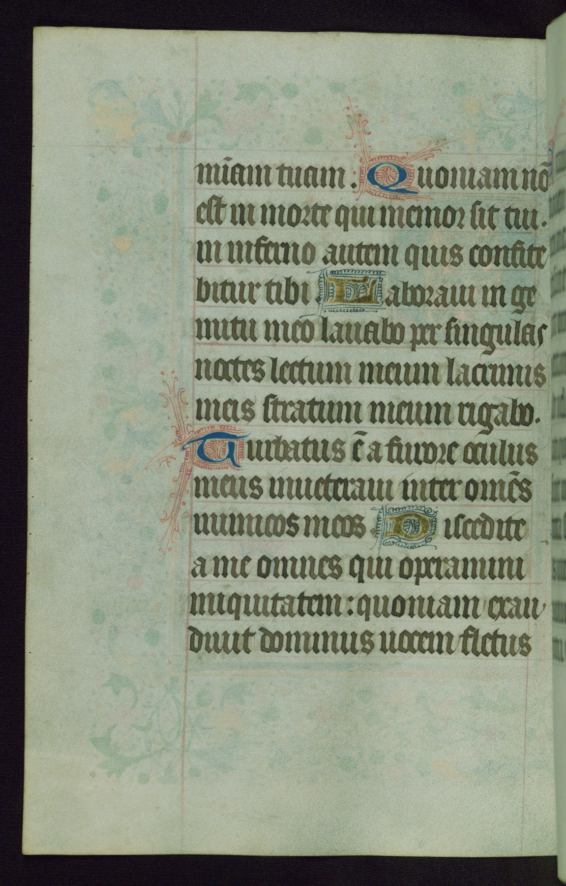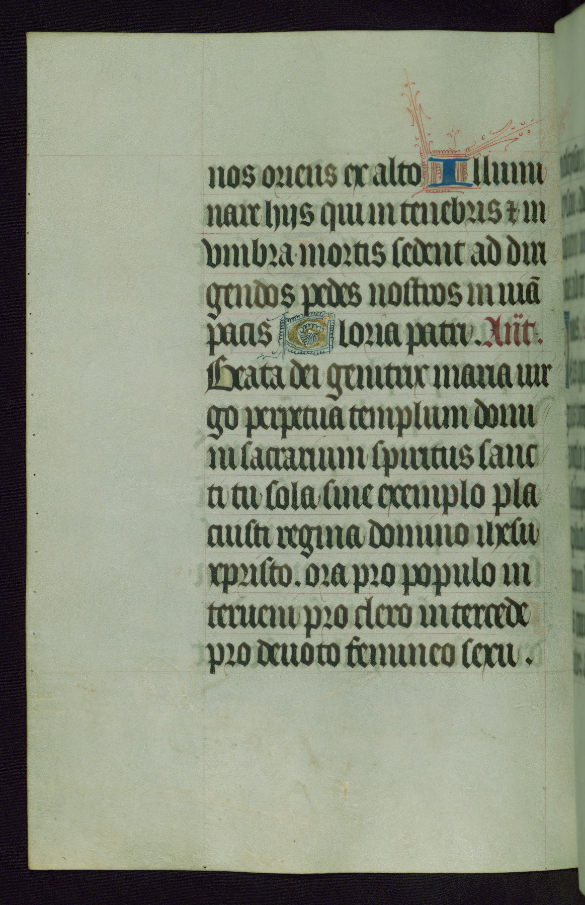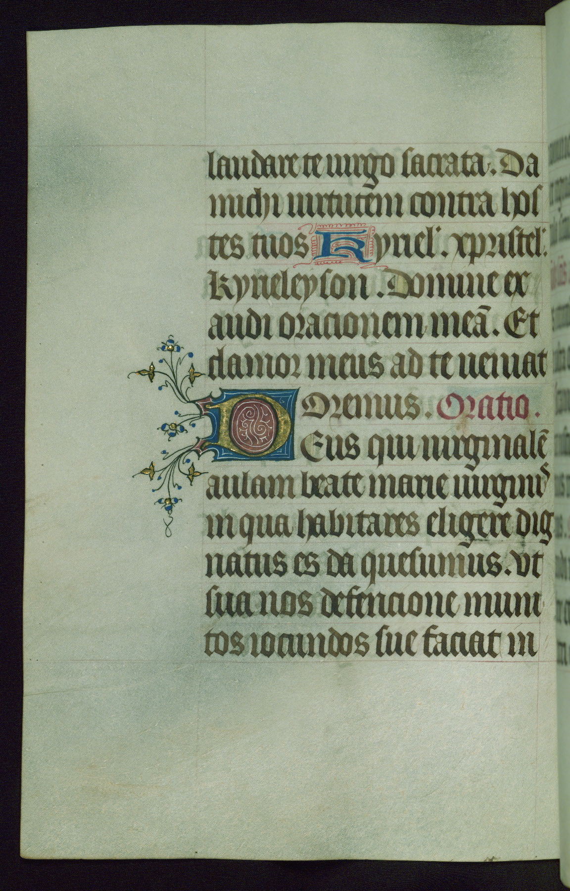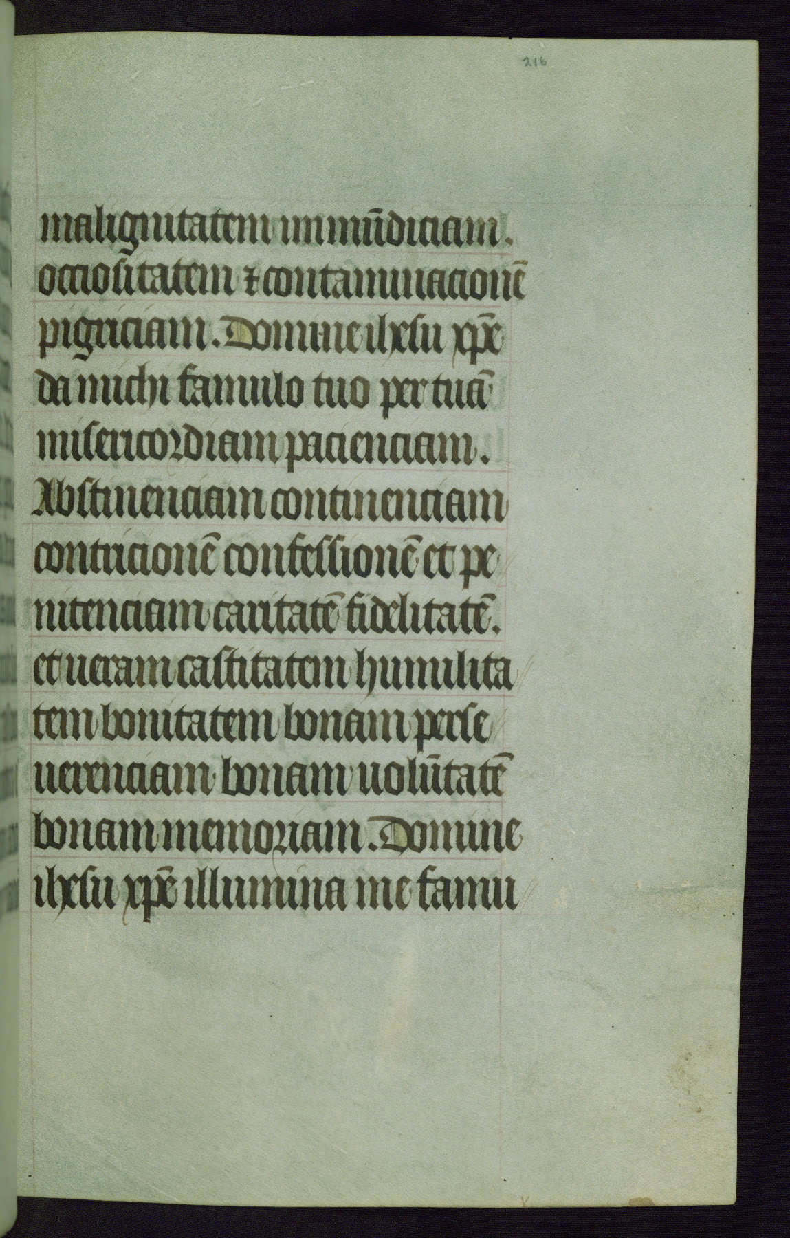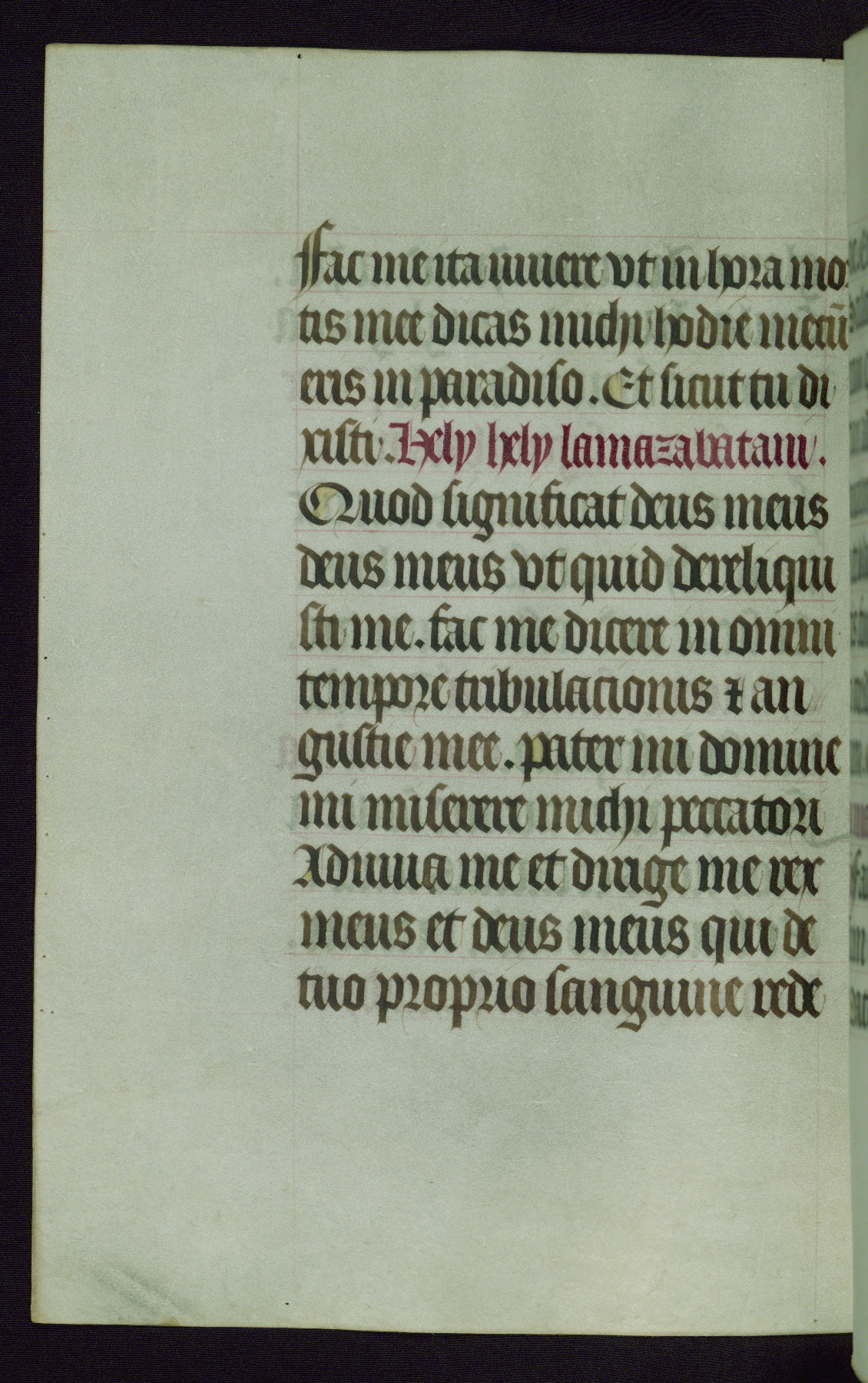 This Book of Hours, ca. 1460, was completed for use of Rome and illuminated under the influence, if not the direct participation, of Willem Vrelant. There remain twenty-two extant marginal calendar illustrations, thirteen extant full-page miniatures (many of which are paired with opening suffrages, perhaps suggesting a certain amount of significance to the owner), and one historiated initial. The contemporary binding, signed Livinus Stuaert, is dated 1477 and is most likely of Bruges or Ghent origin. It is thought that the first owner was French due to the French headings throughout and prominent fleur-de-lis figurations decorating the binding. Further, the first owner was likely female, suggested by the ways in which the book was structured to facilitate legibility. This is evinced by the large size of the script and the lack of abbreviations. While much of the text is standard, there remains evidence of personal significance and preference. This is seen in the chosen illuminations for those sections that are most significant to the owner. Most illuminations are paired with the opening page of staple Hours; however, many are accompanied by individual suffrages, constituting a large portion of the beginning of the manuscript. Personal preference is also shown in those sections of text that stray from the standard. The devotional sequence of this manuscript is notable for its sheer length and diversity of prayers as well as its inclusion of a French prayer not of official liturgy (fols. 215r-219v). The first collection of three prayers is headed and written in French. The prayer is attributed to St. Augustine and is described to guarantee a transformation of tribulation into joy through Christ's mercy, but only if the suppliant recites the prayer for thirty consecutive days. While it is not uncommon for evidence of an owner's predilections to surface in a Book of Hours, the particularly divergent features of this book allow readers to glean an intimate view of the patron.
