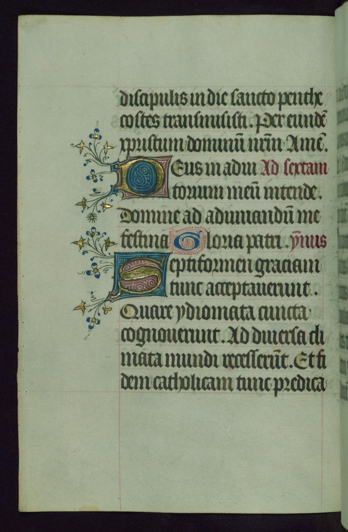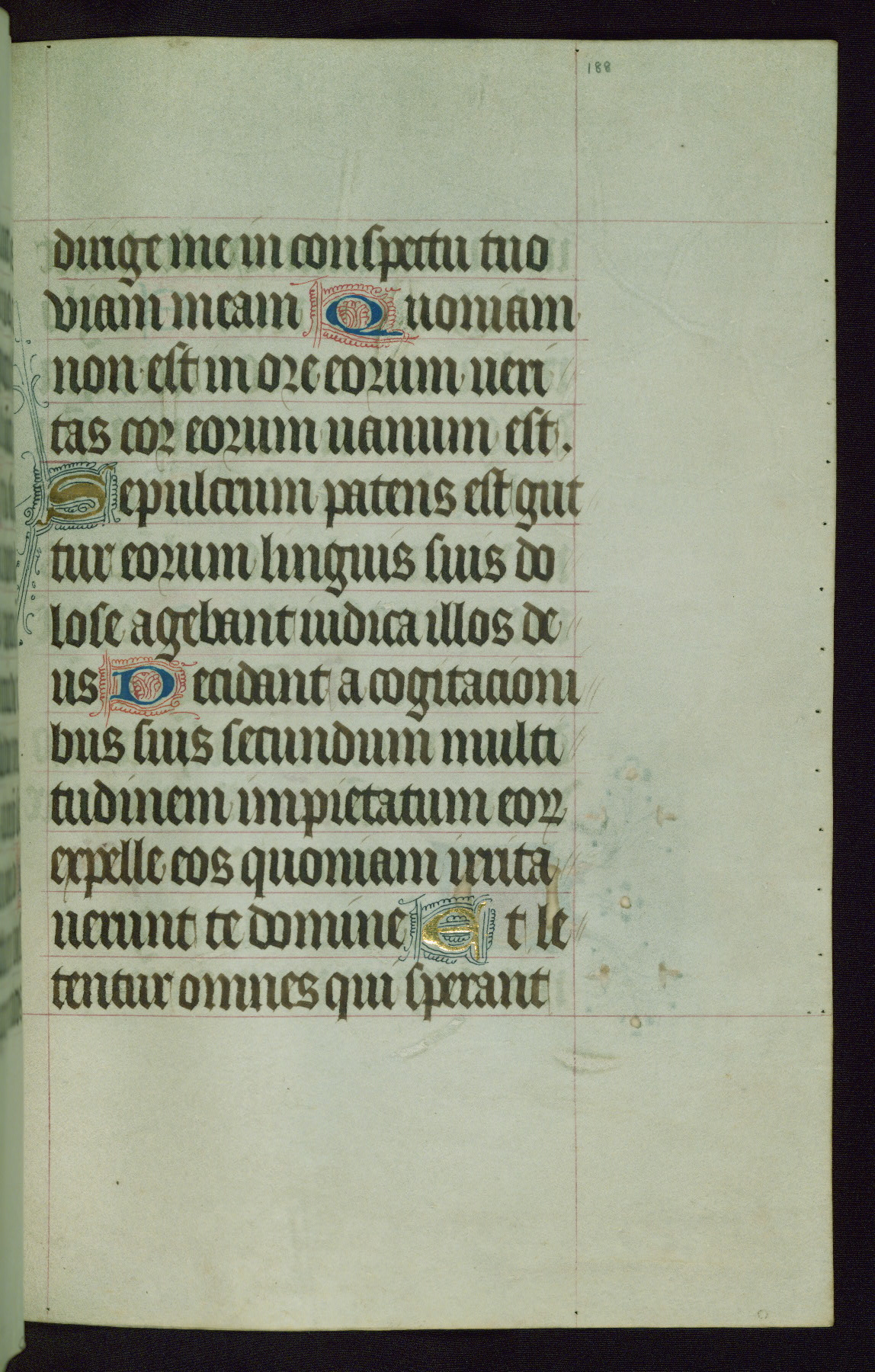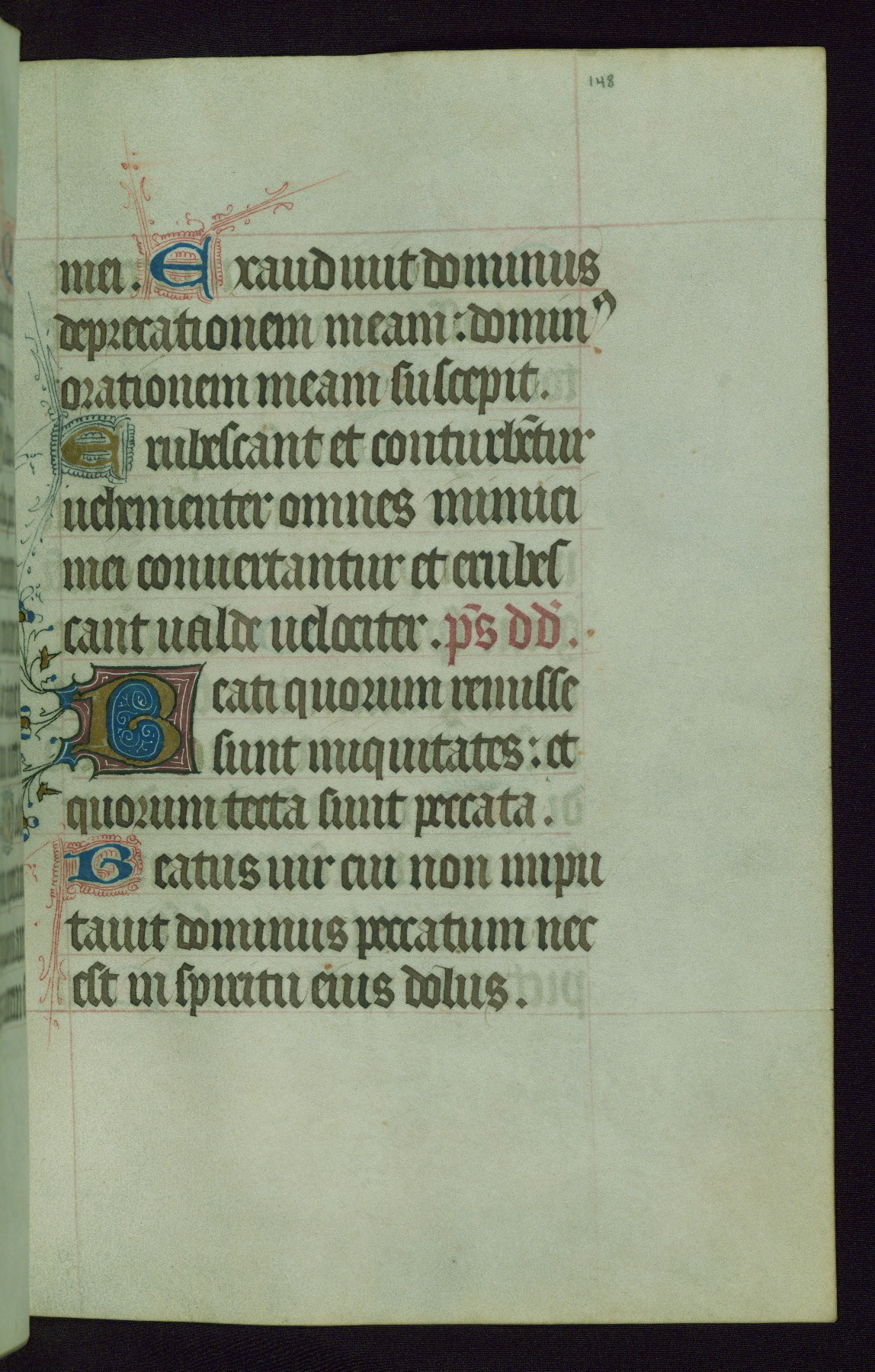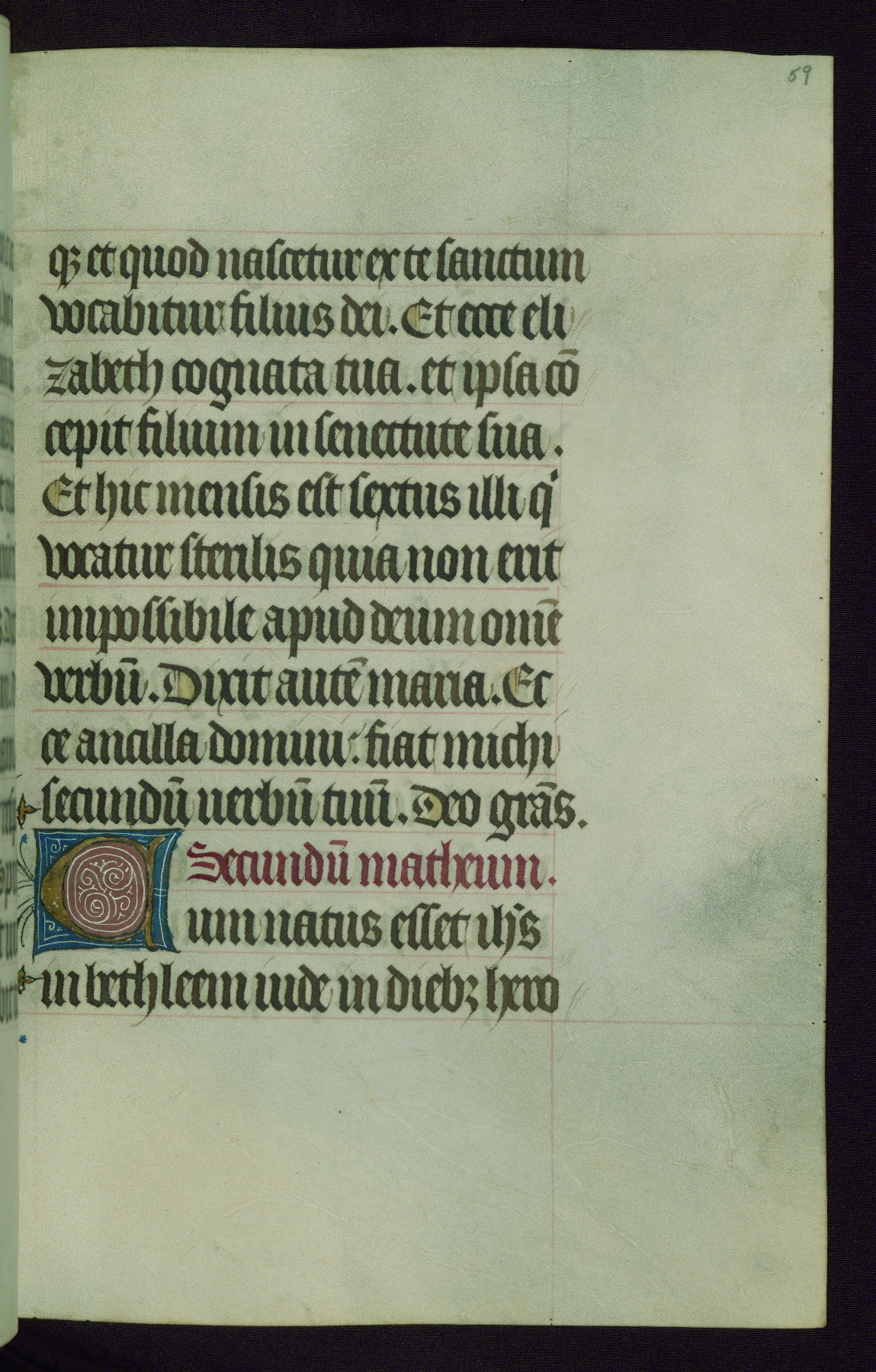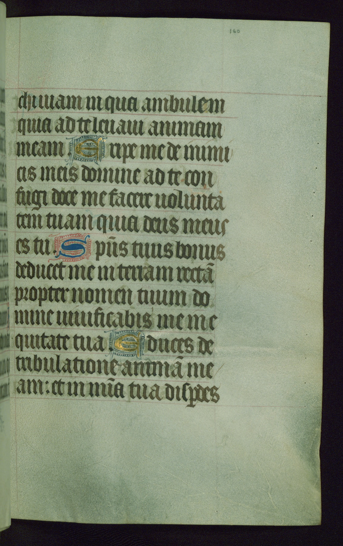 This Book of Hours, ca. 1460, was completed for use of Rome and illuminated under the influence, if not the direct participation, of Willem Vrelant. There remain twenty-two extant marginal calendar illustrations, thirteen extant full-page miniatures (many of which are paired with opening suffrages, perhaps suggesting a certain amount of significance to the owner), and one historiated initial. The contemporary binding, signed Livinus Stuaert, is dated 1477 and is most likely of Bruges or Ghent origin. It is thought that the first owner was French due to the French headings throughout and prominent fleur-de-lis figurations decorating the binding. Further, the first owner was likely female, suggested by the ways in which the book was structured to facilitate legibility. This is evinced by the large size of the script and the lack of abbreviations. While much of the text is standard, there remains evidence of personal significance and preference. This is seen in the chosen illuminations for those sections that are most significant to the owner. Most illuminations are paired with the opening page of staple Hours; however, many are accompanied by individual suffrages, constituting a large portion of the beginning of the manuscript. Personal preference is also shown in those sections of text that stray from the standard. The devotional sequence of this manuscript is notable for its sheer length and diversity of prayers as well as its inclusion of a French prayer not of official liturgy (fols. 215r-219v). The first collection of three prayers is headed and written in French. The prayer is attributed to St. Augustine and is described to guarantee a transformation of tribulation into joy through Christ's mercy, but only if the suppliant recites the prayer for thirty consecutive days. While it is not uncommon for evidence of an owner's predilections to surface in a Book of Hours, the particularly divergent features of this book allow readers to glean an intimate view of the patron.
