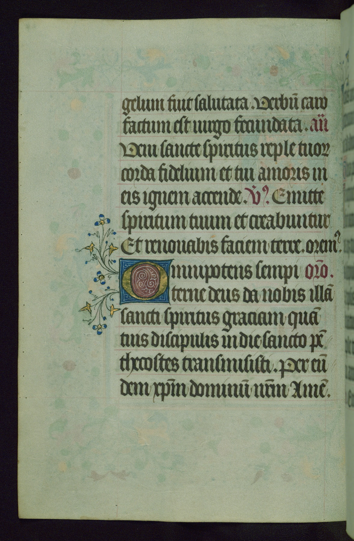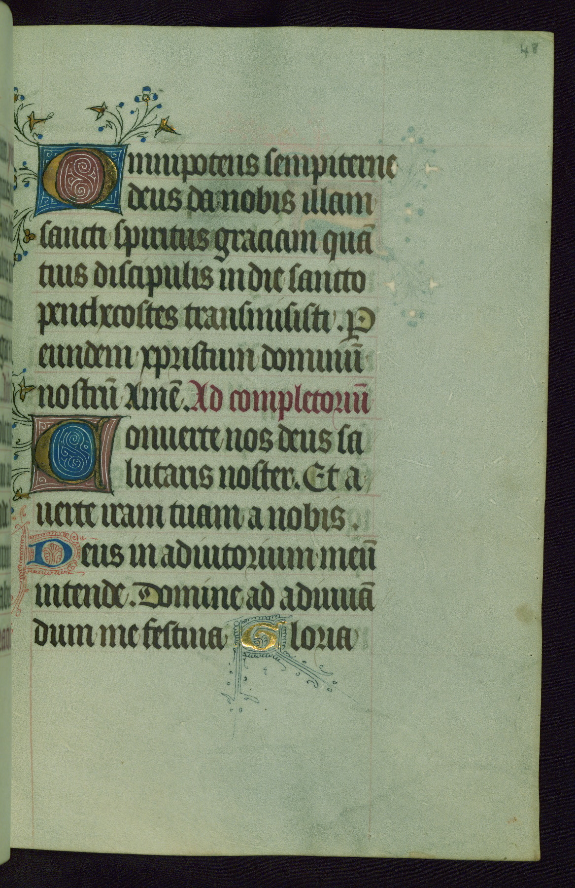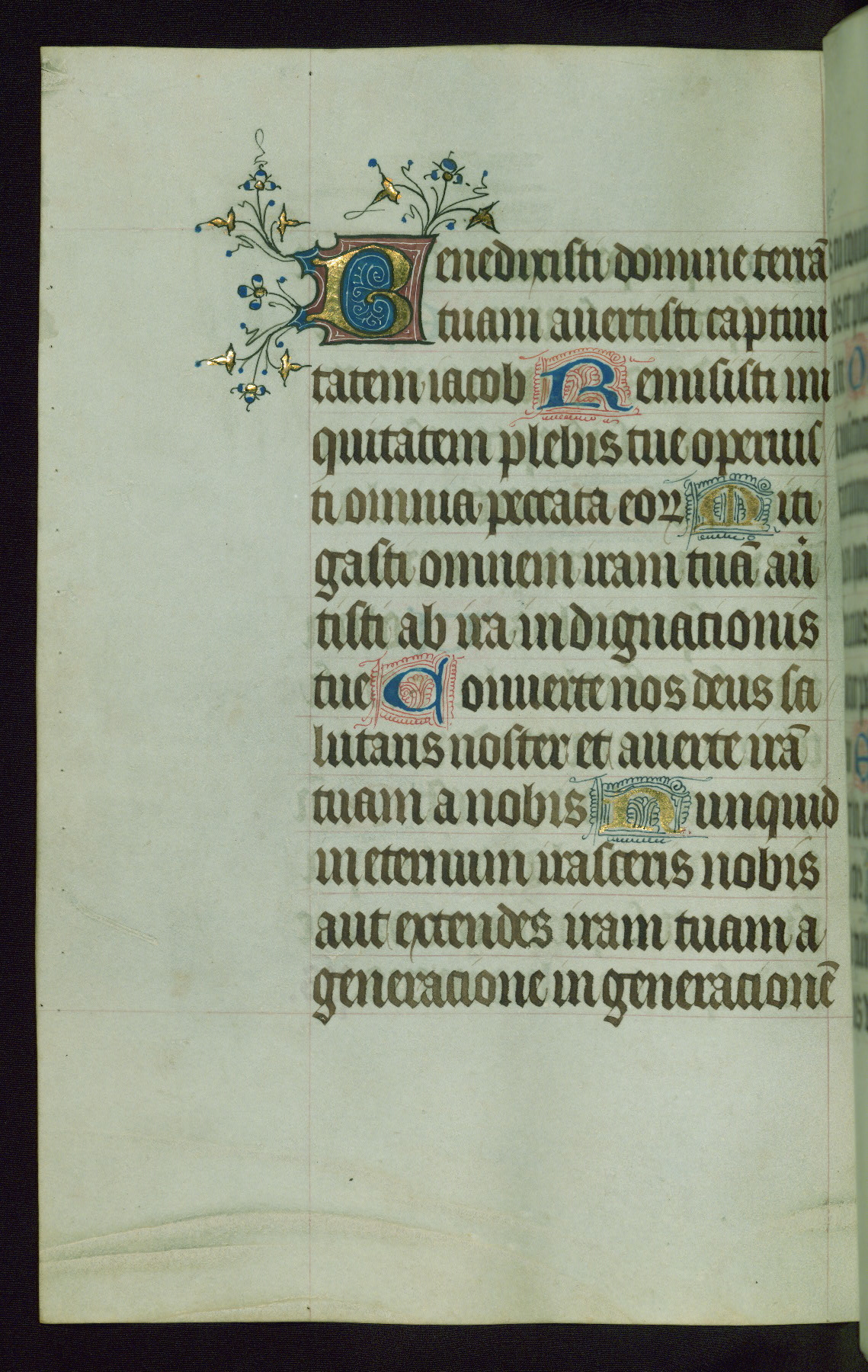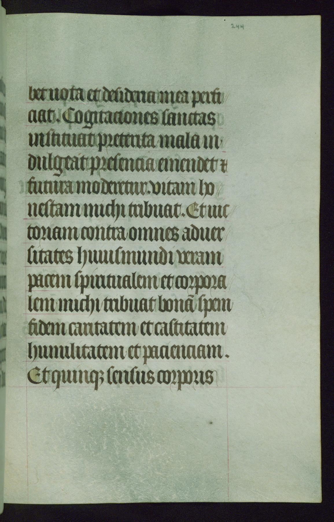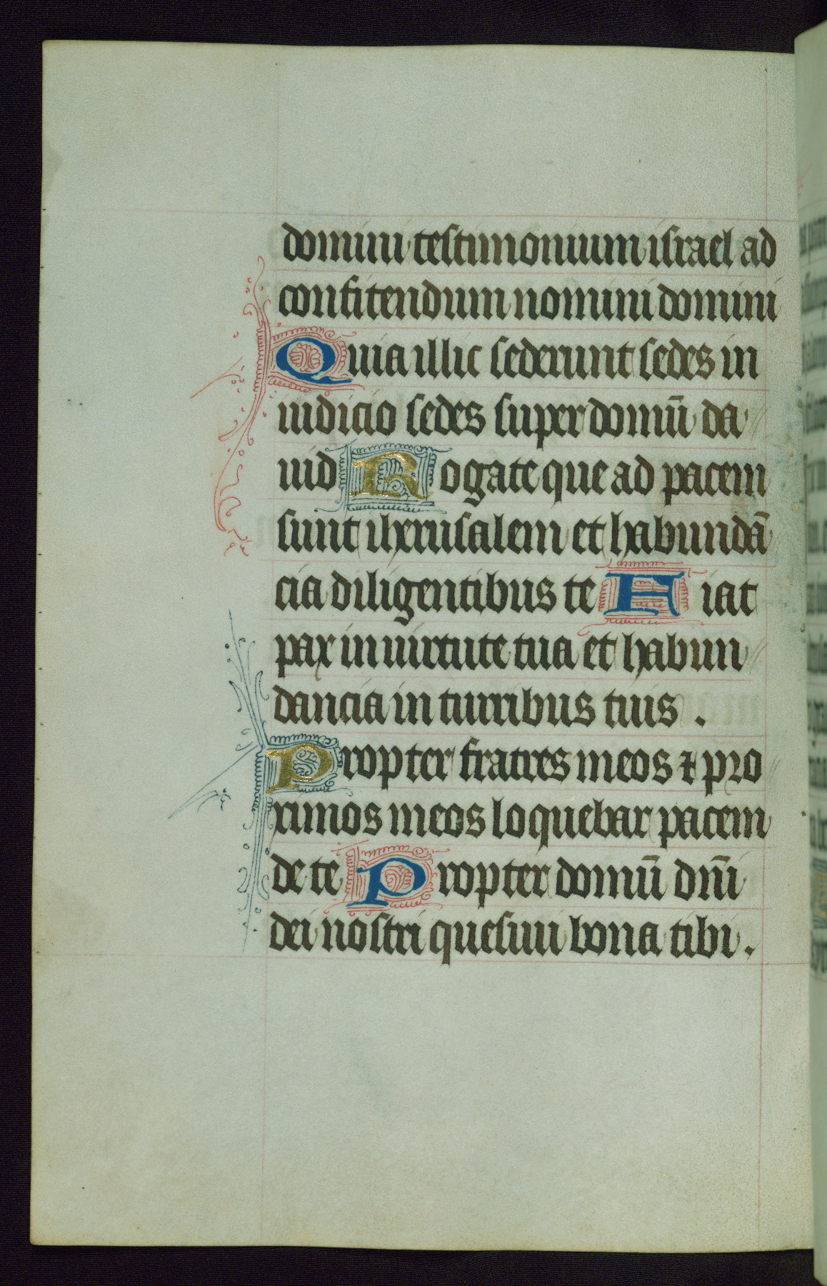 This Book of Hours, ca. 1460, was completed for use of Rome and illuminated under the influence, if not the direct participation, of Willem Vrelant. There remain twenty-two extant marginal calendar illustrations, thirteen extant full-page miniatures (many of which are paired with opening suffrages, perhaps suggesting a certain amount of significance to the owner), and one historiated initial. The contemporary binding, signed Livinus Stuaert, is dated 1477 and is most likely of Bruges or Ghent origin. It is thought that the first owner was French due to the French headings throughout and prominent fleur-de-lis figurations decorating the binding. Further, the first owner was likely female, suggested by the ways in which the book was structured to facilitate legibility. This is evinced by the large size of the script and the lack of abbreviations. While much of the text is standard, there remains evidence of personal significance and preference. This is seen in the chosen illuminations for those sections that are most significant to the owner. Most illuminations are paired with the opening page of staple Hours; however, many are accompanied by individual suffrages, constituting a large portion of the beginning of the manuscript. Personal preference is also shown in those sections of text that stray from the standard. The devotional sequence of this manuscript is notable for its sheer length and diversity of prayers as well as its inclusion of a French prayer not of official liturgy (fols. 215r-219v). The first collection of three prayers is headed and written in French. The prayer is attributed to St. Augustine and is described to guarantee a transformation of tribulation into joy through Christ's mercy, but only if the suppliant recites the prayer for thirty consecutive days. While it is not uncommon for evidence of an owner's predilections to surface in a Book of Hours, the particularly divergent features of this book allow readers to glean an intimate view of the patron.