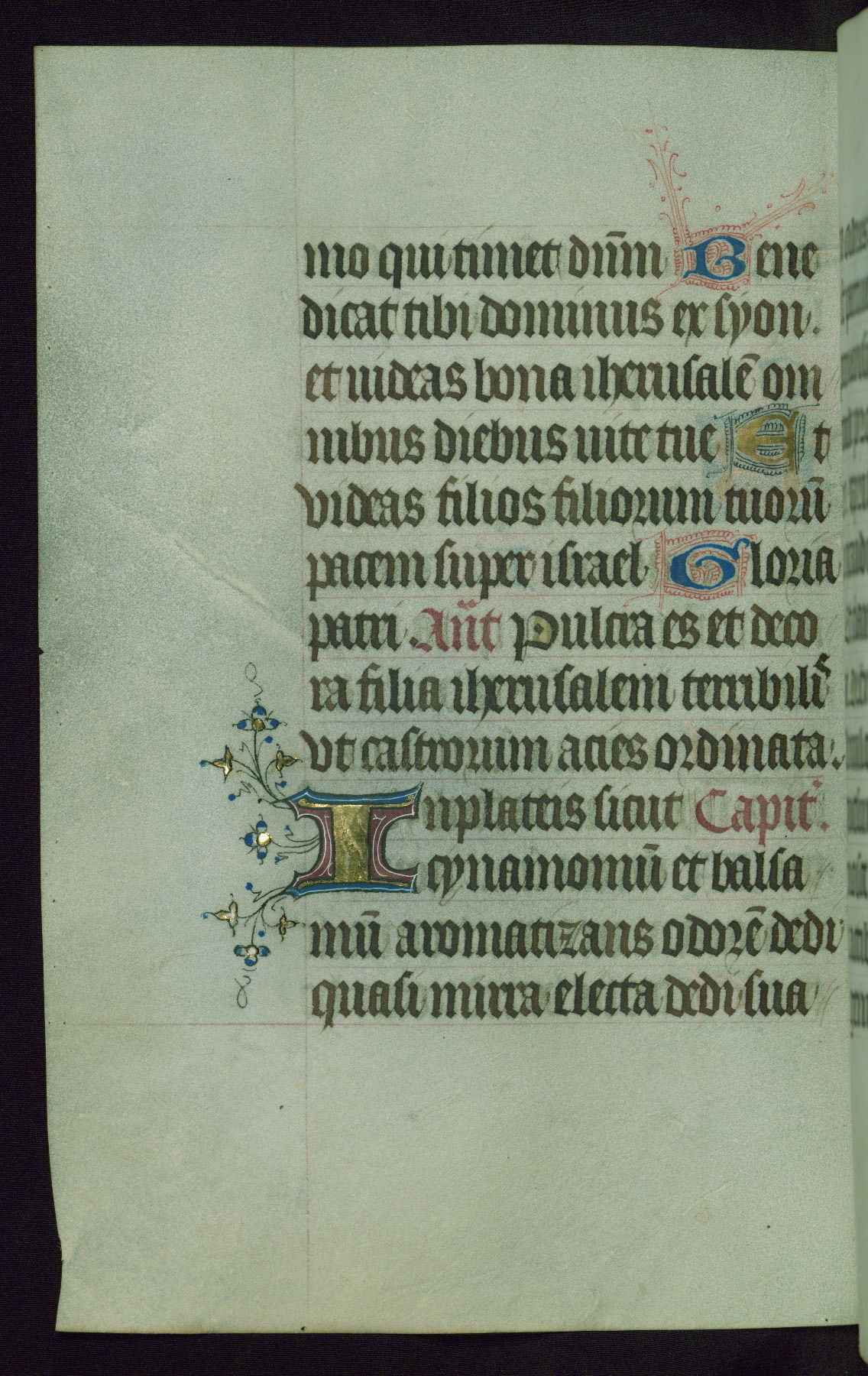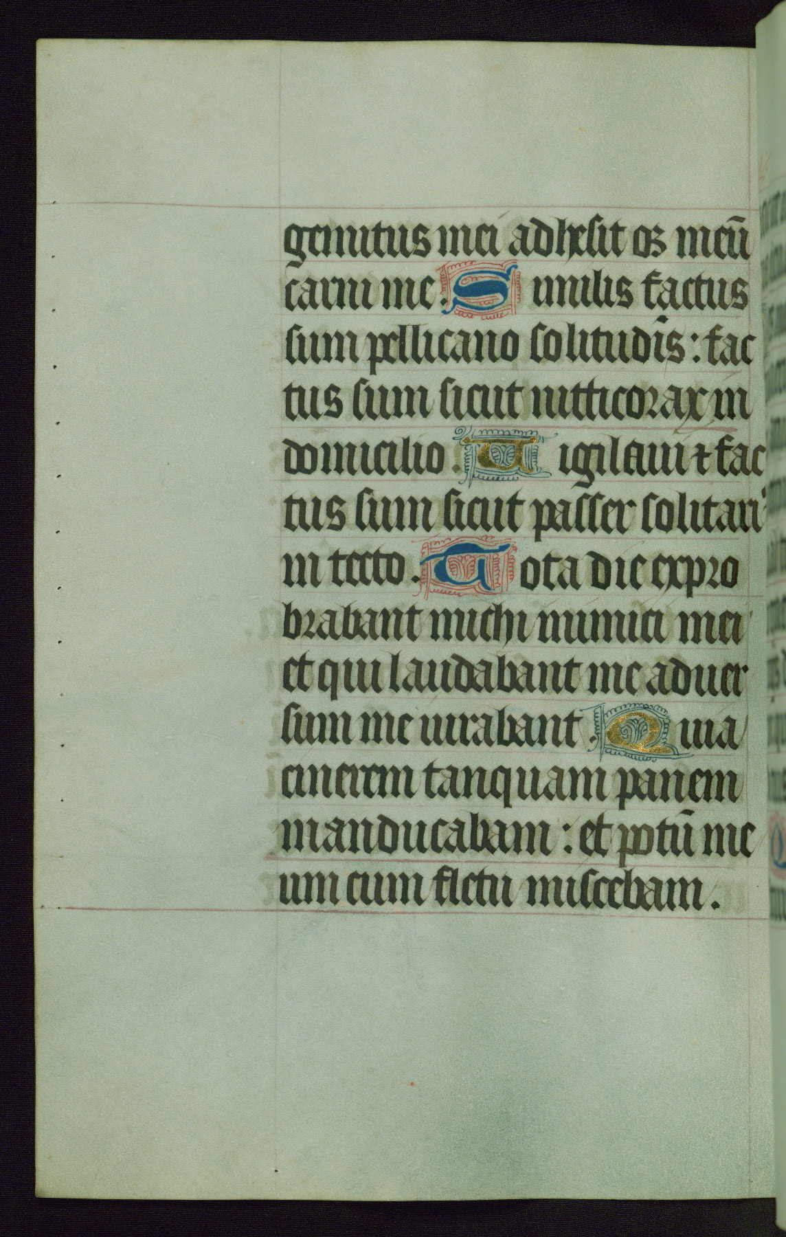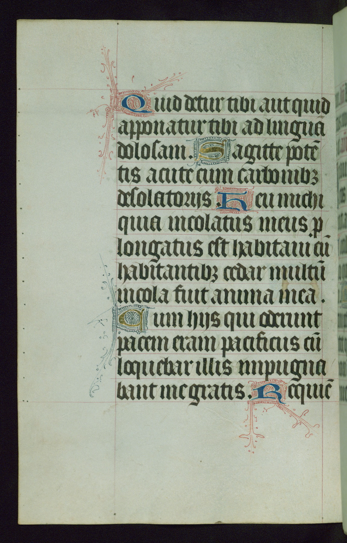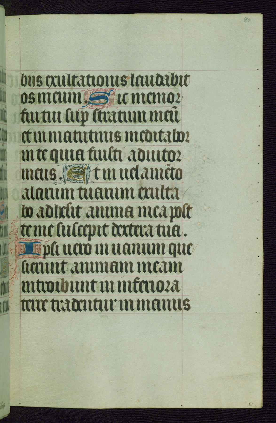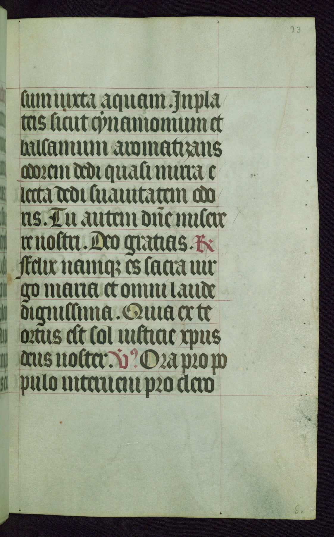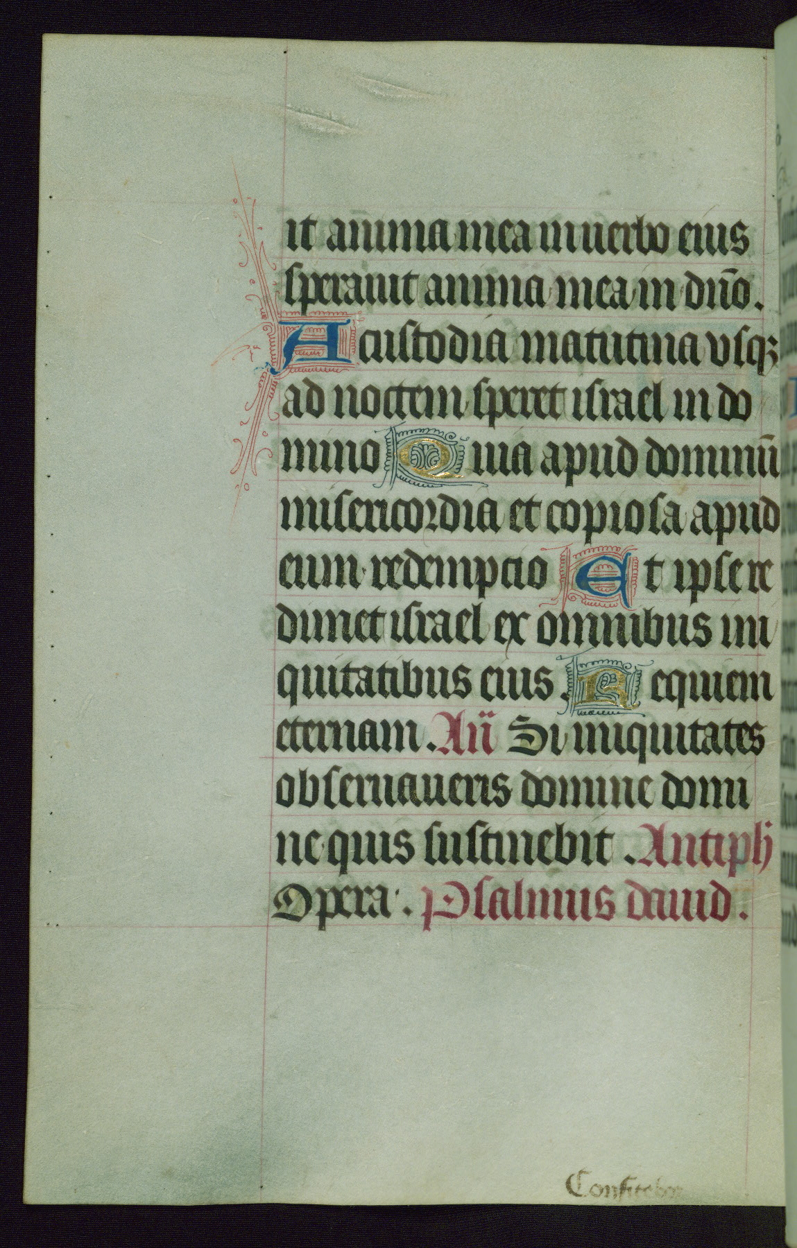 This Book of Hours, ca. 1460, was completed for use of Rome and illuminated under the influence, if not the direct participation, of Willem Vrelant. There remain twenty-two extant marginal calendar illustrations, thirteen extant full-page miniatures (many of which are paired with opening suffrages, perhaps suggesting a certain amount of significance to the owner), and one historiated initial. The contemporary binding, signed Livinus Stuaert, is dated 1477 and is most likely of Bruges or Ghent origin. It is thought that the first owner was French due to the French headings throughout and prominent fleur-de-lis figurations decorating the binding. Further, the first owner was likely female, suggested by the ways in which the book was structured to facilitate legibility. This is evinced by the large size of the script and the lack of abbreviations. While much of the text is standard, there remains evidence of personal significance and preference. This is seen in the chosen illuminations for those sections that are most significant to the owner. Most illuminations are paired with the opening page of staple Hours; however, many are accompanied by individual suffrages, constituting a large portion of the beginning of the manuscript. Personal preference is also shown in those sections of text that stray from the standard. The devotional sequence of this manuscript is notable for its sheer length and diversity of prayers as well as its inclusion of a French prayer not of official liturgy (fols. 215r-219v). The first collection of three prayers is headed and written in French. The prayer is attributed to St. Augustine and is described to guarantee a transformation of tribulation into joy through Christ's mercy, but only if the suppliant recites the prayer for thirty consecutive days. While it is not uncommon for evidence of an owner's predilections to surface in a Book of Hours, the particularly divergent features of this book allow readers to glean an intimate view of the patron.