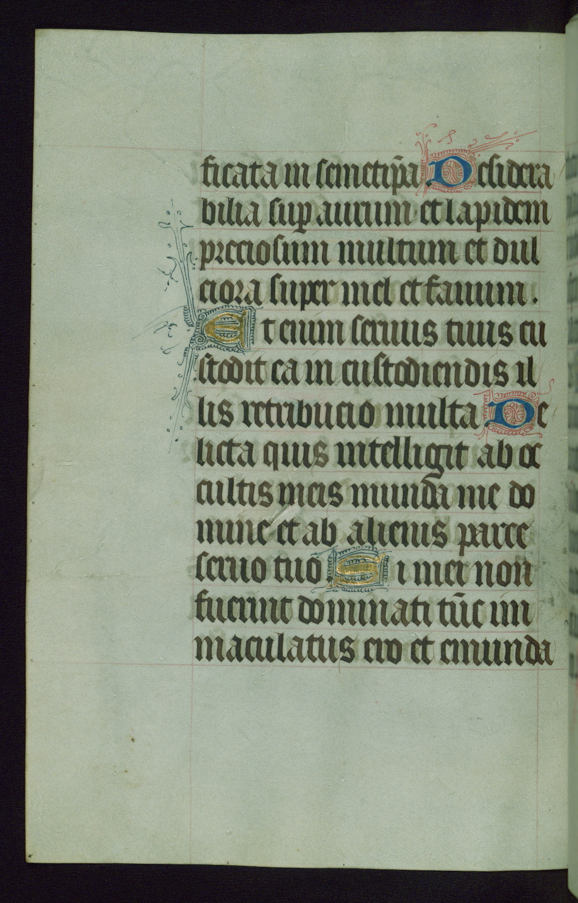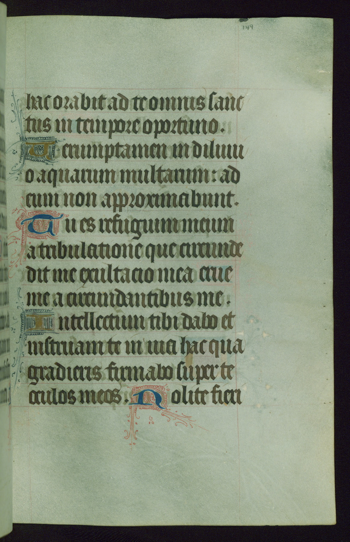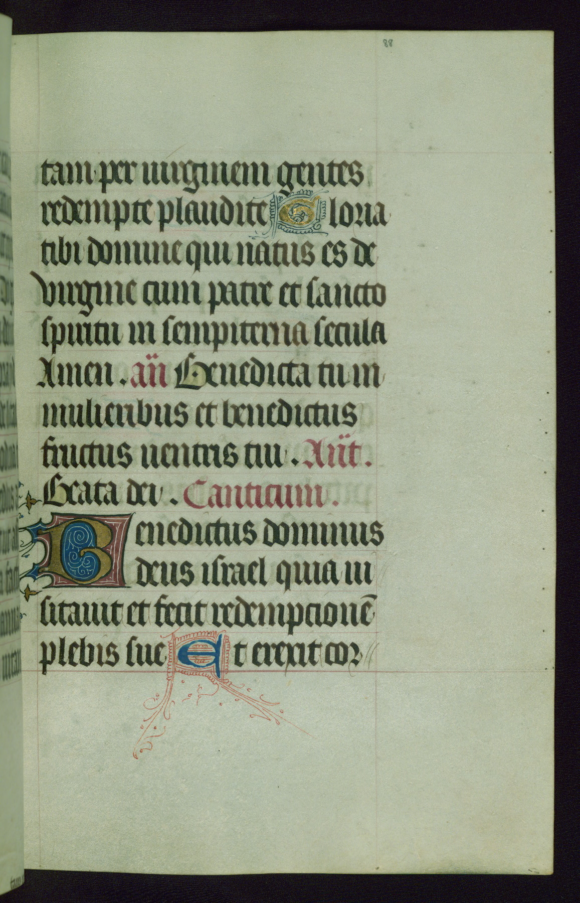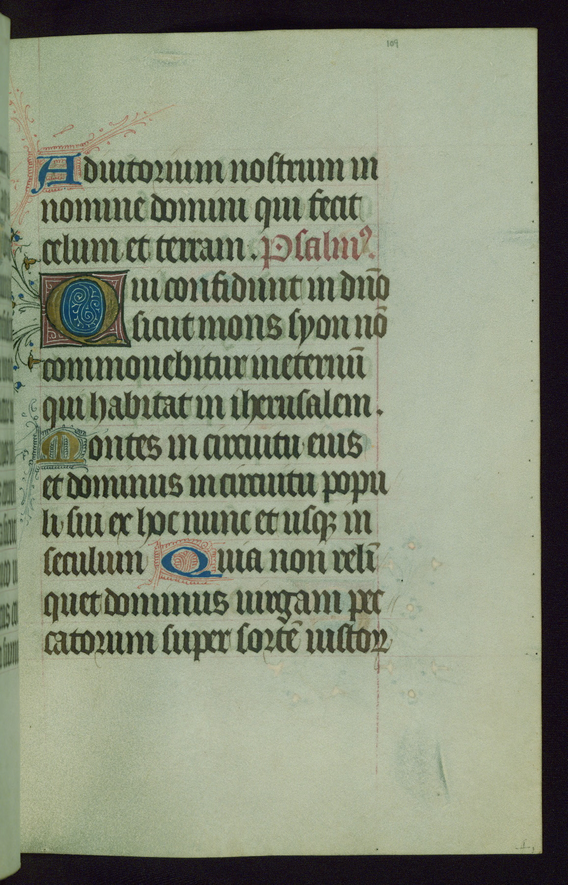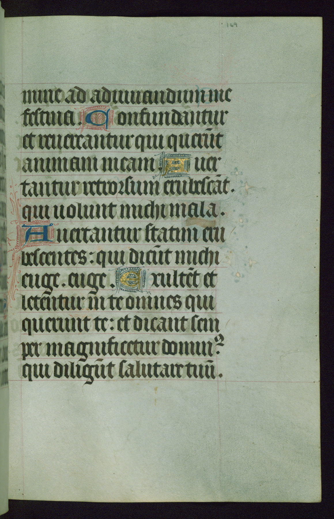 This Book of Hours, ca. 1460, was completed for use of Rome and illuminated under the influence, if not the direct participation, of Willem Vrelant. There remain twenty-two extant marginal calendar illustrations, thirteen extant full-page miniatures (many of which are paired with opening suffrages, perhaps suggesting a certain amount of significance to the owner), and one historiated initial. The contemporary binding, signed Livinus Stuaert, is dated 1477 and is most likely of Bruges or Ghent origin. It is thought that the first owner was French due to the French headings throughout and prominent fleur-de-lis figurations decorating the binding. Further, the first owner was likely female, suggested by the ways in which the book was structured to facilitate legibility. This is evinced by the large size of the script and the lack of abbreviations. While much of the text is standard, there remains evidence of personal significance and preference. This is seen in the chosen illuminations for those sections that are most significant to the owner. Most illuminations are paired with the opening page of staple Hours; however, many are accompanied by individual suffrages, constituting a large portion of the beginning of the manuscript. Personal preference is also shown in those sections of text that stray from the standard. The devotional sequence of this manuscript is notable for its sheer length and diversity of prayers as well as its inclusion of a French prayer not of official liturgy (fols. 215r-219v). The first collection of three prayers is headed and written in French. The prayer is attributed to St. Augustine and is described to guarantee a transformation of tribulation into joy through Christ's mercy, but only if the suppliant recites the prayer for thirty consecutive days. While it is not uncommon for evidence of an owner's predilections to surface in a Book of Hours, the particularly divergent features of this book allow readers to glean an intimate view of the patron.