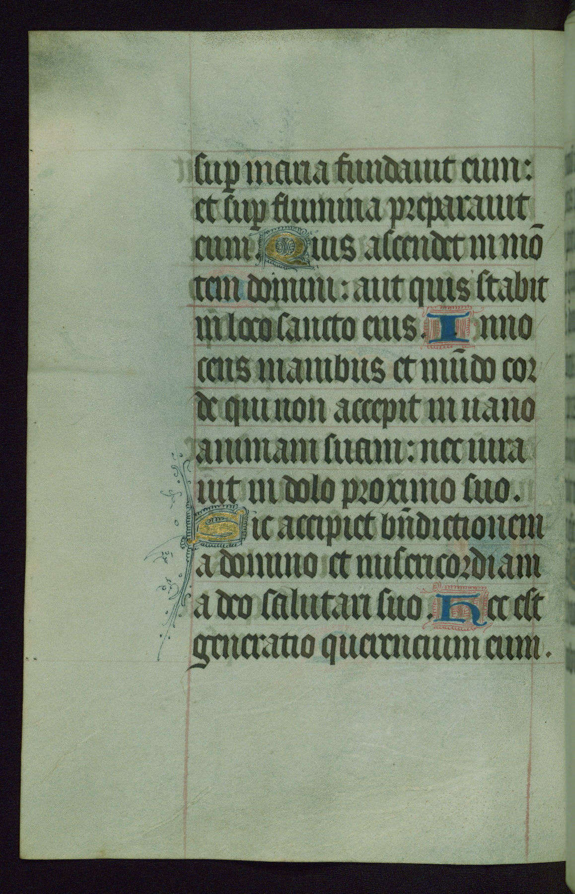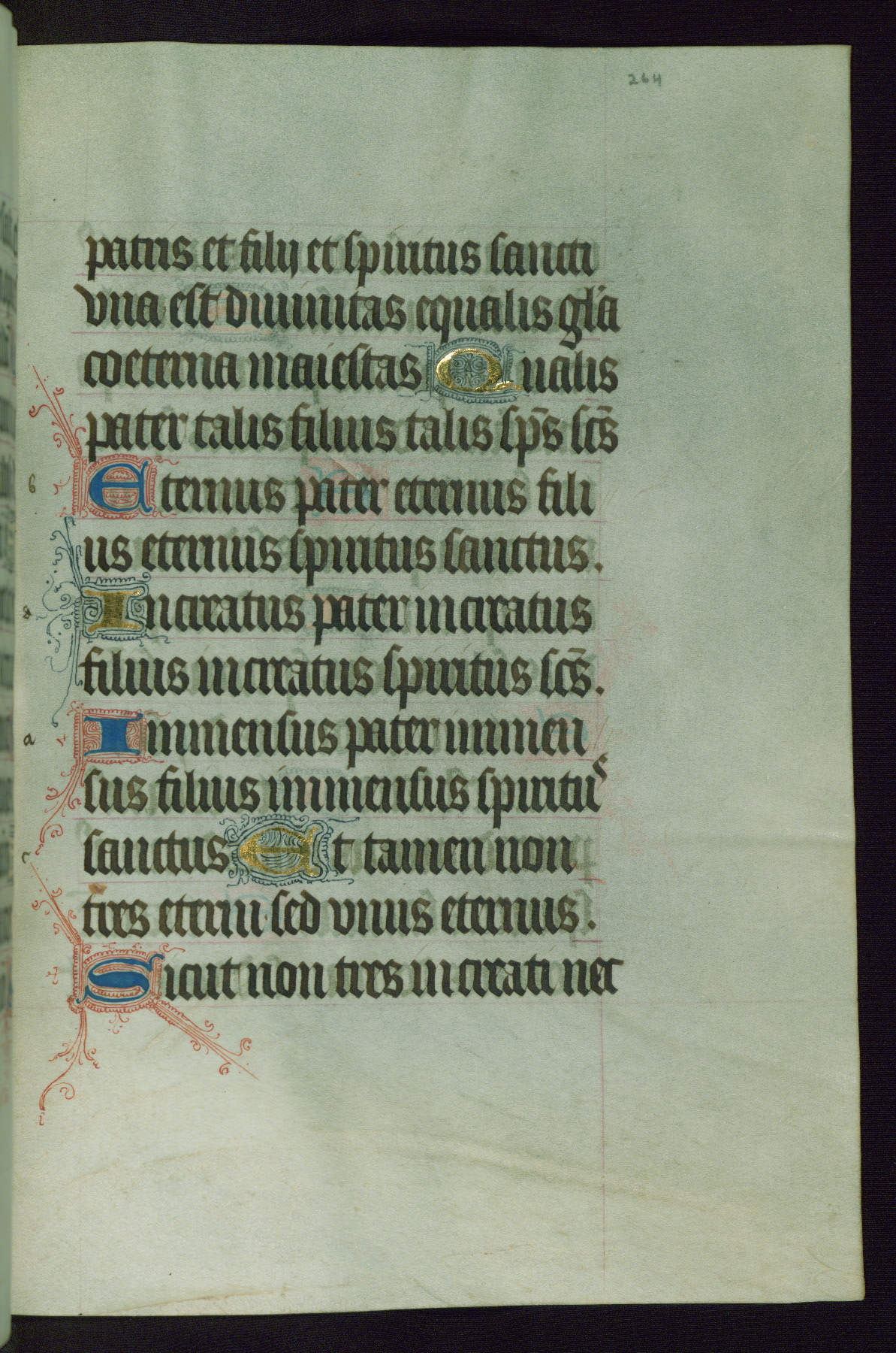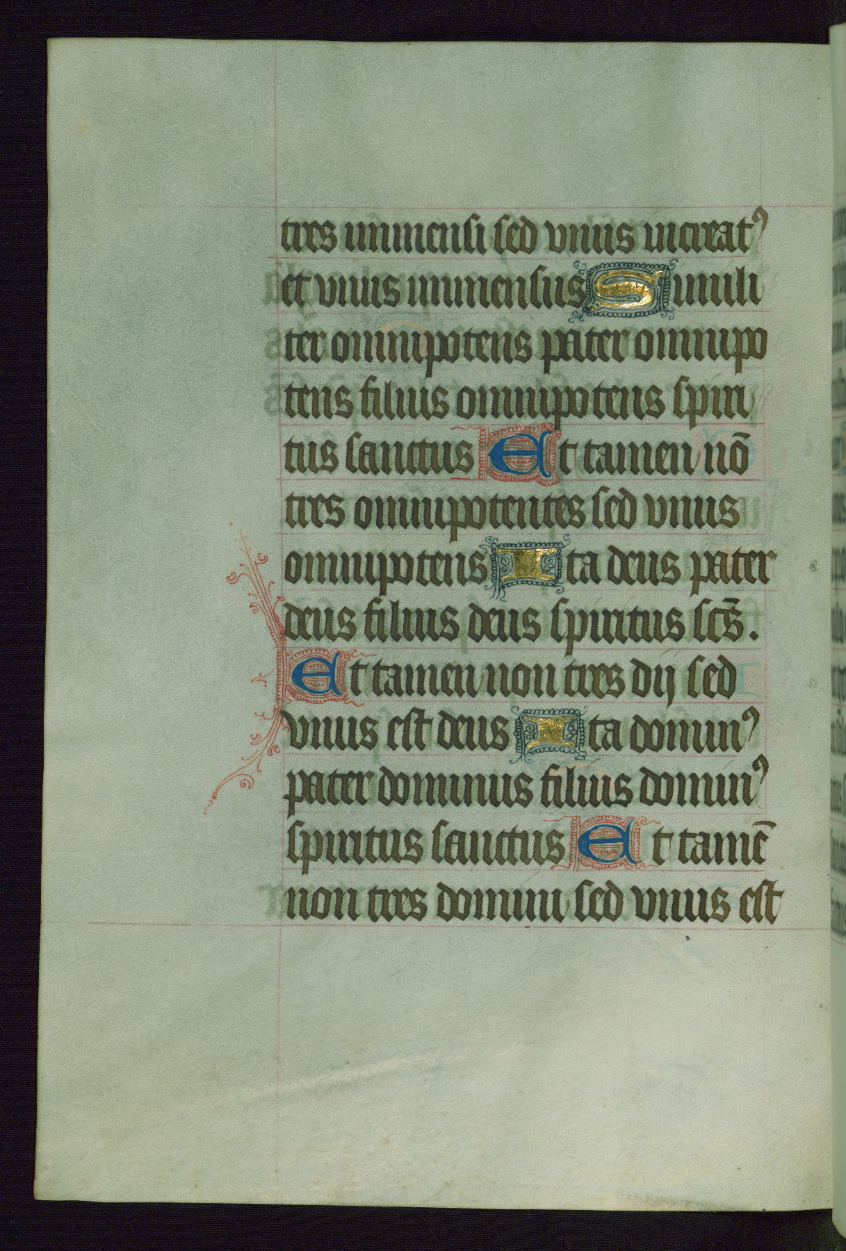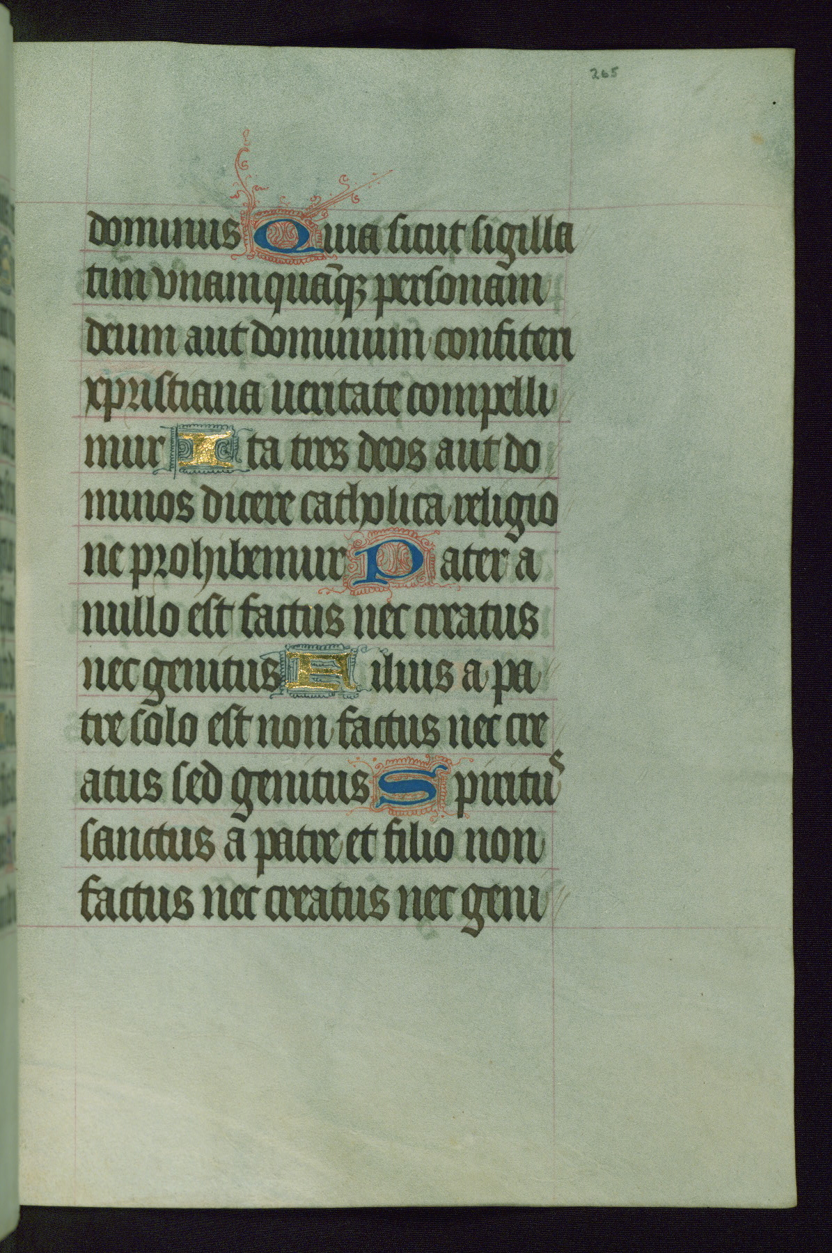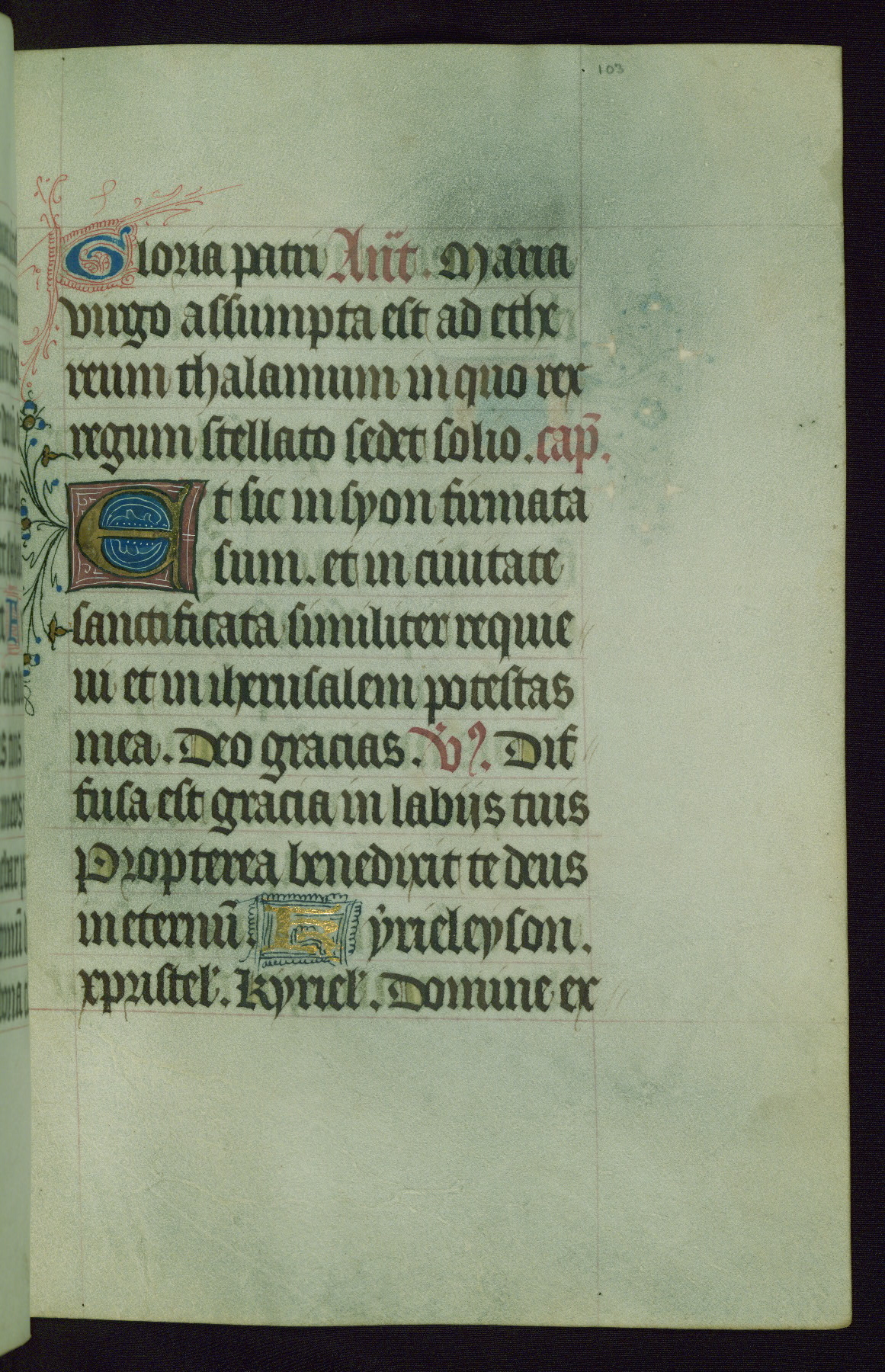 This Book of Hours, ca. 1460, was completed for use of Rome and illuminated under the influence, if not the direct participation, of Willem Vrelant. There remain twenty-two extant marginal calendar illustrations, thirteen extant full-page miniatures (many of which are paired with opening suffrages, perhaps suggesting a certain amount of significance to the owner), and one historiated initial. The contemporary binding, signed Livinus Stuaert, is dated 1477 and is most likely of Bruges or Ghent origin. It is thought that the first owner was French due to the French headings throughout and prominent fleur-de-lis figurations decorating the binding. Further, the first owner was likely female, suggested by the ways in which the book was structured to facilitate legibility. This is evinced by the large size of the script and the lack of abbreviations. While much of the text is standard, there remains evidence of personal significance and preference. This is seen in the chosen illuminations for those sections that are most significant to the owner. Most illuminations are paired with the opening page of staple Hours; however, many are accompanied by individual suffrages, constituting a large portion of the beginning of the manuscript. Personal preference is also shown in those sections of text that stray from the standard. The devotional sequence of this manuscript is notable for its sheer length and diversity of prayers as well as its inclusion of a French prayer not of official liturgy (fols. 215r-219v). The first collection of three prayers is headed and written in French. The prayer is attributed to St. Augustine and is described to guarantee a transformation of tribulation into joy through Christ's mercy, but only if the suppliant recites the prayer for thirty consecutive days. While it is not uncommon for evidence of an owner's predilections to surface in a Book of Hours, the particularly divergent features of this book allow readers to glean an intimate view of the patron.