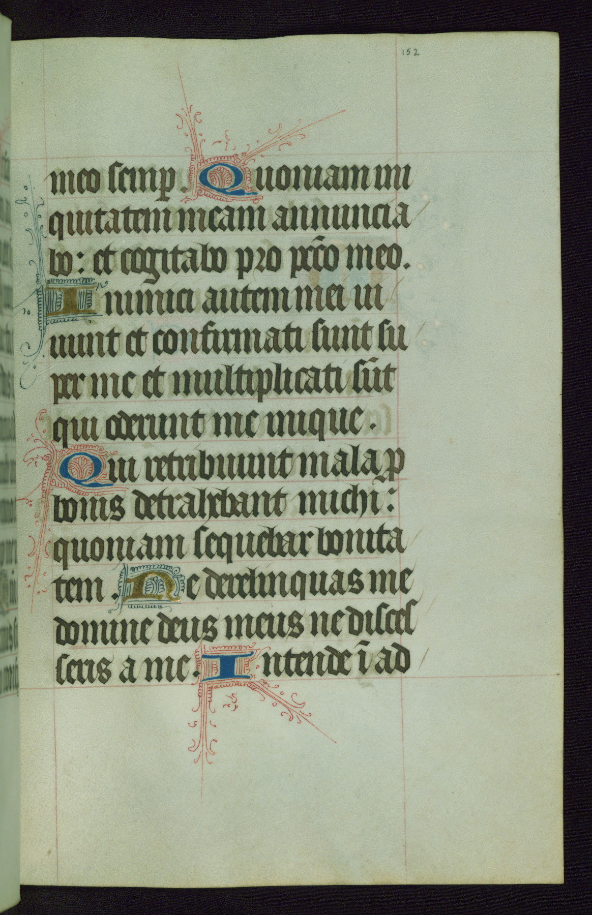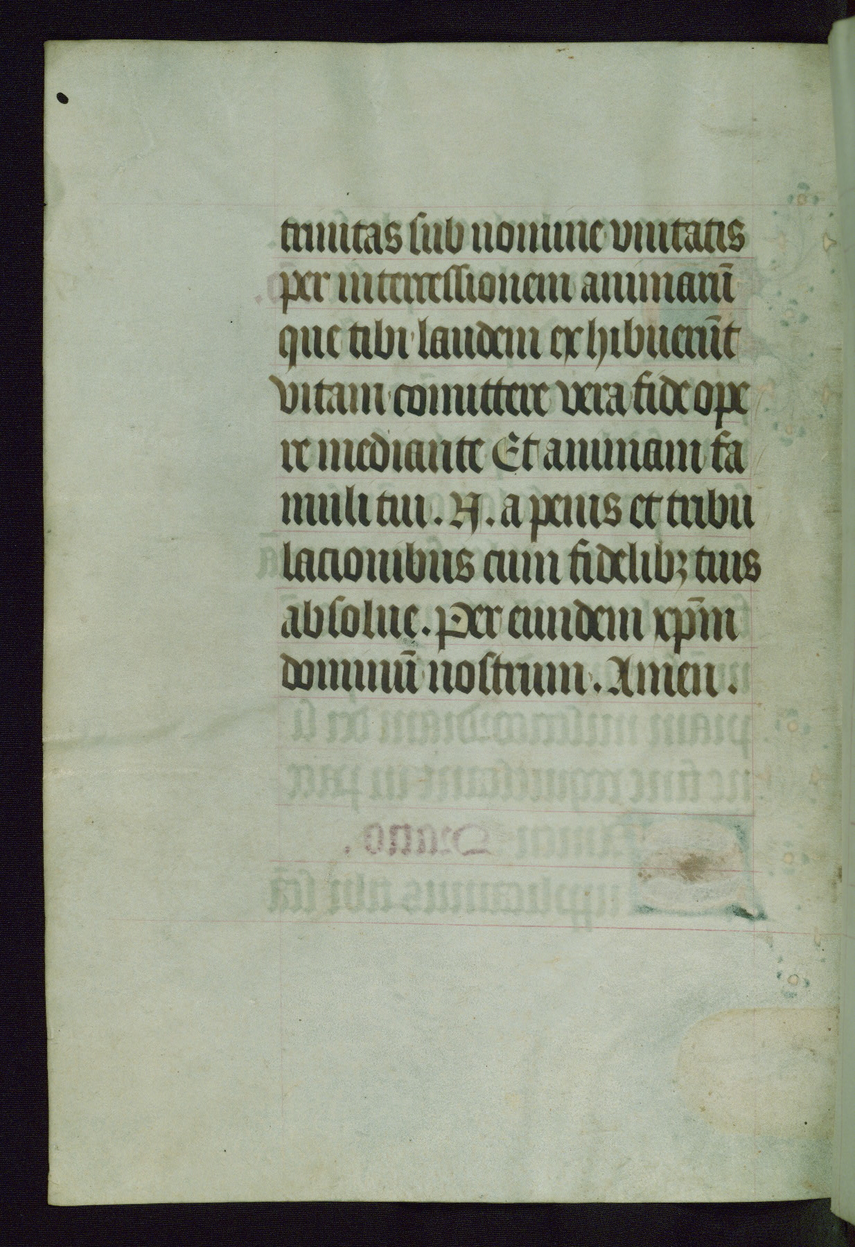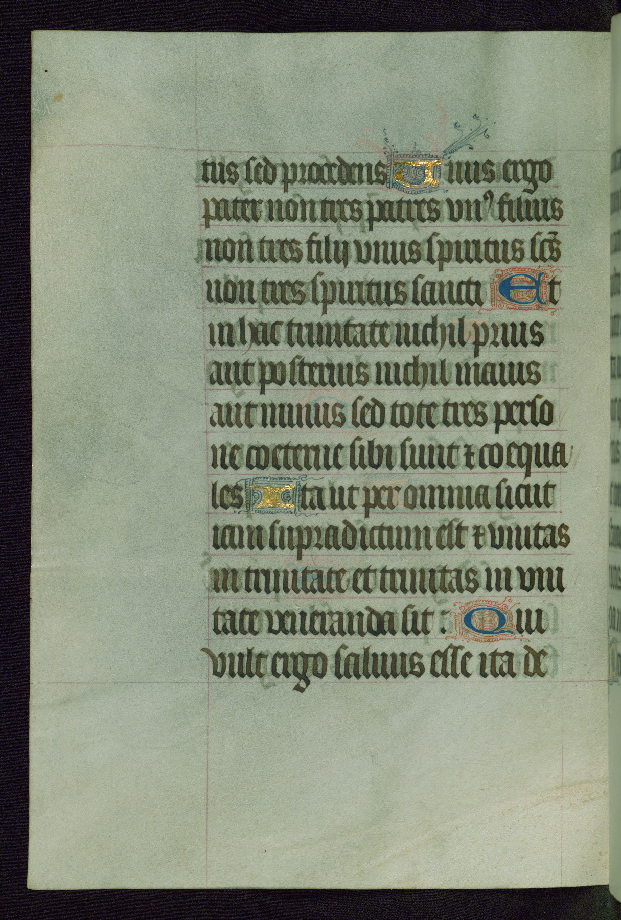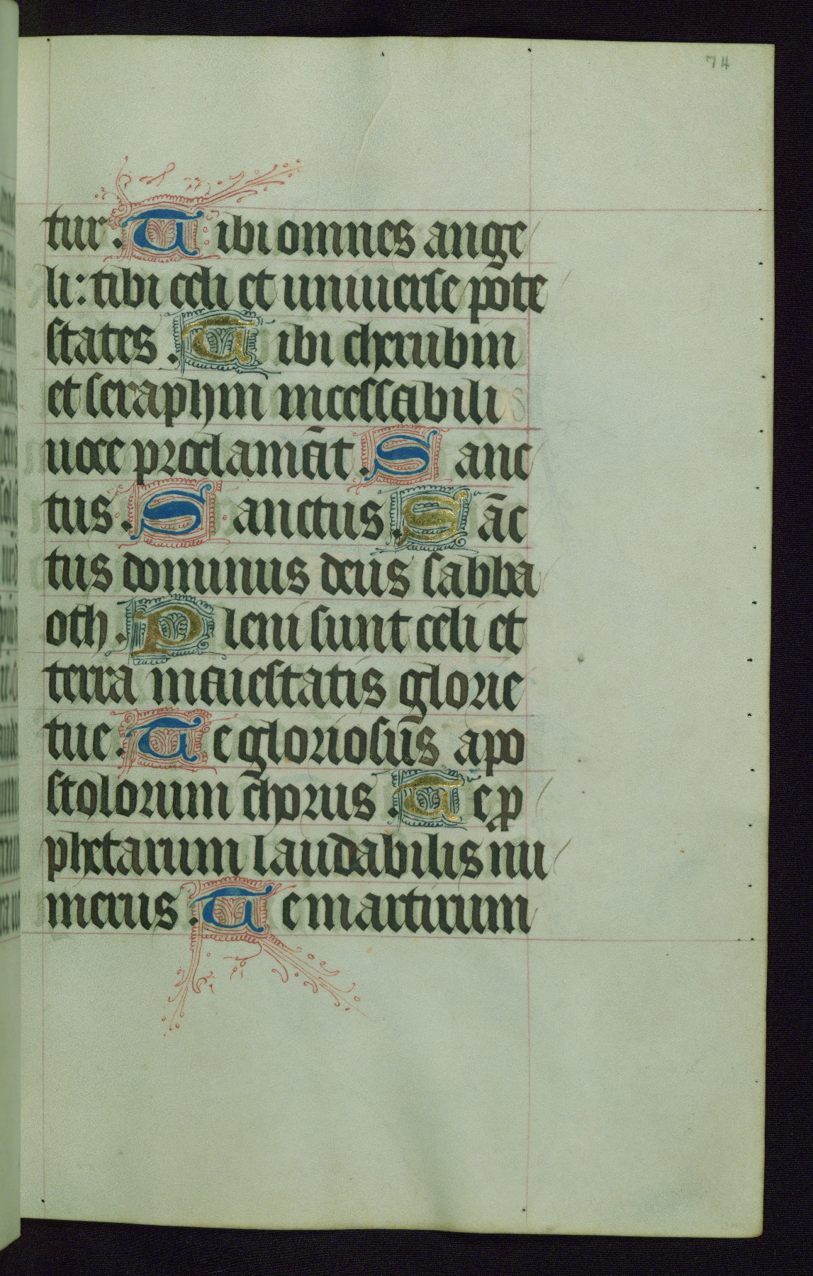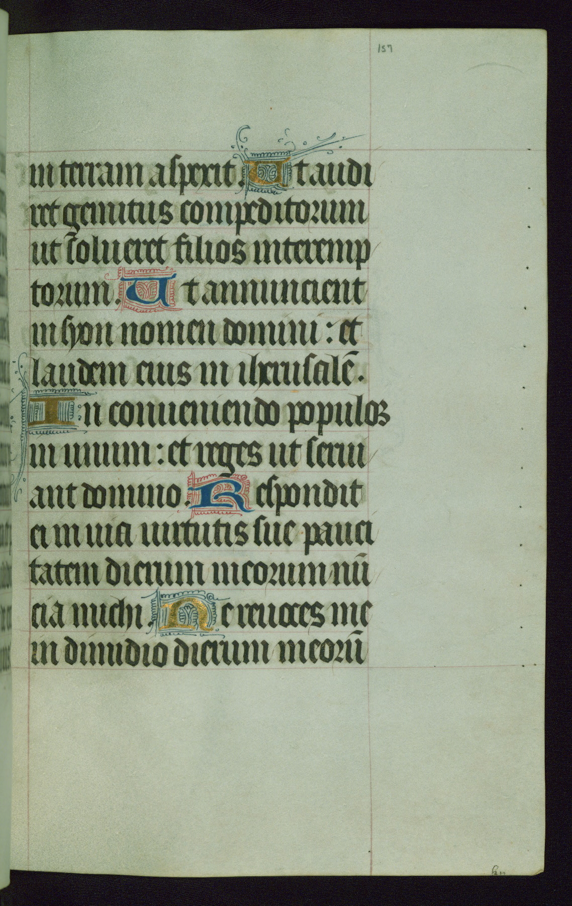 This Book of Hours, ca. 1460, was completed for use of Rome and illuminated under the influence, if not the direct participation, of Willem Vrelant. There remain twenty-two extant marginal calendar illustrations, thirteen extant full-page miniatures (many of which are paired with opening suffrages, perhaps suggesting a certain amount of significance to the owner), and one historiated initial. The contemporary binding, signed Livinus Stuaert, is dated 1477 and is most likely of Bruges or Ghent origin. It is thought that the first owner was French due to the French headings throughout and prominent fleur-de-lis figurations decorating the binding. Further, the first owner was likely female, suggested by the ways in which the book was structured to facilitate legibility. This is evinced by the large size of the script and the lack of abbreviations. While much of the text is standard, there remains evidence of personal significance and preference. This is seen in the chosen illuminations for those sections that are most significant to the owner. Most illuminations are paired with the opening page of staple Hours; however, many are accompanied by individual suffrages, constituting a large portion of the beginning of the manuscript. Personal preference is also shown in those sections of text that stray from the standard. The devotional sequence of this manuscript is notable for its sheer length and diversity of prayers as well as its inclusion of a French prayer not of official liturgy (fols. 215r-219v). The first collection of three prayers is headed and written in French. The prayer is attributed to St. Augustine and is described to guarantee a transformation of tribulation into joy through Christ's mercy, but only if the suppliant recites the prayer for thirty consecutive days. While it is not uncommon for evidence of an owner's predilections to surface in a Book of Hours, the particularly divergent features of this book allow readers to glean an intimate view of the patron.