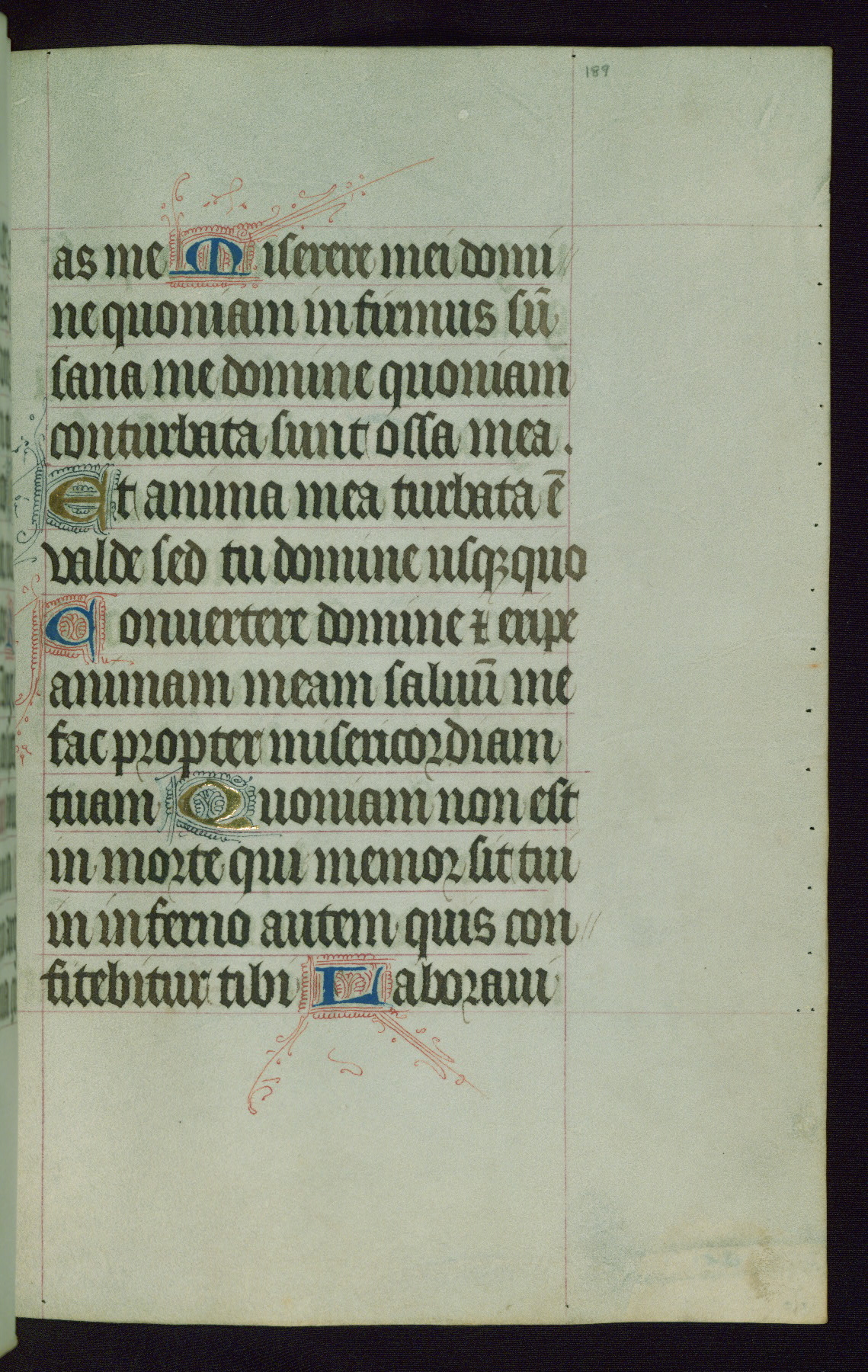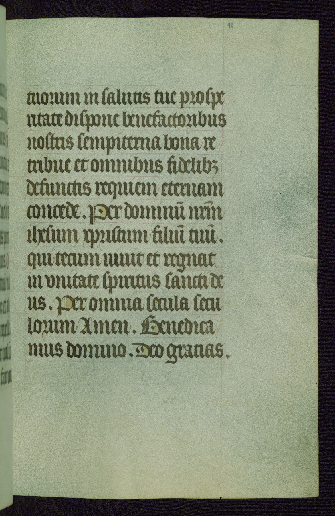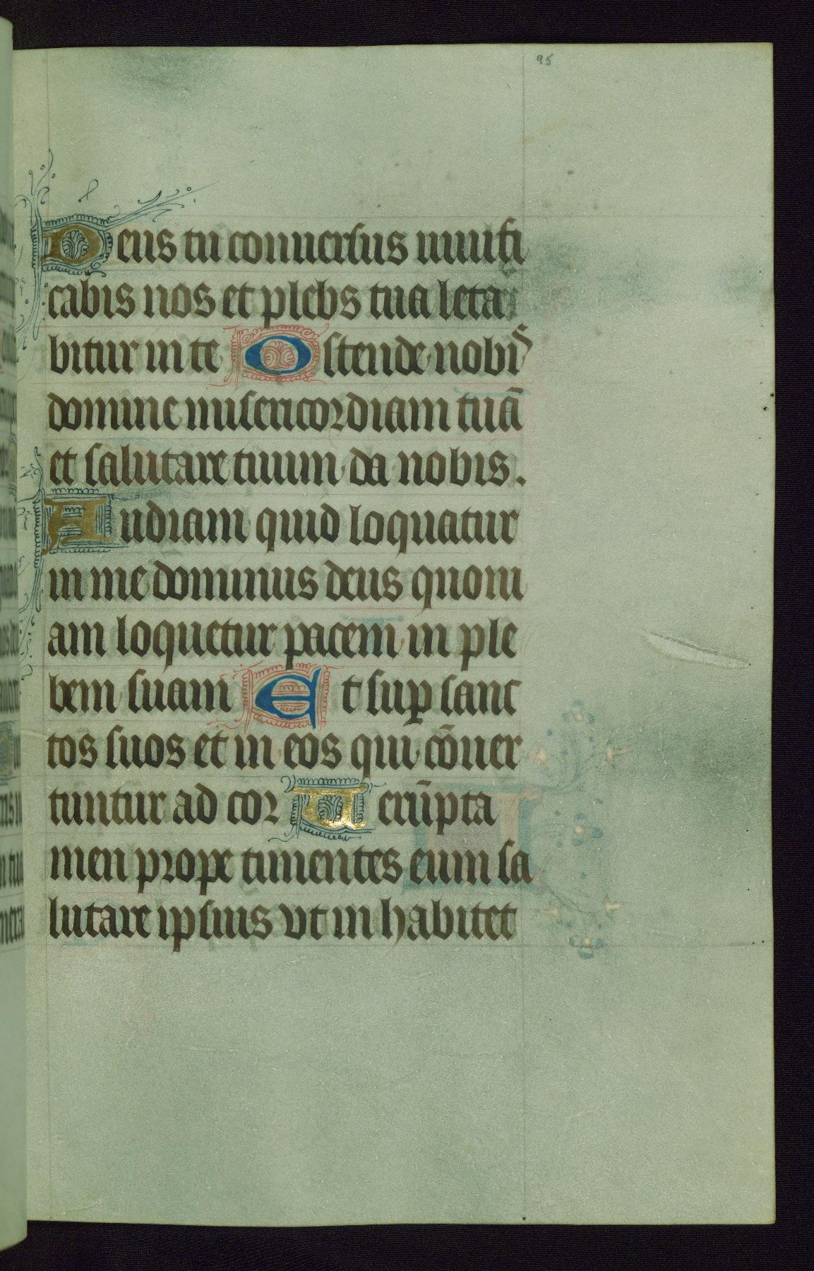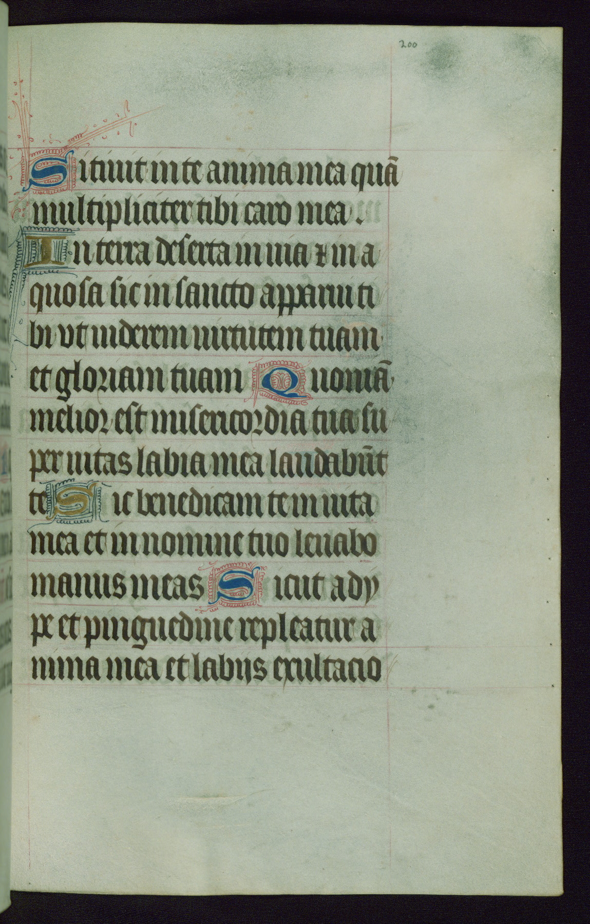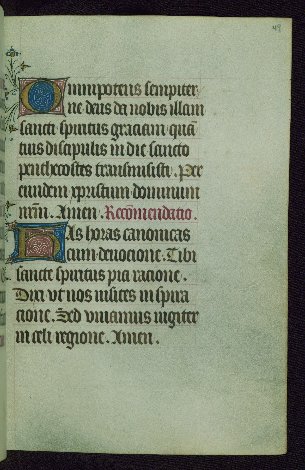 This Book of Hours, ca. 1460, was completed for use of Rome and illuminated under the influence, if not the direct participation, of Willem Vrelant. There remain twenty-two extant marginal calendar illustrations, thirteen extant full-page miniatures (many of which are paired with opening suffrages, perhaps suggesting a certain amount of significance to the owner), and one historiated initial. The contemporary binding, signed Livinus Stuaert, is dated 1477 and is most likely of Bruges or Ghent origin. It is thought that the first owner was French due to the French headings throughout and prominent fleur-de-lis figurations decorating the binding. Further, the first owner was likely female, suggested by the ways in which the book was structured to facilitate legibility. This is evinced by the large size of the script and the lack of abbreviations. While much of the text is standard, there remains evidence of personal significance and preference. This is seen in the chosen illuminations for those sections that are most significant to the owner. Most illuminations are paired with the opening page of staple Hours; however, many are accompanied by individual suffrages, constituting a large portion of the beginning of the manuscript. Personal preference is also shown in those sections of text that stray from the standard. The devotional sequence of this manuscript is notable for its sheer length and diversity of prayers as well as its inclusion of a French prayer not of official liturgy (fols. 215r-219v). The first collection of three prayers is headed and written in French. The prayer is attributed to St. Augustine and is described to guarantee a transformation of tribulation into joy through Christ's mercy, but only if the suppliant recites the prayer for thirty consecutive days. While it is not uncommon for evidence of an owner's predilections to surface in a Book of Hours, the particularly divergent features of this book allow readers to glean an intimate view of the patron.