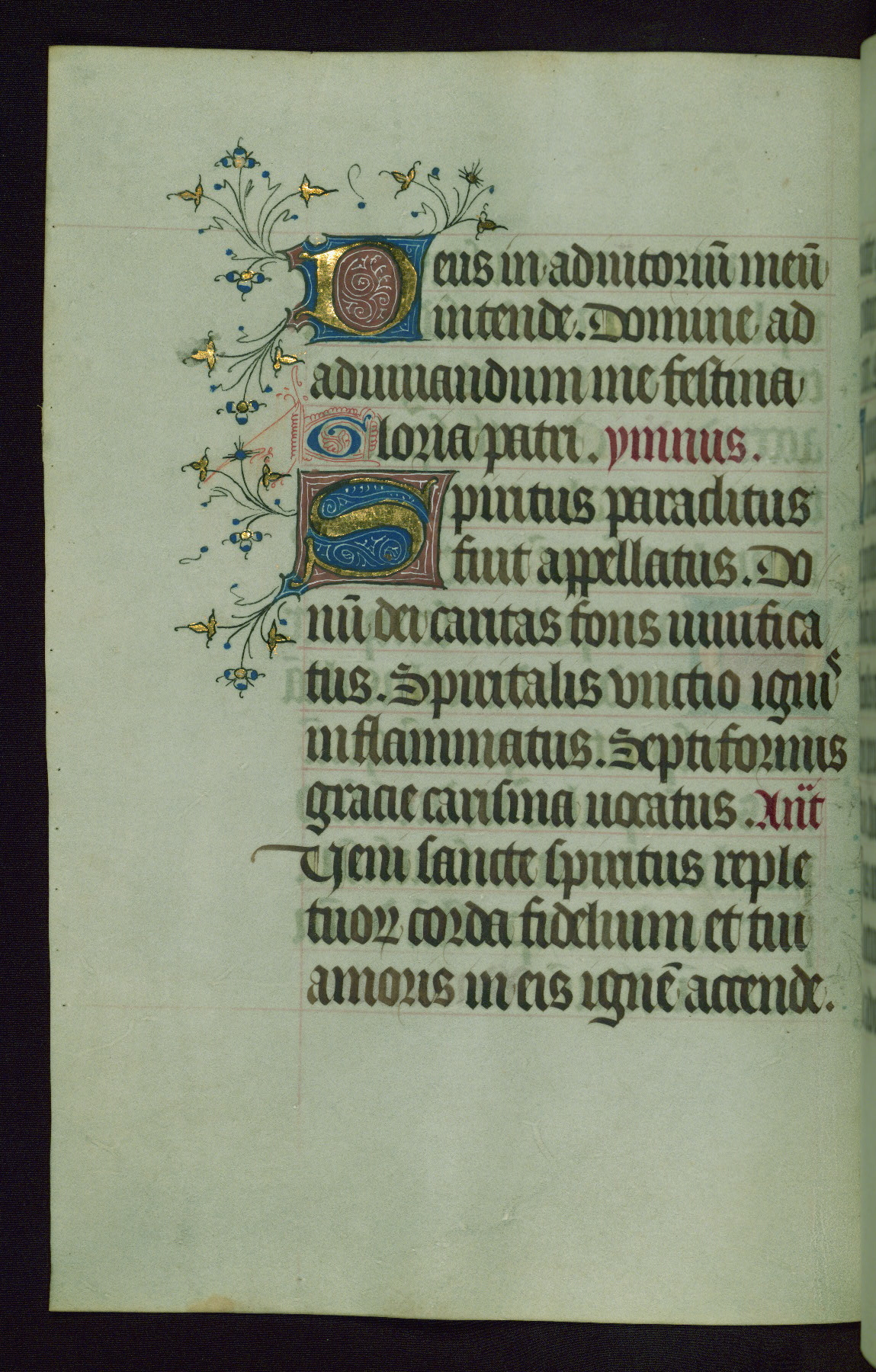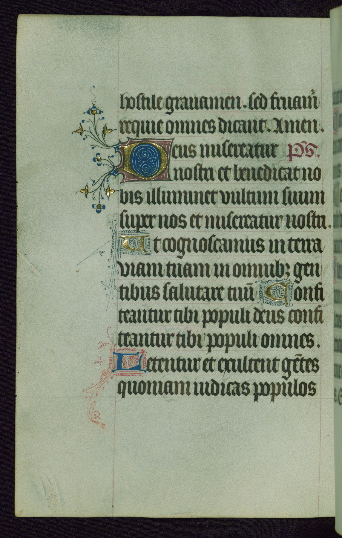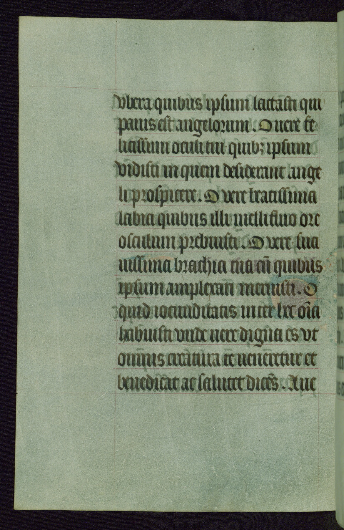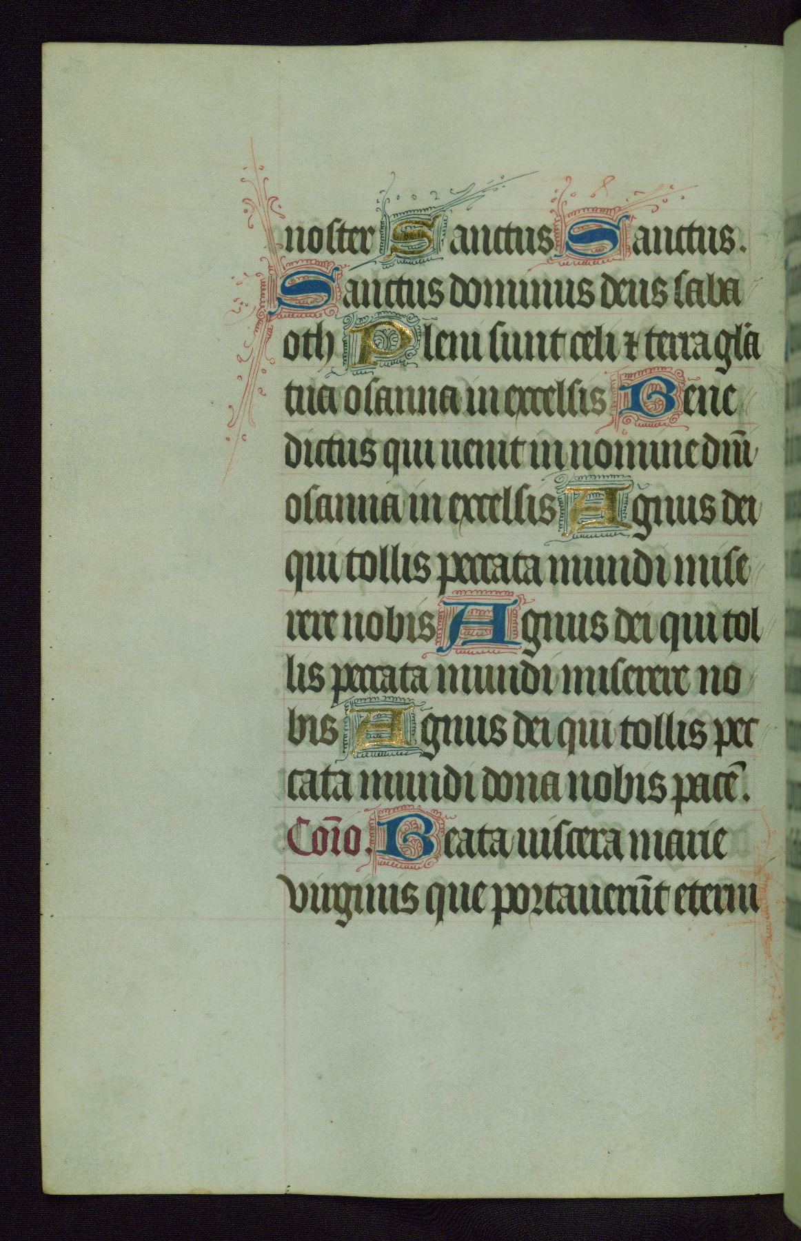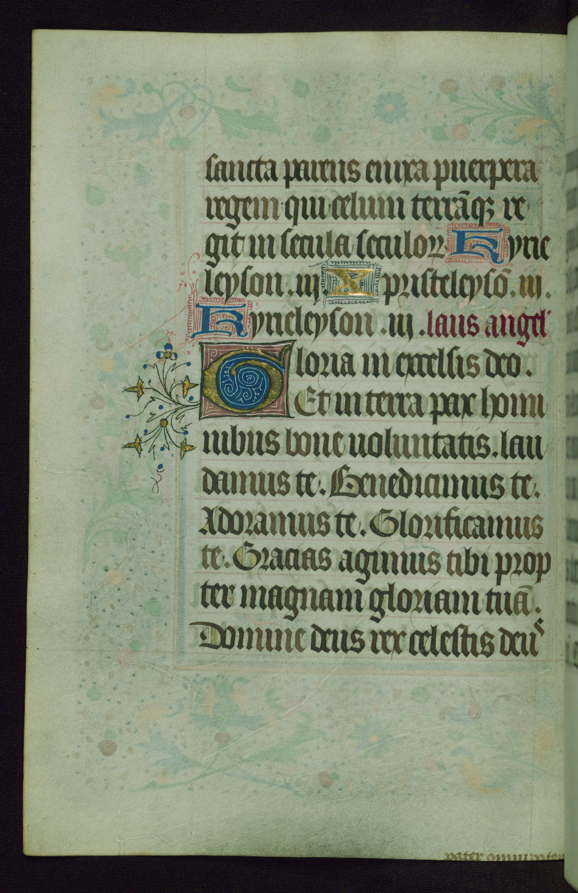 This Book of Hours, ca. 1460, was completed for use of Rome and illuminated under the influence, if not the direct participation, of Willem Vrelant. There remain twenty-two extant marginal calendar illustrations, thirteen extant full-page miniatures (many of which are paired with opening suffrages, perhaps suggesting a certain amount of significance to the owner), and one historiated initial. The contemporary binding, signed Livinus Stuaert, is dated 1477 and is most likely of Bruges or Ghent origin. It is thought that the first owner was French due to the French headings throughout and prominent fleur-de-lis figurations decorating the binding. Further, the first owner was likely female, suggested by the ways in which the book was structured to facilitate legibility. This is evinced by the large size of the script and the lack of abbreviations. While much of the text is standard, there remains evidence of personal significance and preference. This is seen in the chosen illuminations for those sections that are most significant to the owner. Most illuminations are paired with the opening page of staple Hours; however, many are accompanied by individual suffrages, constituting a large portion of the beginning of the manuscript. Personal preference is also shown in those sections of text that stray from the standard. The devotional sequence of this manuscript is notable for its sheer length and diversity of prayers as well as its inclusion of a French prayer not of official liturgy (fols. 215r-219v). The first collection of three prayers is headed and written in French. The prayer is attributed to St. Augustine and is described to guarantee a transformation of tribulation into joy through Christ's mercy, but only if the suppliant recites the prayer for thirty consecutive days. While it is not uncommon for evidence of an owner's predilections to surface in a Book of Hours, the particularly divergent features of this book allow readers to glean an intimate view of the patron.