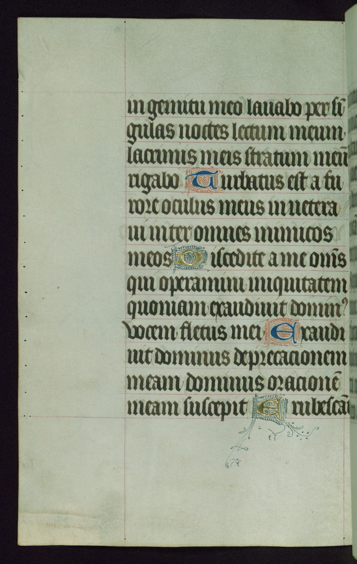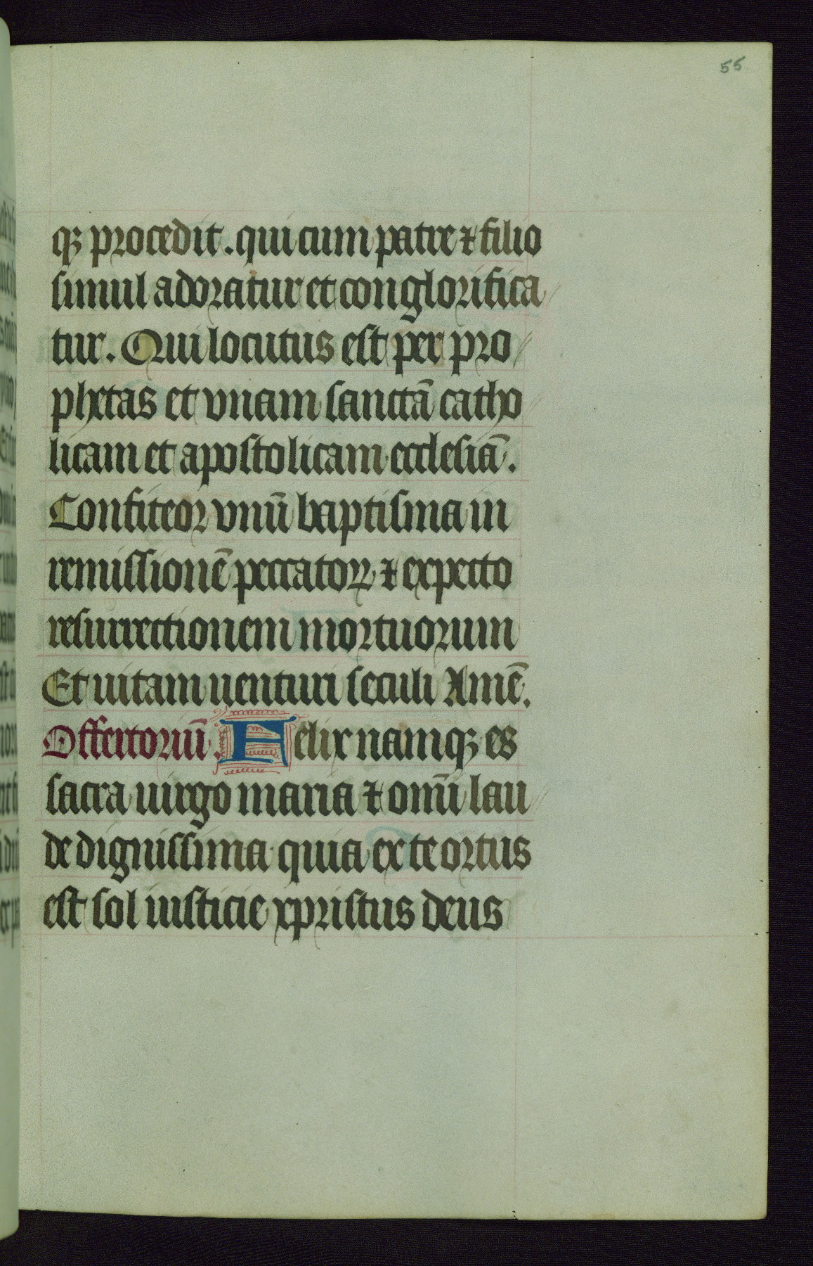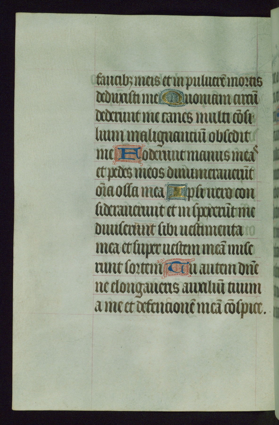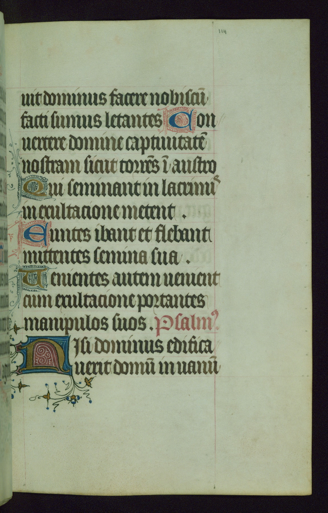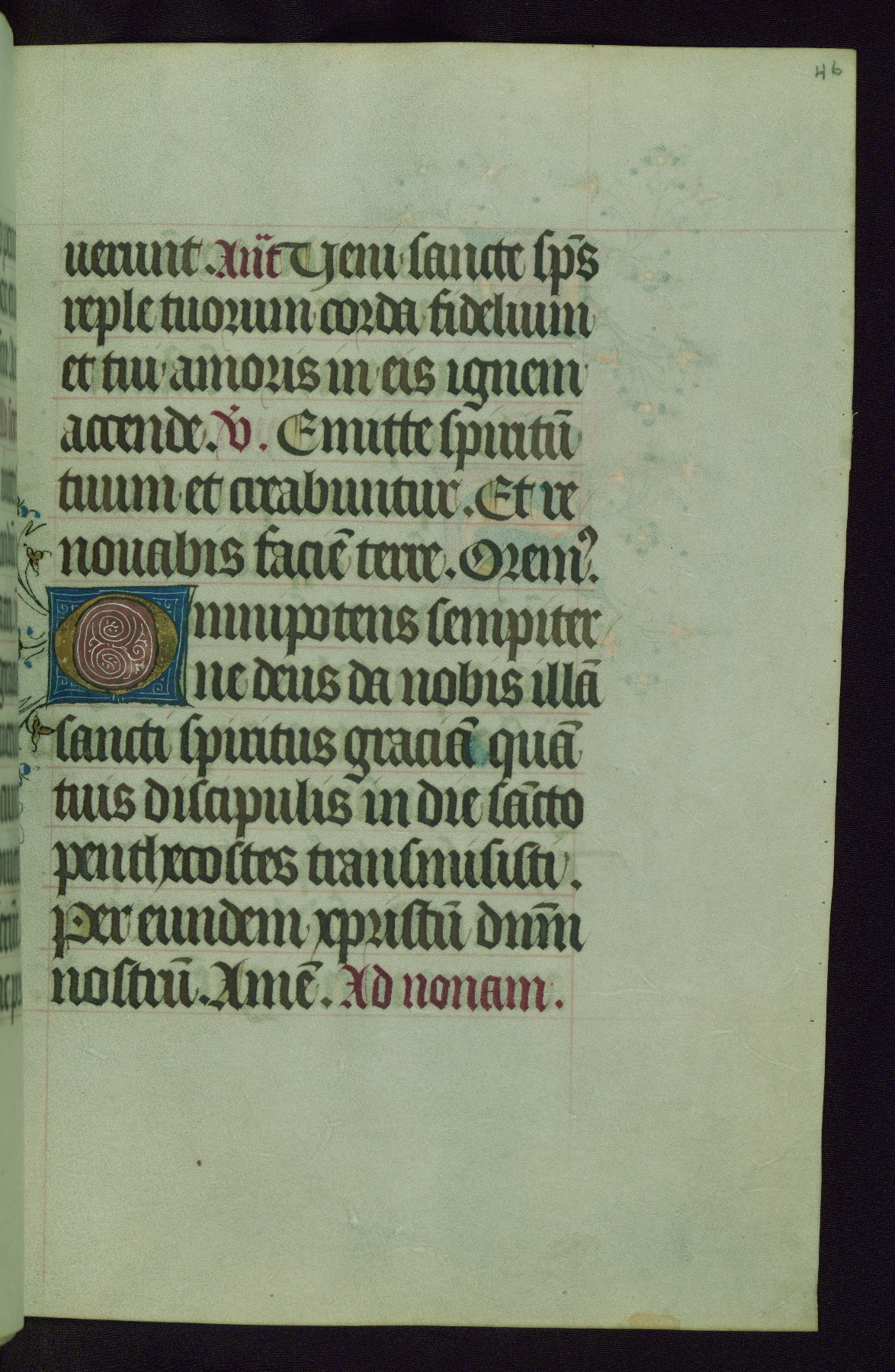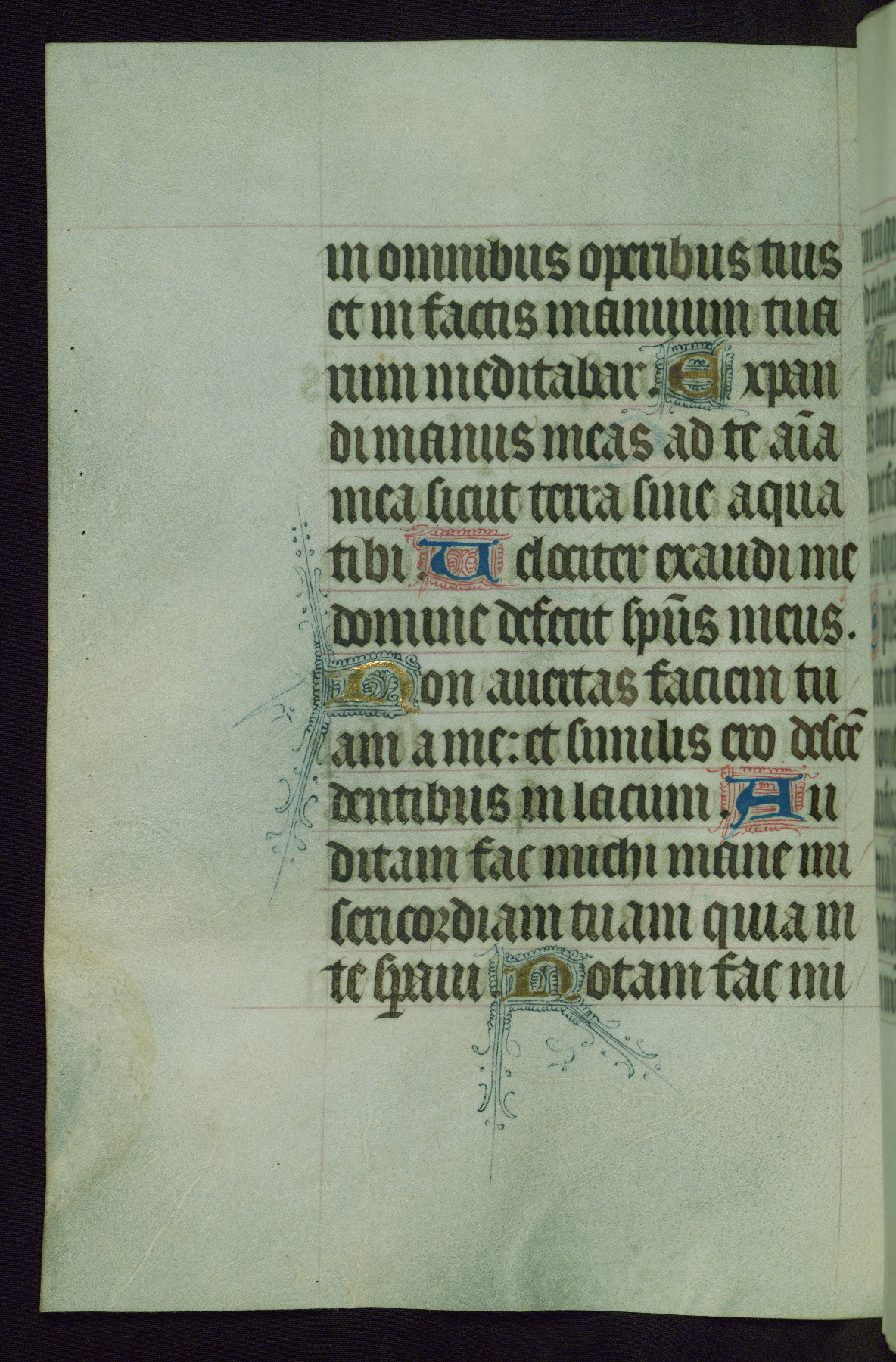 This Book of Hours, ca. 1460, was completed for use of Rome and illuminated under the influence, if not the direct participation, of Willem Vrelant. There remain twenty-two extant marginal calendar illustrations, thirteen extant full-page miniatures (many of which are paired with opening suffrages, perhaps suggesting a certain amount of significance to the owner), and one historiated initial. The contemporary binding, signed Livinus Stuaert, is dated 1477 and is most likely of Bruges or Ghent origin. It is thought that the first owner was French due to the French headings throughout and prominent fleur-de-lis figurations decorating the binding. Further, the first owner was likely female, suggested by the ways in which the book was structured to facilitate legibility. This is evinced by the large size of the script and the lack of abbreviations. While much of the text is standard, there remains evidence of personal significance and preference. This is seen in the chosen illuminations for those sections that are most significant to the owner. Most illuminations are paired with the opening page of staple Hours; however, many are accompanied by individual suffrages, constituting a large portion of the beginning of the manuscript. Personal preference is also shown in those sections of text that stray from the standard. The devotional sequence of this manuscript is notable for its sheer length and diversity of prayers as well as its inclusion of a French prayer not of official liturgy (fols. 215r-219v). The first collection of three prayers is headed and written in French. The prayer is attributed to St. Augustine and is described to guarantee a transformation of tribulation into joy through Christ's mercy, but only if the suppliant recites the prayer for thirty consecutive days. While it is not uncommon for evidence of an owner's predilections to surface in a Book of Hours, the particularly divergent features of this book allow readers to glean an intimate view of the patron.