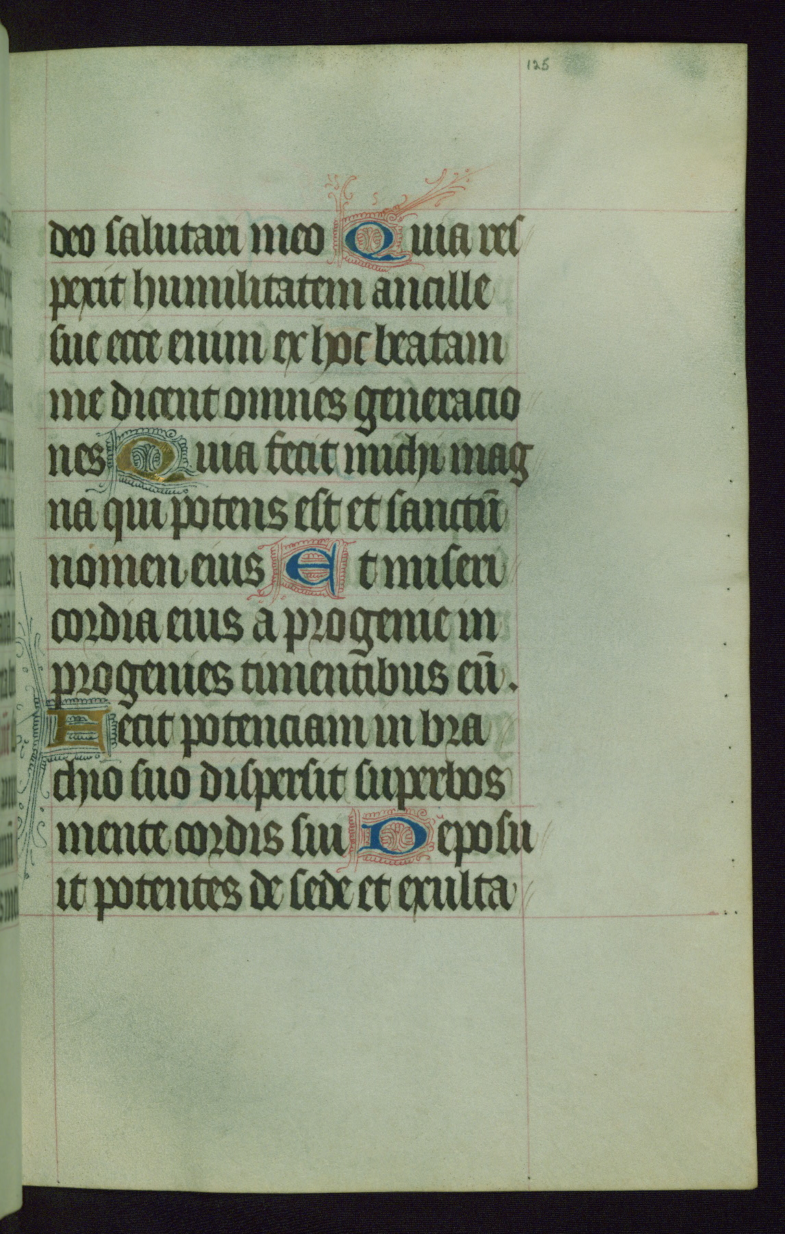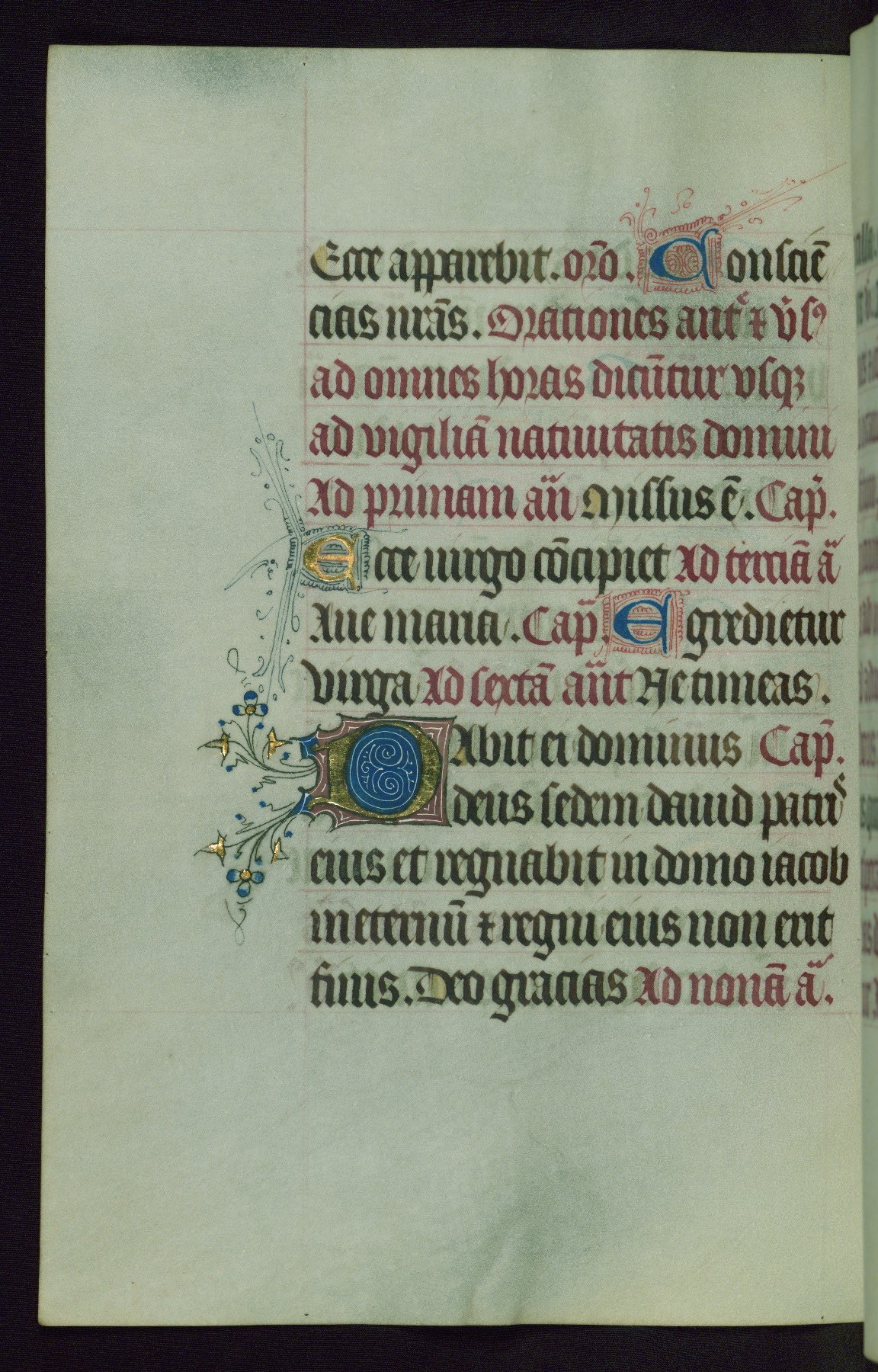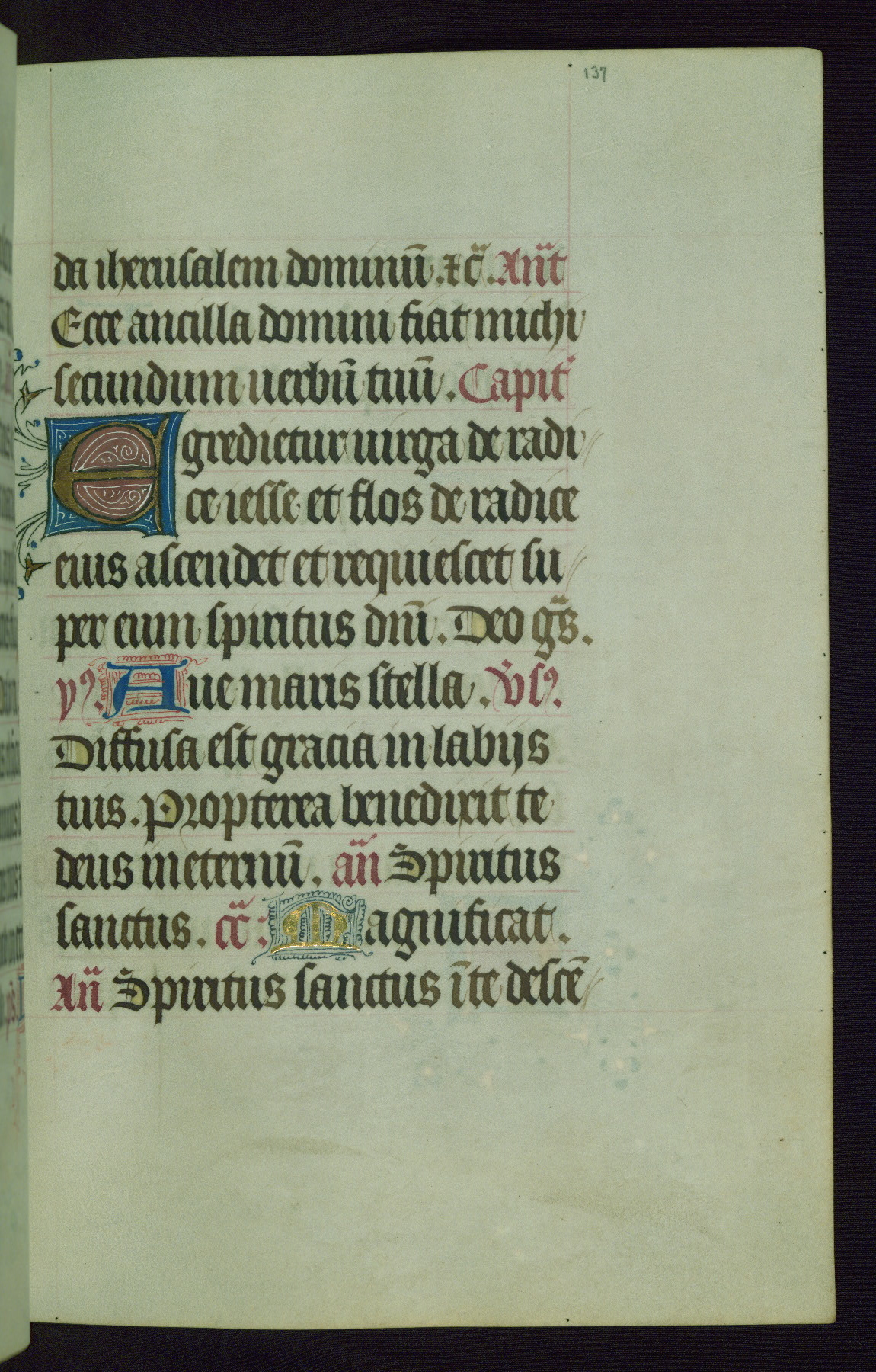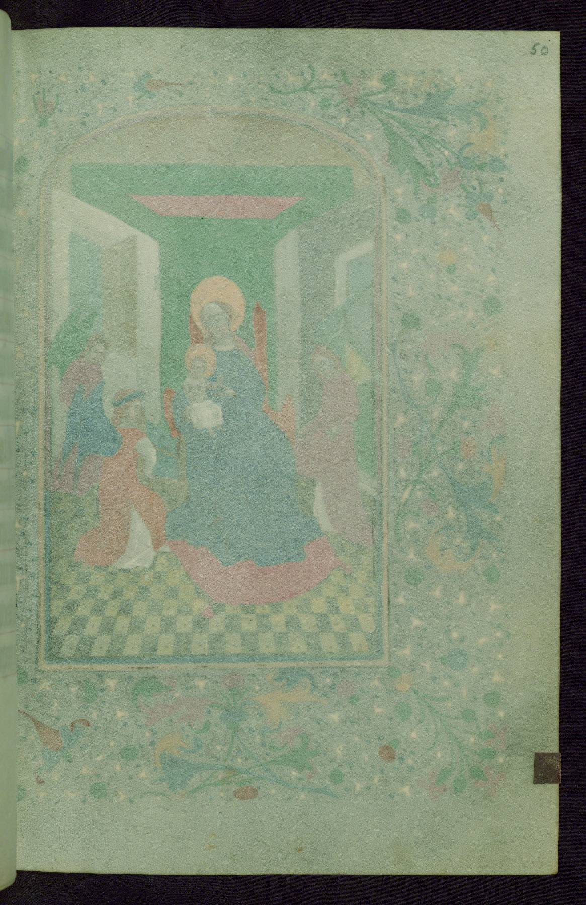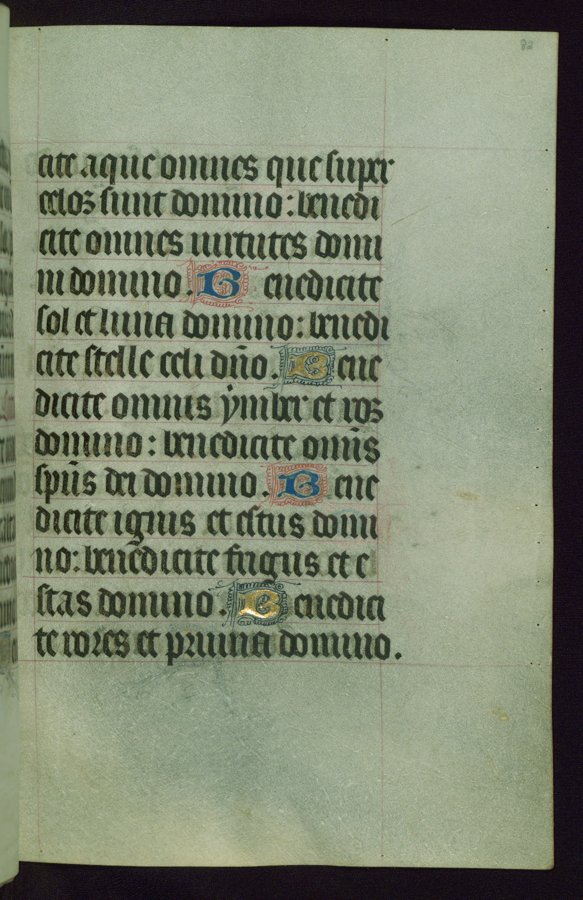 This Book of Hours, ca. 1460, was completed for use of Rome and illuminated under the influence, if not the direct participation, of Willem Vrelant. There remain twenty-two extant marginal calendar illustrations, thirteen extant full-page miniatures (many of which are paired with opening suffrages, perhaps suggesting a certain amount of significance to the owner), and one historiated initial. The contemporary binding, signed Livinus Stuaert, is dated 1477 and is most likely of Bruges or Ghent origin. It is thought that the first owner was French due to the French headings throughout and prominent fleur-de-lis figurations decorating the binding. Further, the first owner was likely female, suggested by the ways in which the book was structured to facilitate legibility. This is evinced by the large size of the script and the lack of abbreviations. While much of the text is standard, there remains evidence of personal significance and preference. This is seen in the chosen illuminations for those sections that are most significant to the owner. Most illuminations are paired with the opening page of staple Hours; however, many are accompanied by individual suffrages, constituting a large portion of the beginning of the manuscript. Personal preference is also shown in those sections of text that stray from the standard. The devotional sequence of this manuscript is notable for its sheer length and diversity of prayers as well as its inclusion of a French prayer not of official liturgy (fols. 215r-219v). The first collection of three prayers is headed and written in French. The prayer is attributed to St. Augustine and is described to guarantee a transformation of tribulation into joy through Christ's mercy, but only if the suppliant recites the prayer for thirty consecutive days. While it is not uncommon for evidence of an owner's predilections to surface in a Book of Hours, the particularly divergent features of this book allow readers to glean an intimate view of the patron.