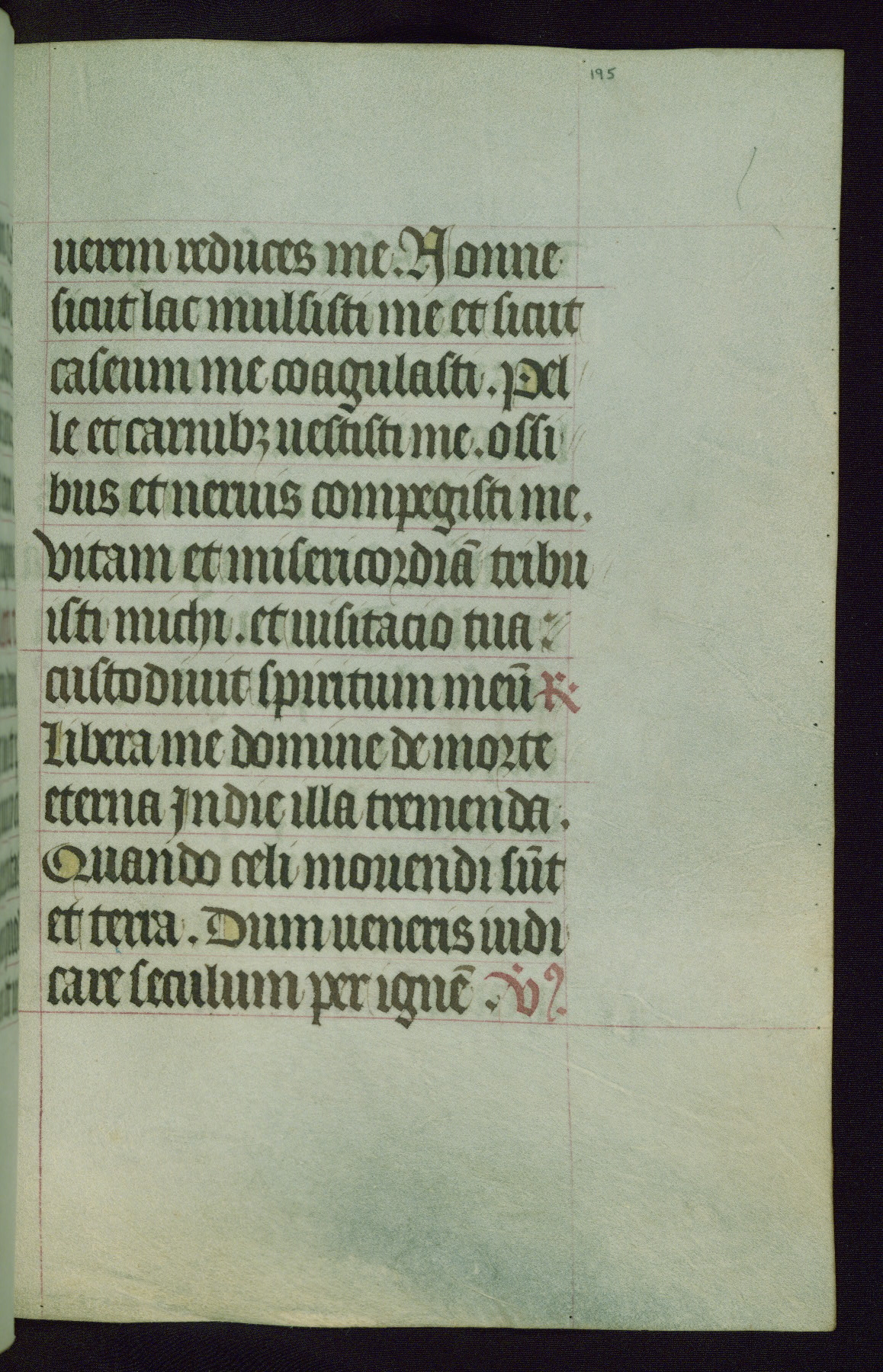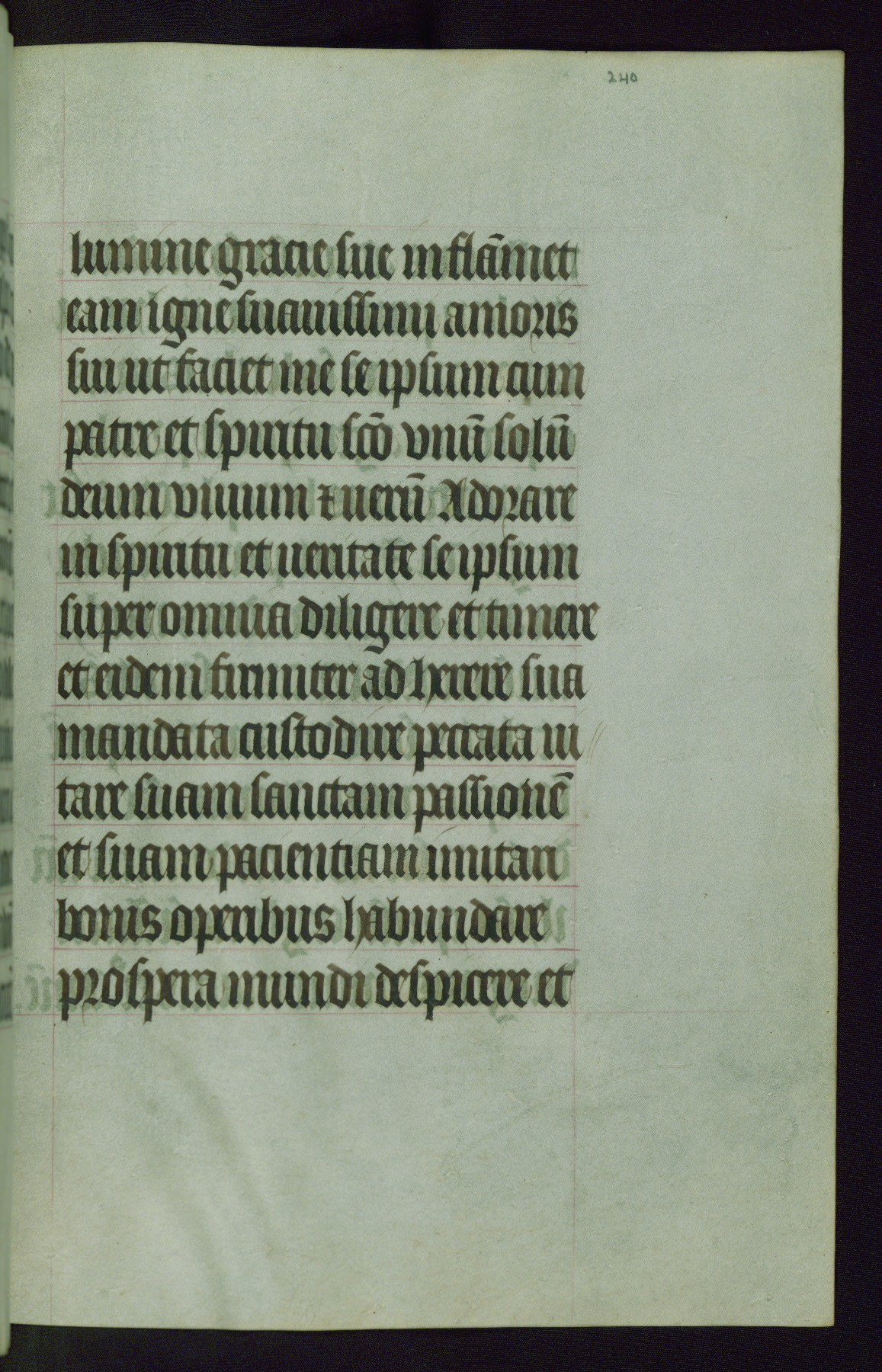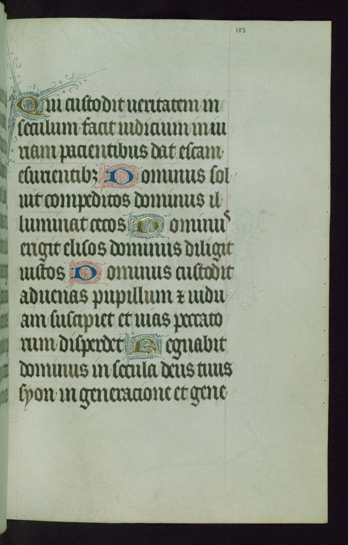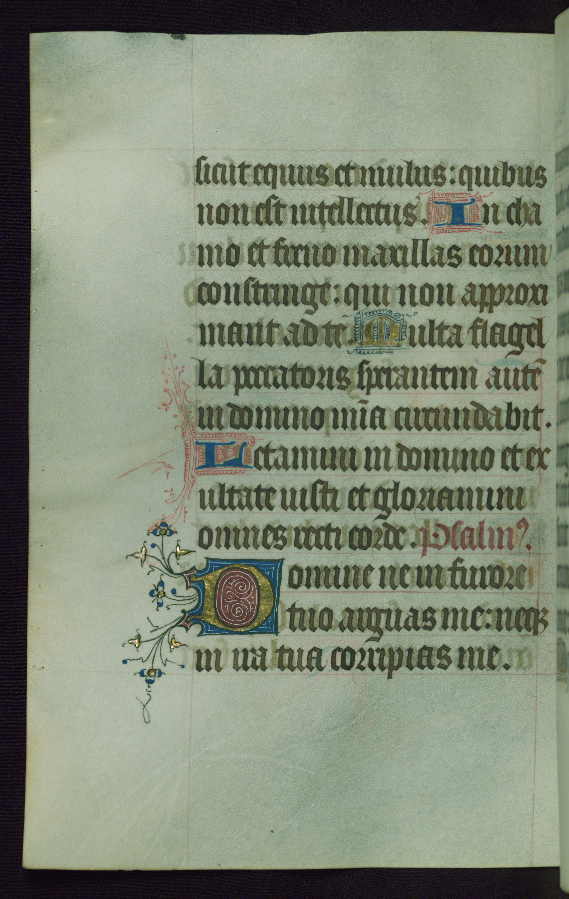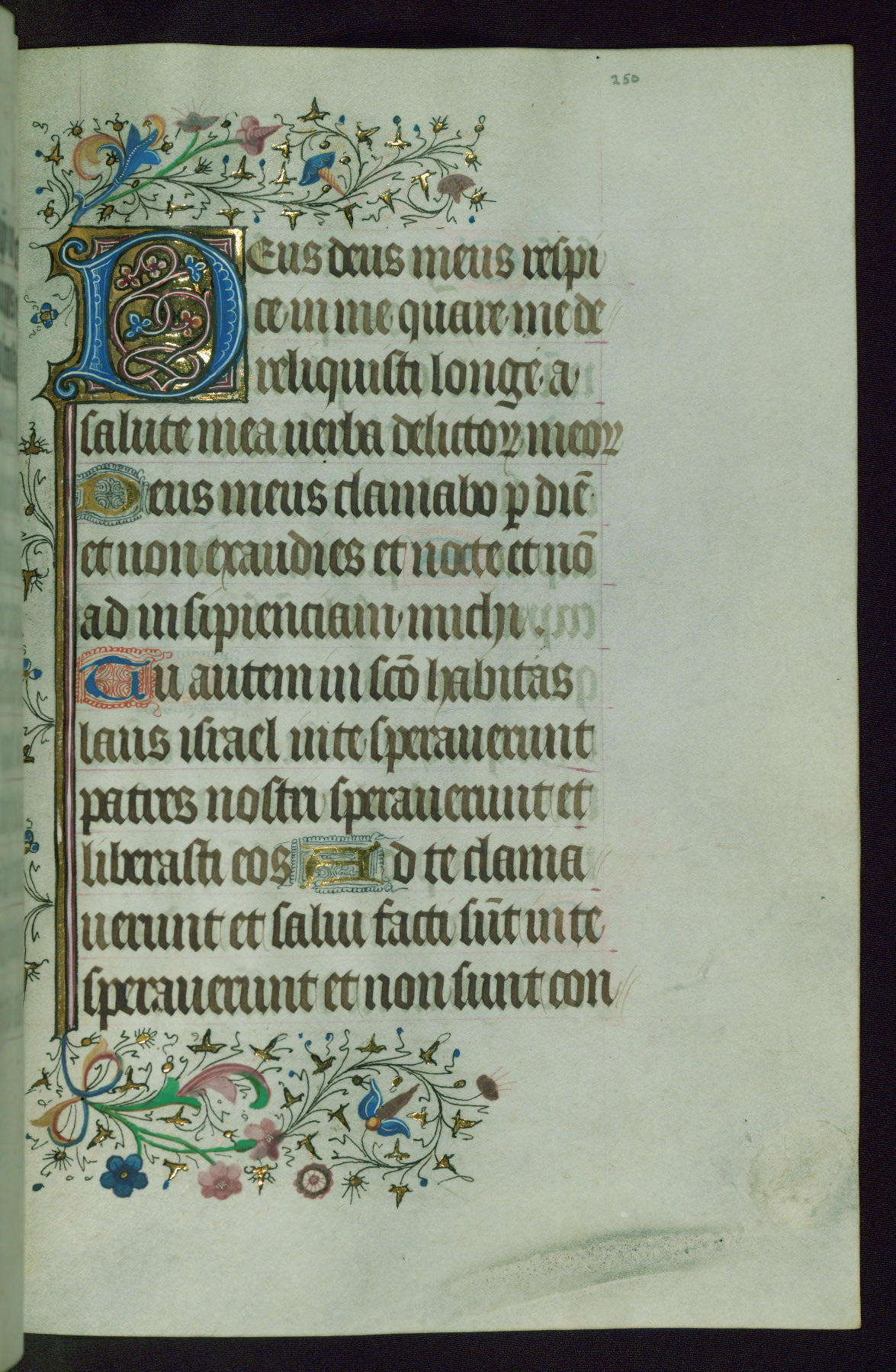 This Book of Hours, ca. 1460, was completed for use of Rome and illuminated under the influence, if not the direct participation, of Willem Vrelant. There remain twenty-two extant marginal calendar illustrations, thirteen extant full-page miniatures (many of which are paired with opening suffrages, perhaps suggesting a certain amount of significance to the owner), and one historiated initial. The contemporary binding, signed Livinus Stuaert, is dated 1477 and is most likely of Bruges or Ghent origin. It is thought that the first owner was French due to the French headings throughout and prominent fleur-de-lis figurations decorating the binding. Further, the first owner was likely female, suggested by the ways in which the book was structured to facilitate legibility. This is evinced by the large size of the script and the lack of abbreviations. While much of the text is standard, there remains evidence of personal significance and preference. This is seen in the chosen illuminations for those sections that are most significant to the owner. Most illuminations are paired with the opening page of staple Hours; however, many are accompanied by individual suffrages, constituting a large portion of the beginning of the manuscript. Personal preference is also shown in those sections of text that stray from the standard. The devotional sequence of this manuscript is notable for its sheer length and diversity of prayers as well as its inclusion of a French prayer not of official liturgy (fols. 215r-219v). The first collection of three prayers is headed and written in French. The prayer is attributed to St. Augustine and is described to guarantee a transformation of tribulation into joy through Christ's mercy, but only if the suppliant recites the prayer for thirty consecutive days. While it is not uncommon for evidence of an owner's predilections to surface in a Book of Hours, the particularly divergent features of this book allow readers to glean an intimate view of the patron.