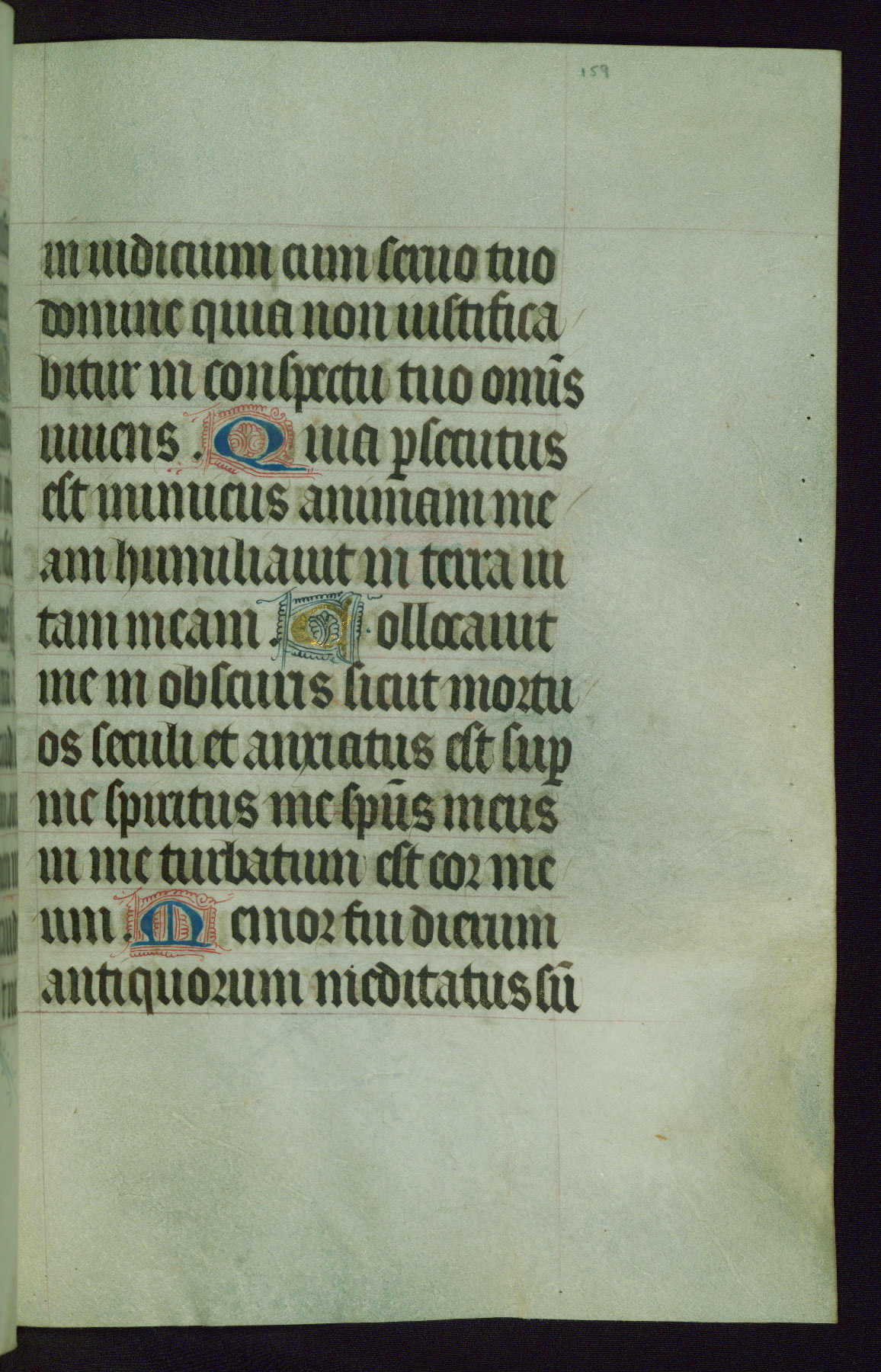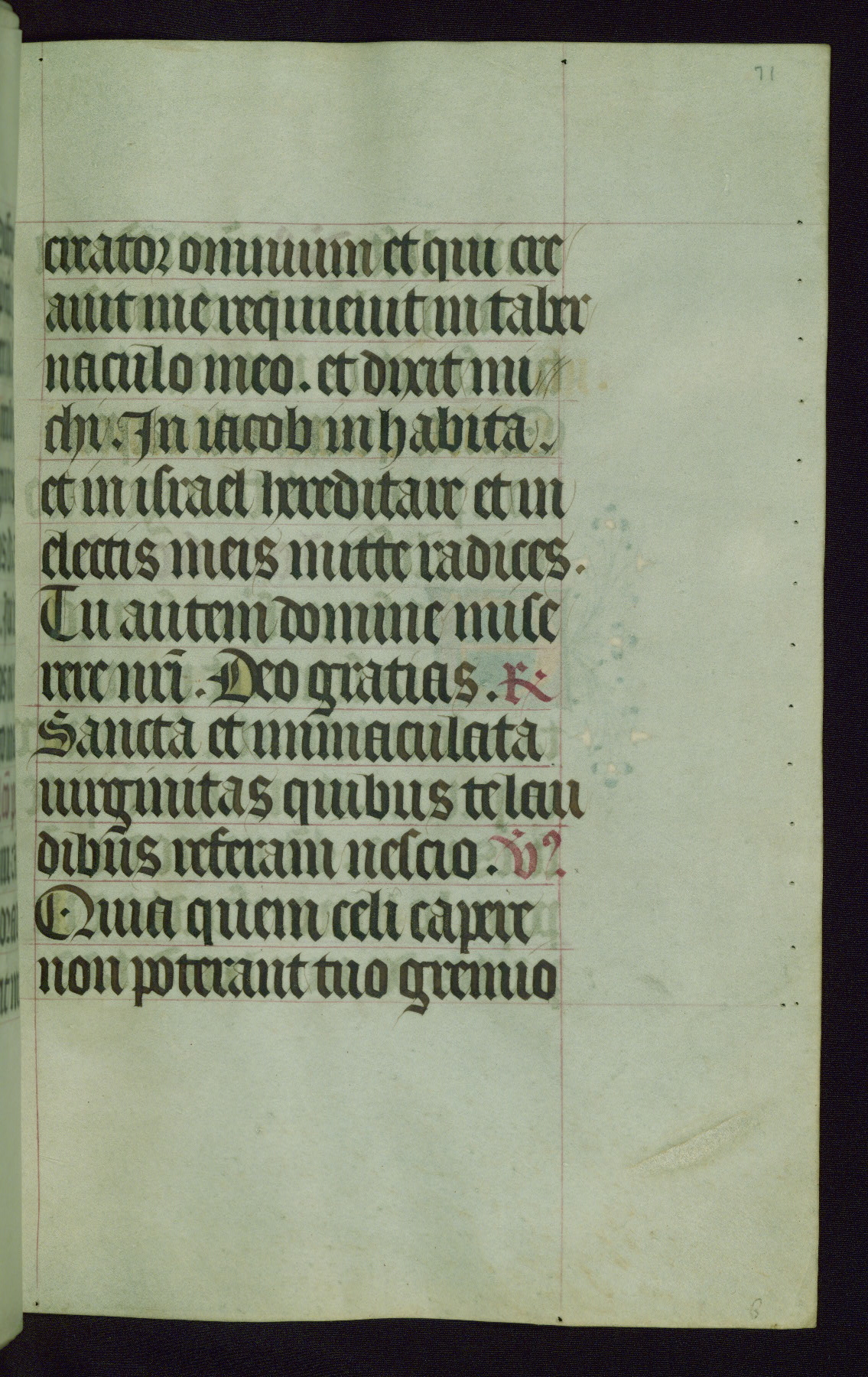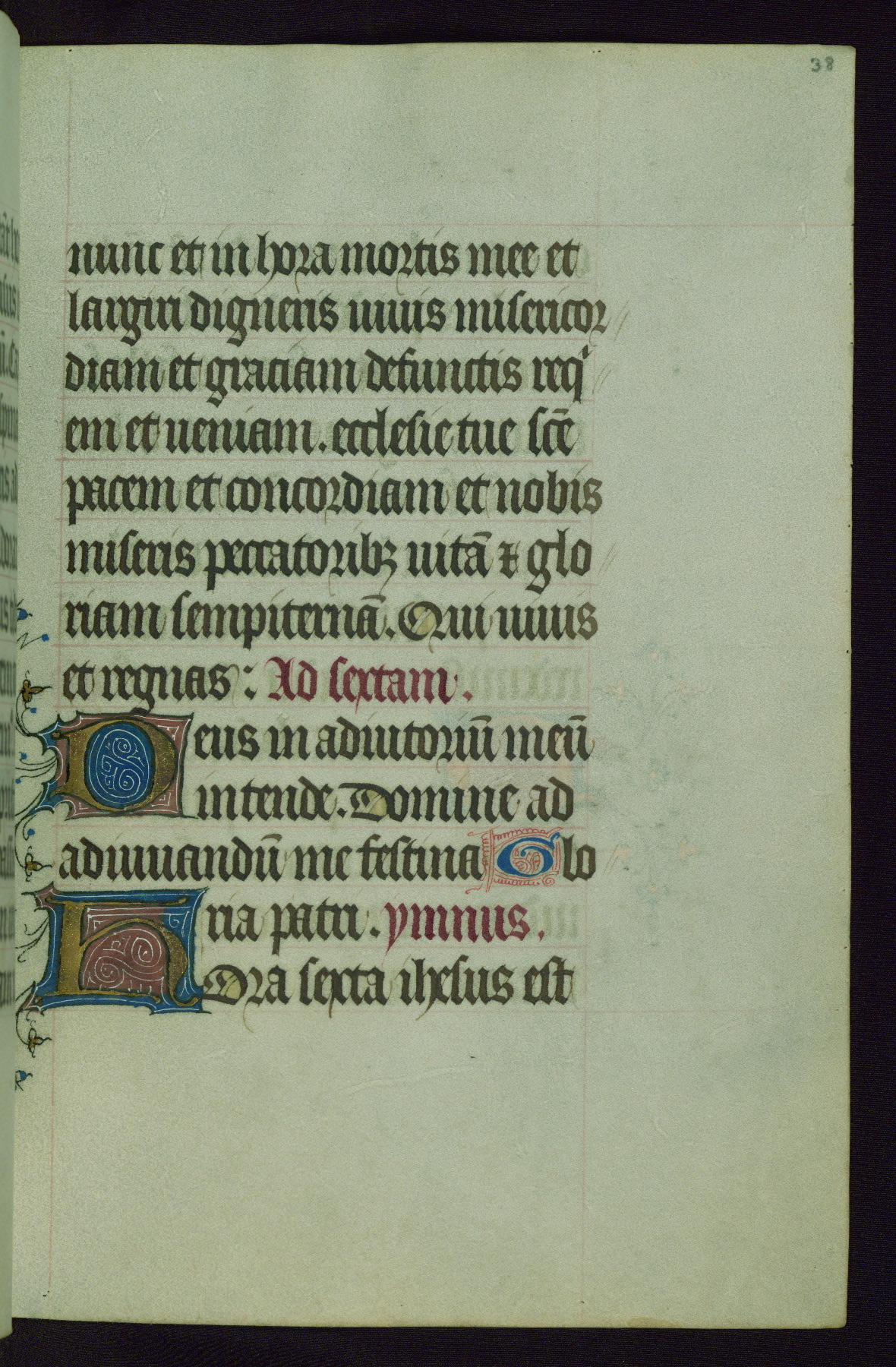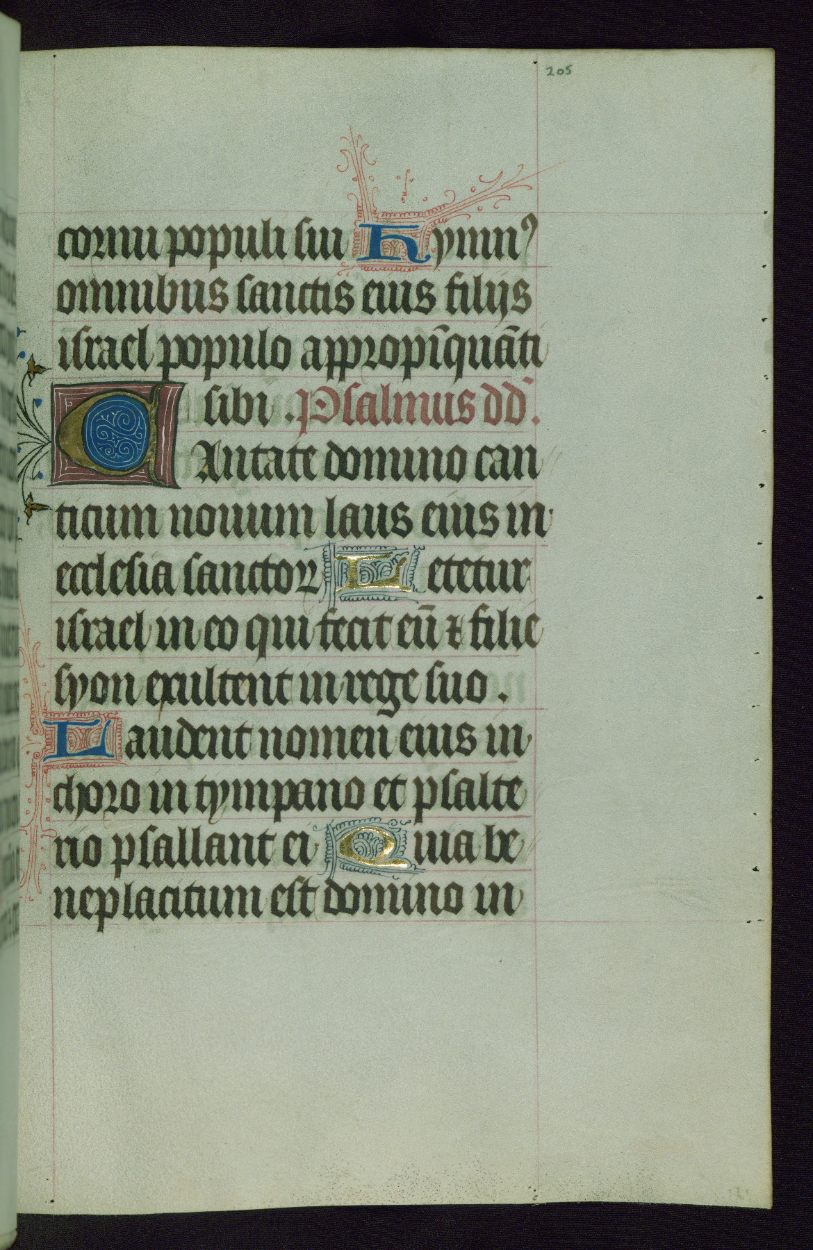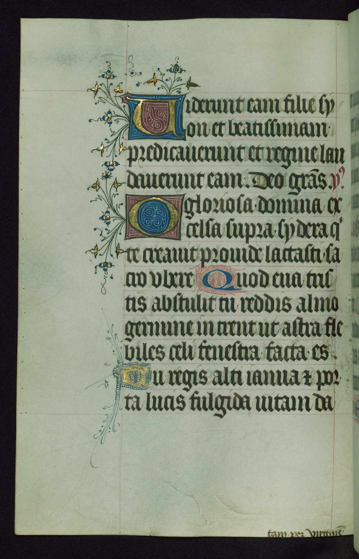 This Book of Hours, ca. 1460, was completed for use of Rome and illuminated under the influence, if not the direct participation, of Willem Vrelant. There remain twenty-two extant marginal calendar illustrations, thirteen extant full-page miniatures (many of which are paired with opening suffrages, perhaps suggesting a certain amount of significance to the owner), and one historiated initial. The contemporary binding, signed Livinus Stuaert, is dated 1477 and is most likely of Bruges or Ghent origin. It is thought that the first owner was French due to the French headings throughout and prominent fleur-de-lis figurations decorating the binding. Further, the first owner was likely female, suggested by the ways in which the book was structured to facilitate legibility. This is evinced by the large size of the script and the lack of abbreviations. While much of the text is standard, there remains evidence of personal significance and preference. This is seen in the chosen illuminations for those sections that are most significant to the owner. Most illuminations are paired with the opening page of staple Hours; however, many are accompanied by individual suffrages, constituting a large portion of the beginning of the manuscript. Personal preference is also shown in those sections of text that stray from the standard. The devotional sequence of this manuscript is notable for its sheer length and diversity of prayers as well as its inclusion of a French prayer not of official liturgy (fols. 215r-219v). The first collection of three prayers is headed and written in French. The prayer is attributed to St. Augustine and is described to guarantee a transformation of tribulation into joy through Christ's mercy, but only if the suppliant recites the prayer for thirty consecutive days. While it is not uncommon for evidence of an owner's predilections to surface in a Book of Hours, the particularly divergent features of this book allow readers to glean an intimate view of the patron.