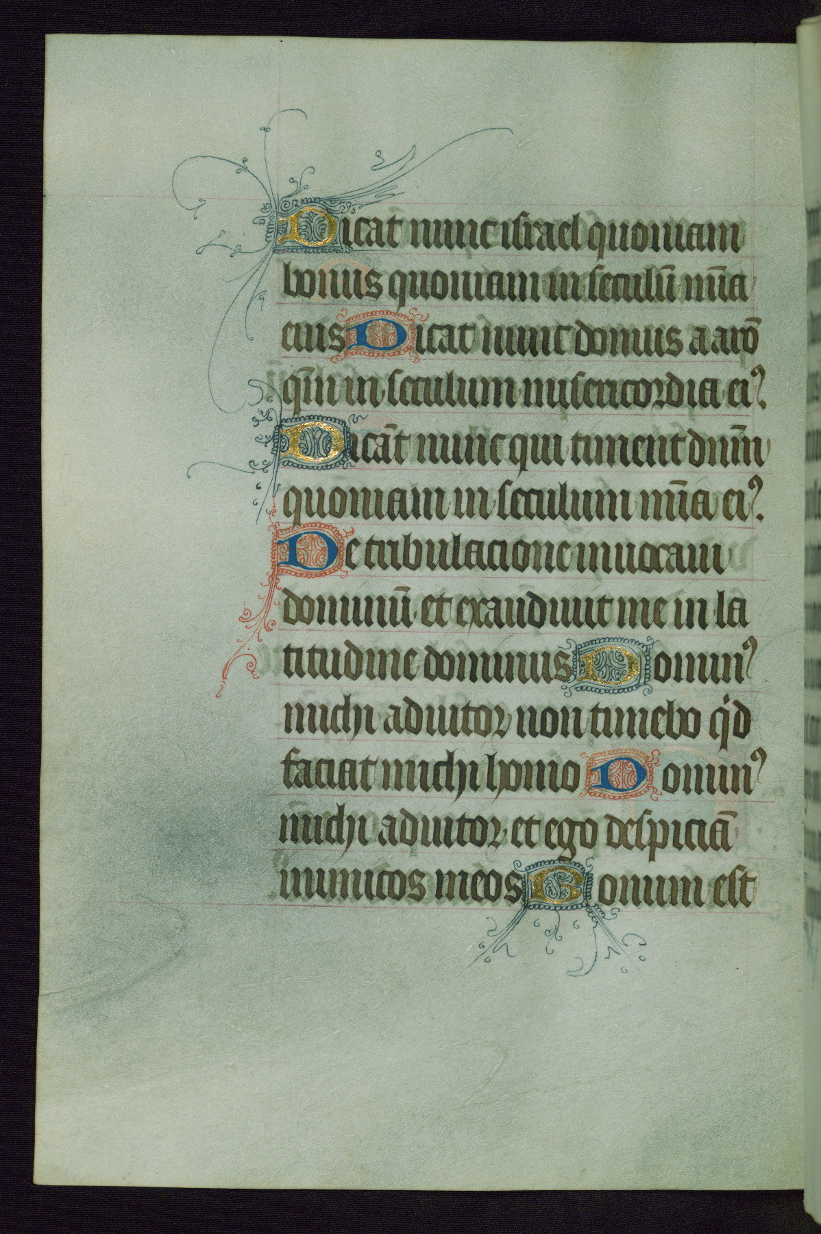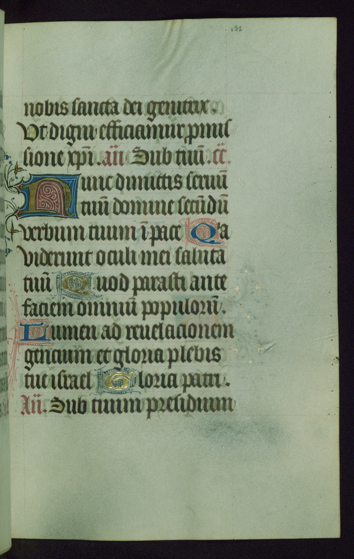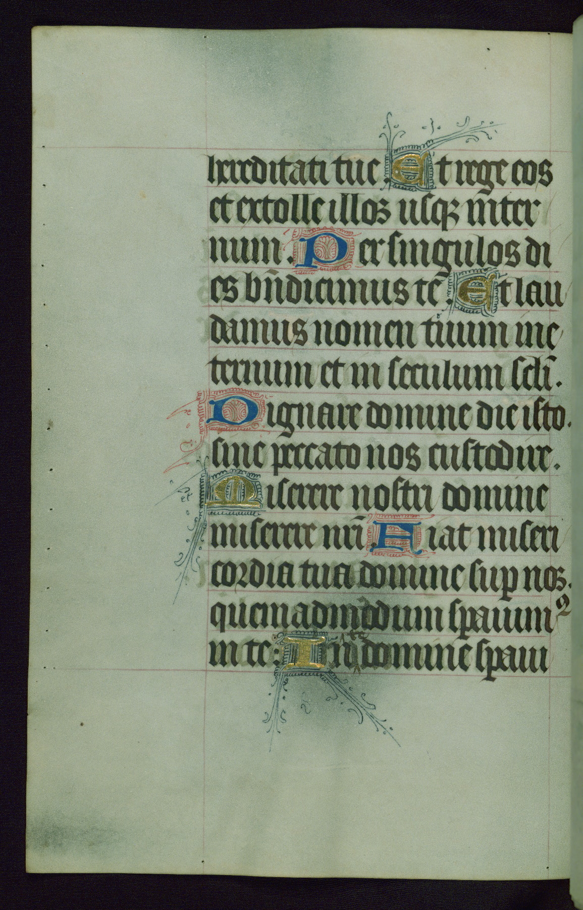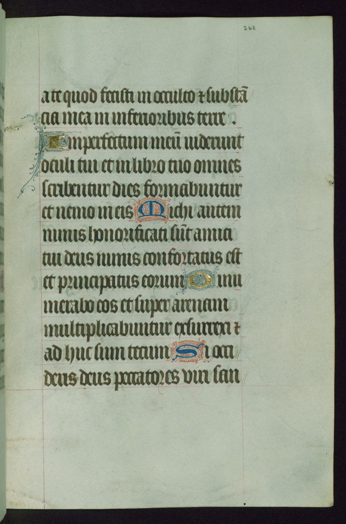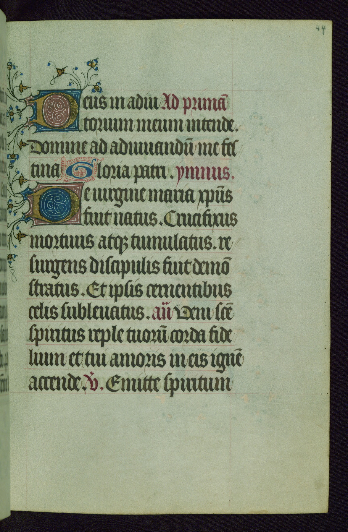 This Book of Hours, ca. 1460, was completed for use of Rome and illuminated under the influence, if not the direct participation, of Willem Vrelant. There remain twenty-two extant marginal calendar illustrations, thirteen extant full-page miniatures (many of which are paired with opening suffrages, perhaps suggesting a certain amount of significance to the owner), and one historiated initial. The contemporary binding, signed Livinus Stuaert, is dated 1477 and is most likely of Bruges or Ghent origin. It is thought that the first owner was French due to the French headings throughout and prominent fleur-de-lis figurations decorating the binding. Further, the first owner was likely female, suggested by the ways in which the book was structured to facilitate legibility. This is evinced by the large size of the script and the lack of abbreviations. While much of the text is standard, there remains evidence of personal significance and preference. This is seen in the chosen illuminations for those sections that are most significant to the owner. Most illuminations are paired with the opening page of staple Hours; however, many are accompanied by individual suffrages, constituting a large portion of the beginning of the manuscript. Personal preference is also shown in those sections of text that stray from the standard. The devotional sequence of this manuscript is notable for its sheer length and diversity of prayers as well as its inclusion of a French prayer not of official liturgy (fols. 215r-219v). The first collection of three prayers is headed and written in French. The prayer is attributed to St. Augustine and is described to guarantee a transformation of tribulation into joy through Christ's mercy, but only if the suppliant recites the prayer for thirty consecutive days. While it is not uncommon for evidence of an owner's predilections to surface in a Book of Hours, the particularly divergent features of this book allow readers to glean an intimate view of the patron.