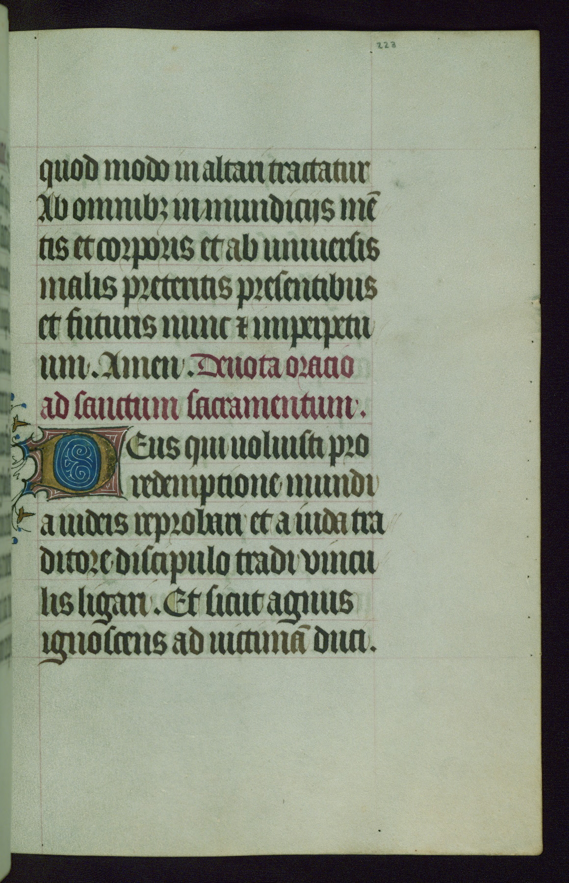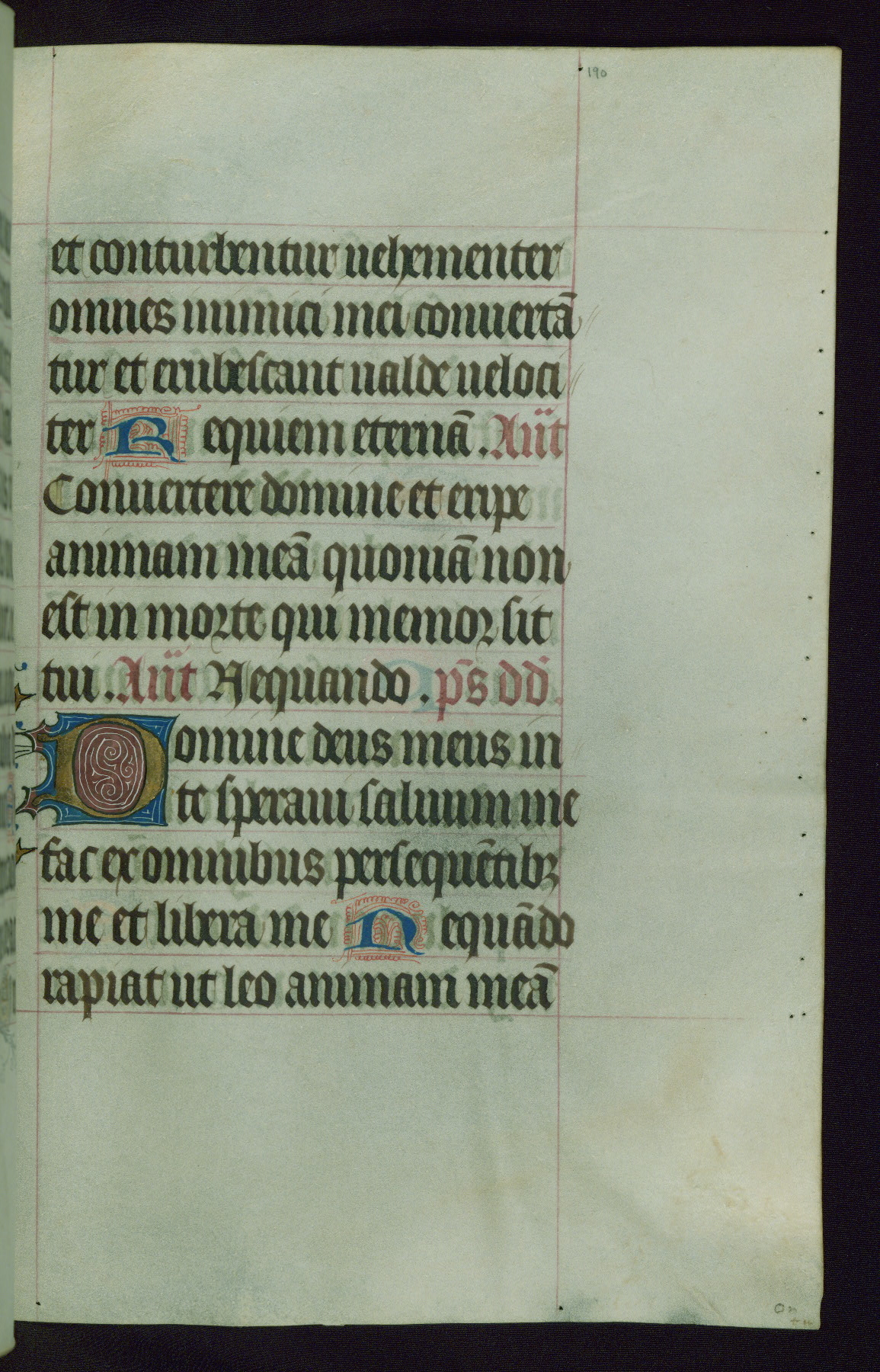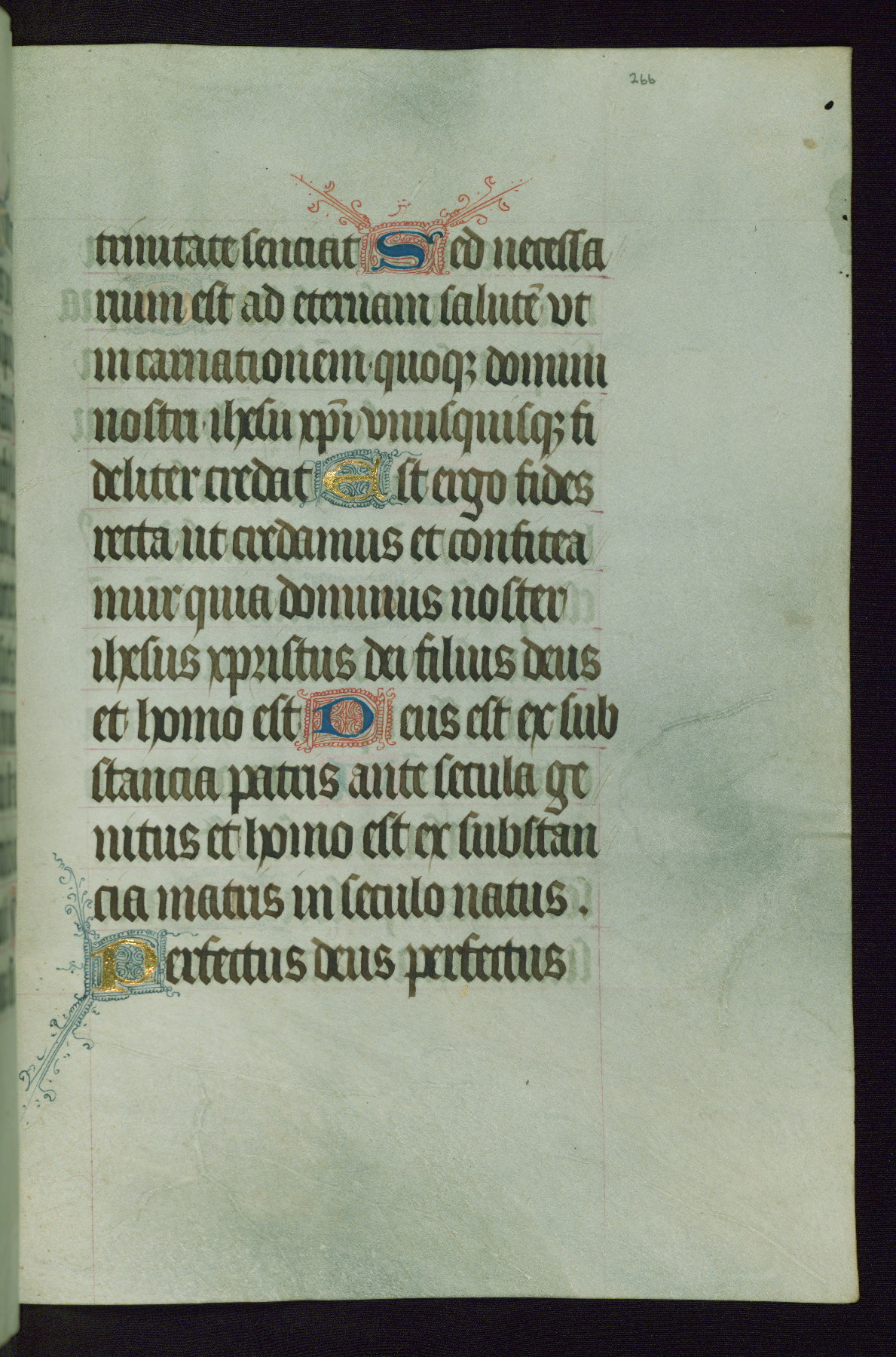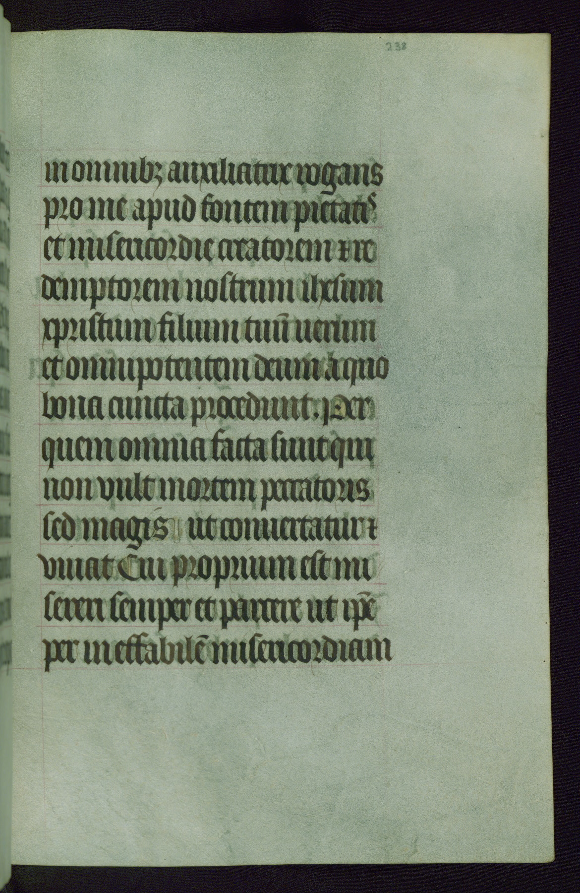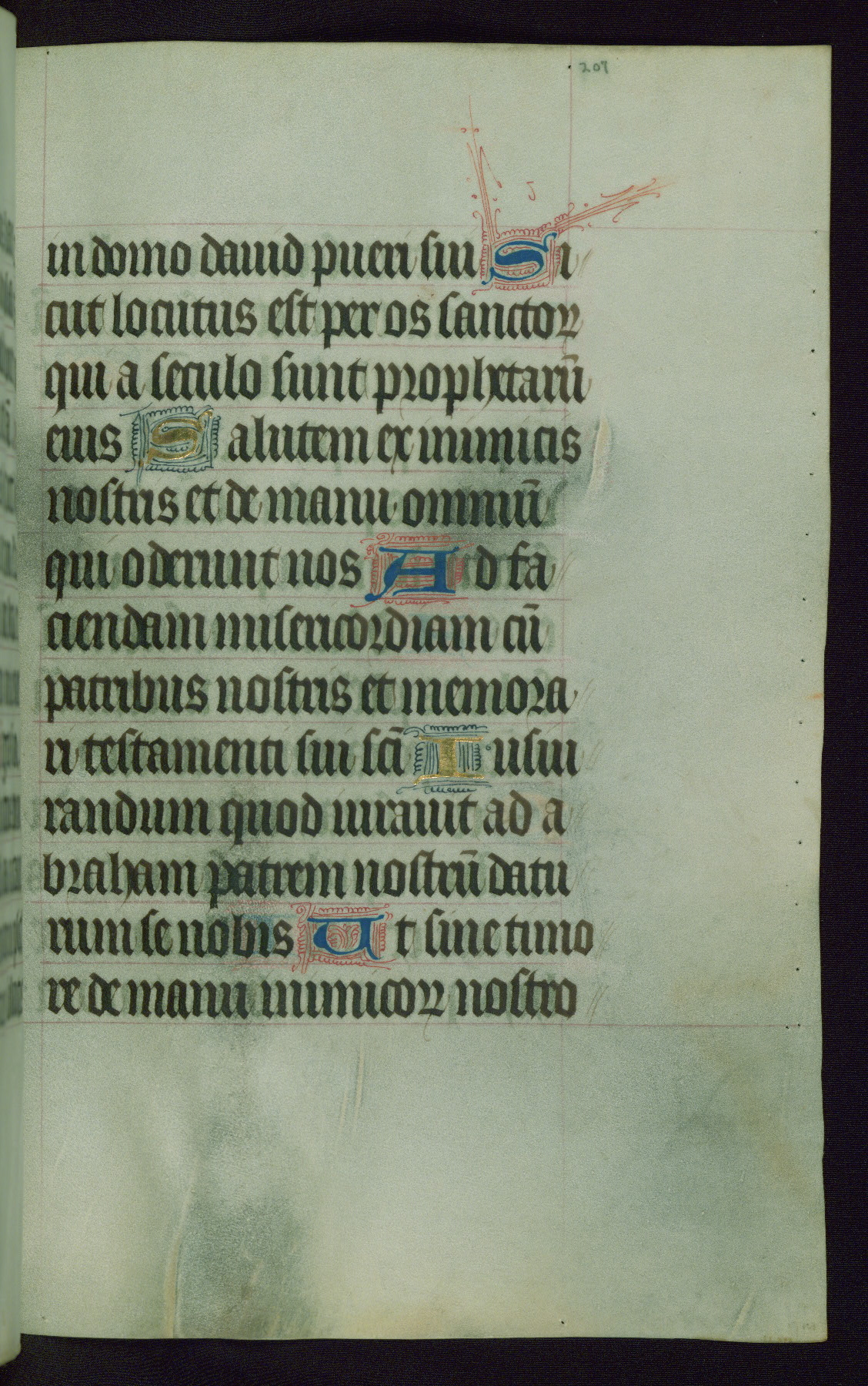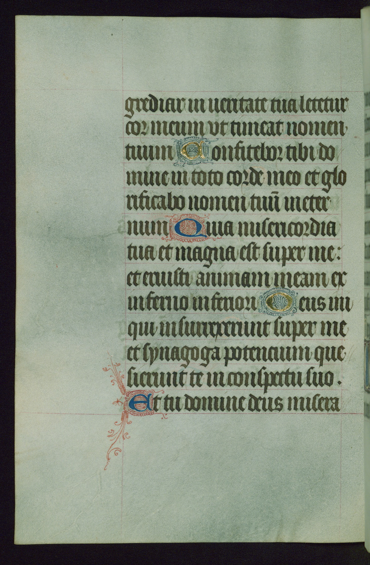 This Book of Hours, ca. 1460, was completed for use of Rome and illuminated under the influence, if not the direct participation, of Willem Vrelant. There remain twenty-two extant marginal calendar illustrations, thirteen extant full-page miniatures (many of which are paired with opening suffrages, perhaps suggesting a certain amount of significance to the owner), and one historiated initial. The contemporary binding, signed Livinus Stuaert, is dated 1477 and is most likely of Bruges or Ghent origin. It is thought that the first owner was French due to the French headings throughout and prominent fleur-de-lis figurations decorating the binding. Further, the first owner was likely female, suggested by the ways in which the book was structured to facilitate legibility. This is evinced by the large size of the script and the lack of abbreviations. While much of the text is standard, there remains evidence of personal significance and preference. This is seen in the chosen illuminations for those sections that are most significant to the owner. Most illuminations are paired with the opening page of staple Hours; however, many are accompanied by individual suffrages, constituting a large portion of the beginning of the manuscript. Personal preference is also shown in those sections of text that stray from the standard. The devotional sequence of this manuscript is notable for its sheer length and diversity of prayers as well as its inclusion of a French prayer not of official liturgy (fols. 215r-219v). The first collection of three prayers is headed and written in French. The prayer is attributed to St. Augustine and is described to guarantee a transformation of tribulation into joy through Christ's mercy, but only if the suppliant recites the prayer for thirty consecutive days. While it is not uncommon for evidence of an owner's predilections to surface in a Book of Hours, the particularly divergent features of this book allow readers to glean an intimate view of the patron.