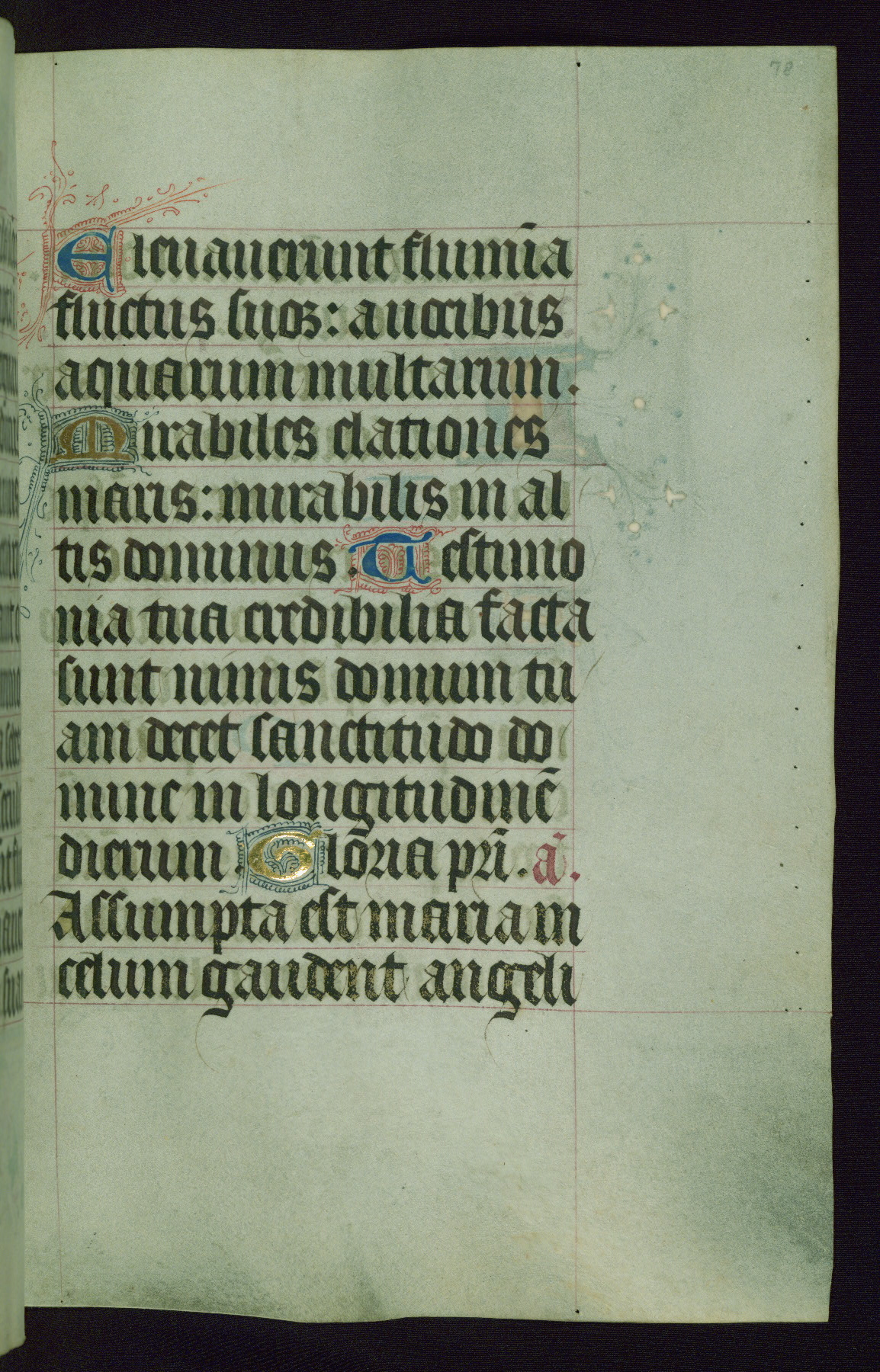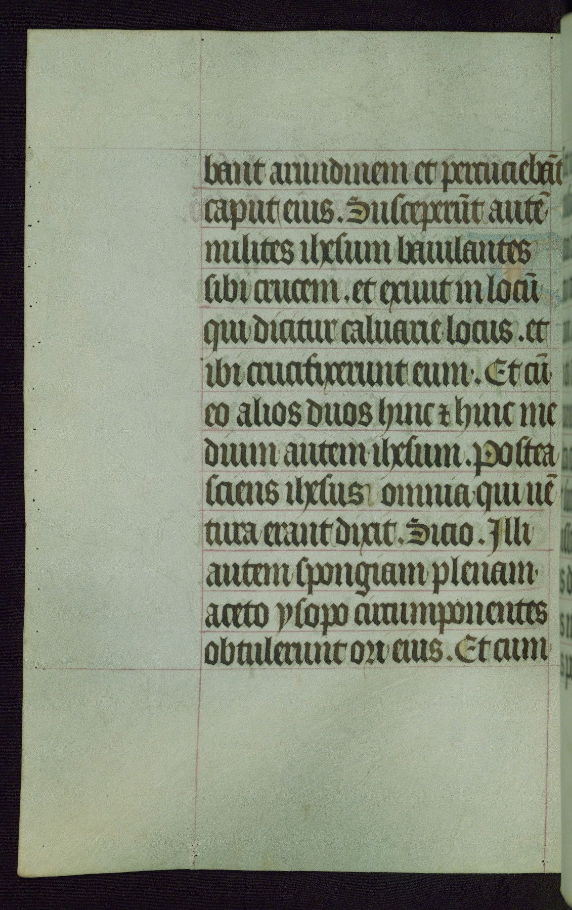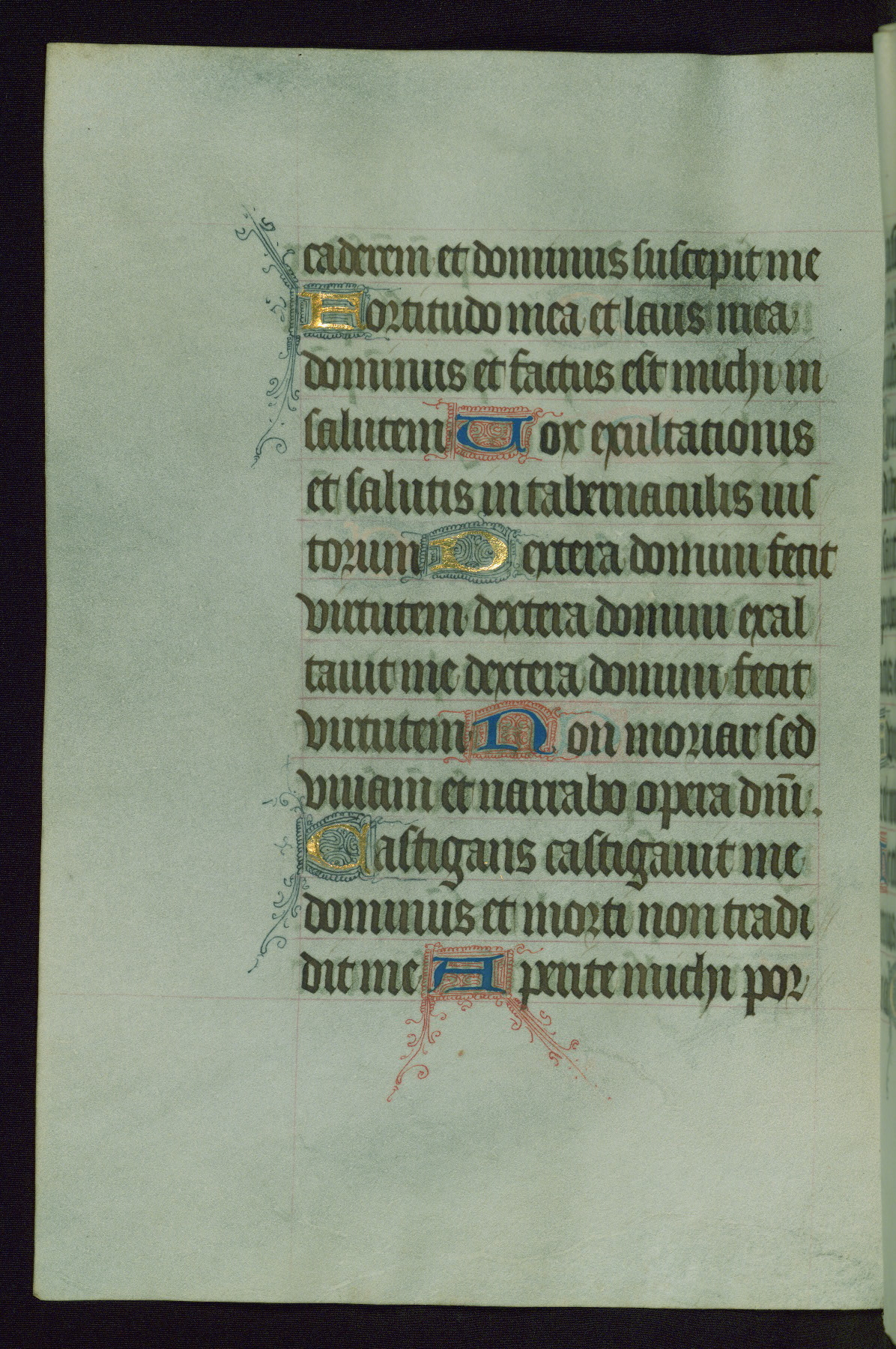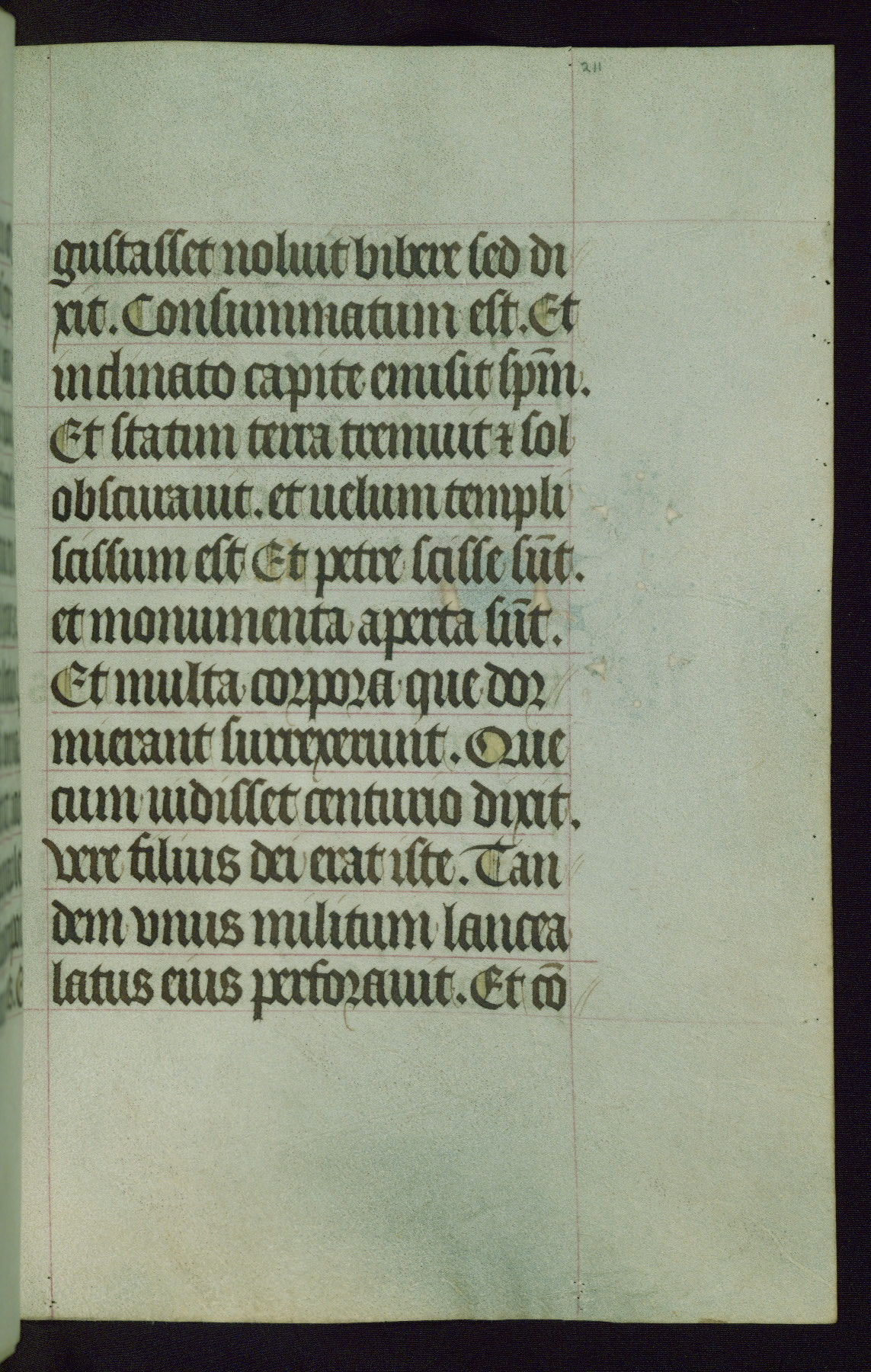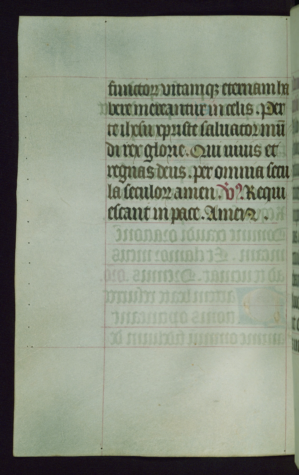 This Book of Hours, ca. 1460, was completed for use of Rome and illuminated under the influence, if not the direct participation, of Willem Vrelant. There remain twenty-two extant marginal calendar illustrations, thirteen extant full-page miniatures (many of which are paired with opening suffrages, perhaps suggesting a certain amount of significance to the owner), and one historiated initial. The contemporary binding, signed Livinus Stuaert, is dated 1477 and is most likely of Bruges or Ghent origin. It is thought that the first owner was French due to the French headings throughout and prominent fleur-de-lis figurations decorating the binding. Further, the first owner was likely female, suggested by the ways in which the book was structured to facilitate legibility. This is evinced by the large size of the script and the lack of abbreviations. While much of the text is standard, there remains evidence of personal significance and preference. This is seen in the chosen illuminations for those sections that are most significant to the owner. Most illuminations are paired with the opening page of staple Hours; however, many are accompanied by individual suffrages, constituting a large portion of the beginning of the manuscript. Personal preference is also shown in those sections of text that stray from the standard. The devotional sequence of this manuscript is notable for its sheer length and diversity of prayers as well as its inclusion of a French prayer not of official liturgy (fols. 215r-219v). The first collection of three prayers is headed and written in French. The prayer is attributed to St. Augustine and is described to guarantee a transformation of tribulation into joy through Christ's mercy, but only if the suppliant recites the prayer for thirty consecutive days. While it is not uncommon for evidence of an owner's predilections to surface in a Book of Hours, the particularly divergent features of this book allow readers to glean an intimate view of the patron.