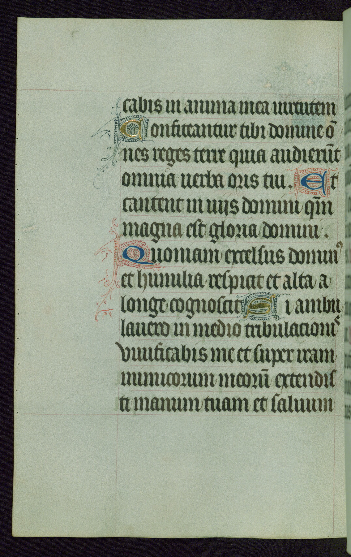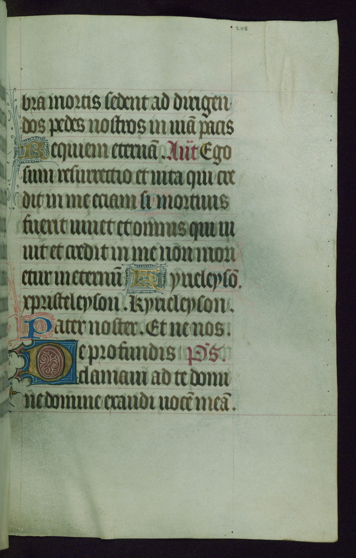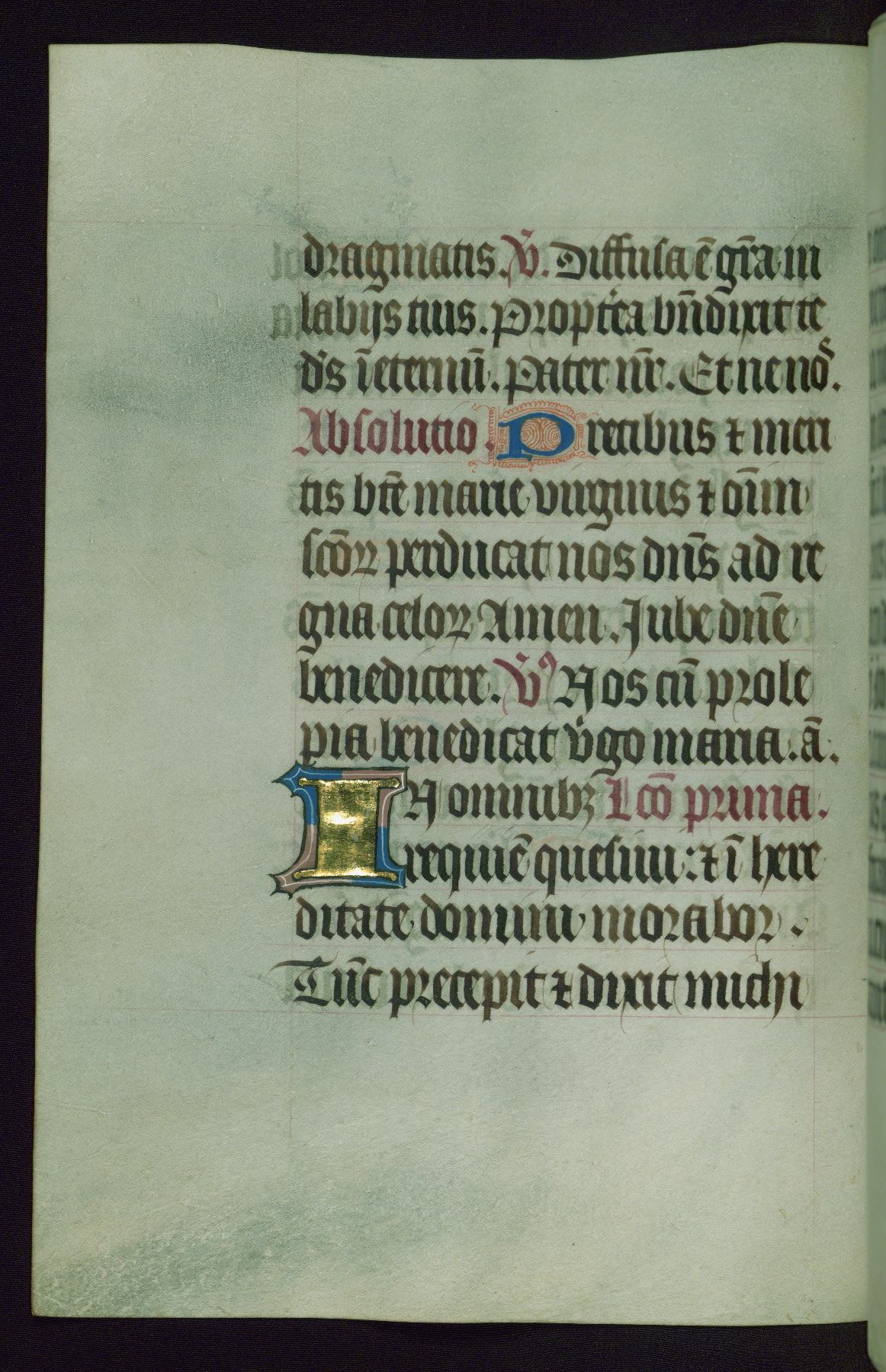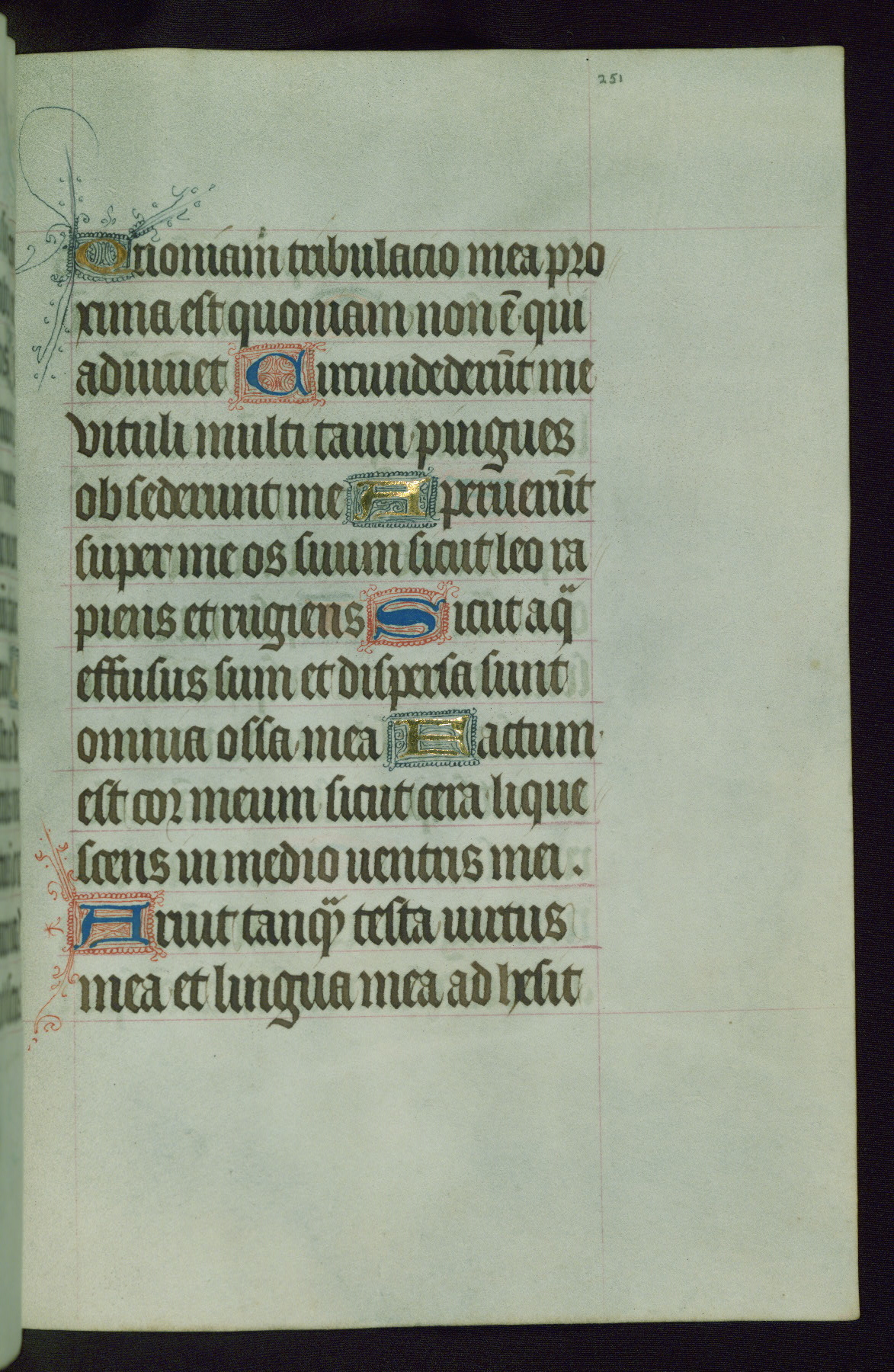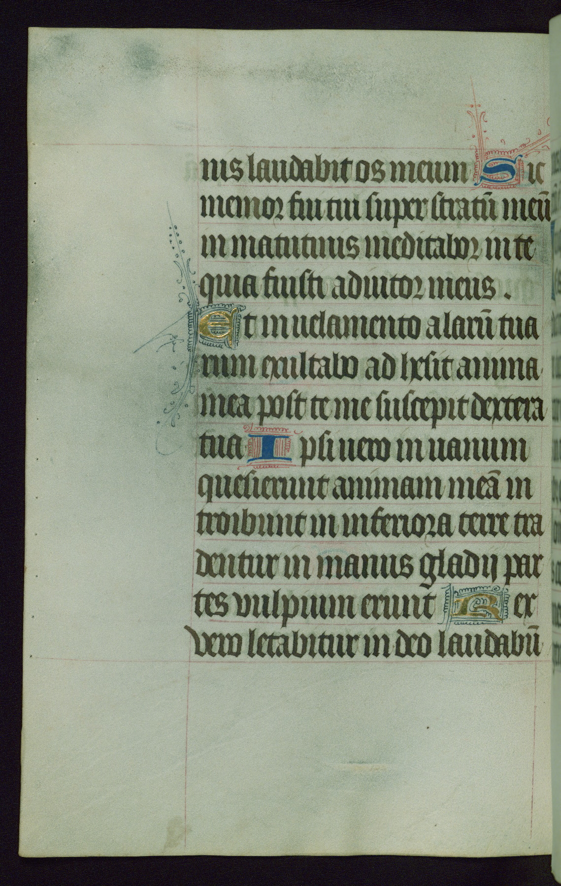 This Book of Hours, ca. 1460, was completed for use of Rome and illuminated under the influence, if not the direct participation, of Willem Vrelant. There remain twenty-two extant marginal calendar illustrations, thirteen extant full-page miniatures (many of which are paired with opening suffrages, perhaps suggesting a certain amount of significance to the owner), and one historiated initial. The contemporary binding, signed Livinus Stuaert, is dated 1477 and is most likely of Bruges or Ghent origin. It is thought that the first owner was French due to the French headings throughout and prominent fleur-de-lis figurations decorating the binding. Further, the first owner was likely female, suggested by the ways in which the book was structured to facilitate legibility. This is evinced by the large size of the script and the lack of abbreviations. While much of the text is standard, there remains evidence of personal significance and preference. This is seen in the chosen illuminations for those sections that are most significant to the owner. Most illuminations are paired with the opening page of staple Hours; however, many are accompanied by individual suffrages, constituting a large portion of the beginning of the manuscript. Personal preference is also shown in those sections of text that stray from the standard. The devotional sequence of this manuscript is notable for its sheer length and diversity of prayers as well as its inclusion of a French prayer not of official liturgy (fols. 215r-219v). The first collection of three prayers is headed and written in French. The prayer is attributed to St. Augustine and is described to guarantee a transformation of tribulation into joy through Christ's mercy, but only if the suppliant recites the prayer for thirty consecutive days. While it is not uncommon for evidence of an owner's predilections to surface in a Book of Hours, the particularly divergent features of this book allow readers to glean an intimate view of the patron.