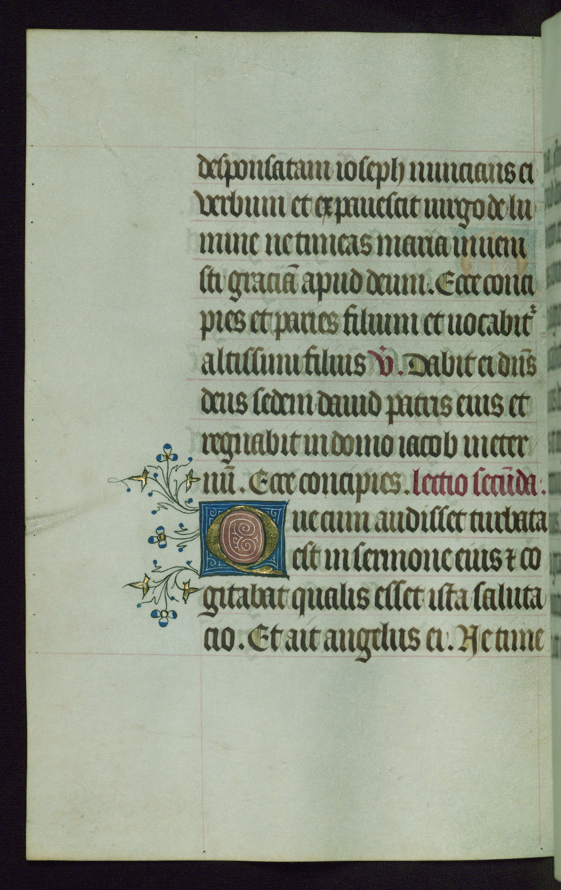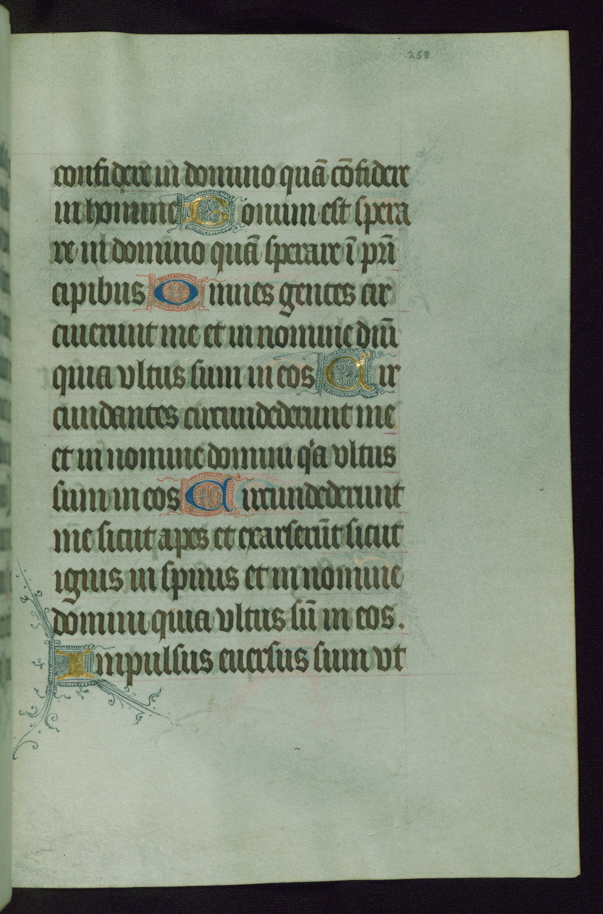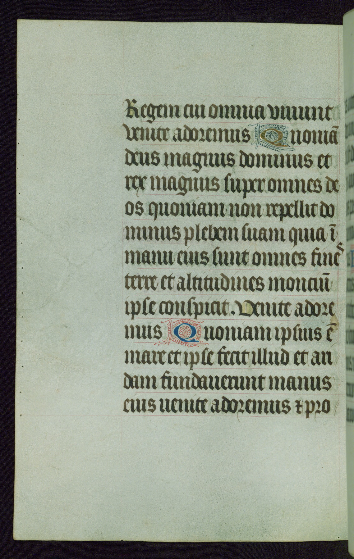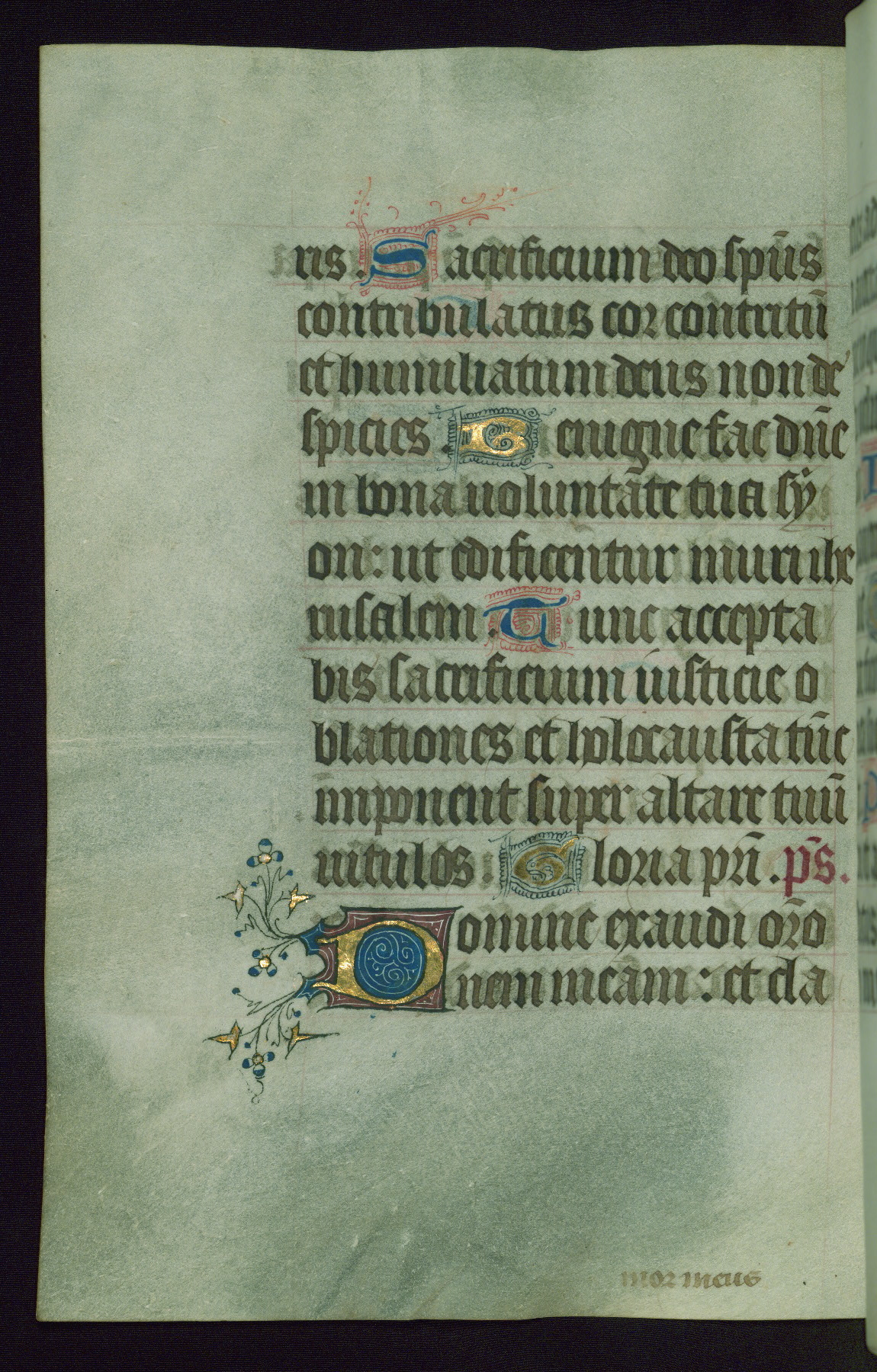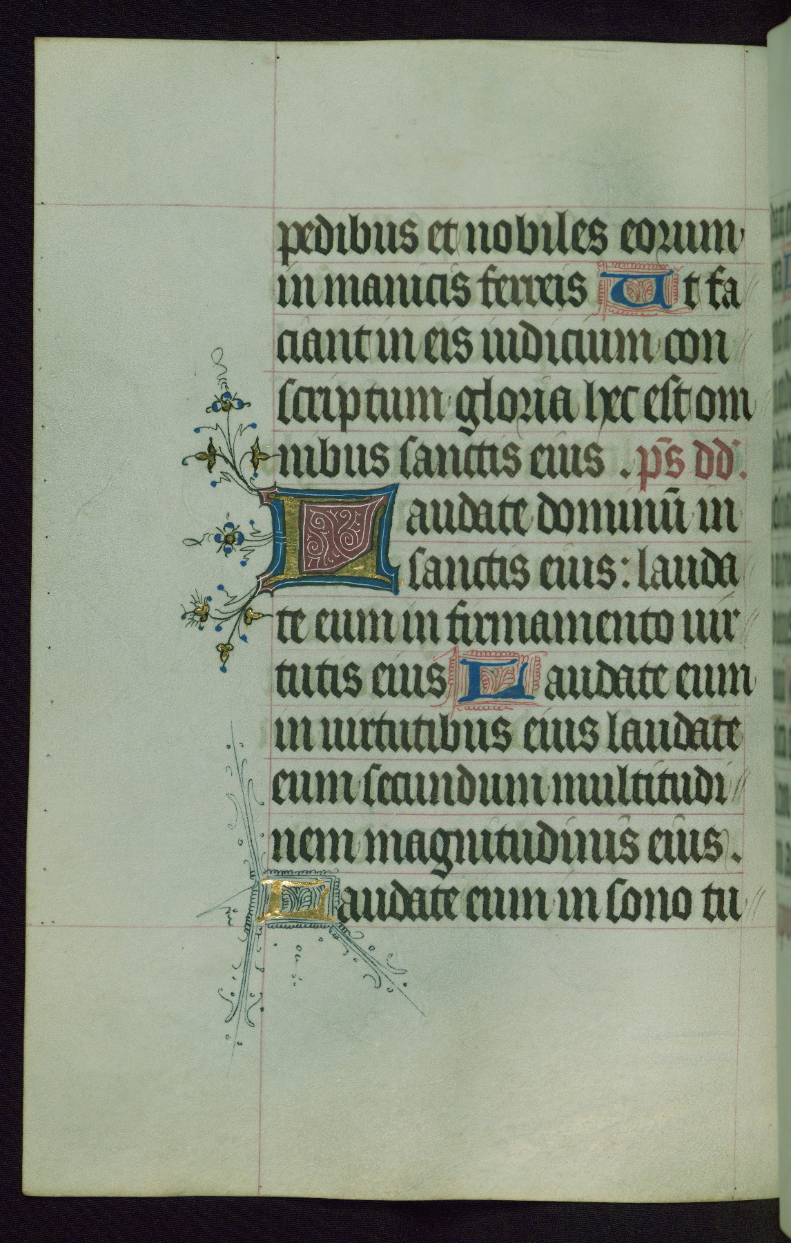 This Book of Hours, ca. 1460, was completed for use of Rome and illuminated under the influence, if not the direct participation, of Willem Vrelant. There remain twenty-two extant marginal calendar illustrations, thirteen extant full-page miniatures (many of which are paired with opening suffrages, perhaps suggesting a certain amount of significance to the owner), and one historiated initial. The contemporary binding, signed Livinus Stuaert, is dated 1477 and is most likely of Bruges or Ghent origin. It is thought that the first owner was French due to the French headings throughout and prominent fleur-de-lis figurations decorating the binding. Further, the first owner was likely female, suggested by the ways in which the book was structured to facilitate legibility. This is evinced by the large size of the script and the lack of abbreviations. While much of the text is standard, there remains evidence of personal significance and preference. This is seen in the chosen illuminations for those sections that are most significant to the owner. Most illuminations are paired with the opening page of staple Hours; however, many are accompanied by individual suffrages, constituting a large portion of the beginning of the manuscript. Personal preference is also shown in those sections of text that stray from the standard. The devotional sequence of this manuscript is notable for its sheer length and diversity of prayers as well as its inclusion of a French prayer not of official liturgy (fols. 215r-219v). The first collection of three prayers is headed and written in French. The prayer is attributed to St. Augustine and is described to guarantee a transformation of tribulation into joy through Christ's mercy, but only if the suppliant recites the prayer for thirty consecutive days. While it is not uncommon for evidence of an owner's predilections to surface in a Book of Hours, the particularly divergent features of this book allow readers to glean an intimate view of the patron.