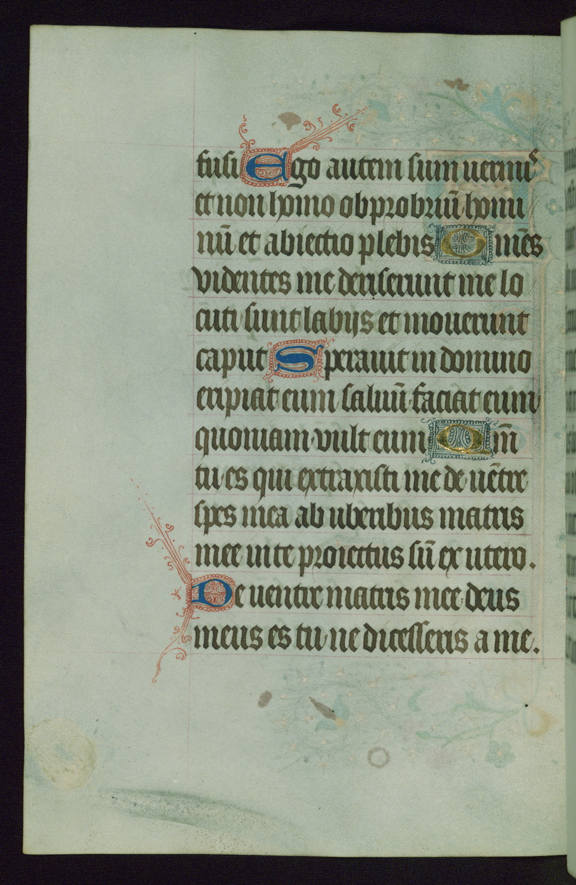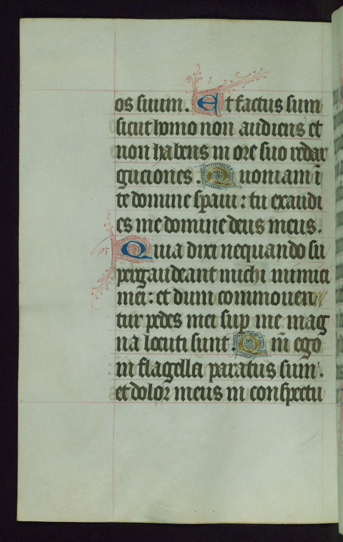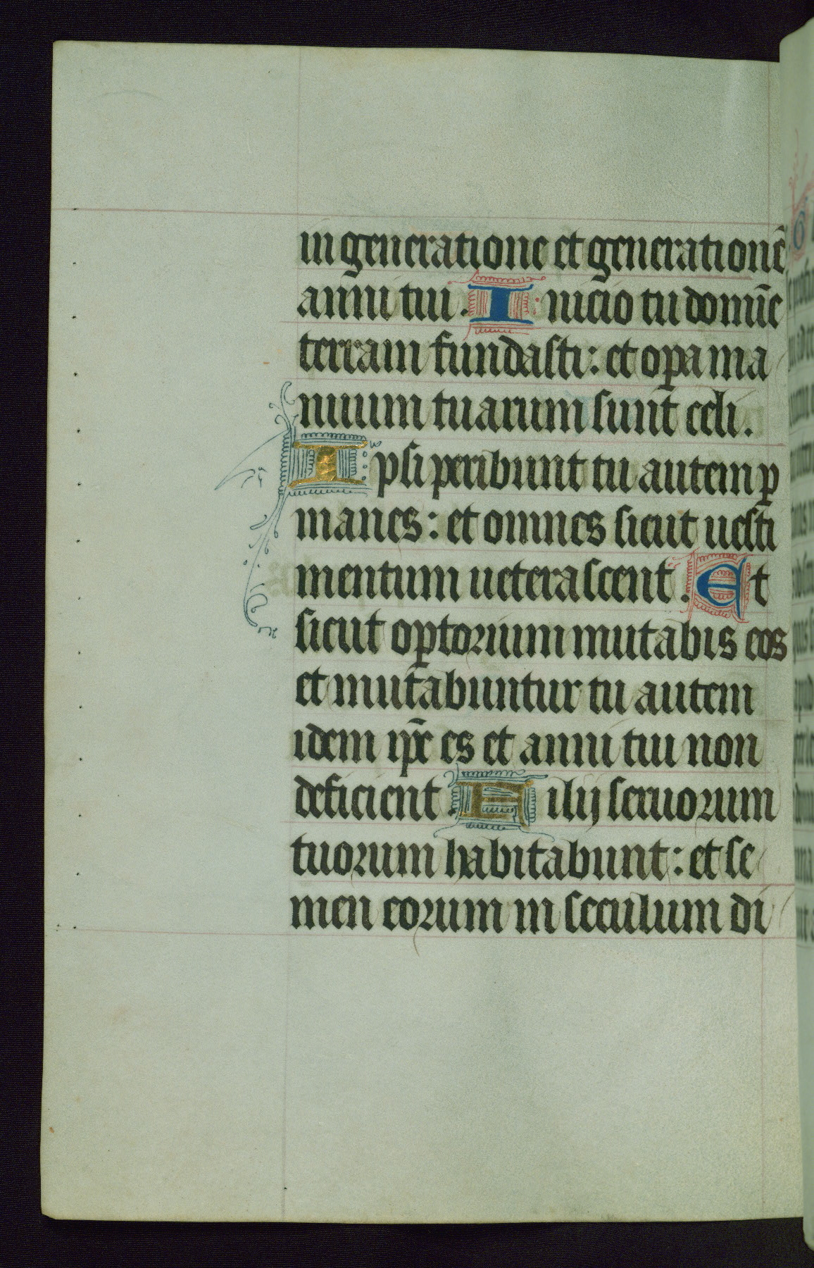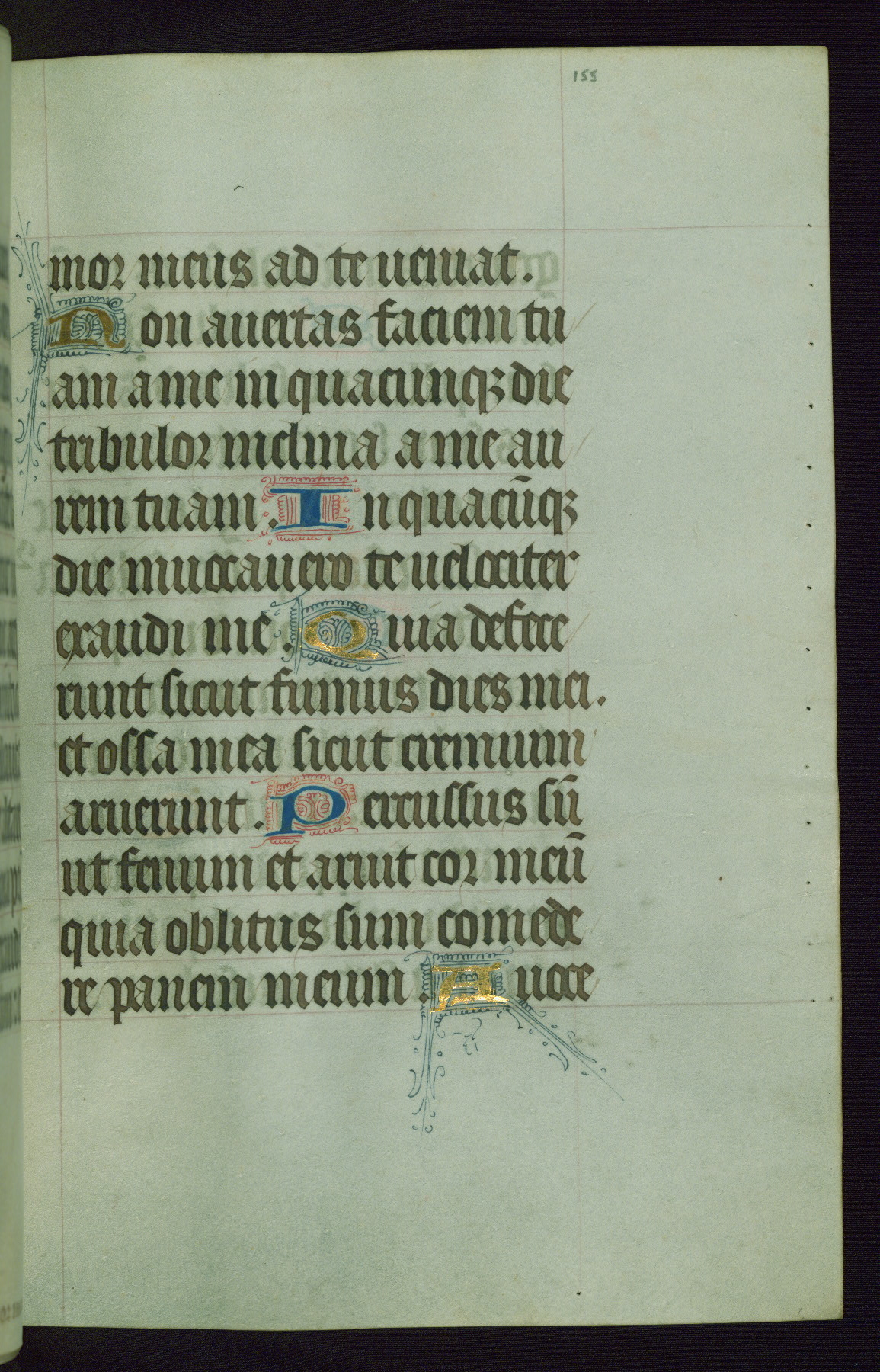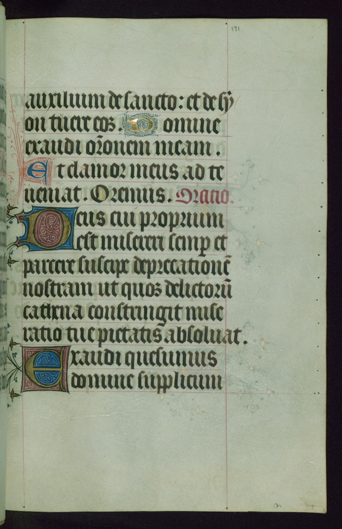 This Book of Hours, ca. 1460, was completed for use of Rome and illuminated under the influence, if not the direct participation, of Willem Vrelant. There remain twenty-two extant marginal calendar illustrations, thirteen extant full-page miniatures (many of which are paired with opening suffrages, perhaps suggesting a certain amount of significance to the owner), and one historiated initial. The contemporary binding, signed Livinus Stuaert, is dated 1477 and is most likely of Bruges or Ghent origin. It is thought that the first owner was French due to the French headings throughout and prominent fleur-de-lis figurations decorating the binding. Further, the first owner was likely female, suggested by the ways in which the book was structured to facilitate legibility. This is evinced by the large size of the script and the lack of abbreviations. While much of the text is standard, there remains evidence of personal significance and preference. This is seen in the chosen illuminations for those sections that are most significant to the owner. Most illuminations are paired with the opening page of staple Hours; however, many are accompanied by individual suffrages, constituting a large portion of the beginning of the manuscript. Personal preference is also shown in those sections of text that stray from the standard. The devotional sequence of this manuscript is notable for its sheer length and diversity of prayers as well as its inclusion of a French prayer not of official liturgy (fols. 215r-219v). The first collection of three prayers is headed and written in French. The prayer is attributed to St. Augustine and is described to guarantee a transformation of tribulation into joy through Christ's mercy, but only if the suppliant recites the prayer for thirty consecutive days. While it is not uncommon for evidence of an owner's predilections to surface in a Book of Hours, the particularly divergent features of this book allow readers to glean an intimate view of the patron.