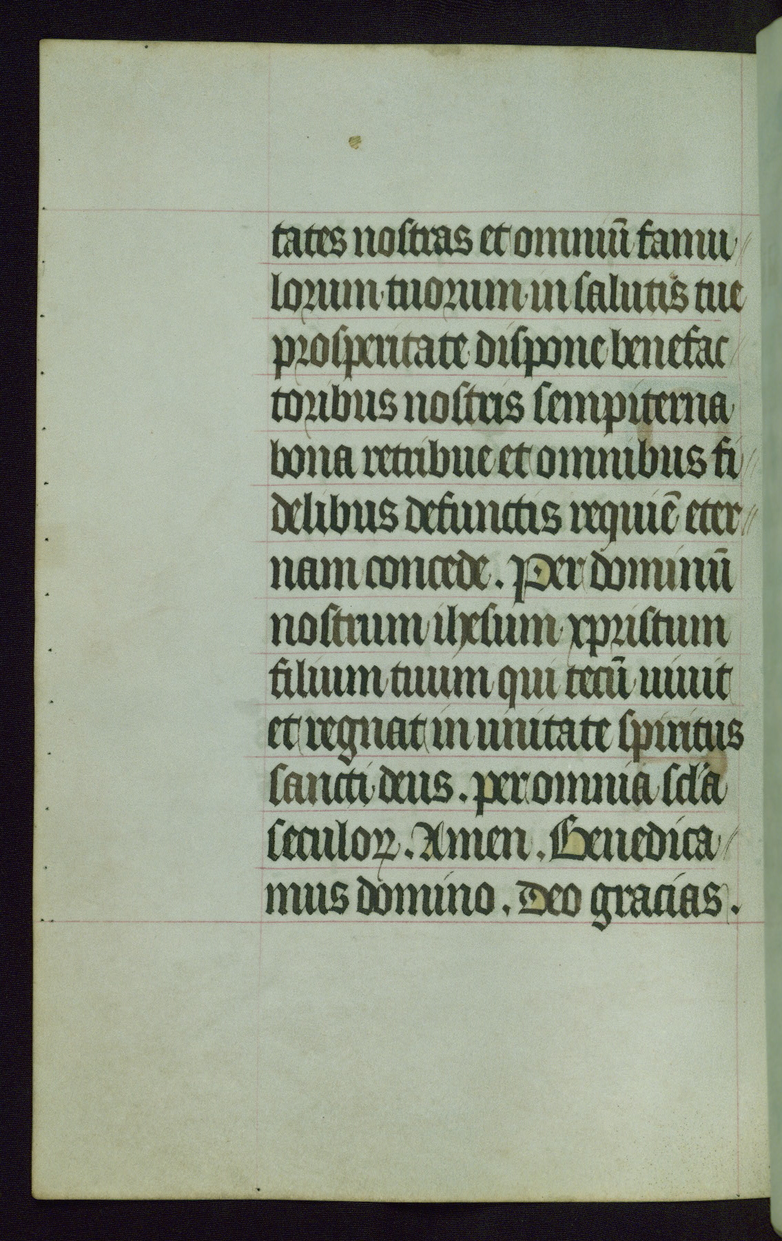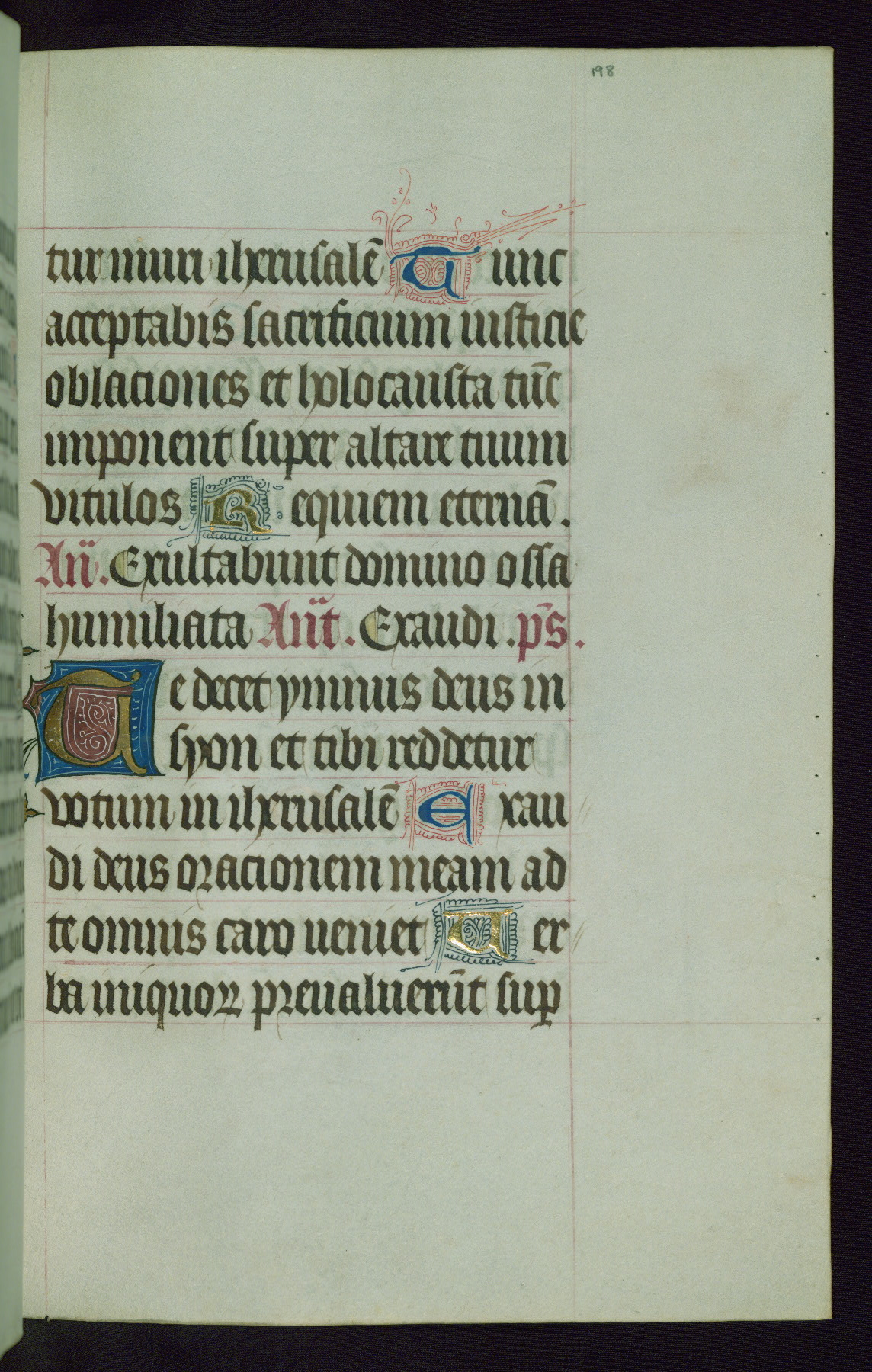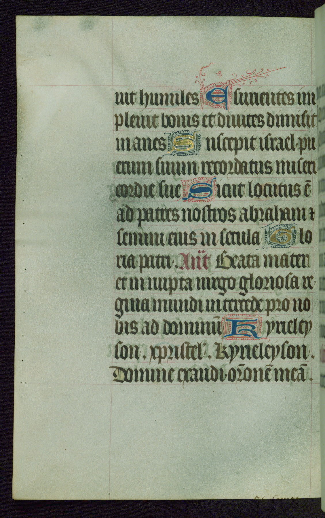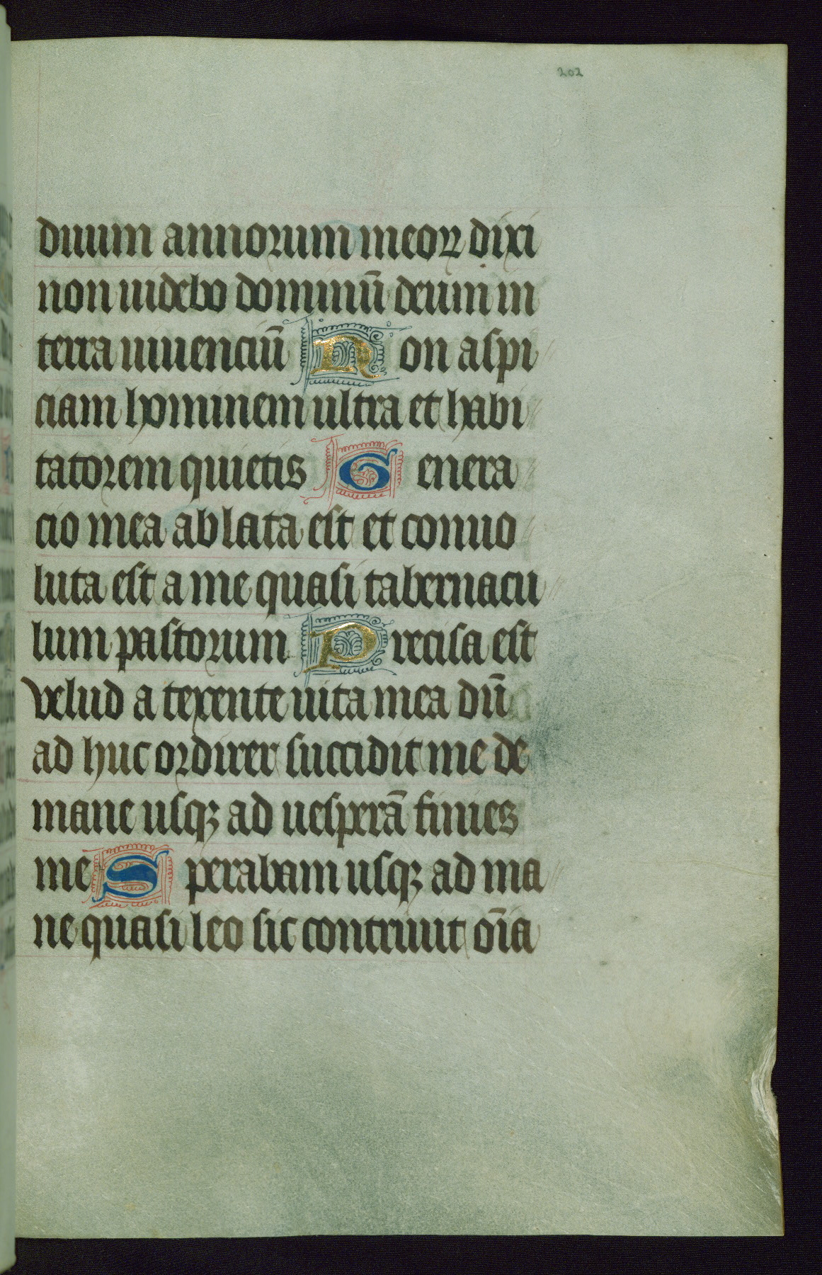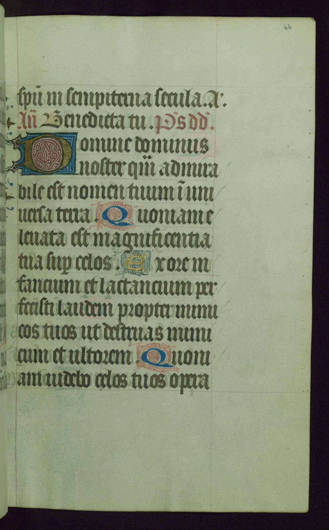 This Book of Hours, ca. 1460, was completed for use of Rome and illuminated under the influence, if not the direct participation, of Willem Vrelant. There remain twenty-two extant marginal calendar illustrations, thirteen extant full-page miniatures (many of which are paired with opening suffrages, perhaps suggesting a certain amount of significance to the owner), and one historiated initial. The contemporary binding, signed Livinus Stuaert, is dated 1477 and is most likely of Bruges or Ghent origin. It is thought that the first owner was French due to the French headings throughout and prominent fleur-de-lis figurations decorating the binding. Further, the first owner was likely female, suggested by the ways in which the book was structured to facilitate legibility. This is evinced by the large size of the script and the lack of abbreviations. While much of the text is standard, there remains evidence of personal significance and preference. This is seen in the chosen illuminations for those sections that are most significant to the owner. Most illuminations are paired with the opening page of staple Hours; however, many are accompanied by individual suffrages, constituting a large portion of the beginning of the manuscript. Personal preference is also shown in those sections of text that stray from the standard. The devotional sequence of this manuscript is notable for its sheer length and diversity of prayers as well as its inclusion of a French prayer not of official liturgy (fols. 215r-219v). The first collection of three prayers is headed and written in French. The prayer is attributed to St. Augustine and is described to guarantee a transformation of tribulation into joy through Christ's mercy, but only if the suppliant recites the prayer for thirty consecutive days. While it is not uncommon for evidence of an owner's predilections to surface in a Book of Hours, the particularly divergent features of this book allow readers to glean an intimate view of the patron.