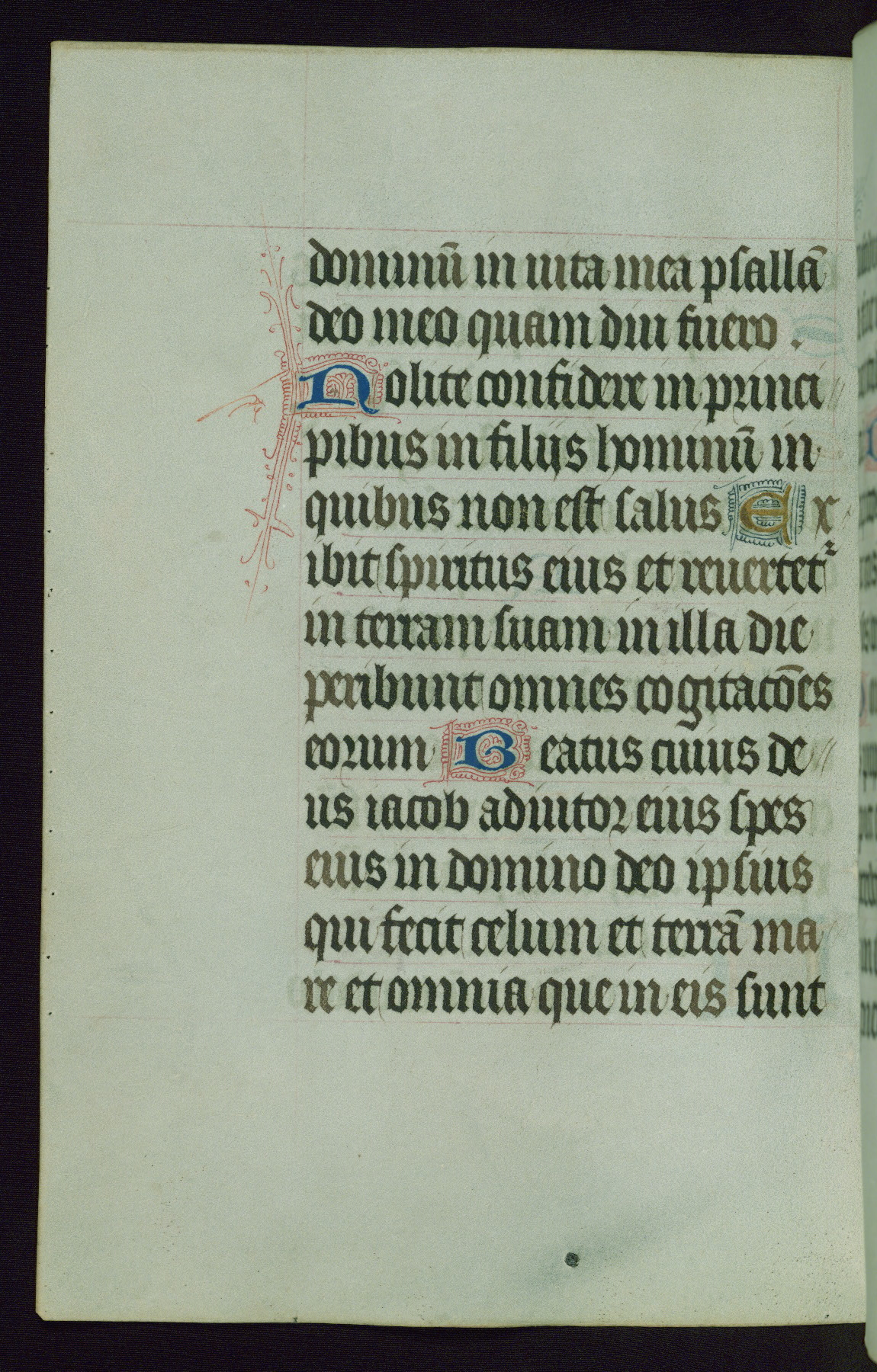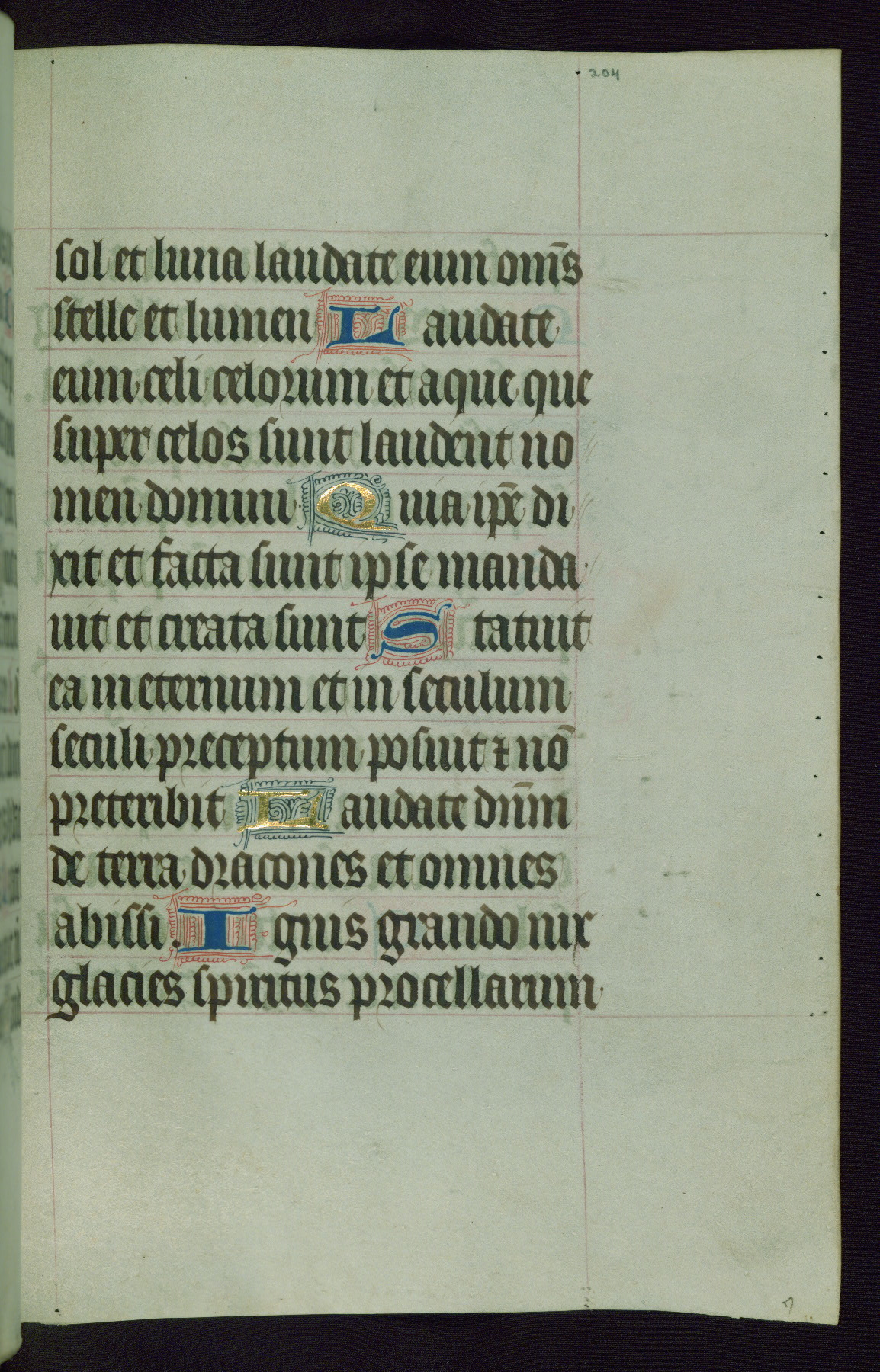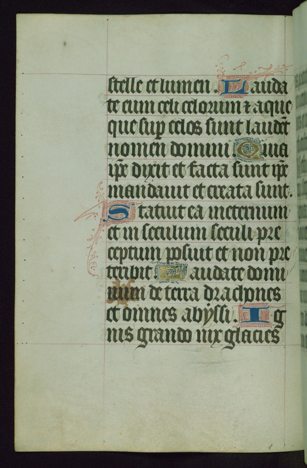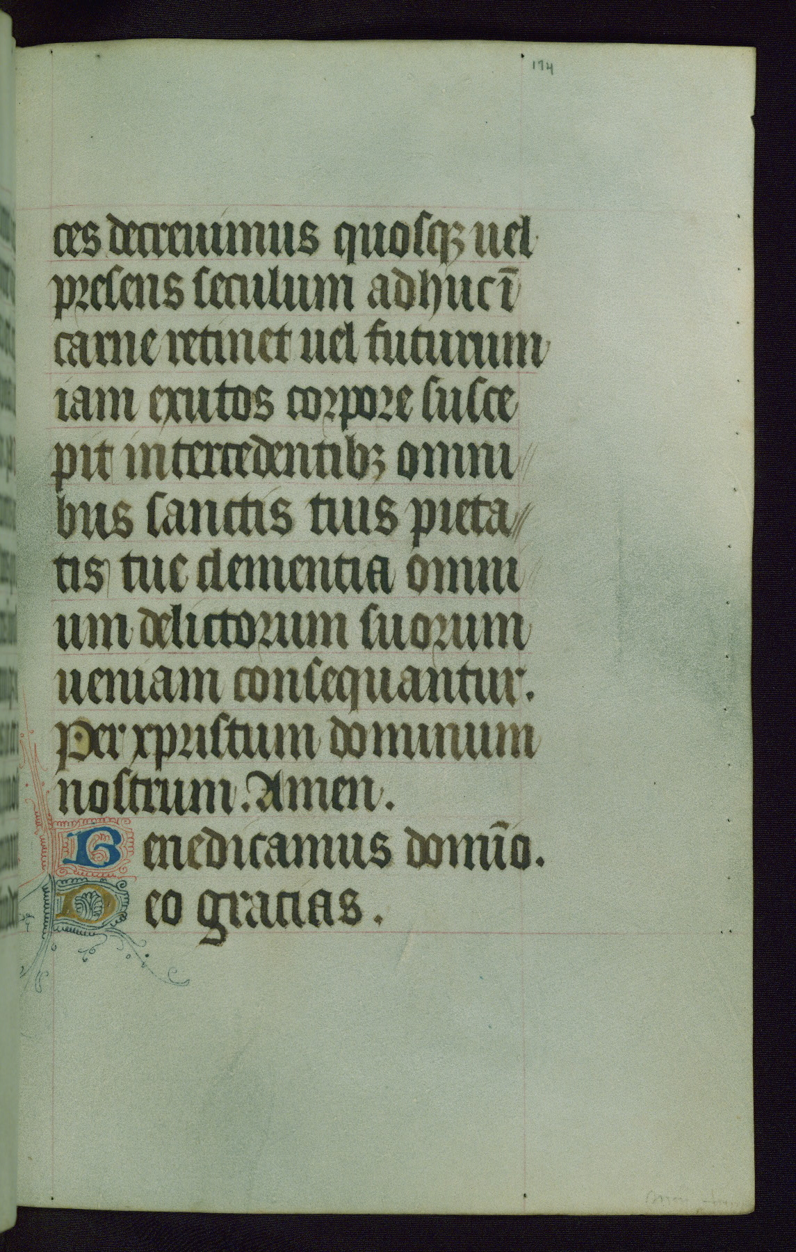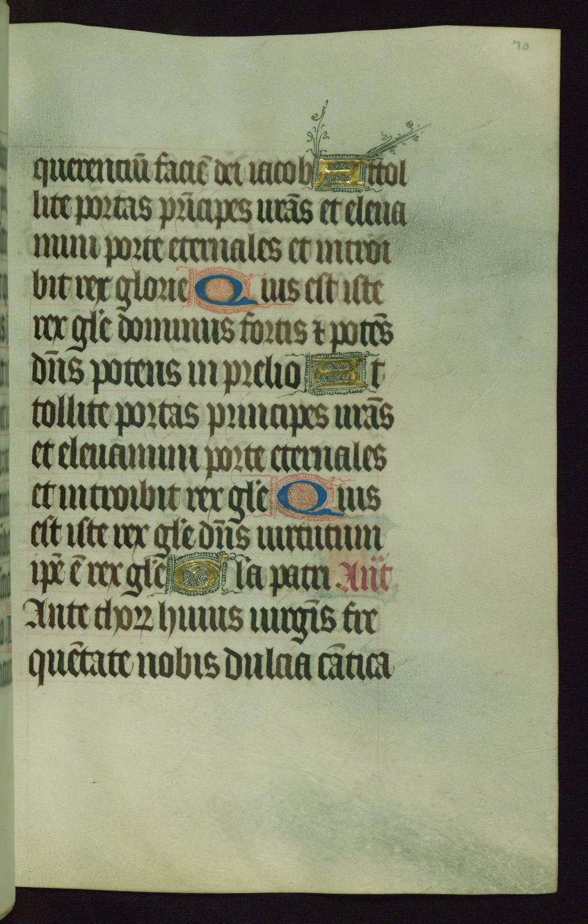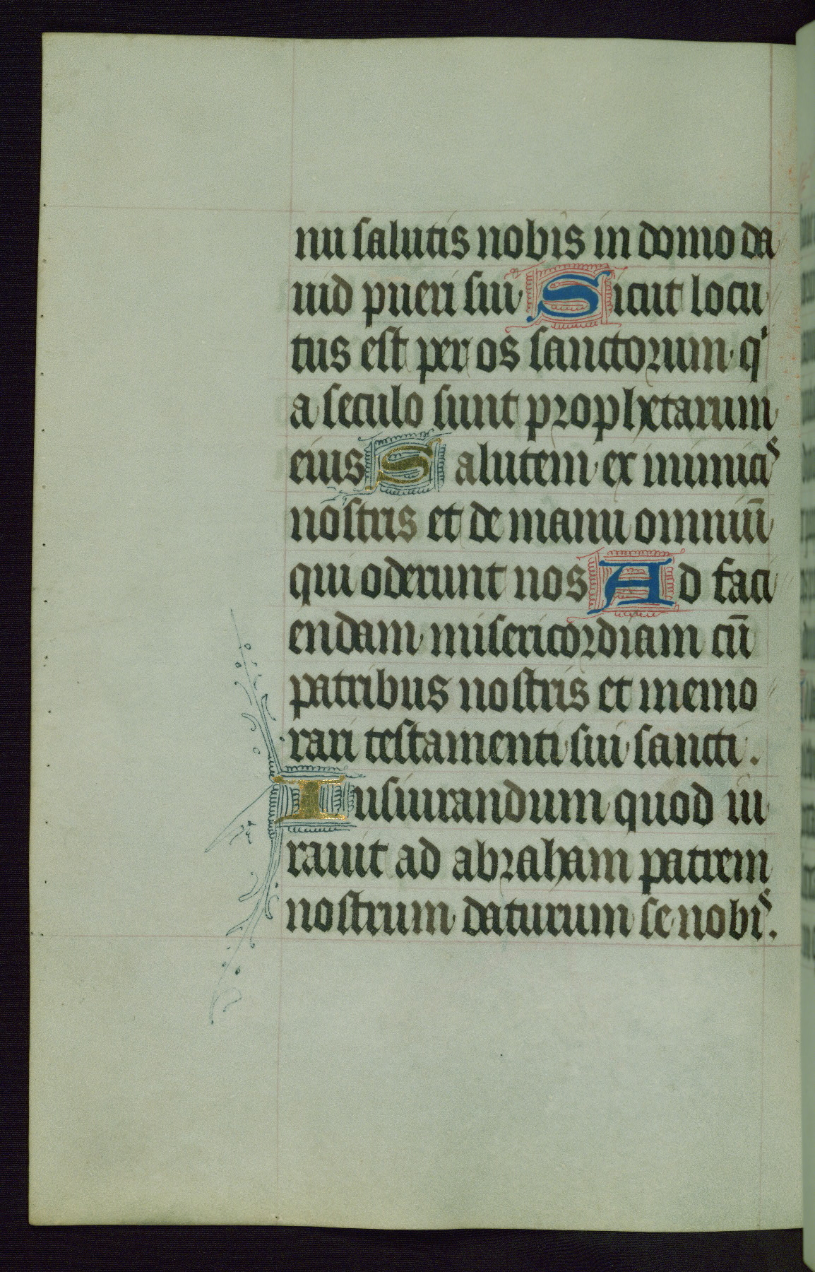 This Book of Hours, ca. 1460, was completed for use of Rome and illuminated under the influence, if not the direct participation, of Willem Vrelant. There remain twenty-two extant marginal calendar illustrations, thirteen extant full-page miniatures (many of which are paired with opening suffrages, perhaps suggesting a certain amount of significance to the owner), and one historiated initial. The contemporary binding, signed Livinus Stuaert, is dated 1477 and is most likely of Bruges or Ghent origin. It is thought that the first owner was French due to the French headings throughout and prominent fleur-de-lis figurations decorating the binding. Further, the first owner was likely female, suggested by the ways in which the book was structured to facilitate legibility. This is evinced by the large size of the script and the lack of abbreviations. While much of the text is standard, there remains evidence of personal significance and preference. This is seen in the chosen illuminations for those sections that are most significant to the owner. Most illuminations are paired with the opening page of staple Hours; however, many are accompanied by individual suffrages, constituting a large portion of the beginning of the manuscript. Personal preference is also shown in those sections of text that stray from the standard. The devotional sequence of this manuscript is notable for its sheer length and diversity of prayers as well as its inclusion of a French prayer not of official liturgy (fols. 215r-219v). The first collection of three prayers is headed and written in French. The prayer is attributed to St. Augustine and is described to guarantee a transformation of tribulation into joy through Christ's mercy, but only if the suppliant recites the prayer for thirty consecutive days. While it is not uncommon for evidence of an owner's predilections to surface in a Book of Hours, the particularly divergent features of this book allow readers to glean an intimate view of the patron.