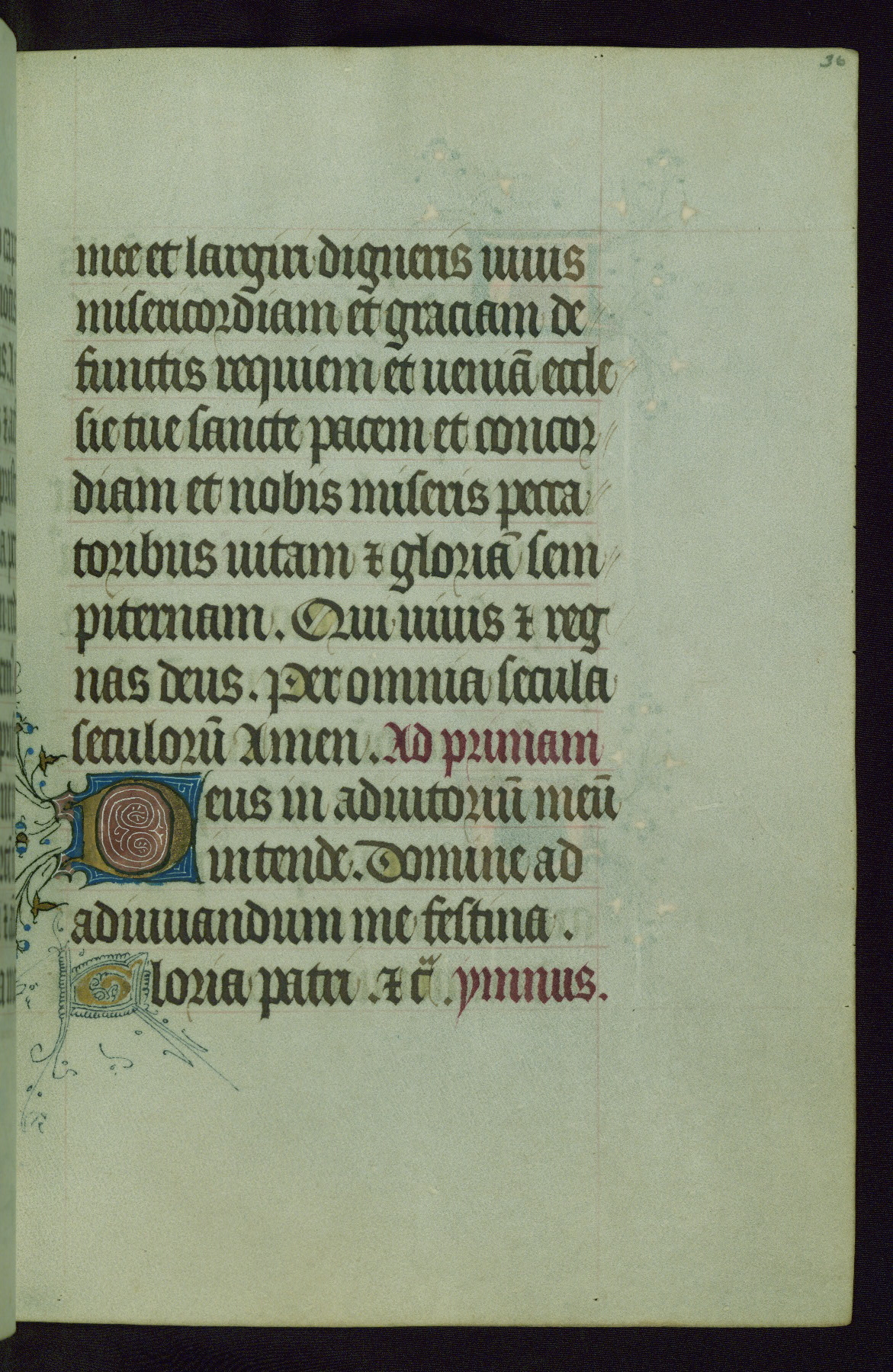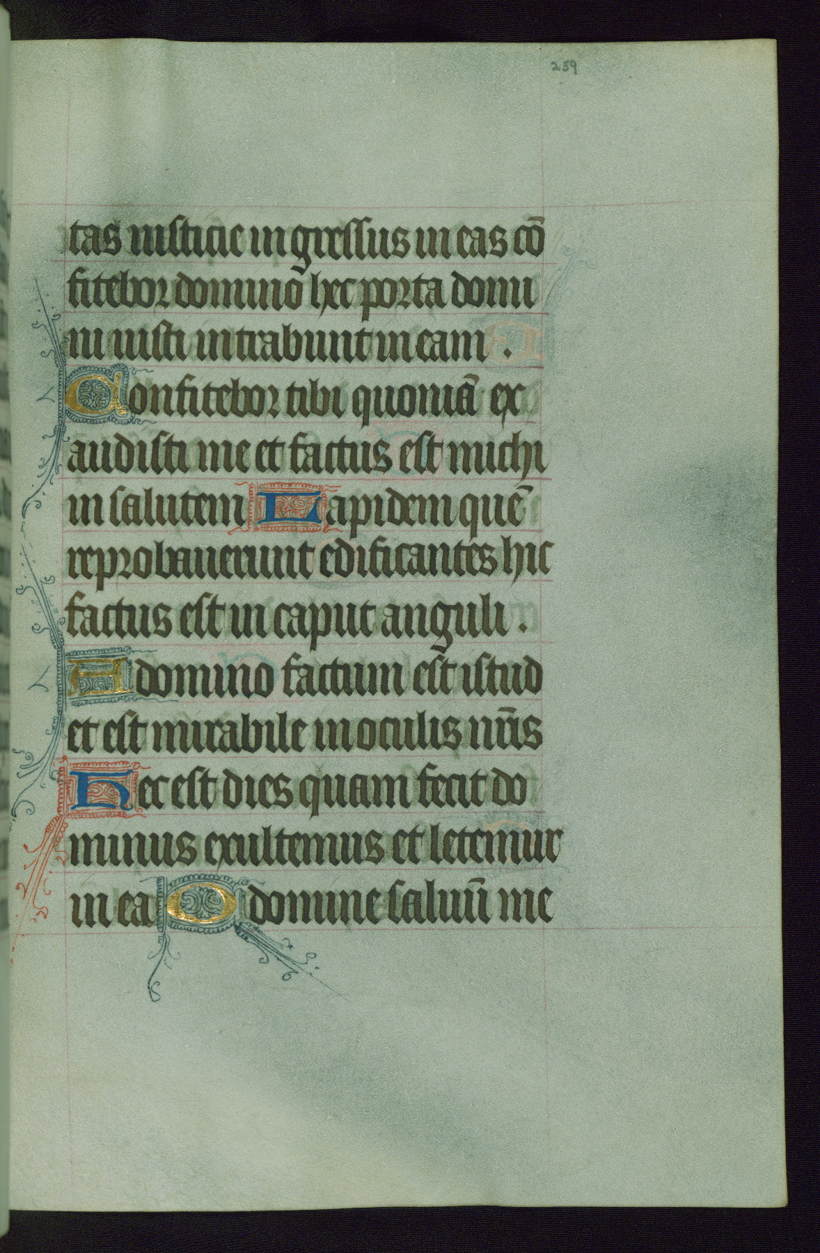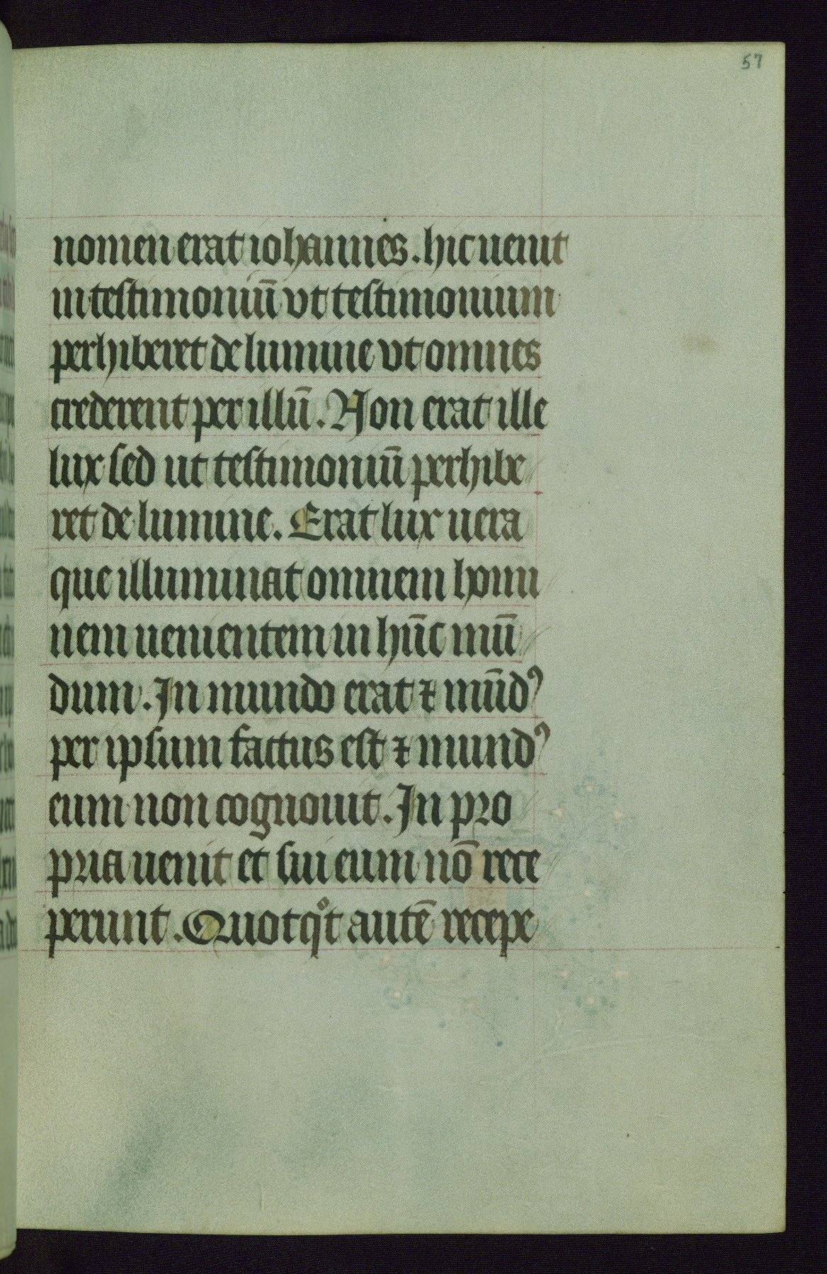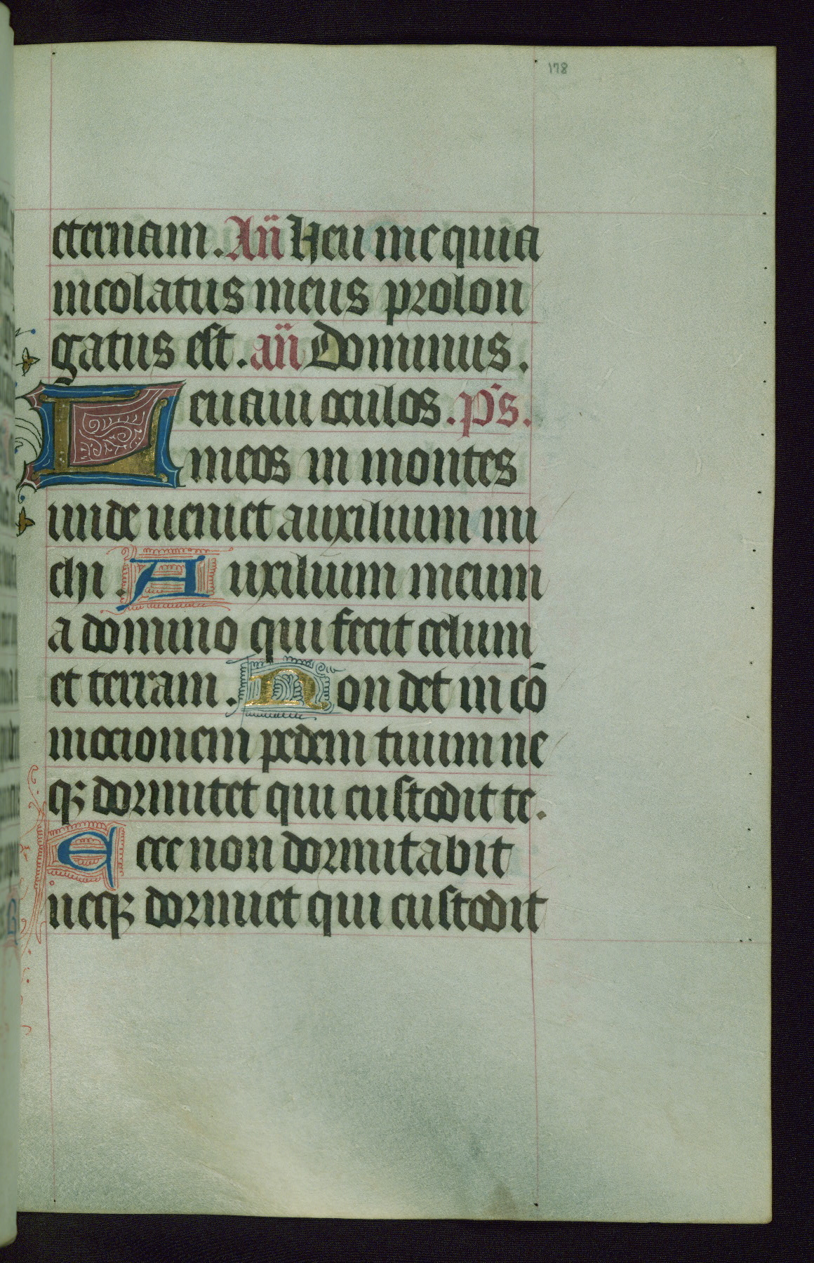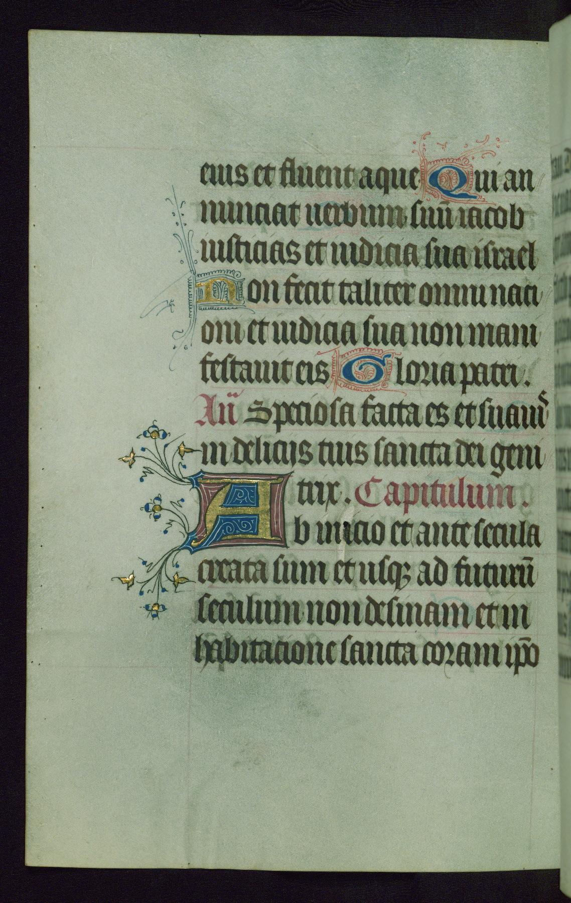 This Book of Hours, ca. 1460, was completed for use of Rome and illuminated under the influence, if not the direct participation, of Willem Vrelant. There remain twenty-two extant marginal calendar illustrations, thirteen extant full-page miniatures (many of which are paired with opening suffrages, perhaps suggesting a certain amount of significance to the owner), and one historiated initial. The contemporary binding, signed Livinus Stuaert, is dated 1477 and is most likely of Bruges or Ghent origin. It is thought that the first owner was French due to the French headings throughout and prominent fleur-de-lis figurations decorating the binding. Further, the first owner was likely female, suggested by the ways in which the book was structured to facilitate legibility. This is evinced by the large size of the script and the lack of abbreviations. While much of the text is standard, there remains evidence of personal significance and preference. This is seen in the chosen illuminations for those sections that are most significant to the owner. Most illuminations are paired with the opening page of staple Hours; however, many are accompanied by individual suffrages, constituting a large portion of the beginning of the manuscript. Personal preference is also shown in those sections of text that stray from the standard. The devotional sequence of this manuscript is notable for its sheer length and diversity of prayers as well as its inclusion of a French prayer not of official liturgy (fols. 215r-219v). The first collection of three prayers is headed and written in French. The prayer is attributed to St. Augustine and is described to guarantee a transformation of tribulation into joy through Christ's mercy, but only if the suppliant recites the prayer for thirty consecutive days. While it is not uncommon for evidence of an owner's predilections to surface in a Book of Hours, the particularly divergent features of this book allow readers to glean an intimate view of the patron.