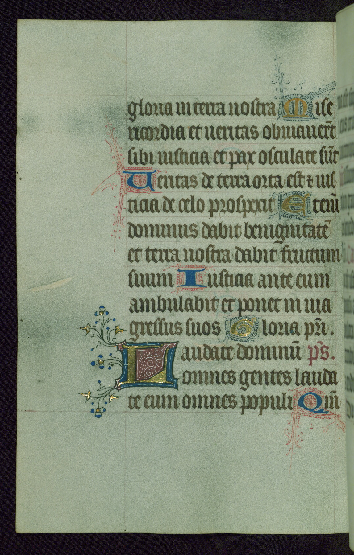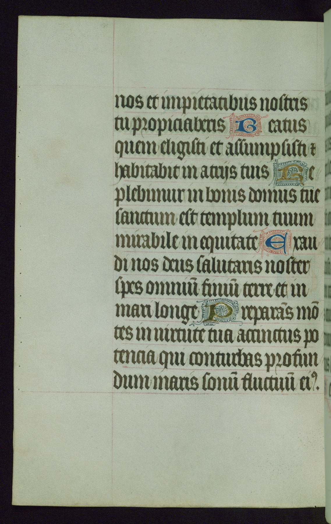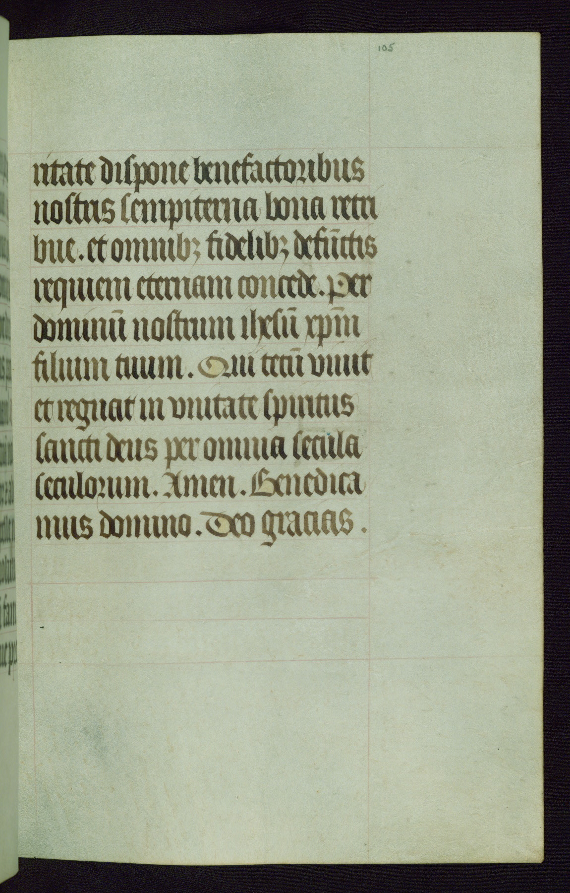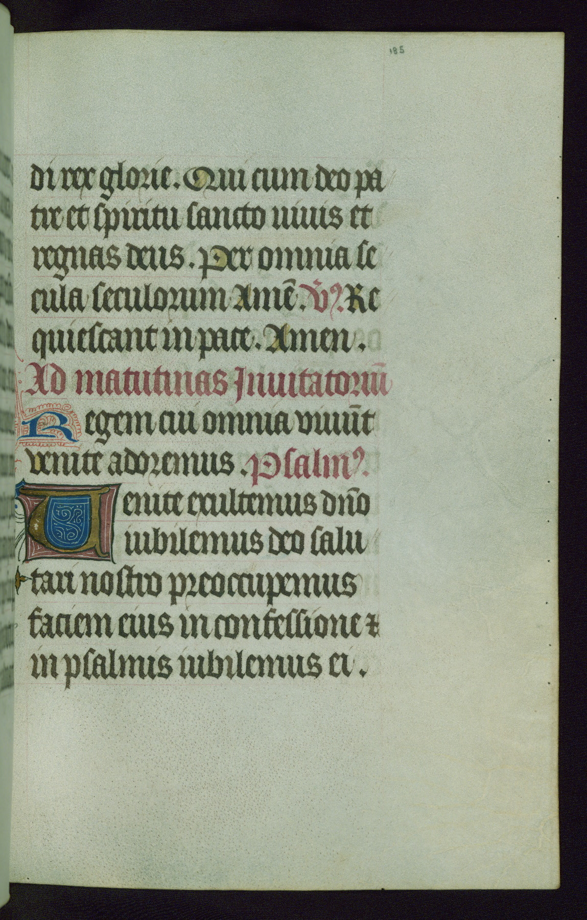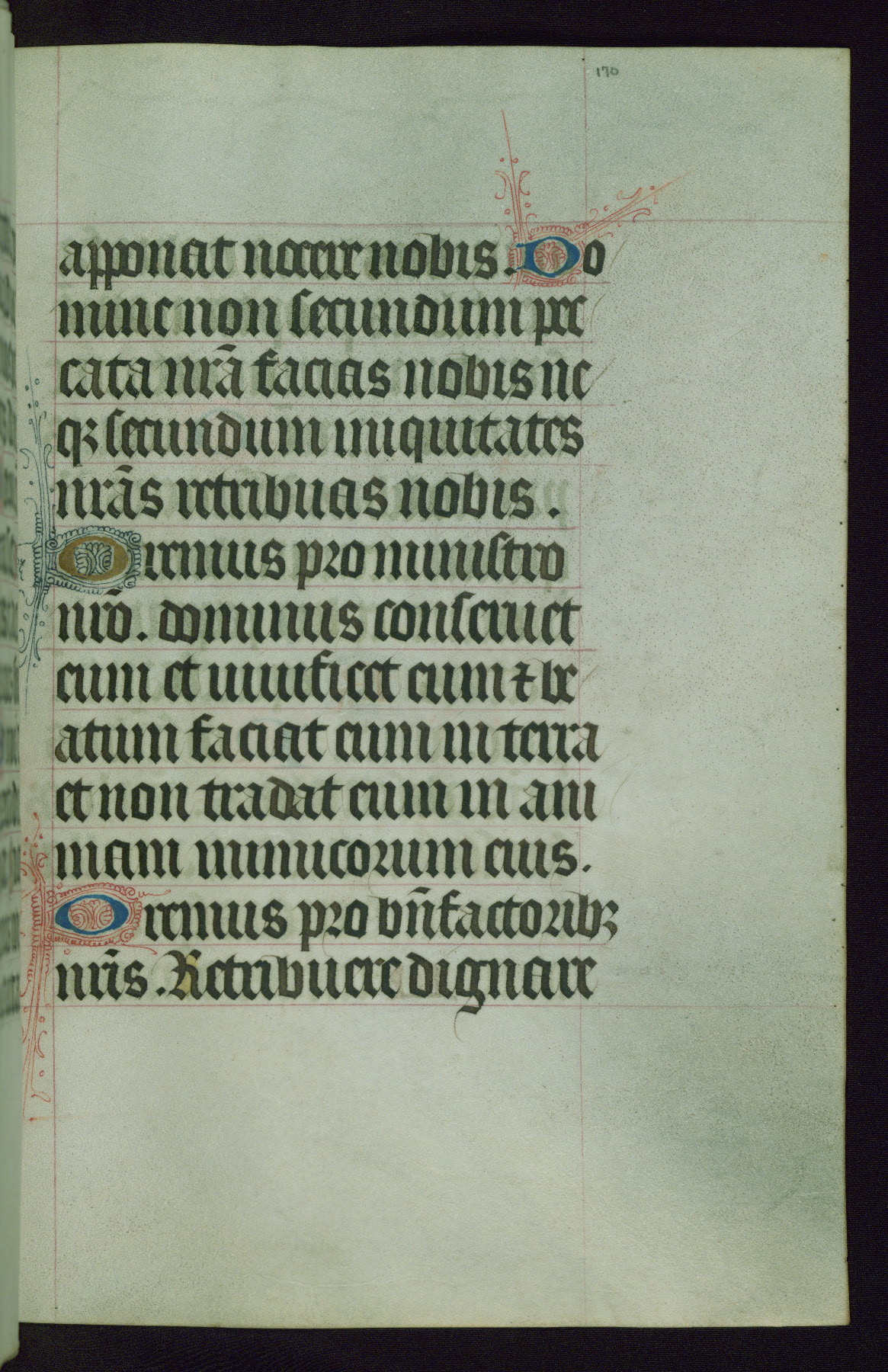 This Book of Hours, ca. 1460, was completed for use of Rome and illuminated under the influence, if not the direct participation, of Willem Vrelant. There remain twenty-two extant marginal calendar illustrations, thirteen extant full-page miniatures (many of which are paired with opening suffrages, perhaps suggesting a certain amount of significance to the owner), and one historiated initial. The contemporary binding, signed Livinus Stuaert, is dated 1477 and is most likely of Bruges or Ghent origin. It is thought that the first owner was French due to the French headings throughout and prominent fleur-de-lis figurations decorating the binding. Further, the first owner was likely female, suggested by the ways in which the book was structured to facilitate legibility. This is evinced by the large size of the script and the lack of abbreviations. While much of the text is standard, there remains evidence of personal significance and preference. This is seen in the chosen illuminations for those sections that are most significant to the owner. Most illuminations are paired with the opening page of staple Hours; however, many are accompanied by individual suffrages, constituting a large portion of the beginning of the manuscript. Personal preference is also shown in those sections of text that stray from the standard. The devotional sequence of this manuscript is notable for its sheer length and diversity of prayers as well as its inclusion of a French prayer not of official liturgy (fols. 215r-219v). The first collection of three prayers is headed and written in French. The prayer is attributed to St. Augustine and is described to guarantee a transformation of tribulation into joy through Christ's mercy, but only if the suppliant recites the prayer for thirty consecutive days. While it is not uncommon for evidence of an owner's predilections to surface in a Book of Hours, the particularly divergent features of this book allow readers to glean an intimate view of the patron.