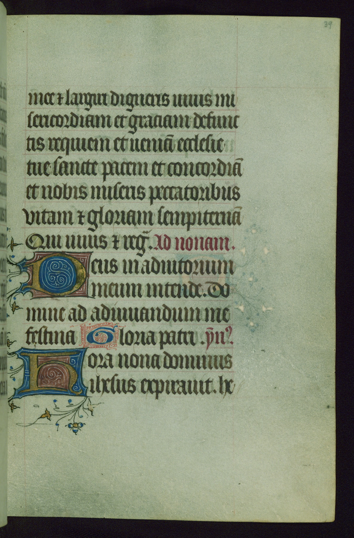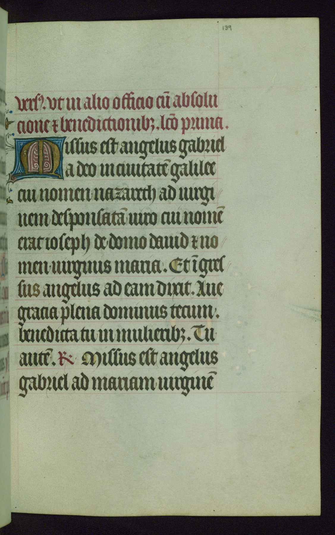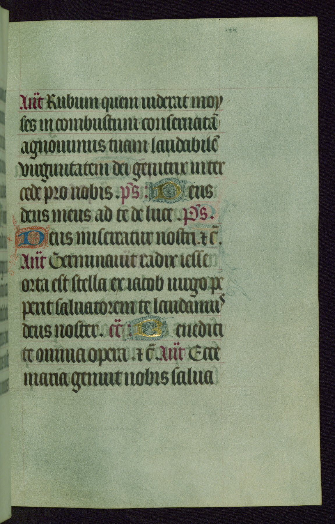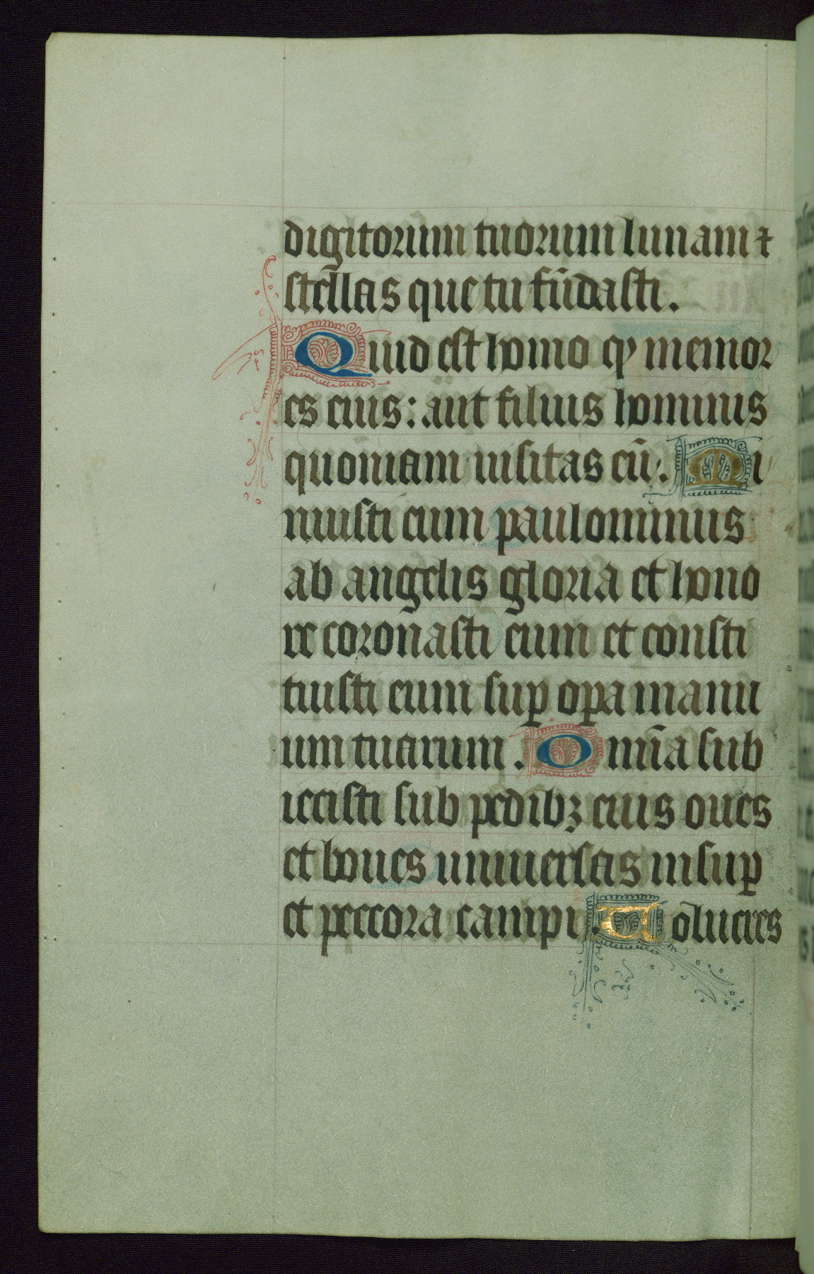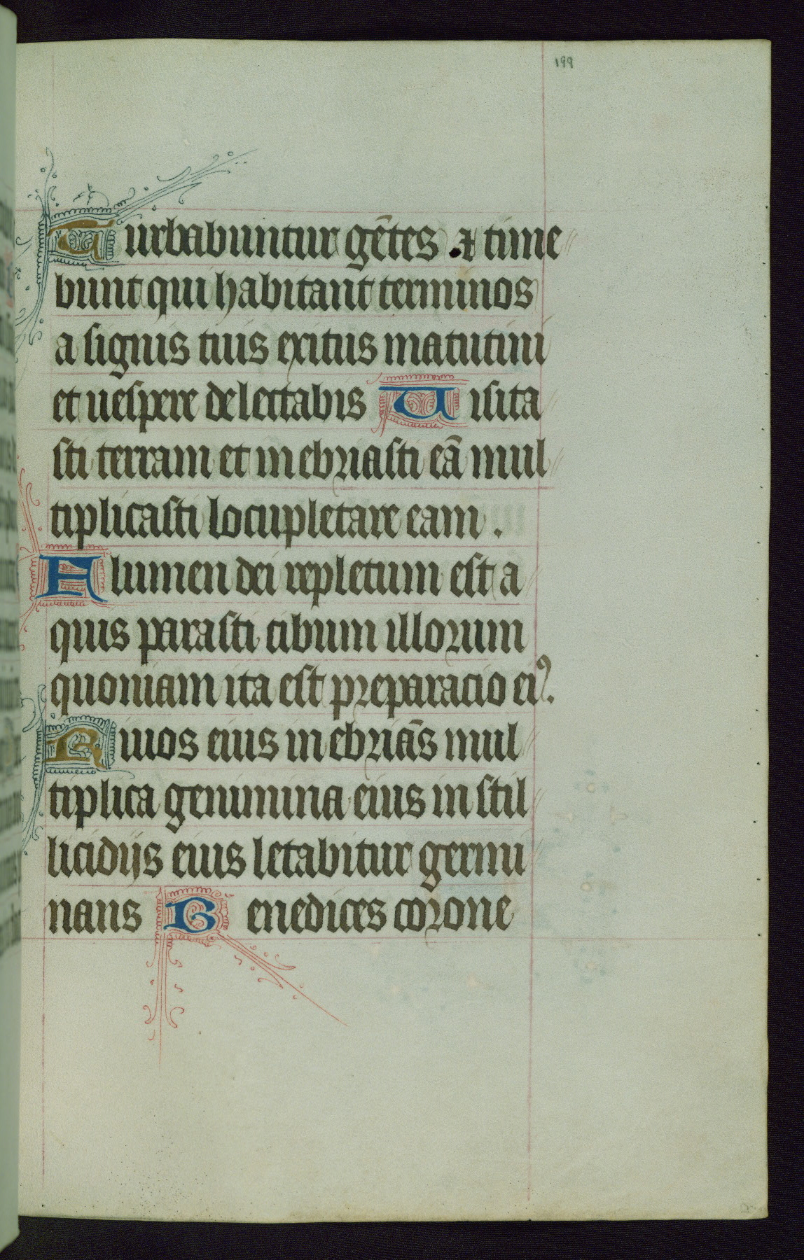 This Book of Hours, ca. 1460, was completed for use of Rome and illuminated under the influence, if not the direct participation, of Willem Vrelant. There remain twenty-two extant marginal calendar illustrations, thirteen extant full-page miniatures (many of which are paired with opening suffrages, perhaps suggesting a certain amount of significance to the owner), and one historiated initial. The contemporary binding, signed Livinus Stuaert, is dated 1477 and is most likely of Bruges or Ghent origin. It is thought that the first owner was French due to the French headings throughout and prominent fleur-de-lis figurations decorating the binding. Further, the first owner was likely female, suggested by the ways in which the book was structured to facilitate legibility. This is evinced by the large size of the script and the lack of abbreviations. While much of the text is standard, there remains evidence of personal significance and preference. This is seen in the chosen illuminations for those sections that are most significant to the owner. Most illuminations are paired with the opening page of staple Hours; however, many are accompanied by individual suffrages, constituting a large portion of the beginning of the manuscript. Personal preference is also shown in those sections of text that stray from the standard. The devotional sequence of this manuscript is notable for its sheer length and diversity of prayers as well as its inclusion of a French prayer not of official liturgy (fols. 215r-219v). The first collection of three prayers is headed and written in French. The prayer is attributed to St. Augustine and is described to guarantee a transformation of tribulation into joy through Christ's mercy, but only if the suppliant recites the prayer for thirty consecutive days. While it is not uncommon for evidence of an owner's predilections to surface in a Book of Hours, the particularly divergent features of this book allow readers to glean an intimate view of the patron.