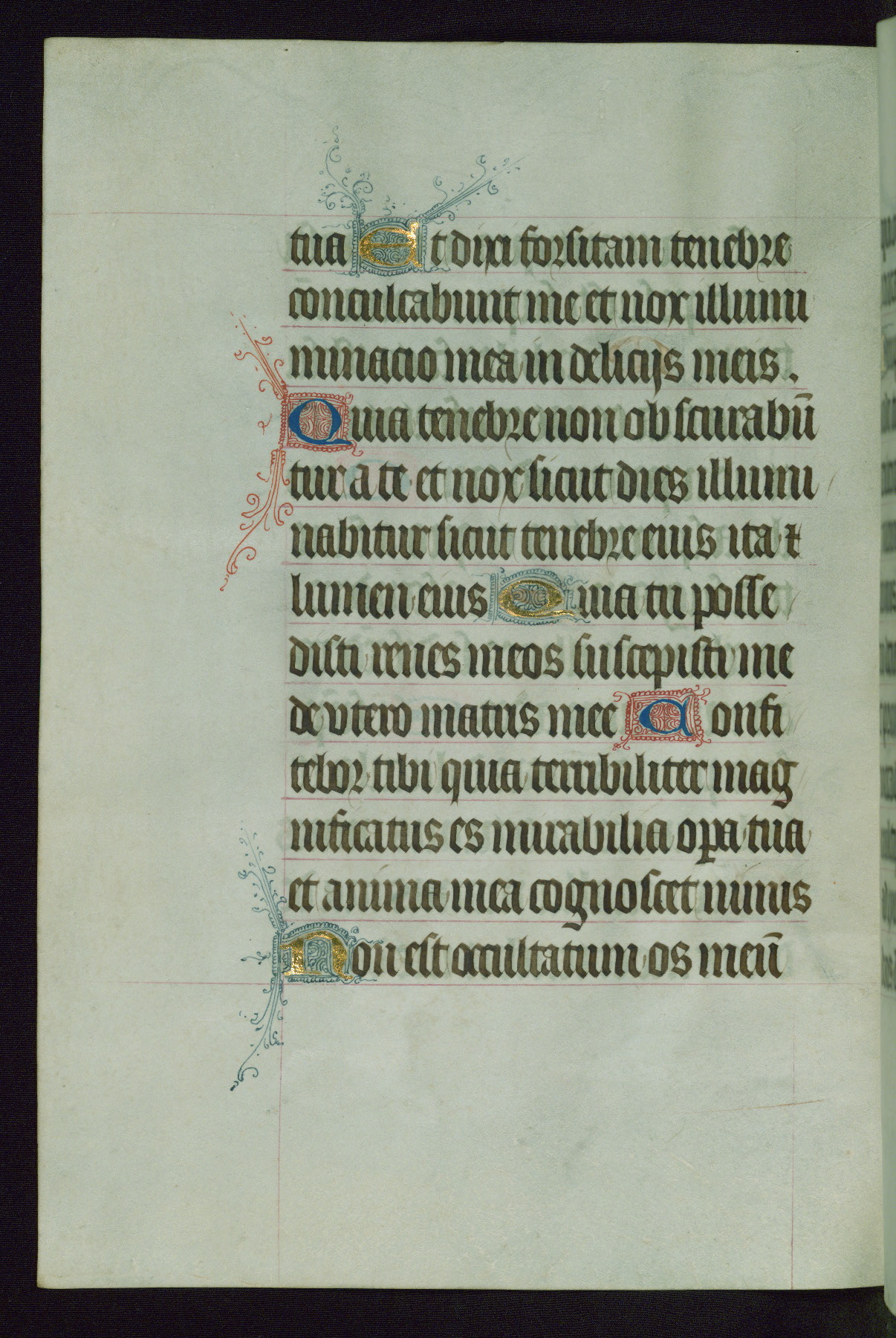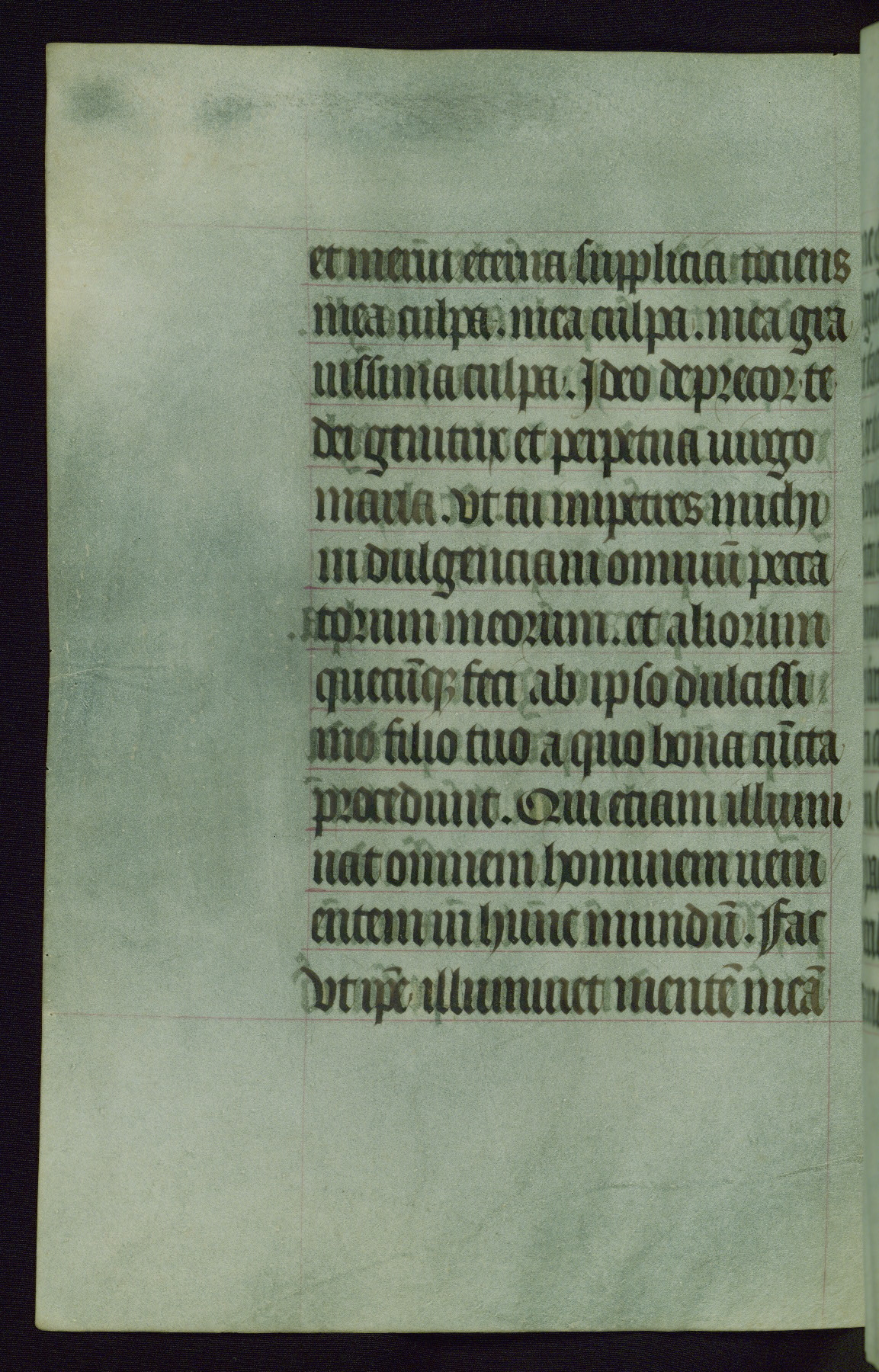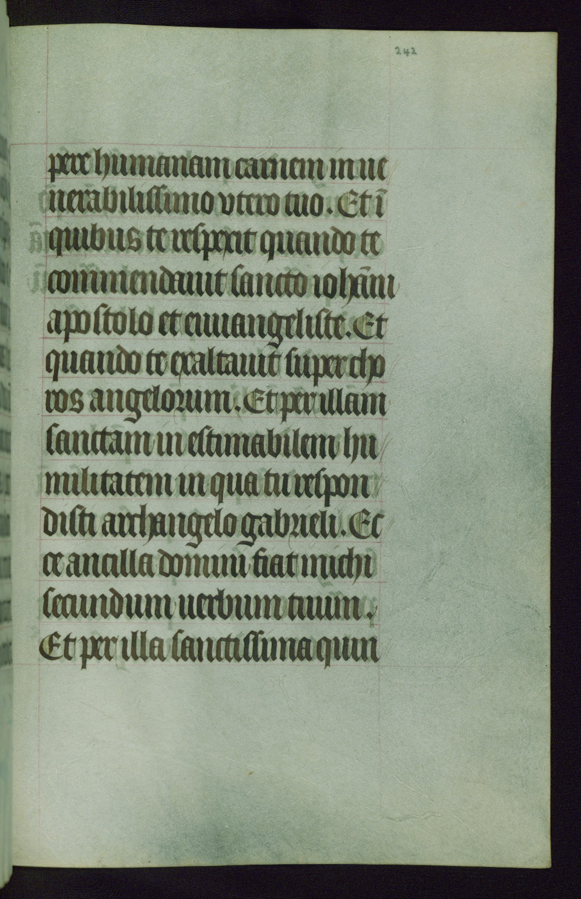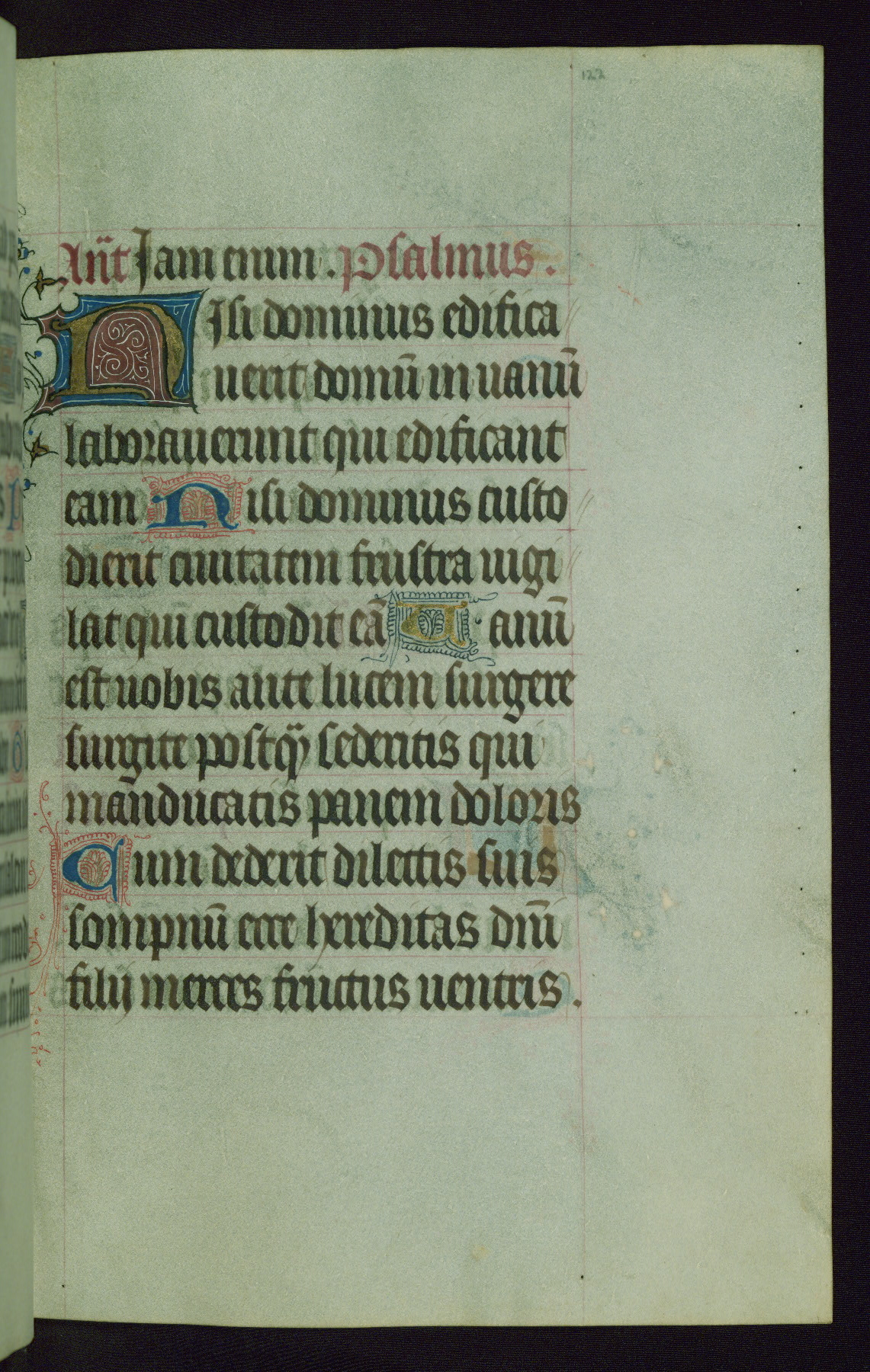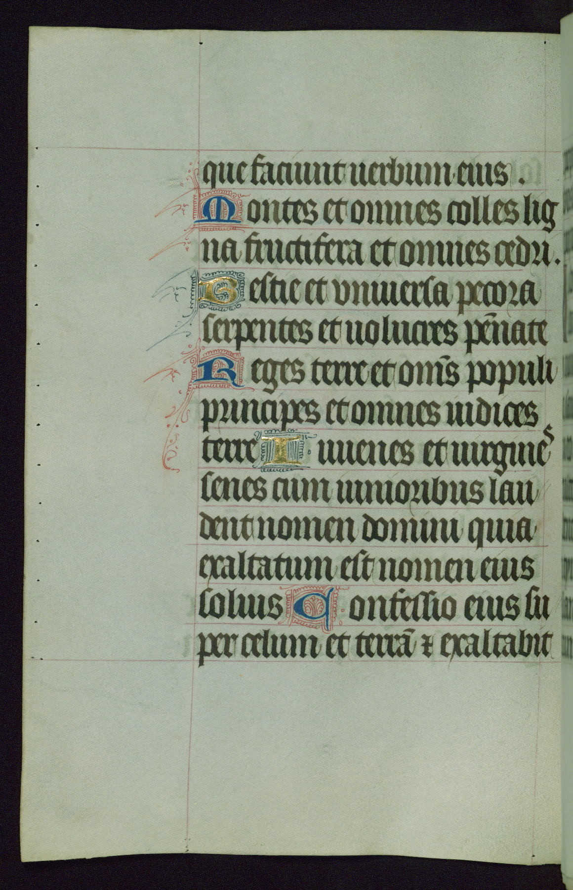 This Book of Hours, ca. 1460, was completed for use of Rome and illuminated under the influence, if not the direct participation, of Willem Vrelant. There remain twenty-two extant marginal calendar illustrations, thirteen extant full-page miniatures (many of which are paired with opening suffrages, perhaps suggesting a certain amount of significance to the owner), and one historiated initial. The contemporary binding, signed Livinus Stuaert, is dated 1477 and is most likely of Bruges or Ghent origin. It is thought that the first owner was French due to the French headings throughout and prominent fleur-de-lis figurations decorating the binding. Further, the first owner was likely female, suggested by the ways in which the book was structured to facilitate legibility. This is evinced by the large size of the script and the lack of abbreviations. While much of the text is standard, there remains evidence of personal significance and preference. This is seen in the chosen illuminations for those sections that are most significant to the owner. Most illuminations are paired with the opening page of staple Hours; however, many are accompanied by individual suffrages, constituting a large portion of the beginning of the manuscript. Personal preference is also shown in those sections of text that stray from the standard. The devotional sequence of this manuscript is notable for its sheer length and diversity of prayers as well as its inclusion of a French prayer not of official liturgy (fols. 215r-219v). The first collection of three prayers is headed and written in French. The prayer is attributed to St. Augustine and is described to guarantee a transformation of tribulation into joy through Christ's mercy, but only if the suppliant recites the prayer for thirty consecutive days. While it is not uncommon for evidence of an owner's predilections to surface in a Book of Hours, the particularly divergent features of this book allow readers to glean an intimate view of the patron.