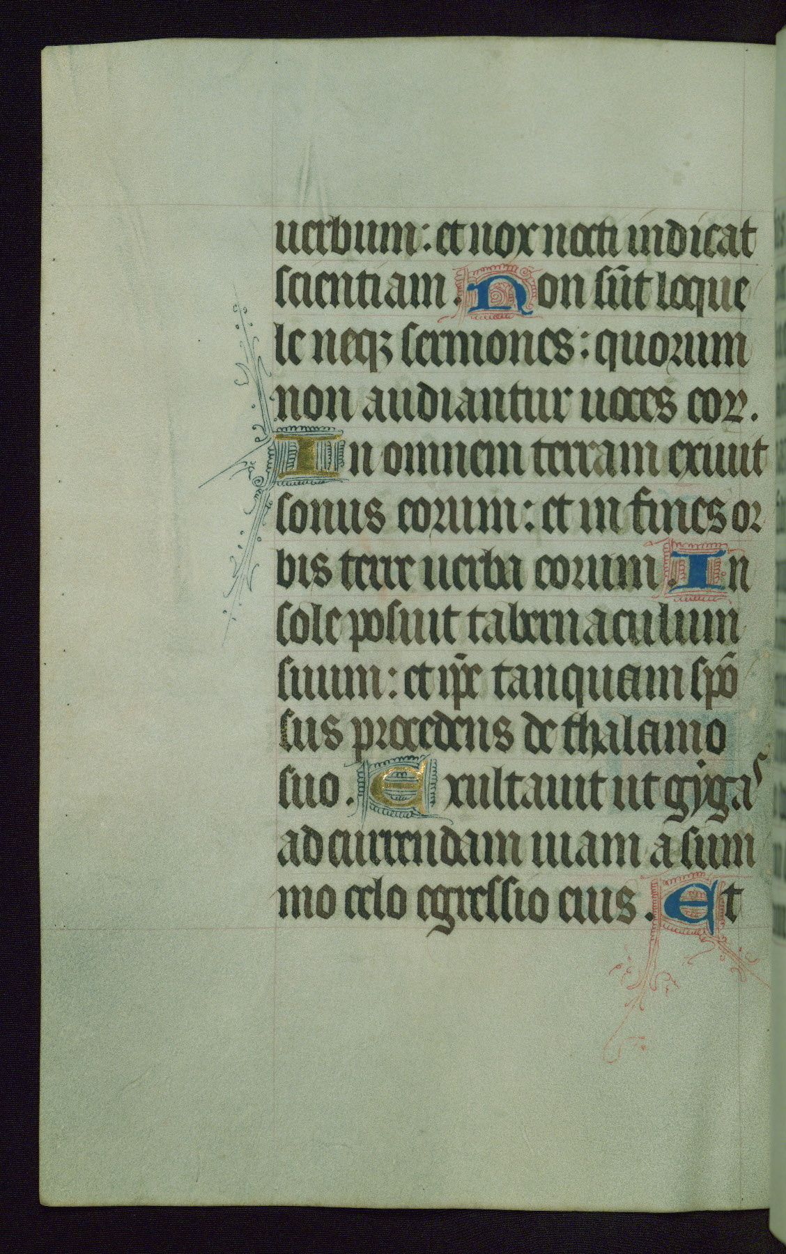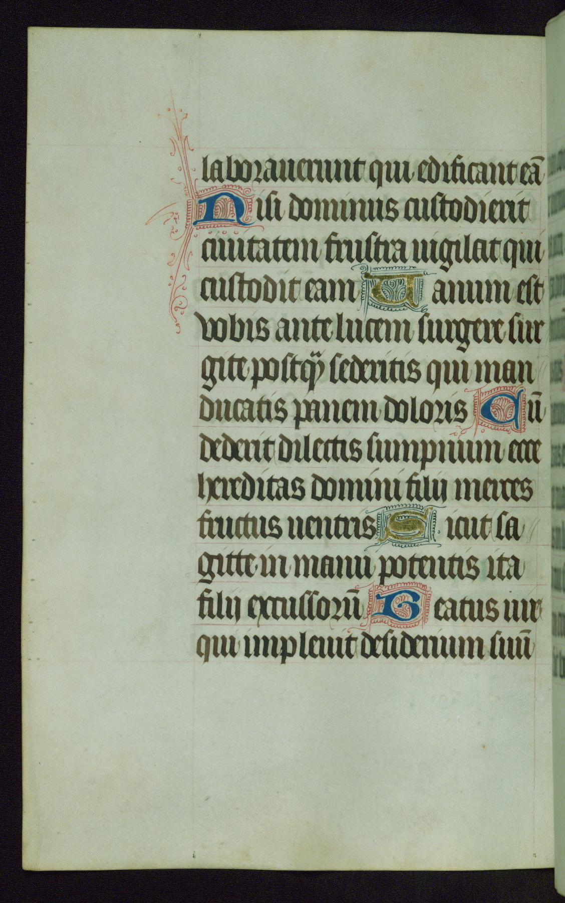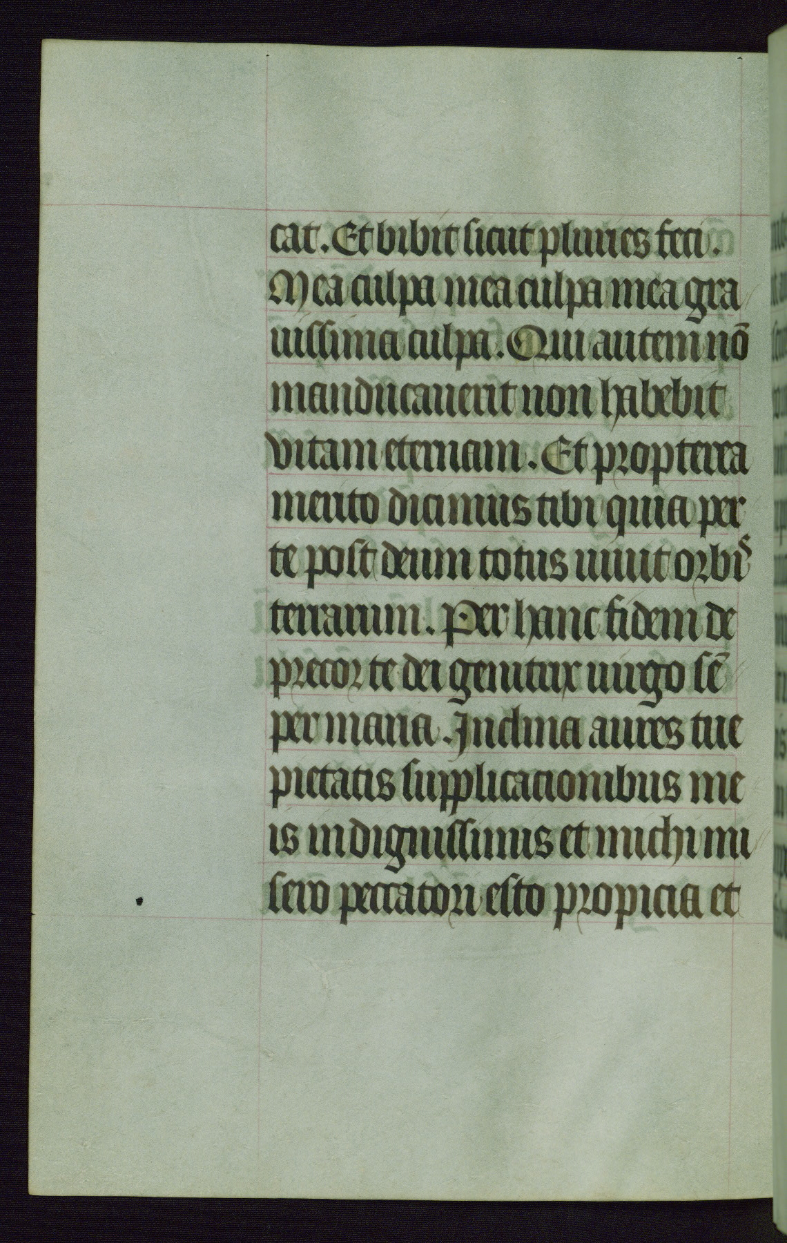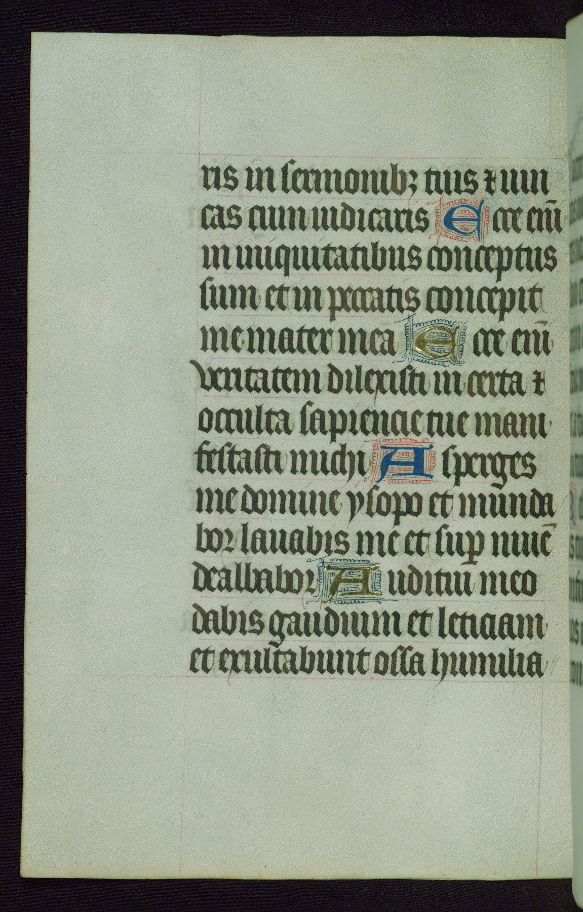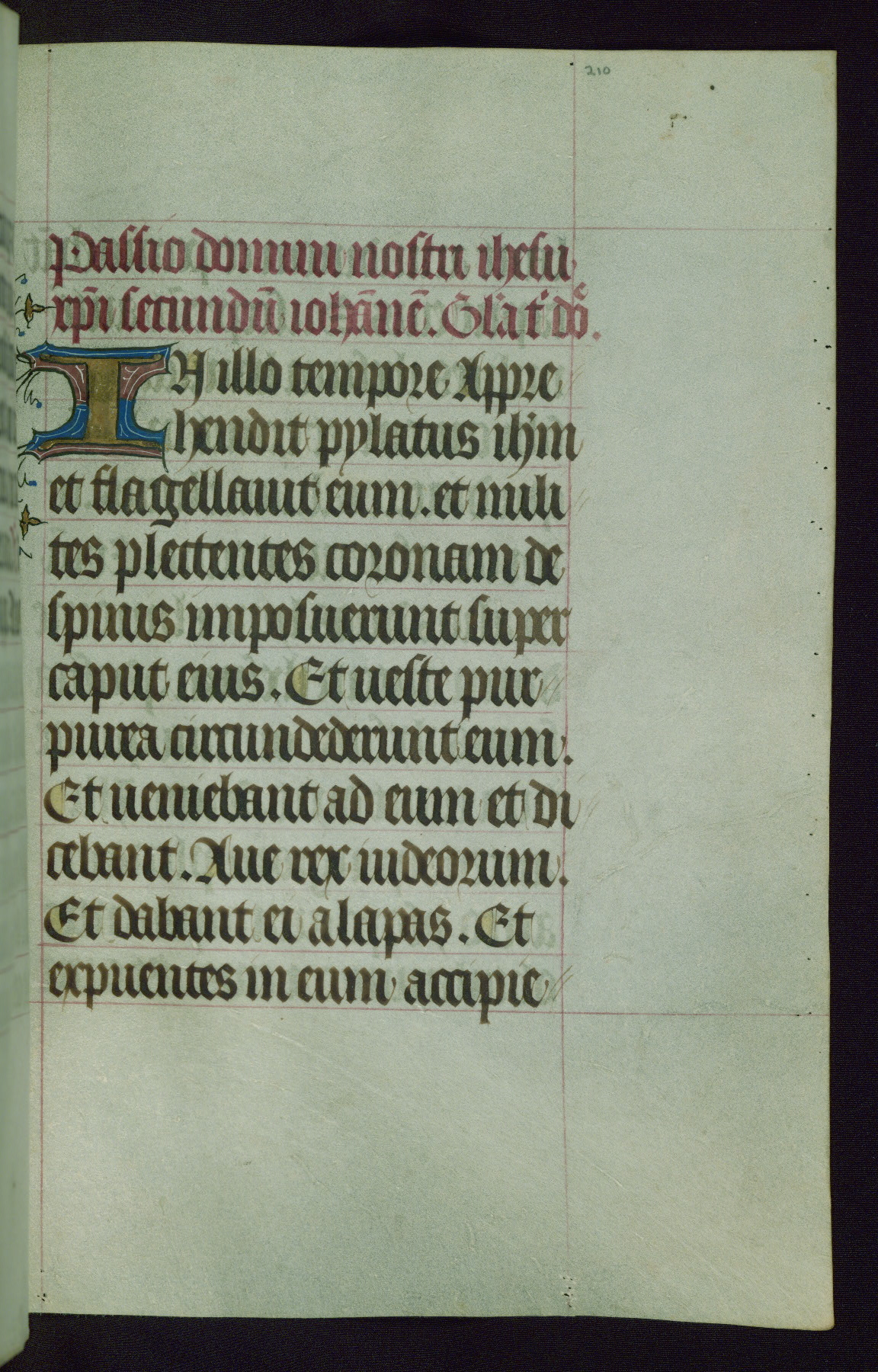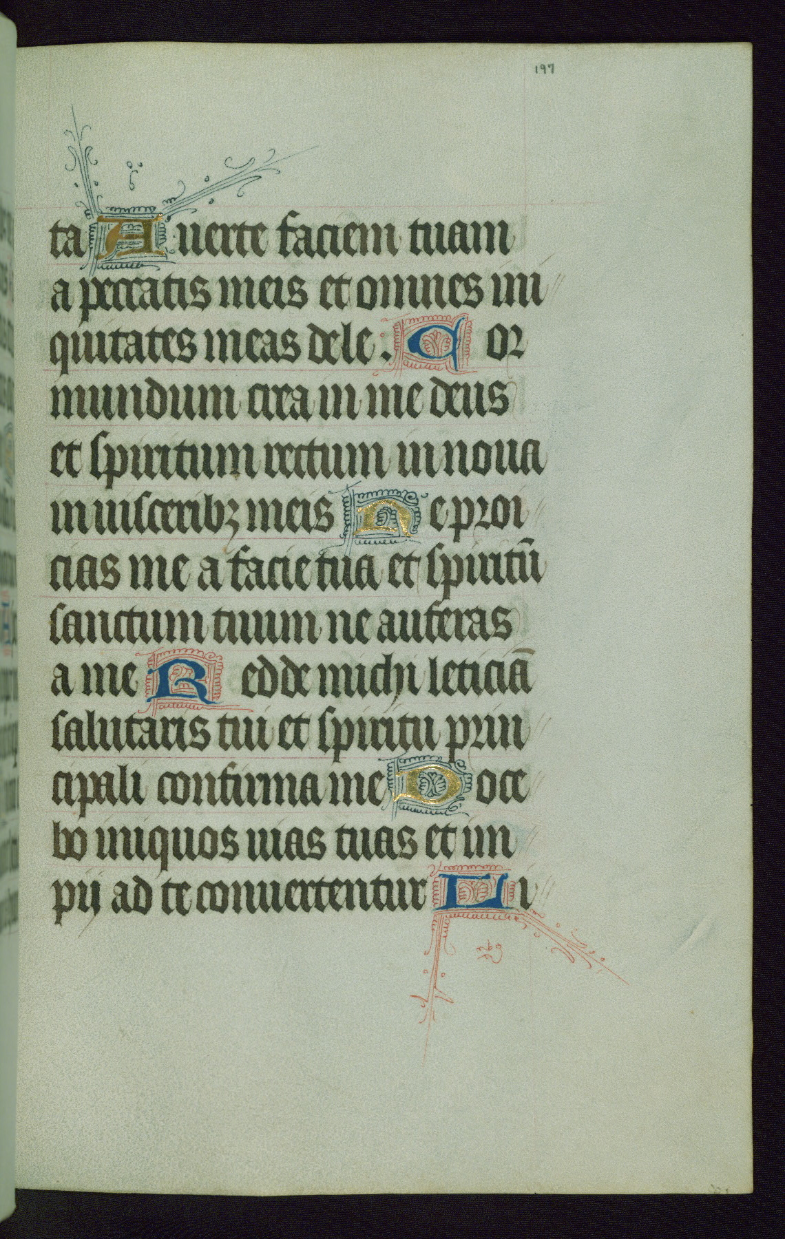 This Book of Hours, ca. 1460, was completed for use of Rome and illuminated under the influence, if not the direct participation, of Willem Vrelant. There remain twenty-two extant marginal calendar illustrations, thirteen extant full-page miniatures (many of which are paired with opening suffrages, perhaps suggesting a certain amount of significance to the owner), and one historiated initial. The contemporary binding, signed Livinus Stuaert, is dated 1477 and is most likely of Bruges or Ghent origin. It is thought that the first owner was French due to the French headings throughout and prominent fleur-de-lis figurations decorating the binding. Further, the first owner was likely female, suggested by the ways in which the book was structured to facilitate legibility. This is evinced by the large size of the script and the lack of abbreviations. While much of the text is standard, there remains evidence of personal significance and preference. This is seen in the chosen illuminations for those sections that are most significant to the owner. Most illuminations are paired with the opening page of staple Hours; however, many are accompanied by individual suffrages, constituting a large portion of the beginning of the manuscript. Personal preference is also shown in those sections of text that stray from the standard. The devotional sequence of this manuscript is notable for its sheer length and diversity of prayers as well as its inclusion of a French prayer not of official liturgy (fols. 215r-219v). The first collection of three prayers is headed and written in French. The prayer is attributed to St. Augustine and is described to guarantee a transformation of tribulation into joy through Christ's mercy, but only if the suppliant recites the prayer for thirty consecutive days. While it is not uncommon for evidence of an owner's predilections to surface in a Book of Hours, the particularly divergent features of this book allow readers to glean an intimate view of the patron.