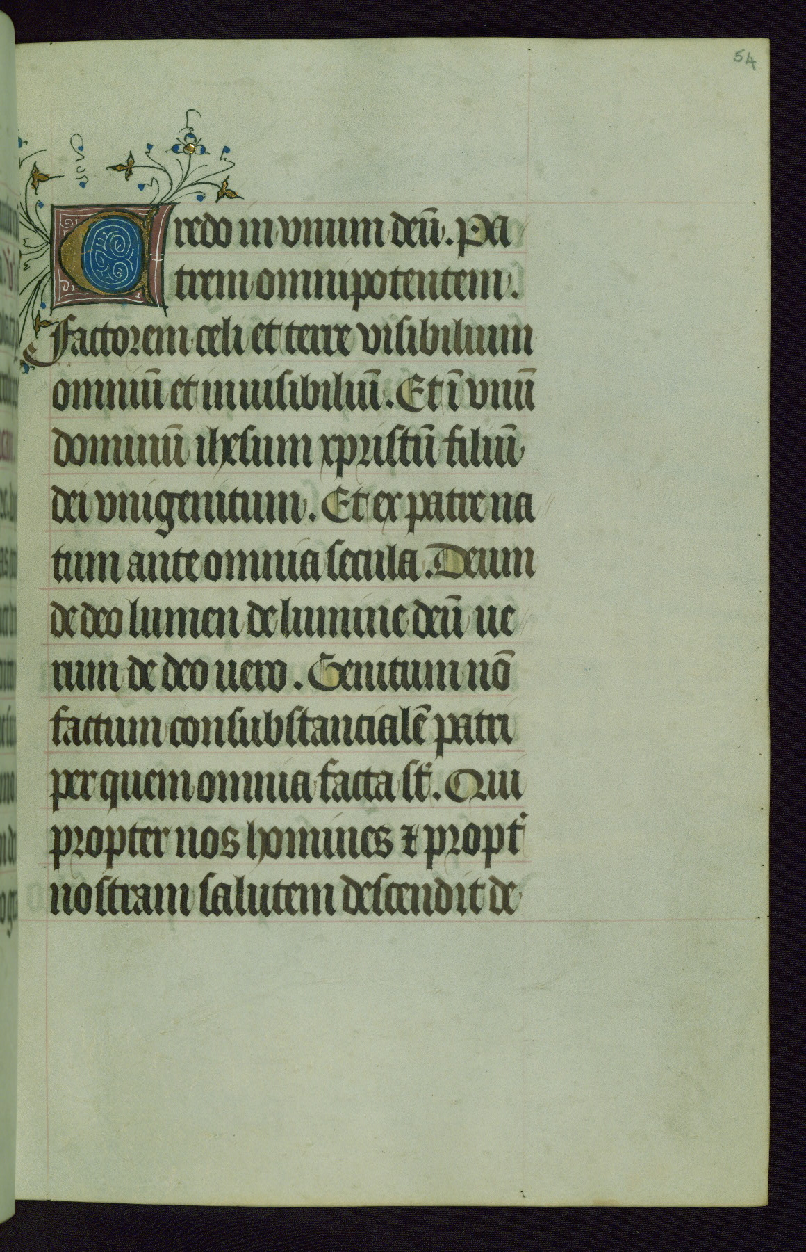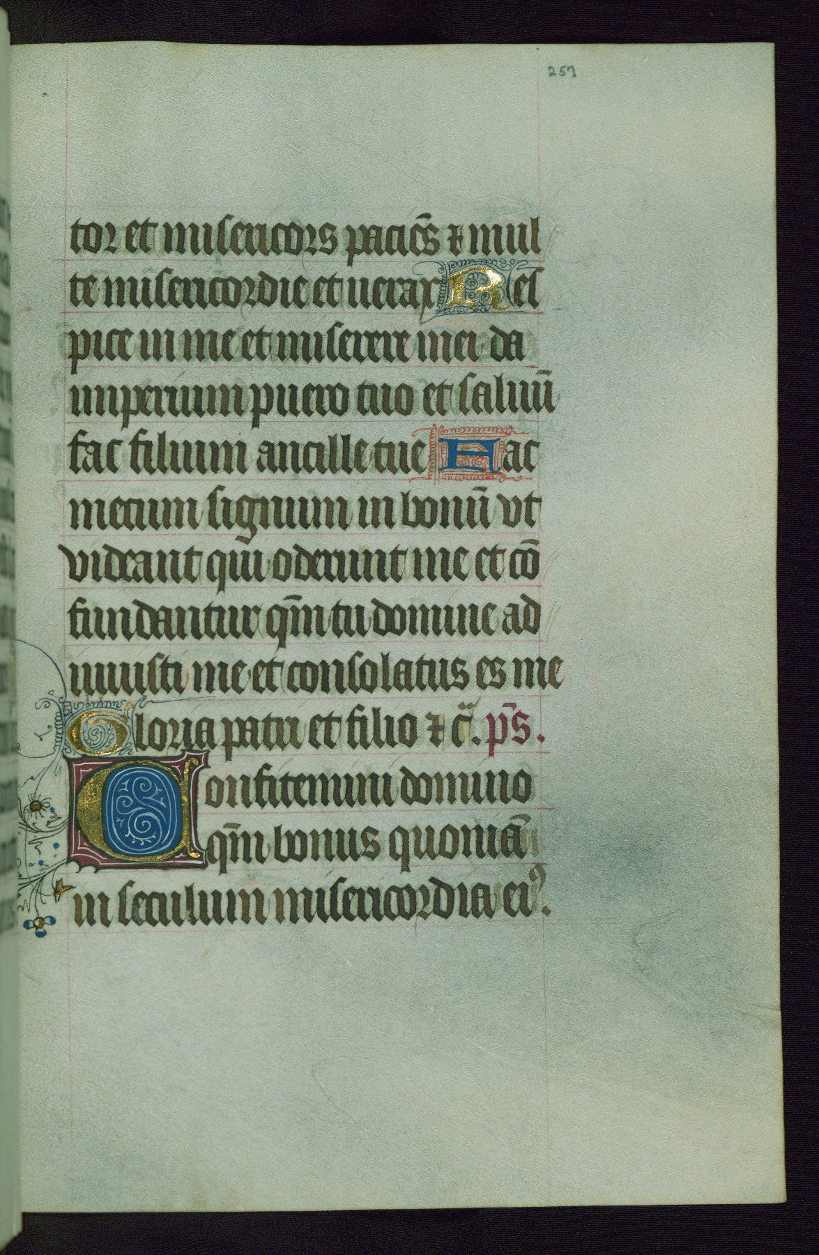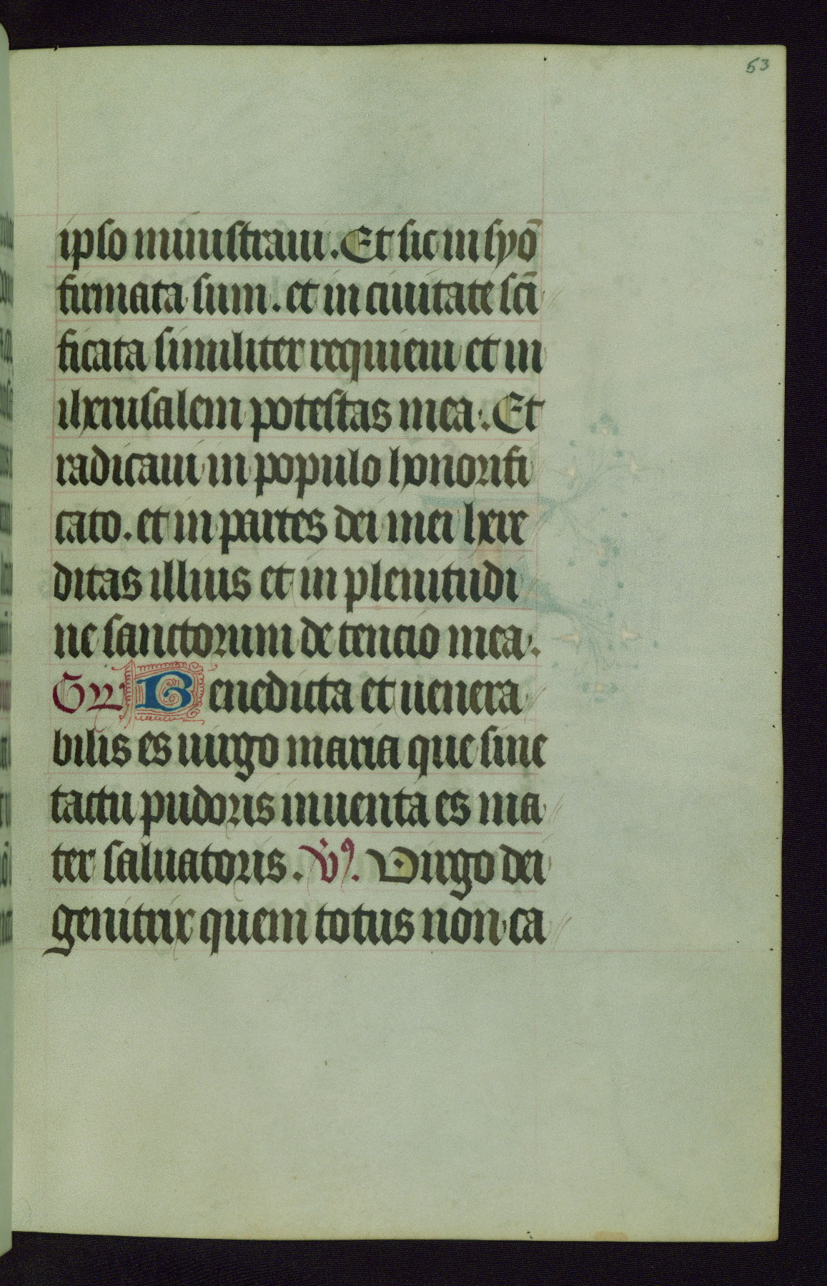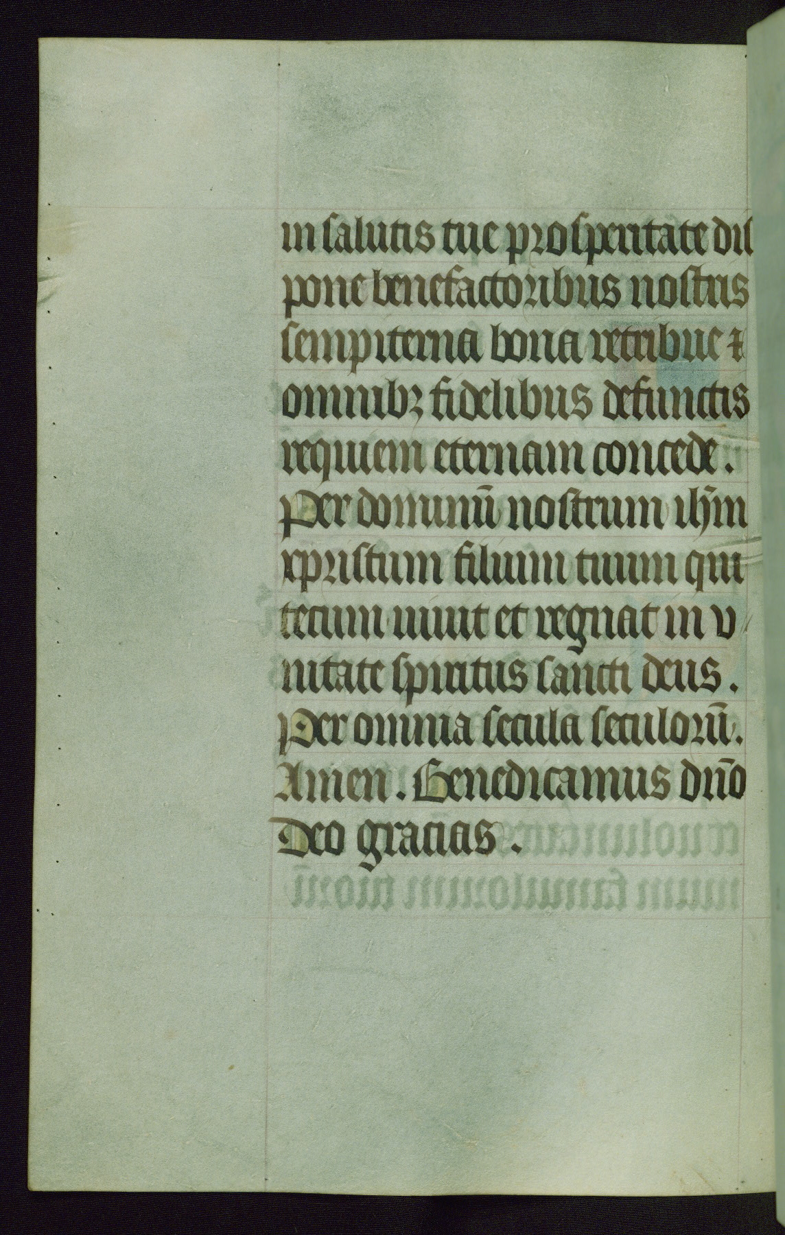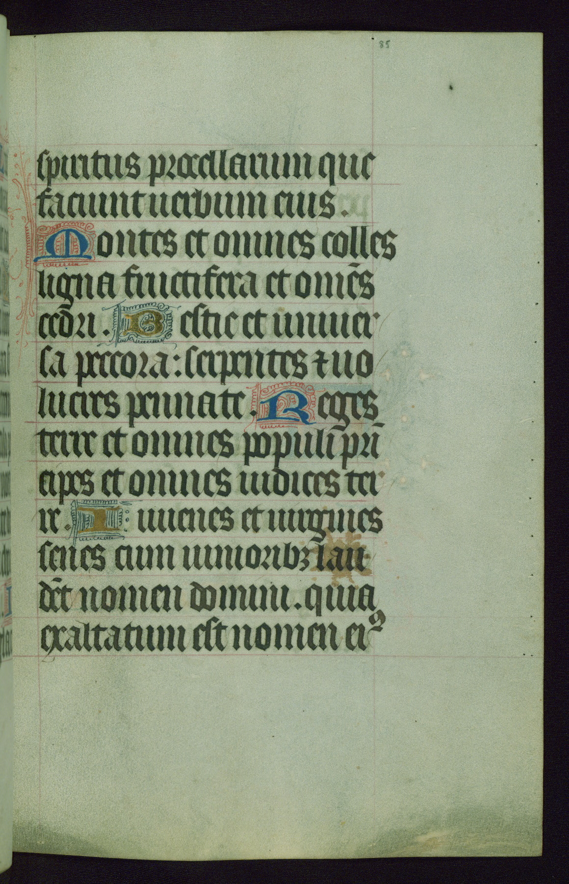 This Book of Hours, ca. 1460, was completed for use of Rome and illuminated under the influence, if not the direct participation, of Willem Vrelant. There remain twenty-two extant marginal calendar illustrations, thirteen extant full-page miniatures (many of which are paired with opening suffrages, perhaps suggesting a certain amount of significance to the owner), and one historiated initial. The contemporary binding, signed Livinus Stuaert, is dated 1477 and is most likely of Bruges or Ghent origin. It is thought that the first owner was French due to the French headings throughout and prominent fleur-de-lis figurations decorating the binding. Further, the first owner was likely female, suggested by the ways in which the book was structured to facilitate legibility. This is evinced by the large size of the script and the lack of abbreviations. While much of the text is standard, there remains evidence of personal significance and preference. This is seen in the chosen illuminations for those sections that are most significant to the owner. Most illuminations are paired with the opening page of staple Hours; however, many are accompanied by individual suffrages, constituting a large portion of the beginning of the manuscript. Personal preference is also shown in those sections of text that stray from the standard. The devotional sequence of this manuscript is notable for its sheer length and diversity of prayers as well as its inclusion of a French prayer not of official liturgy (fols. 215r-219v). The first collection of three prayers is headed and written in French. The prayer is attributed to St. Augustine and is described to guarantee a transformation of tribulation into joy through Christ's mercy, but only if the suppliant recites the prayer for thirty consecutive days. While it is not uncommon for evidence of an owner's predilections to surface in a Book of Hours, the particularly divergent features of this book allow readers to glean an intimate view of the patron.