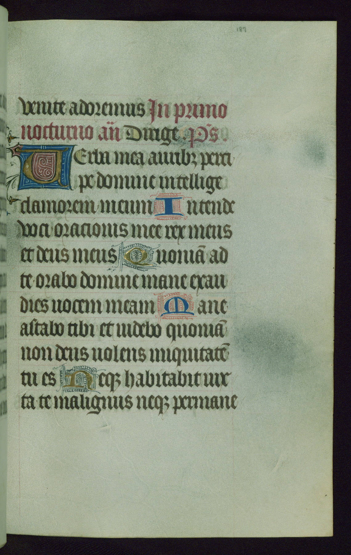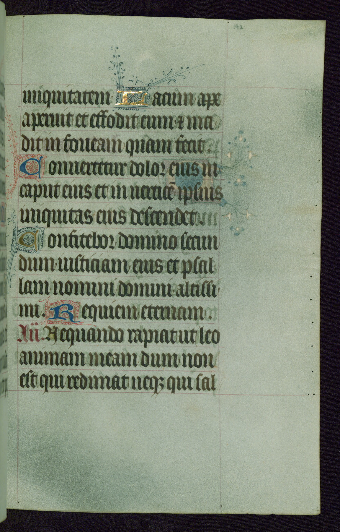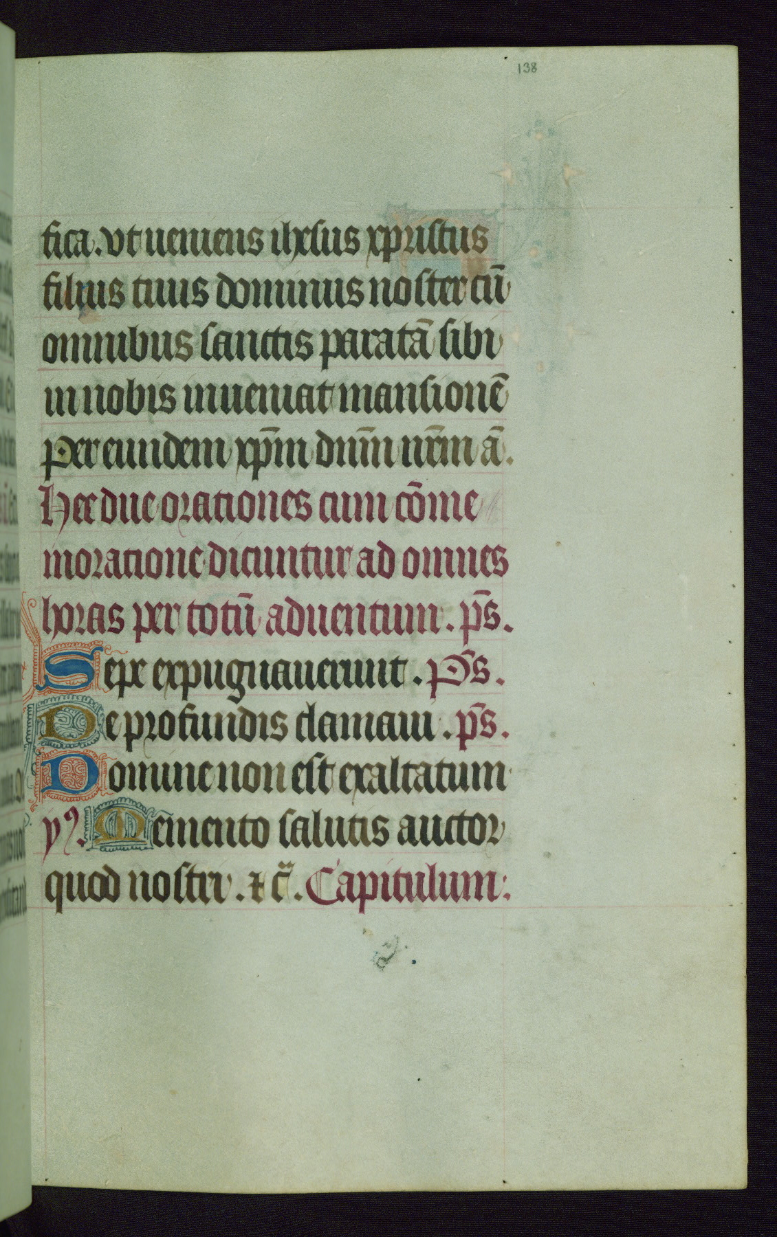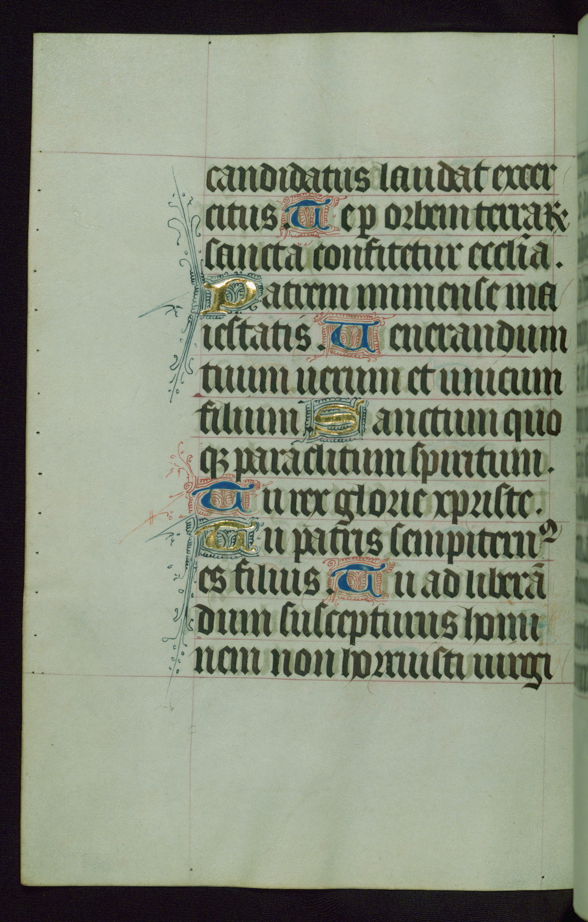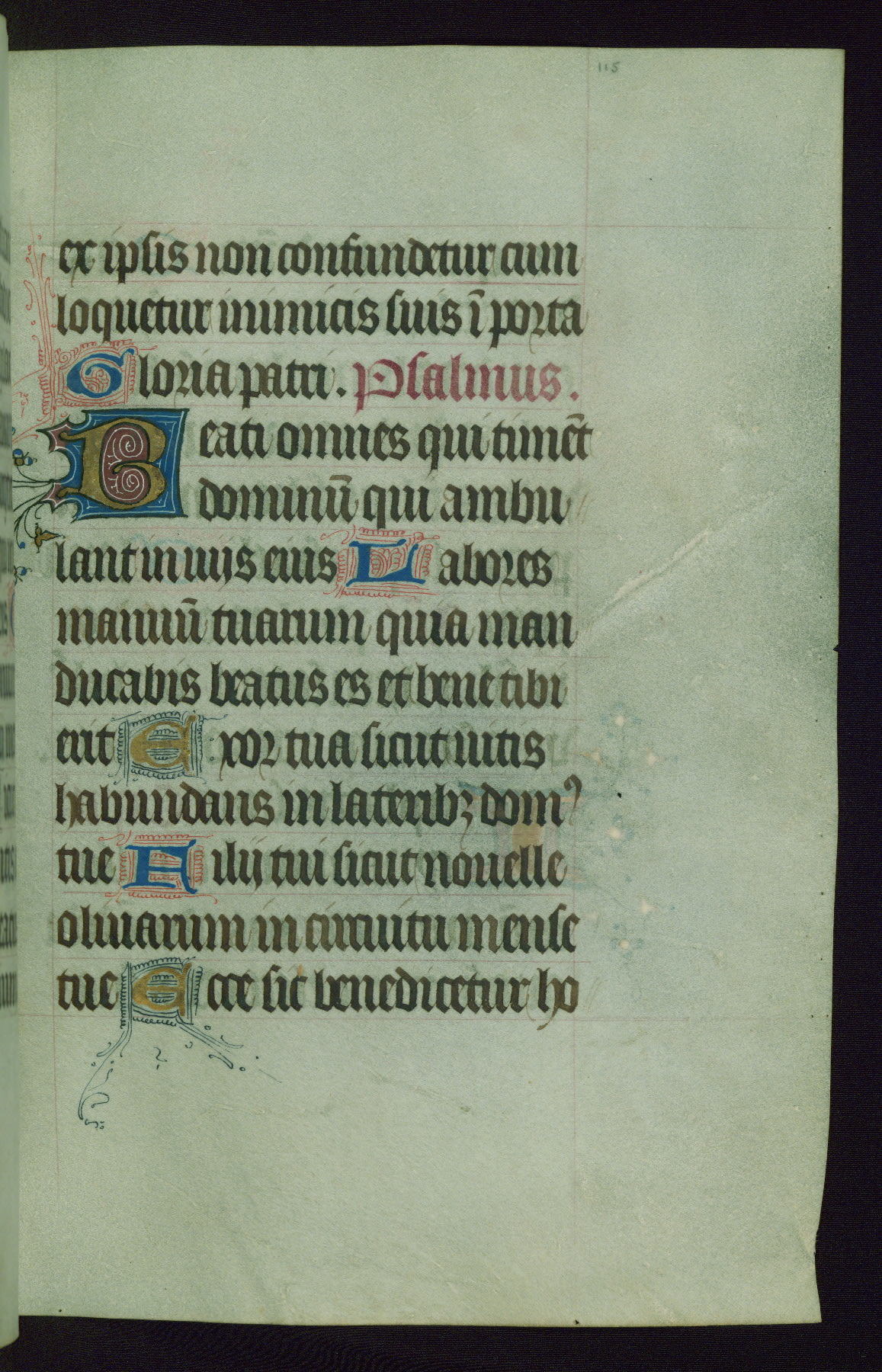 This Book of Hours, ca. 1460, was completed for use of Rome and illuminated under the influence, if not the direct participation, of Willem Vrelant. There remain twenty-two extant marginal calendar illustrations, thirteen extant full-page miniatures (many of which are paired with opening suffrages, perhaps suggesting a certain amount of significance to the owner), and one historiated initial. The contemporary binding, signed Livinus Stuaert, is dated 1477 and is most likely of Bruges or Ghent origin. It is thought that the first owner was French due to the French headings throughout and prominent fleur-de-lis figurations decorating the binding. Further, the first owner was likely female, suggested by the ways in which the book was structured to facilitate legibility. This is evinced by the large size of the script and the lack of abbreviations. While much of the text is standard, there remains evidence of personal significance and preference. This is seen in the chosen illuminations for those sections that are most significant to the owner. Most illuminations are paired with the opening page of staple Hours; however, many are accompanied by individual suffrages, constituting a large portion of the beginning of the manuscript. Personal preference is also shown in those sections of text that stray from the standard. The devotional sequence of this manuscript is notable for its sheer length and diversity of prayers as well as its inclusion of a French prayer not of official liturgy (fols. 215r-219v). The first collection of three prayers is headed and written in French. The prayer is attributed to St. Augustine and is described to guarantee a transformation of tribulation into joy through Christ's mercy, but only if the suppliant recites the prayer for thirty consecutive days. While it is not uncommon for evidence of an owner's predilections to surface in a Book of Hours, the particularly divergent features of this book allow readers to glean an intimate view of the patron.