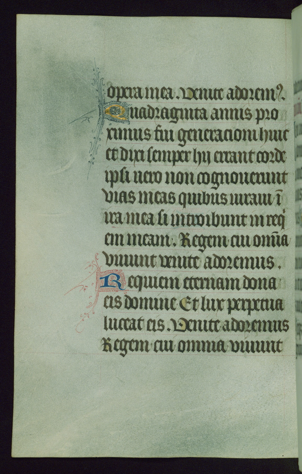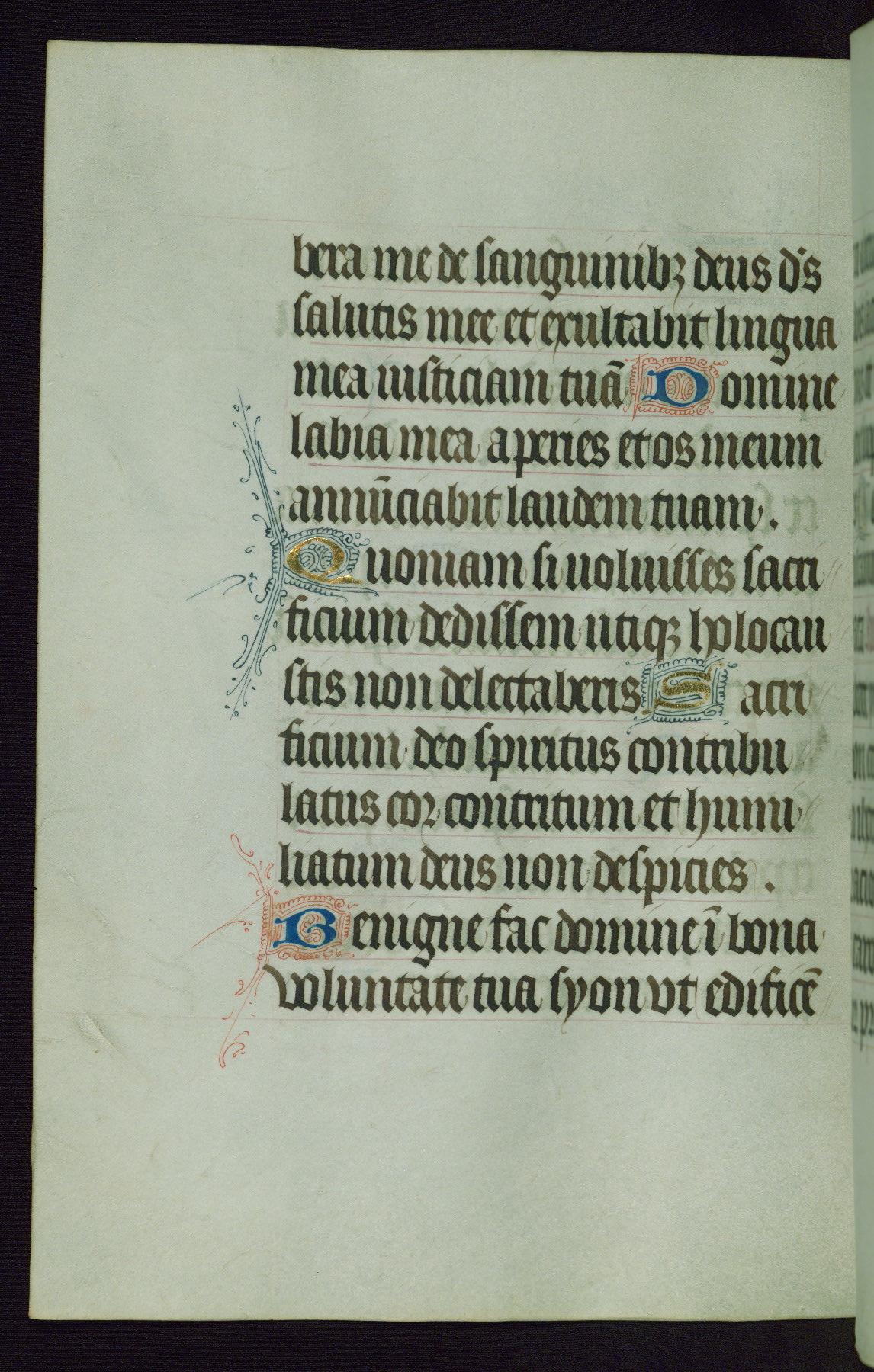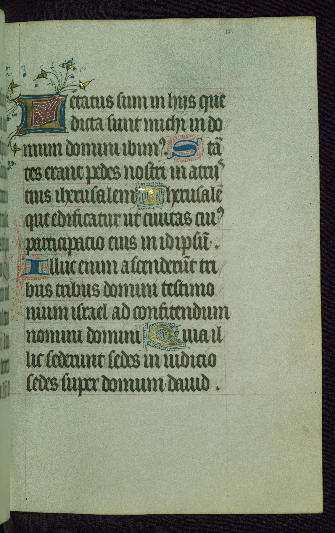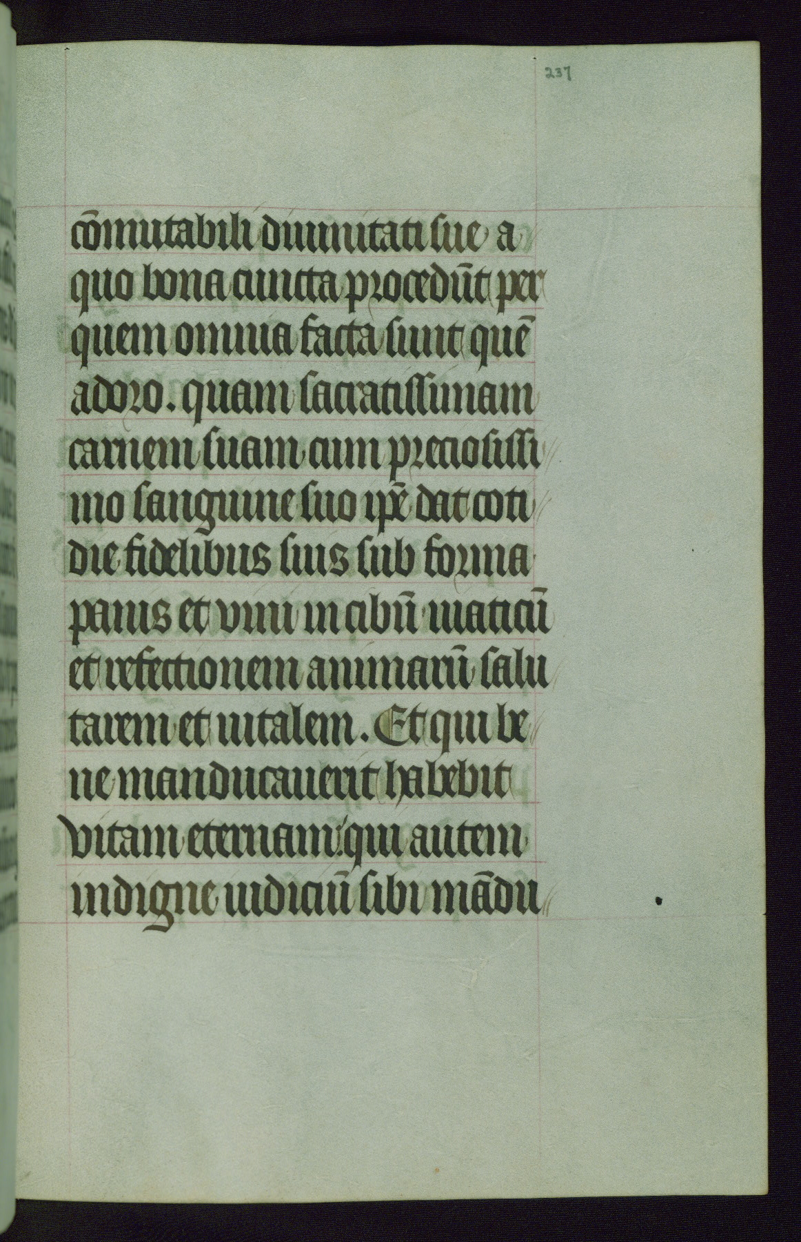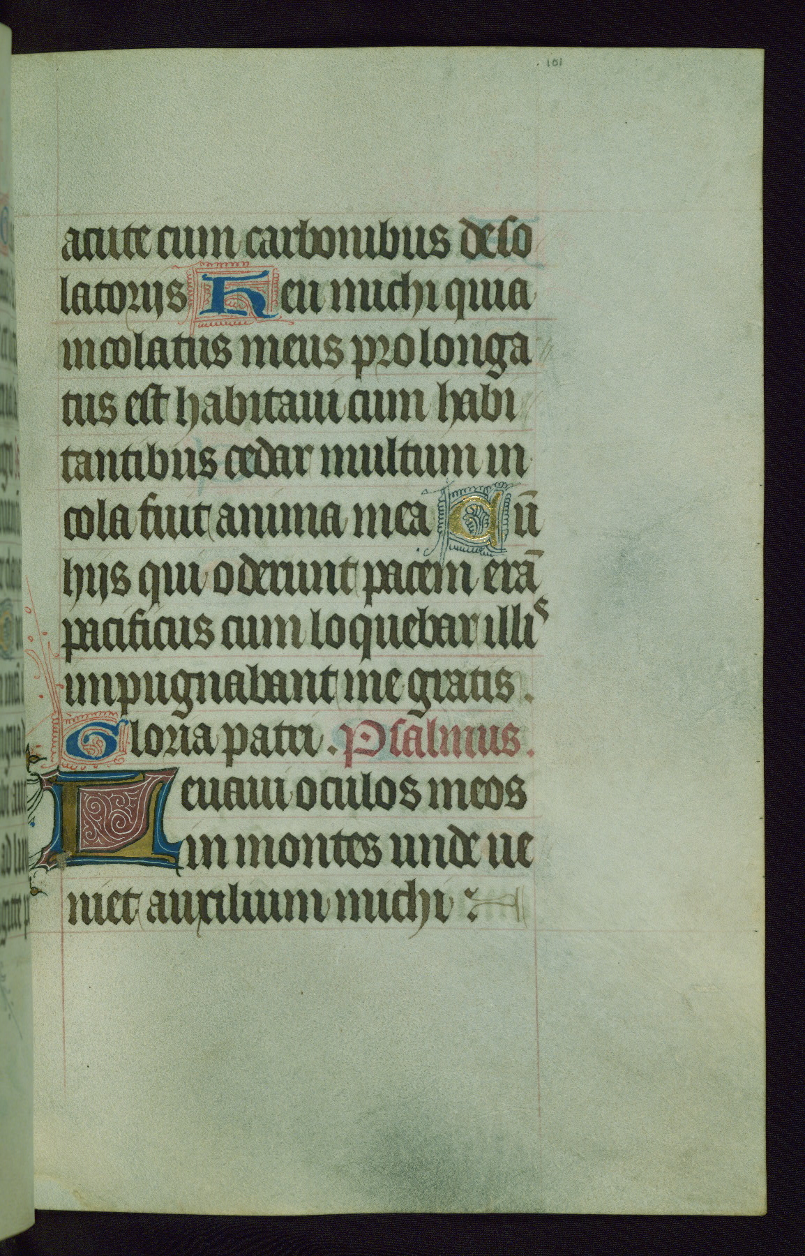 This Book of Hours, ca. 1460, was completed for use of Rome and illuminated under the influence, if not the direct participation, of Willem Vrelant. There remain twenty-two extant marginal calendar illustrations, thirteen extant full-page miniatures (many of which are paired with opening suffrages, perhaps suggesting a certain amount of significance to the owner), and one historiated initial. The contemporary binding, signed Livinus Stuaert, is dated 1477 and is most likely of Bruges or Ghent origin. It is thought that the first owner was French due to the French headings throughout and prominent fleur-de-lis figurations decorating the binding. Further, the first owner was likely female, suggested by the ways in which the book was structured to facilitate legibility. This is evinced by the large size of the script and the lack of abbreviations. While much of the text is standard, there remains evidence of personal significance and preference. This is seen in the chosen illuminations for those sections that are most significant to the owner. Most illuminations are paired with the opening page of staple Hours; however, many are accompanied by individual suffrages, constituting a large portion of the beginning of the manuscript. Personal preference is also shown in those sections of text that stray from the standard. The devotional sequence of this manuscript is notable for its sheer length and diversity of prayers as well as its inclusion of a French prayer not of official liturgy (fols. 215r-219v). The first collection of three prayers is headed and written in French. The prayer is attributed to St. Augustine and is described to guarantee a transformation of tribulation into joy through Christ's mercy, but only if the suppliant recites the prayer for thirty consecutive days. While it is not uncommon for evidence of an owner's predilections to surface in a Book of Hours, the particularly divergent features of this book allow readers to glean an intimate view of the patron.