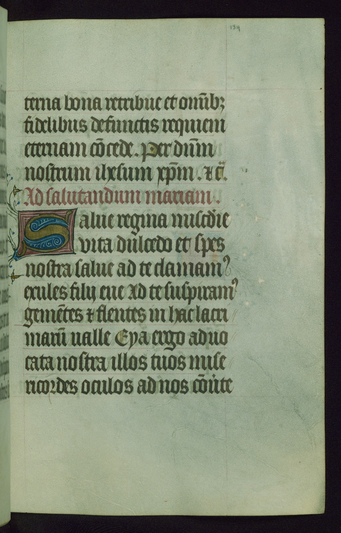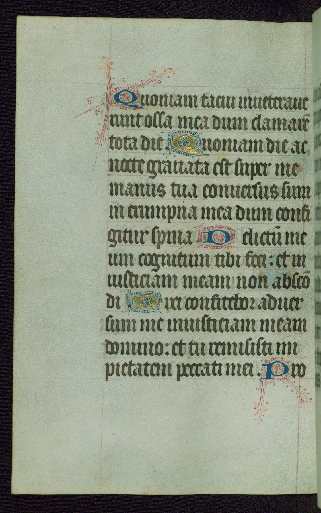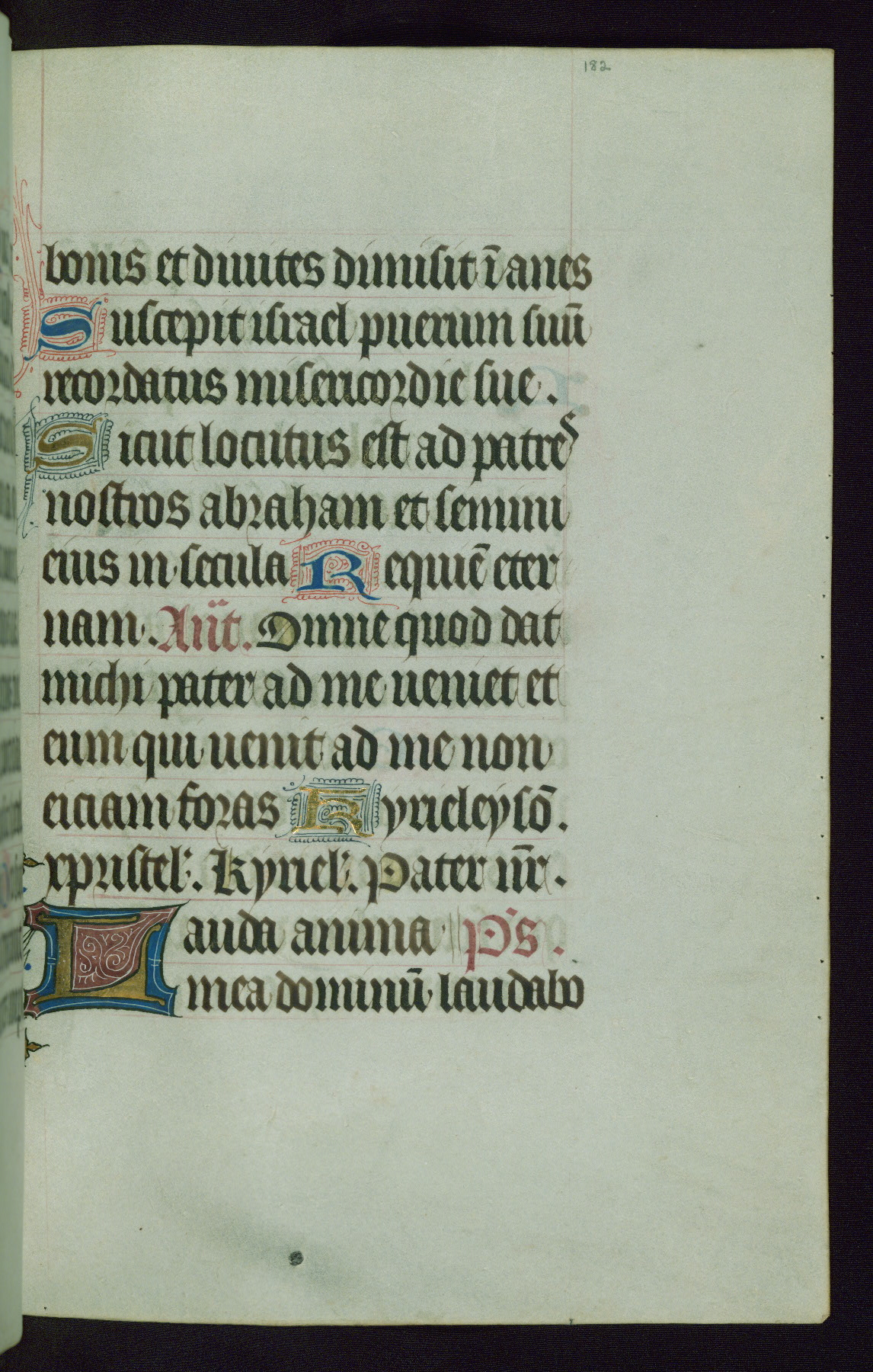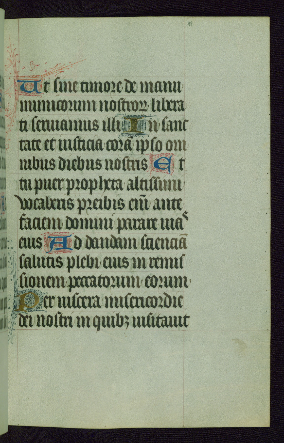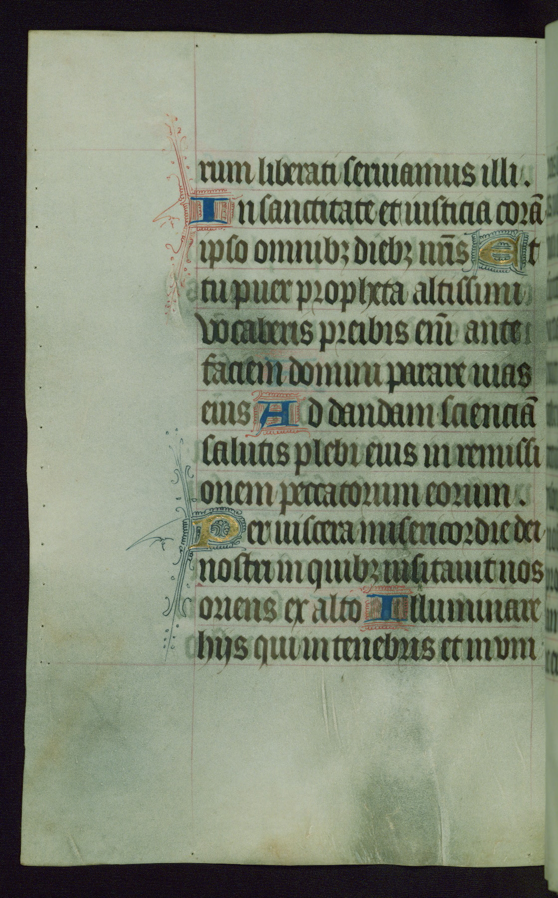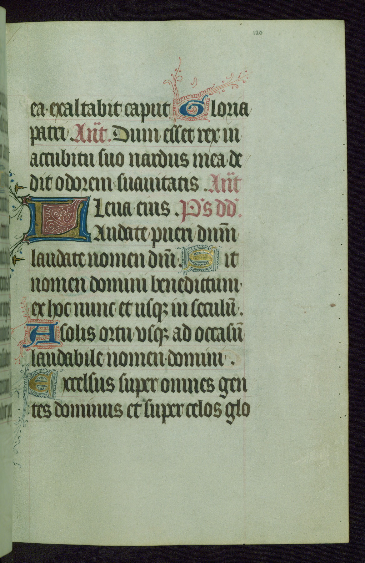This Book of Hours, ca. 1460, was completed for use of Rome and illuminated under the influence, if not the direct participation, of Willem Vrelant. There remain twenty-two extant marginal calendar illustrations, thirteen extant full-page miniatures (many of which are paired with opening suffrages, perhaps suggesting a certain amount of significance to the owner), and one historiated initial. The contemporary binding, signed Livinus Stuaert, is dated 1477 and is most likely of Bruges or Ghent origin. It is thought that the first owner was French due to the French headings throughout and prominent fleur-de-lis figurations decorating the binding. Further, the first owner was likely female, suggested by the ways in which the book was structured to facilitate legibility. This is evinced by the large size of the script and the lack of abbreviations. While much of the text is standard, there remains evidence of personal significance and preference. This is seen in the chosen illuminations for those sections that are most significant to the owner. Most illuminations are paired with the opening page of staple Hours; however, many are accompanied by individual suffrages, constituting a large portion of the beginning of the manuscript. Personal preference is also shown in those sections of text that stray from the standard. The devotional sequence of this manuscript is notable for its sheer length and diversity of prayers as well as its inclusion of a French prayer not of official liturgy (fols. 215r-219v). The first collection of three prayers is headed and written in French. The prayer is attributed to St. Augustine and is described to guarantee a transformation of tribulation into joy through Christ's mercy, but only if the suppliant recites the prayer for thirty consecutive days. While it is not uncommon for evidence of an owner's predilections to surface in a Book of Hours, the particularly divergent features of this book allow readers to glean an intimate view of the patron.