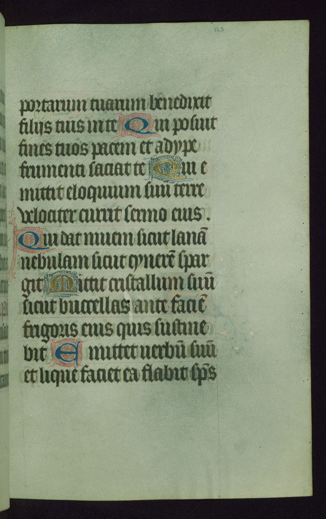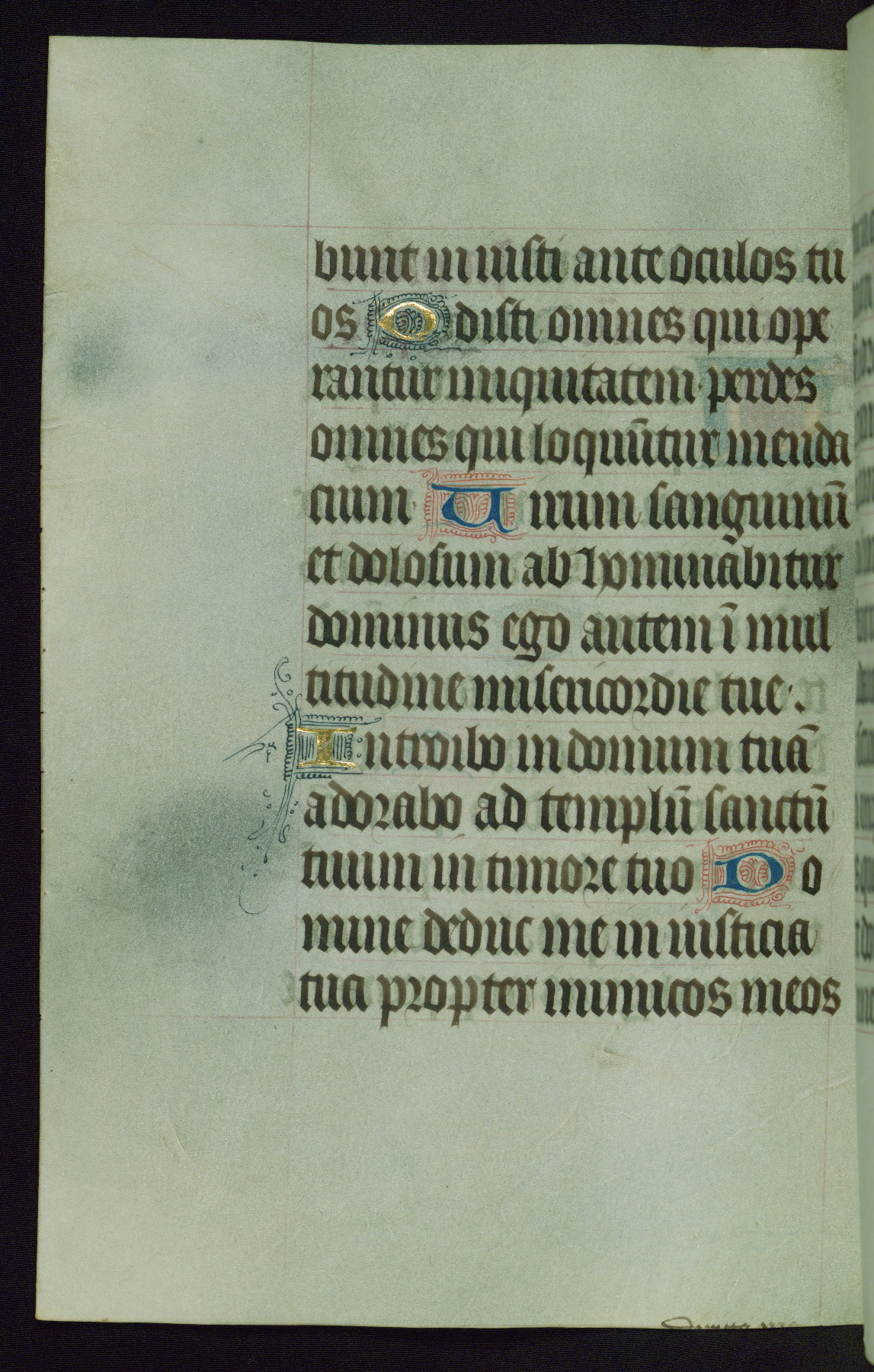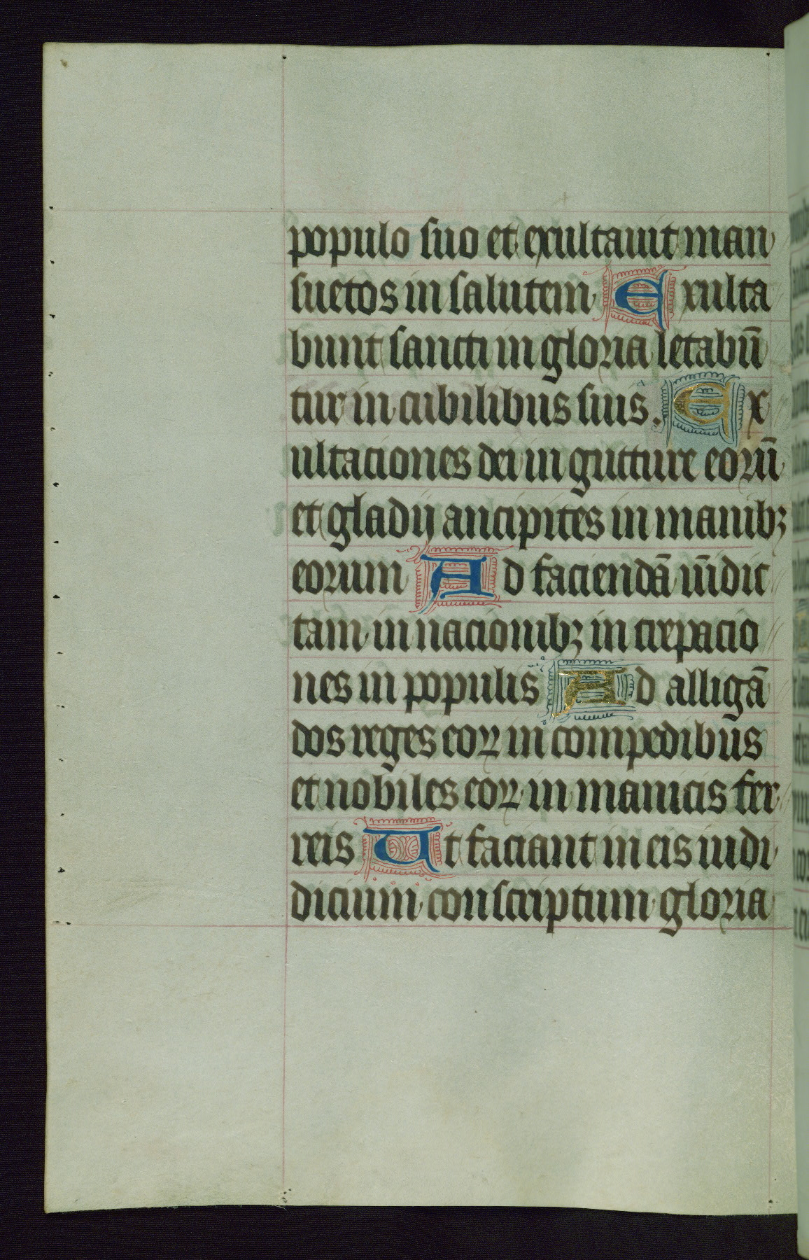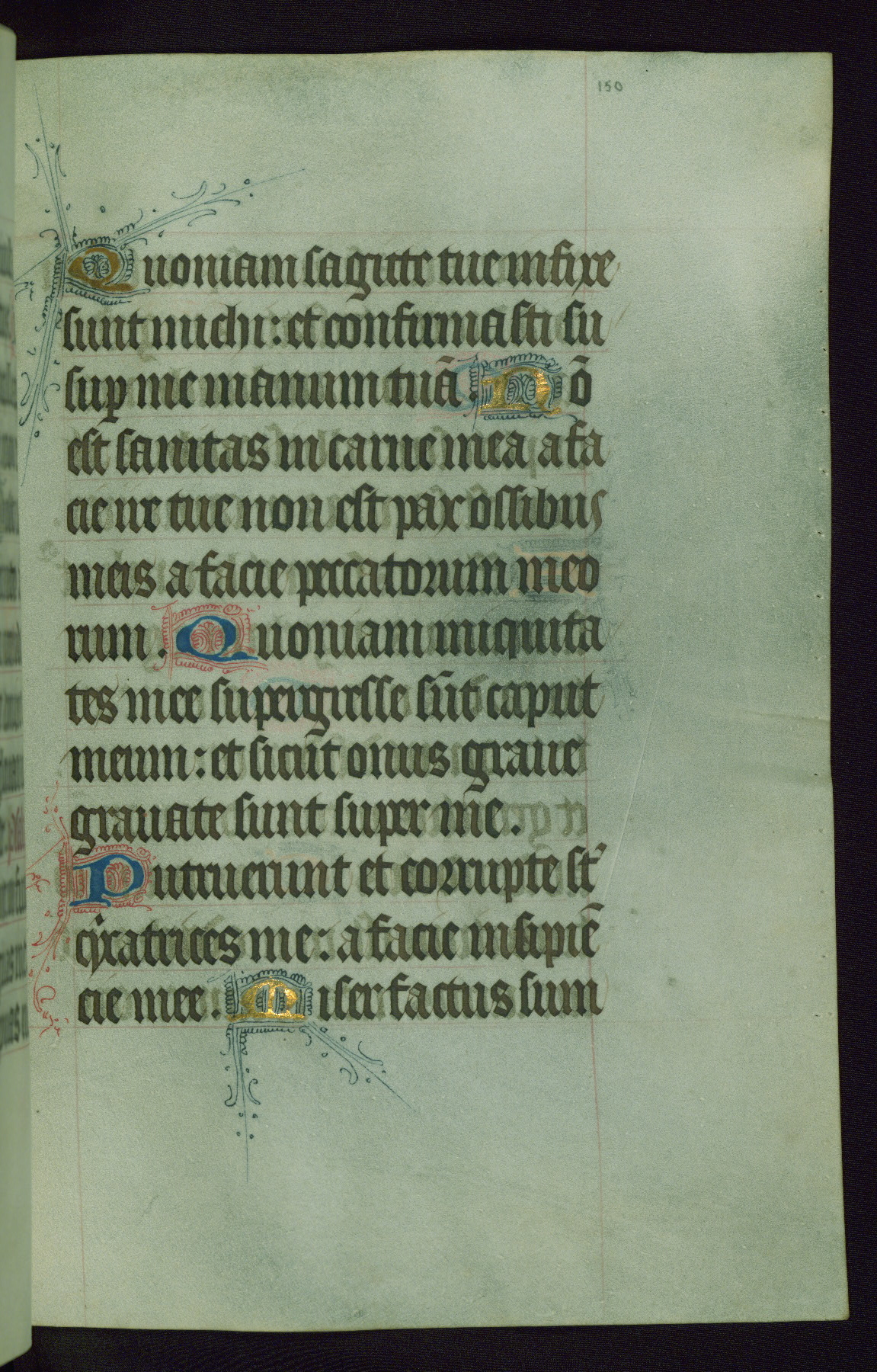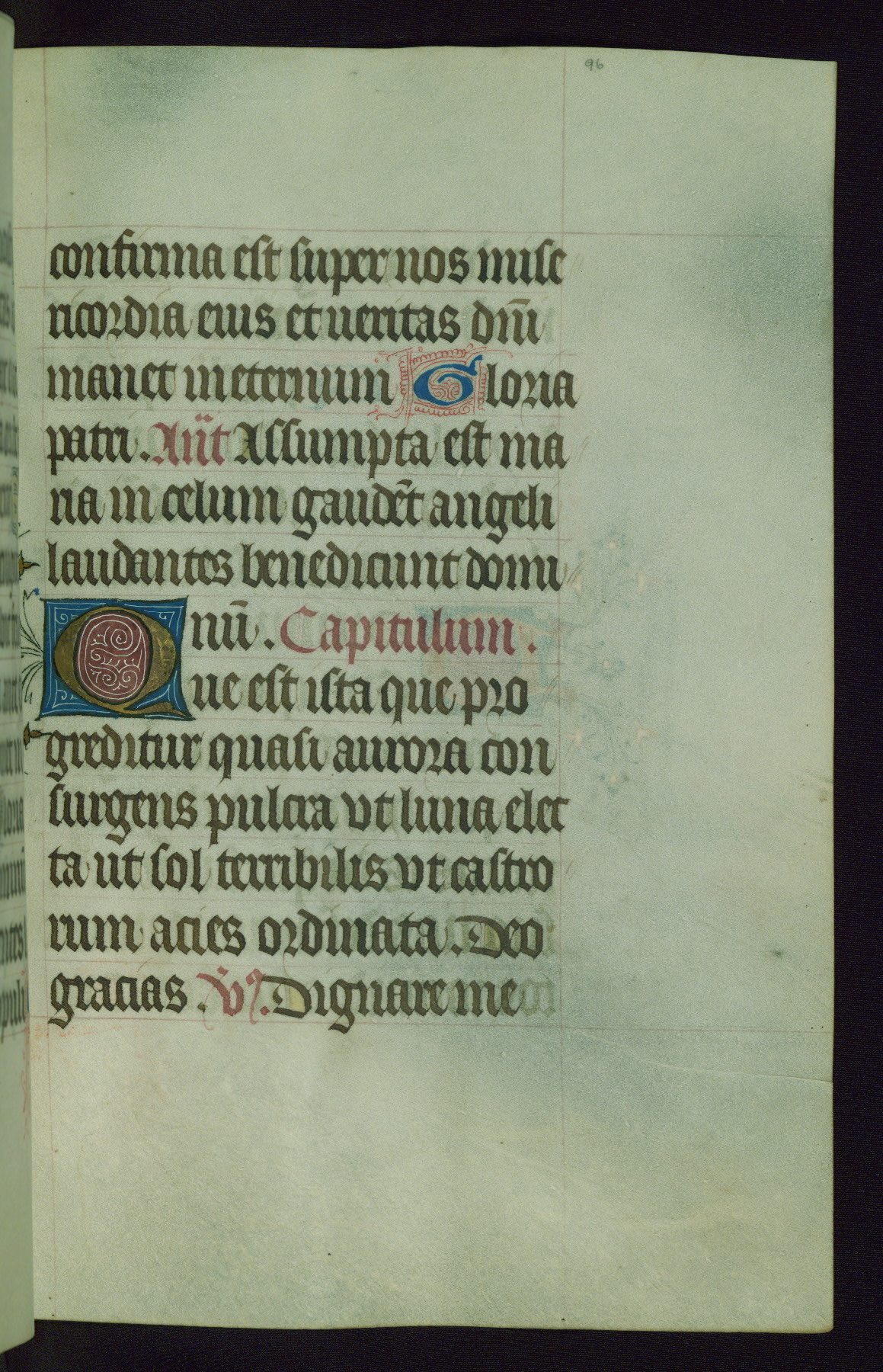 This Book of Hours, ca. 1460, was completed for use of Rome and illuminated under the influence, if not the direct participation, of Willem Vrelant. There remain twenty-two extant marginal calendar illustrations, thirteen extant full-page miniatures (many of which are paired with opening suffrages, perhaps suggesting a certain amount of significance to the owner), and one historiated initial. The contemporary binding, signed Livinus Stuaert, is dated 1477 and is most likely of Bruges or Ghent origin. It is thought that the first owner was French due to the French headings throughout and prominent fleur-de-lis figurations decorating the binding. Further, the first owner was likely female, suggested by the ways in which the book was structured to facilitate legibility. This is evinced by the large size of the script and the lack of abbreviations. While much of the text is standard, there remains evidence of personal significance and preference. This is seen in the chosen illuminations for those sections that are most significant to the owner. Most illuminations are paired with the opening page of staple Hours; however, many are accompanied by individual suffrages, constituting a large portion of the beginning of the manuscript. Personal preference is also shown in those sections of text that stray from the standard. The devotional sequence of this manuscript is notable for its sheer length and diversity of prayers as well as its inclusion of a French prayer not of official liturgy (fols. 215r-219v). The first collection of three prayers is headed and written in French. The prayer is attributed to St. Augustine and is described to guarantee a transformation of tribulation into joy through Christ's mercy, but only if the suppliant recites the prayer for thirty consecutive days. While it is not uncommon for evidence of an owner's predilections to surface in a Book of Hours, the particularly divergent features of this book allow readers to glean an intimate view of the patron.