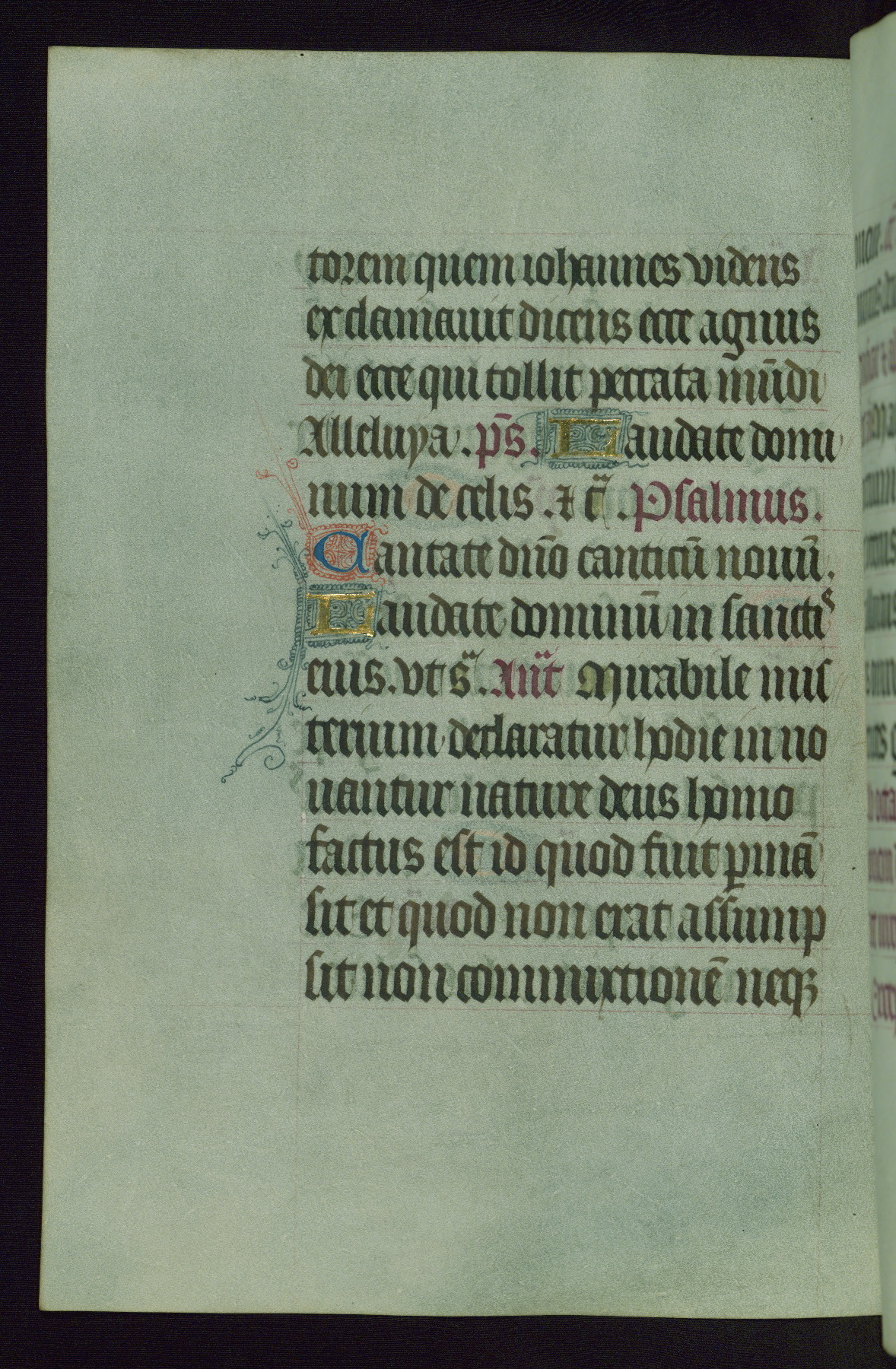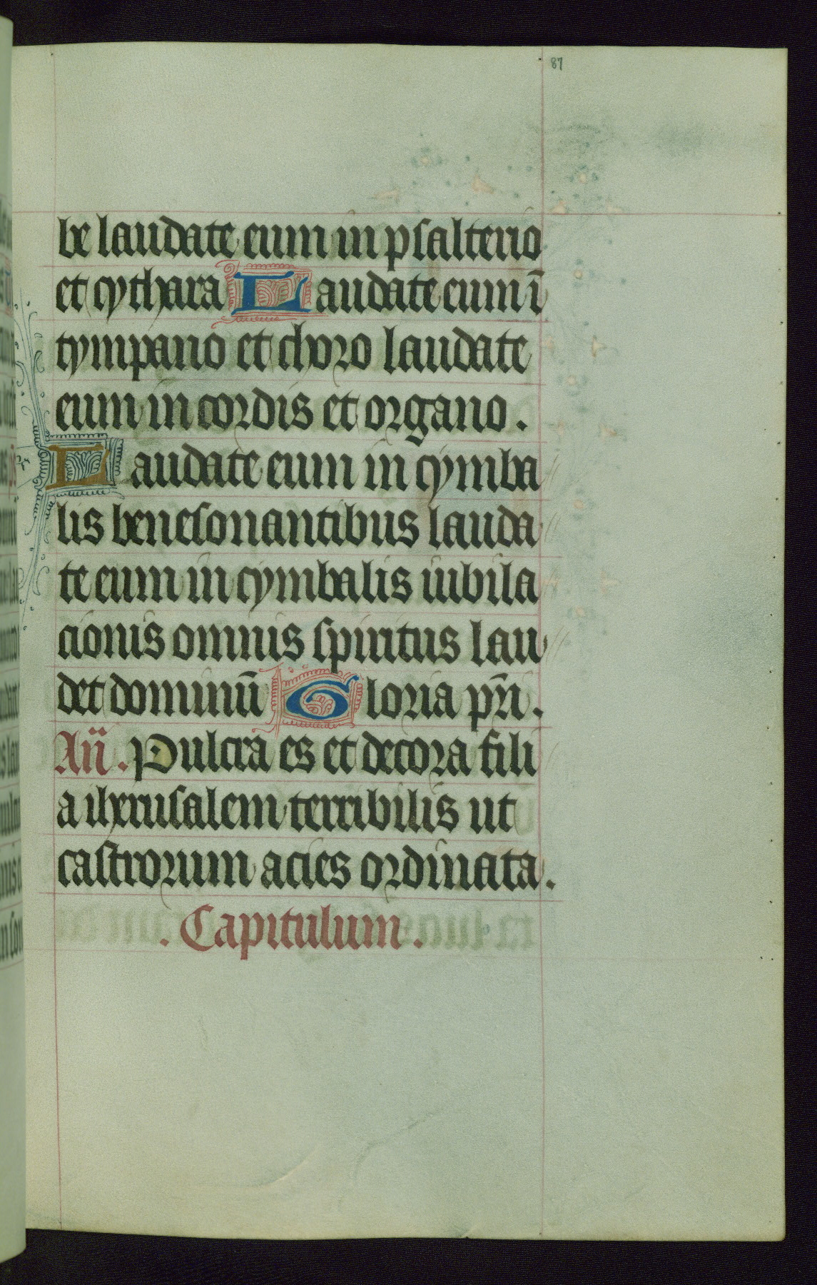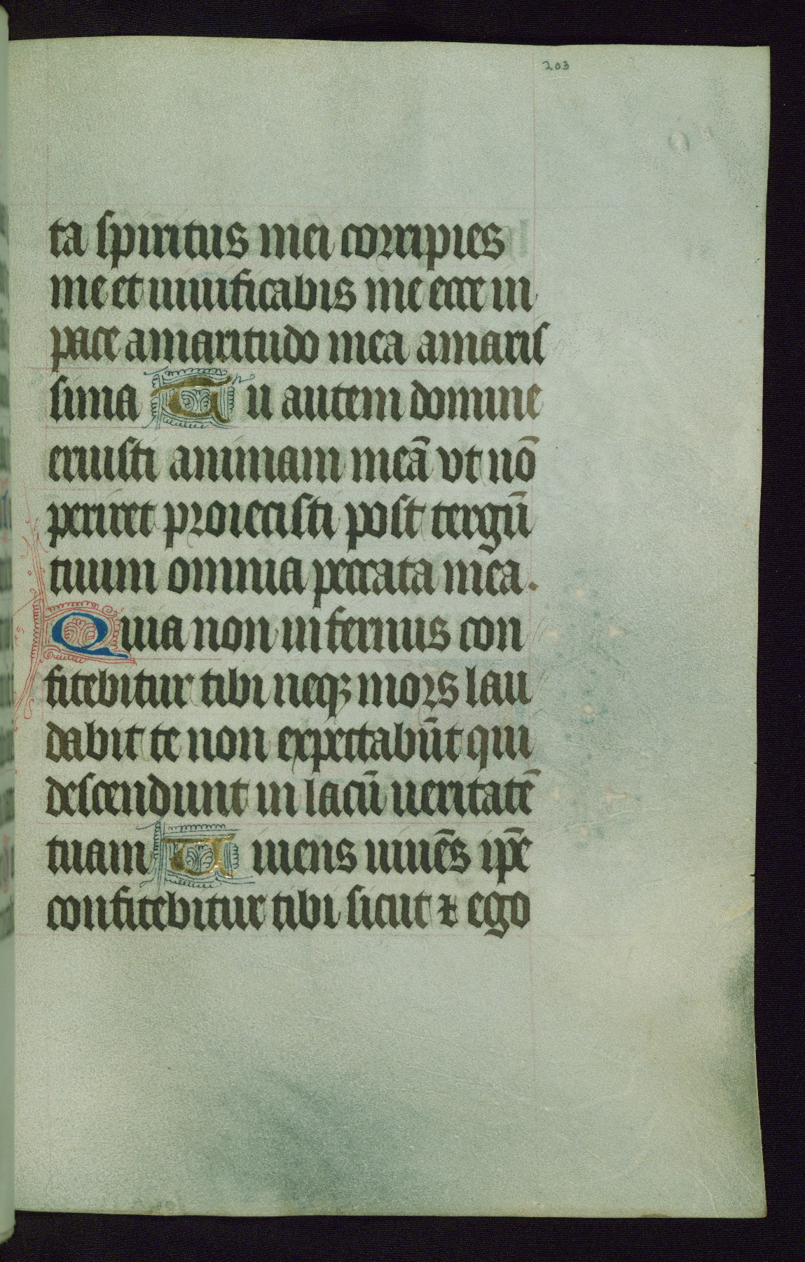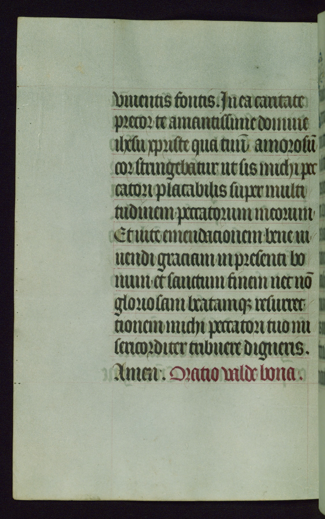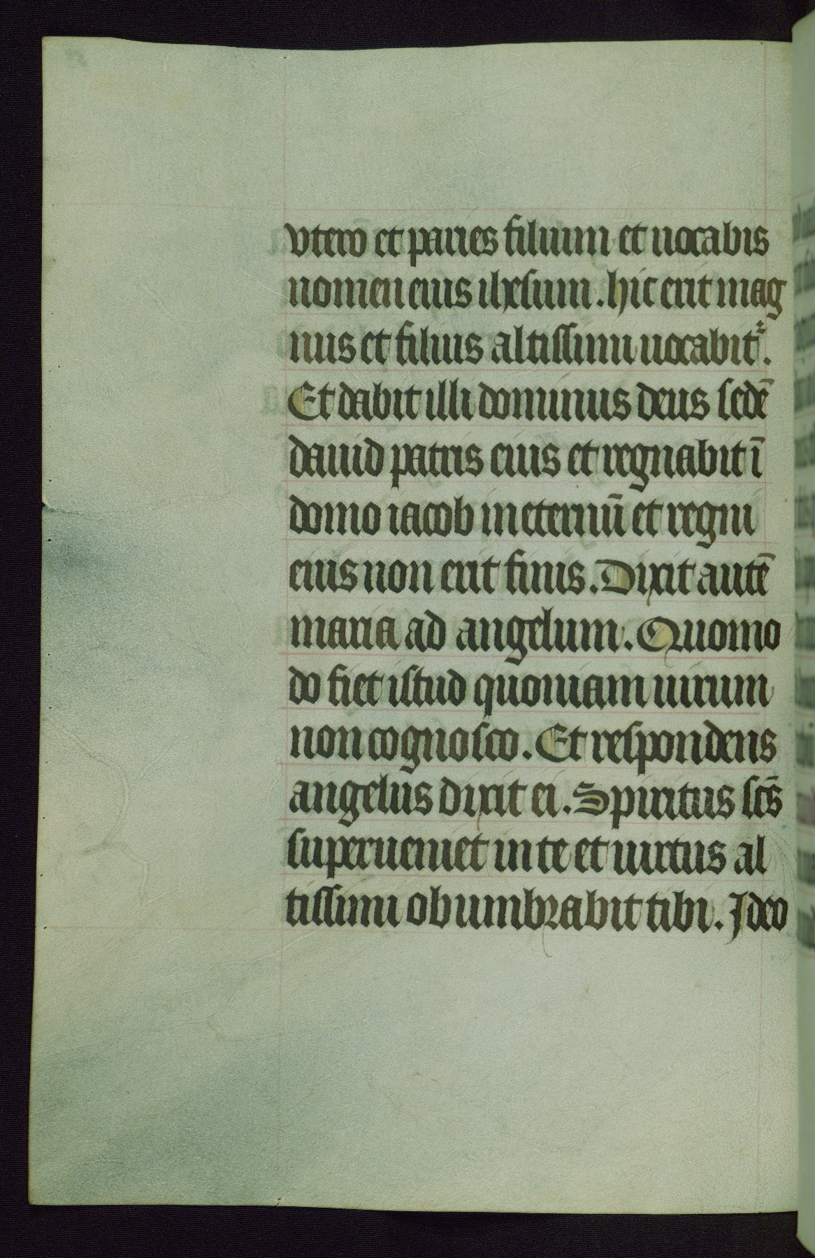 This Book of Hours, ca. 1460, was completed for use of Rome and illuminated under the influence, if not the direct participation, of Willem Vrelant. There remain twenty-two extant marginal calendar illustrations, thirteen extant full-page miniatures (many of which are paired with opening suffrages, perhaps suggesting a certain amount of significance to the owner), and one historiated initial. The contemporary binding, signed Livinus Stuaert, is dated 1477 and is most likely of Bruges or Ghent origin. It is thought that the first owner was French due to the French headings throughout and prominent fleur-de-lis figurations decorating the binding. Further, the first owner was likely female, suggested by the ways in which the book was structured to facilitate legibility. This is evinced by the large size of the script and the lack of abbreviations. While much of the text is standard, there remains evidence of personal significance and preference. This is seen in the chosen illuminations for those sections that are most significant to the owner. Most illuminations are paired with the opening page of staple Hours; however, many are accompanied by individual suffrages, constituting a large portion of the beginning of the manuscript. Personal preference is also shown in those sections of text that stray from the standard. The devotional sequence of this manuscript is notable for its sheer length and diversity of prayers as well as its inclusion of a French prayer not of official liturgy (fols. 215r-219v). The first collection of three prayers is headed and written in French. The prayer is attributed to St. Augustine and is described to guarantee a transformation of tribulation into joy through Christ's mercy, but only if the suppliant recites the prayer for thirty consecutive days. While it is not uncommon for evidence of an owner's predilections to surface in a Book of Hours, the particularly divergent features of this book allow readers to glean an intimate view of the patron.