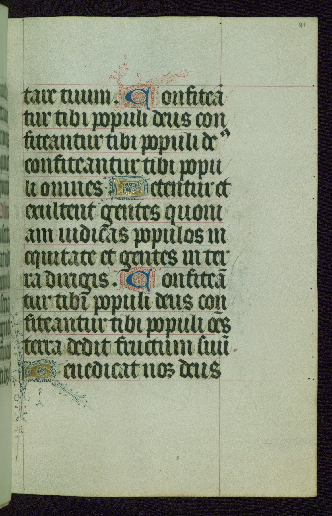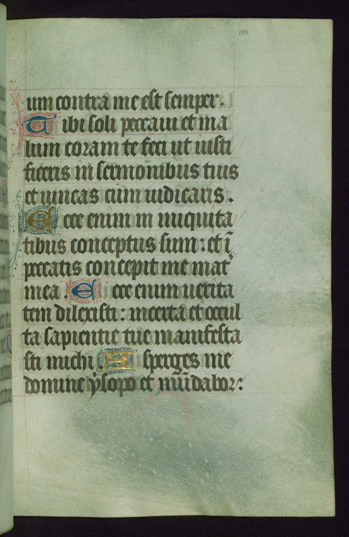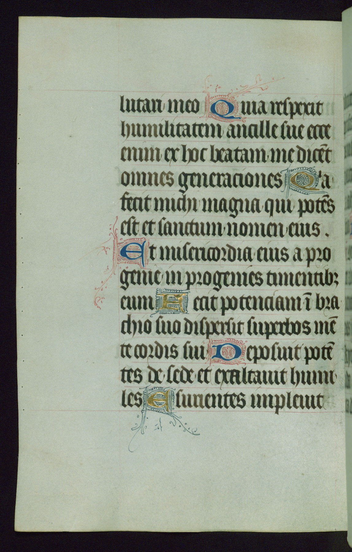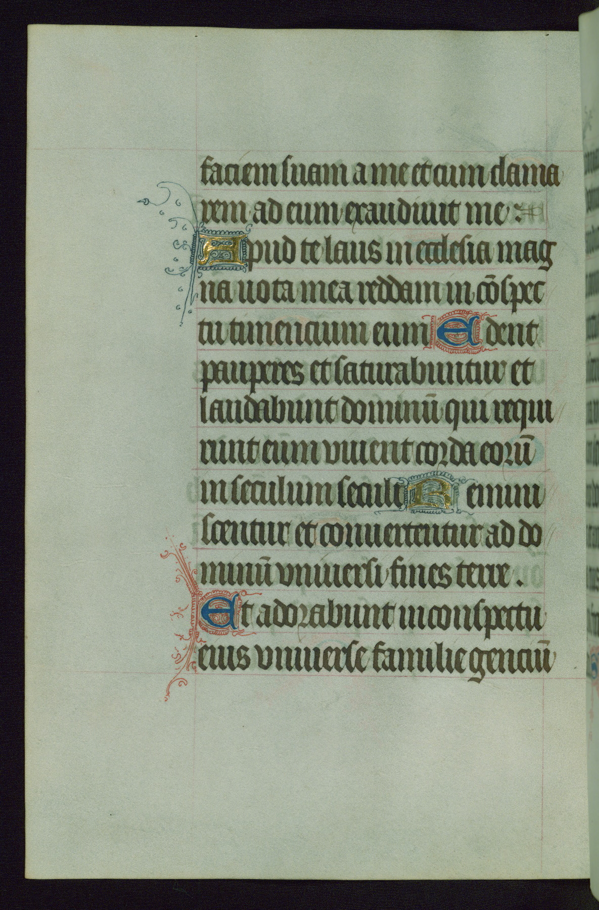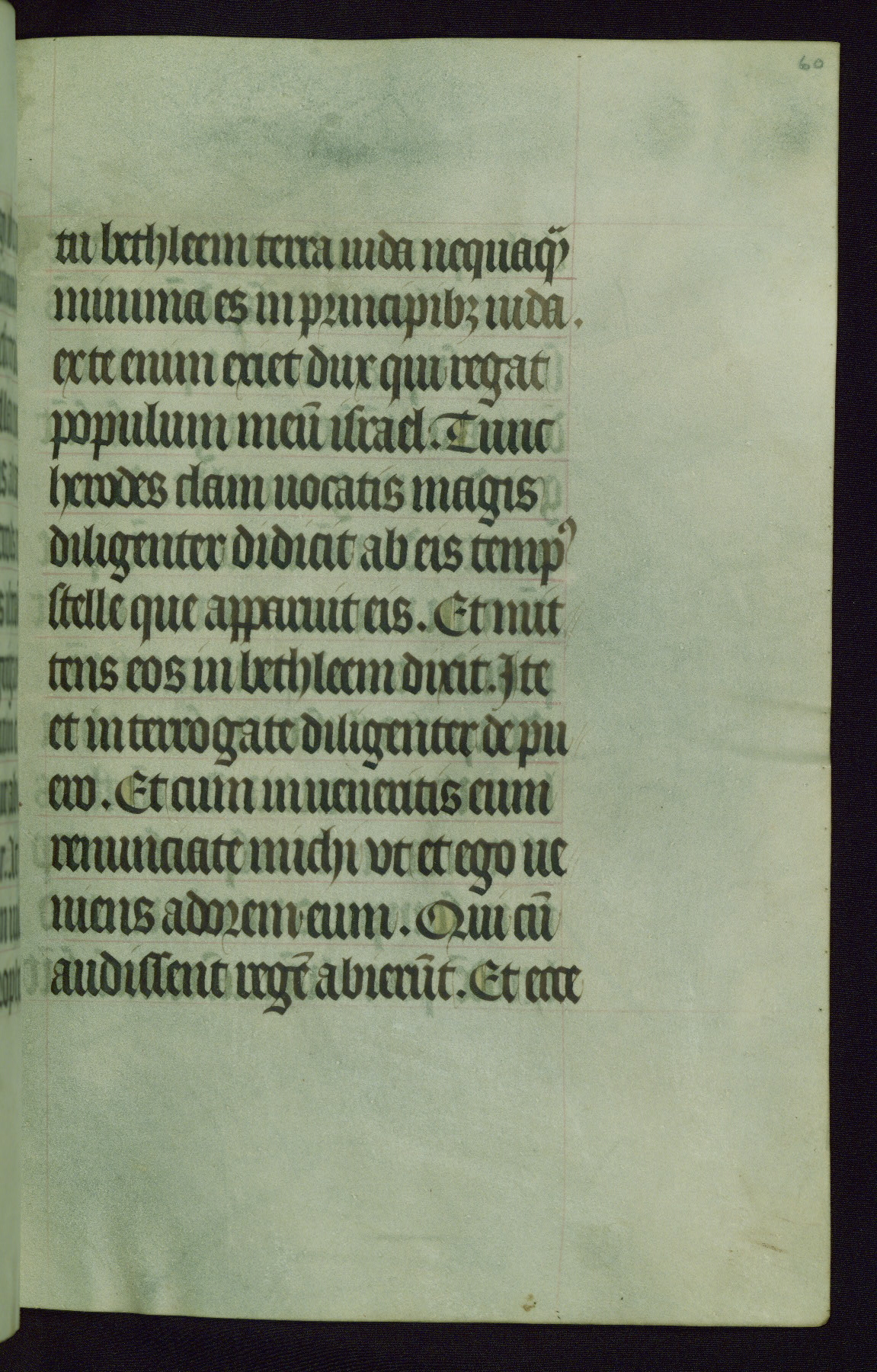 This Book of Hours, ca. 1460, was completed for use of Rome and illuminated under the influence, if not the direct participation, of Willem Vrelant. There remain twenty-two extant marginal calendar illustrations, thirteen extant full-page miniatures (many of which are paired with opening suffrages, perhaps suggesting a certain amount of significance to the owner), and one historiated initial. The contemporary binding, signed Livinus Stuaert, is dated 1477 and is most likely of Bruges or Ghent origin. It is thought that the first owner was French due to the French headings throughout and prominent fleur-de-lis figurations decorating the binding. Further, the first owner was likely female, suggested by the ways in which the book was structured to facilitate legibility. This is evinced by the large size of the script and the lack of abbreviations. While much of the text is standard, there remains evidence of personal significance and preference. This is seen in the chosen illuminations for those sections that are most significant to the owner. Most illuminations are paired with the opening page of staple Hours; however, many are accompanied by individual suffrages, constituting a large portion of the beginning of the manuscript. Personal preference is also shown in those sections of text that stray from the standard. The devotional sequence of this manuscript is notable for its sheer length and diversity of prayers as well as its inclusion of a French prayer not of official liturgy (fols. 215r-219v). The first collection of three prayers is headed and written in French. The prayer is attributed to St. Augustine and is described to guarantee a transformation of tribulation into joy through Christ's mercy, but only if the suppliant recites the prayer for thirty consecutive days. While it is not uncommon for evidence of an owner's predilections to surface in a Book of Hours, the particularly divergent features of this book allow readers to glean an intimate view of the patron.