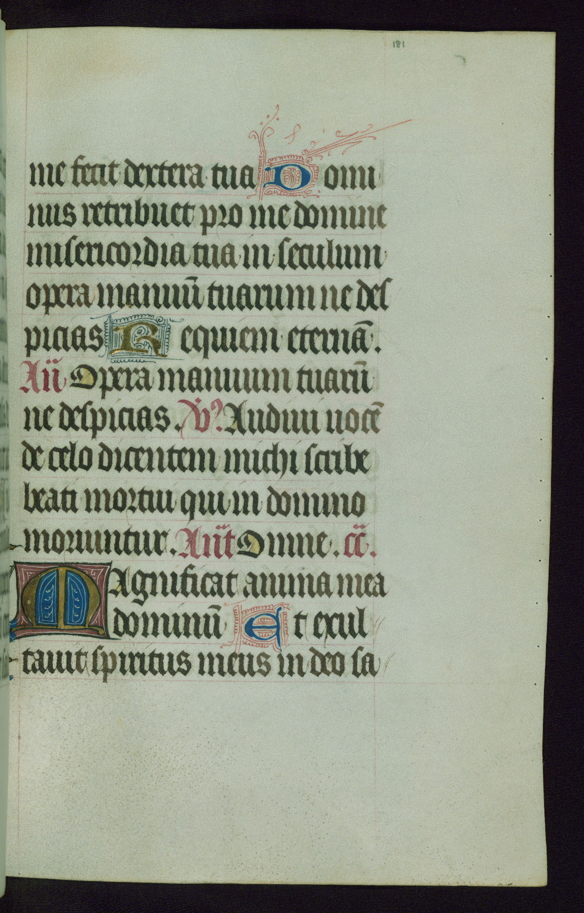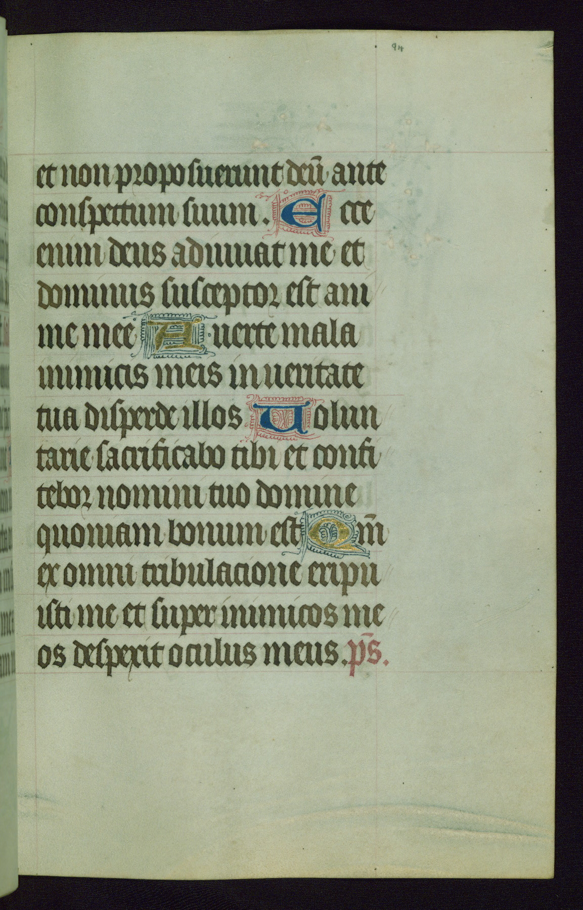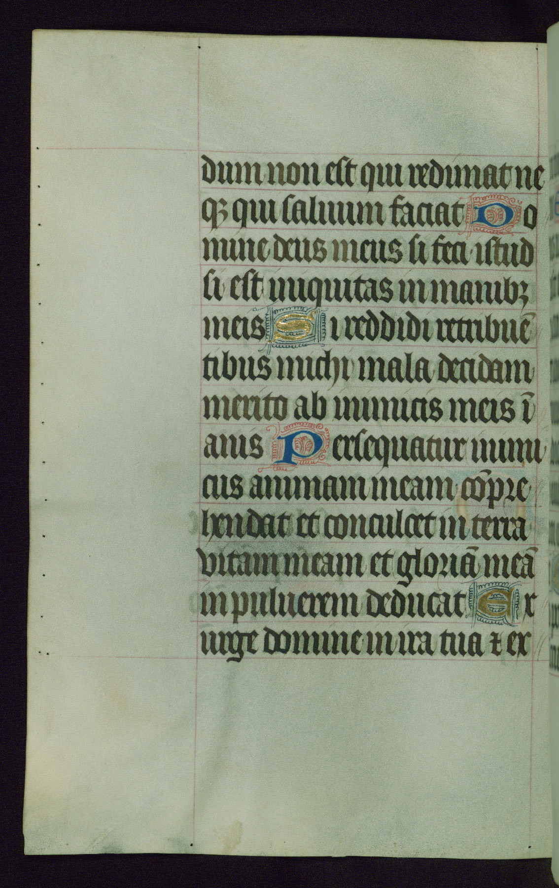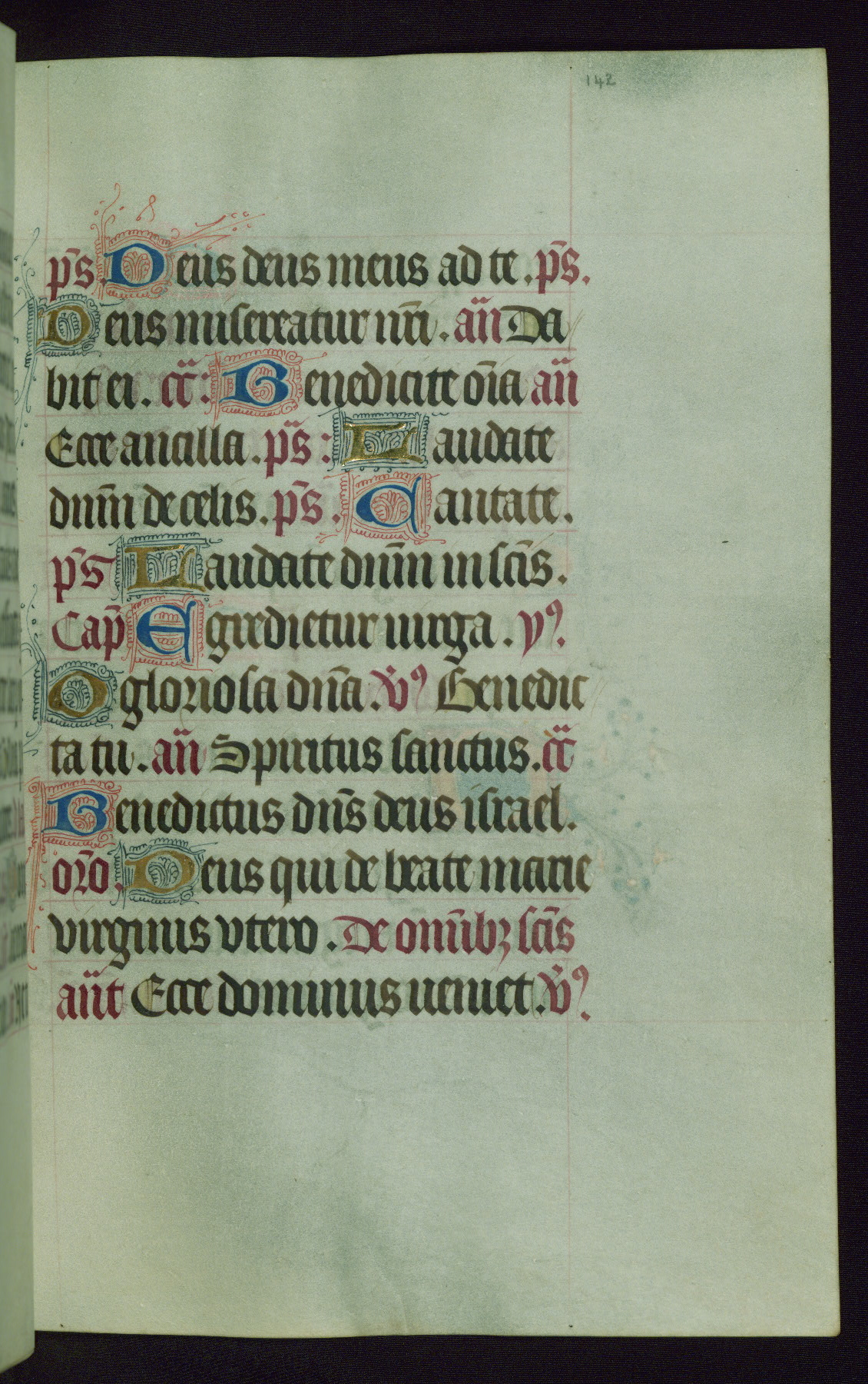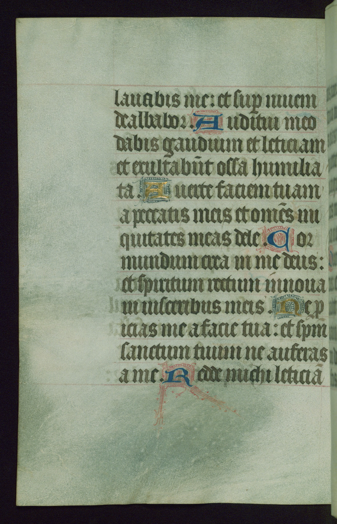 This Book of Hours, ca. 1460, was completed for use of Rome and illuminated under the influence, if not the direct participation, of Willem Vrelant. There remain twenty-two extant marginal calendar illustrations, thirteen extant full-page miniatures (many of which are paired with opening suffrages, perhaps suggesting a certain amount of significance to the owner), and one historiated initial. The contemporary binding, signed Livinus Stuaert, is dated 1477 and is most likely of Bruges or Ghent origin. It is thought that the first owner was French due to the French headings throughout and prominent fleur-de-lis figurations decorating the binding. Further, the first owner was likely female, suggested by the ways in which the book was structured to facilitate legibility. This is evinced by the large size of the script and the lack of abbreviations. While much of the text is standard, there remains evidence of personal significance and preference. This is seen in the chosen illuminations for those sections that are most significant to the owner. Most illuminations are paired with the opening page of staple Hours; however, many are accompanied by individual suffrages, constituting a large portion of the beginning of the manuscript. Personal preference is also shown in those sections of text that stray from the standard. The devotional sequence of this manuscript is notable for its sheer length and diversity of prayers as well as its inclusion of a French prayer not of official liturgy (fols. 215r-219v). The first collection of three prayers is headed and written in French. The prayer is attributed to St. Augustine and is described to guarantee a transformation of tribulation into joy through Christ's mercy, but only if the suppliant recites the prayer for thirty consecutive days. While it is not uncommon for evidence of an owner's predilections to surface in a Book of Hours, the particularly divergent features of this book allow readers to glean an intimate view of the patron.