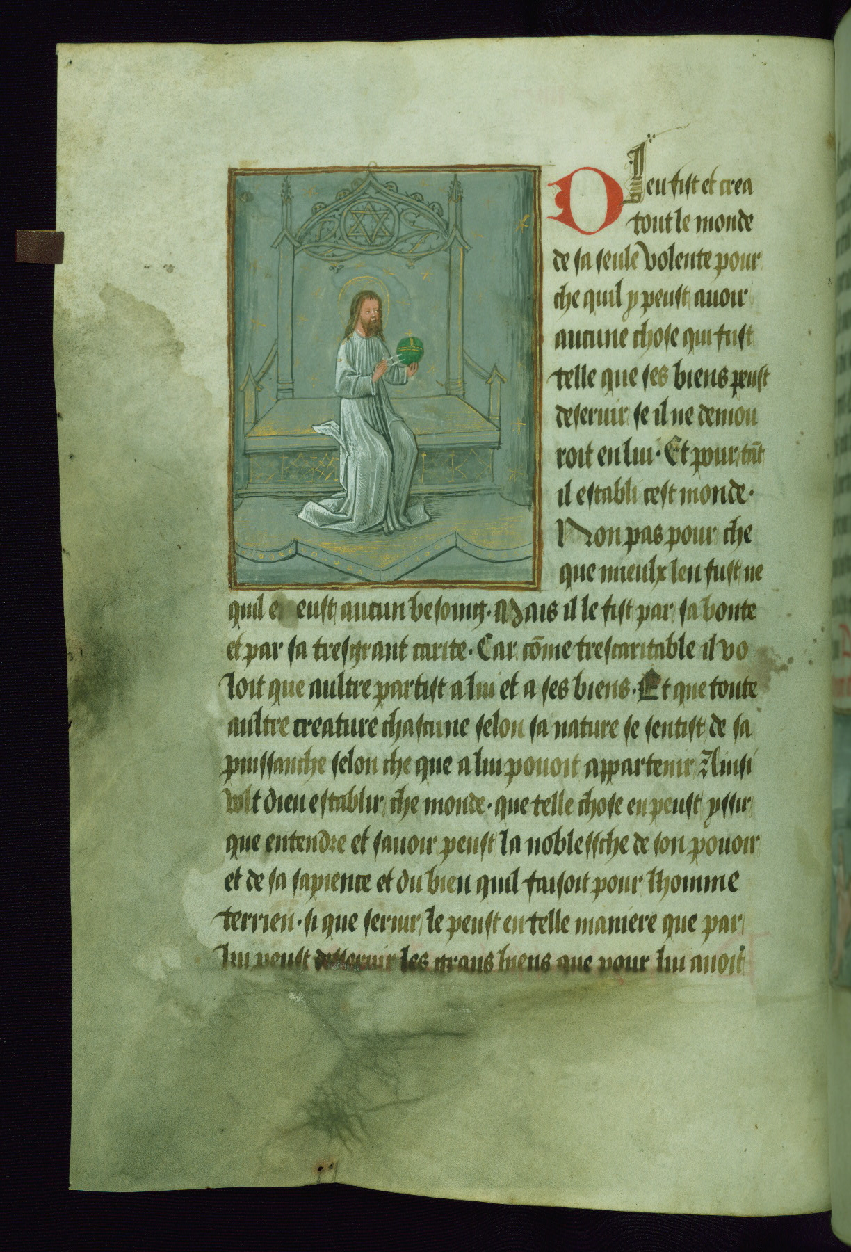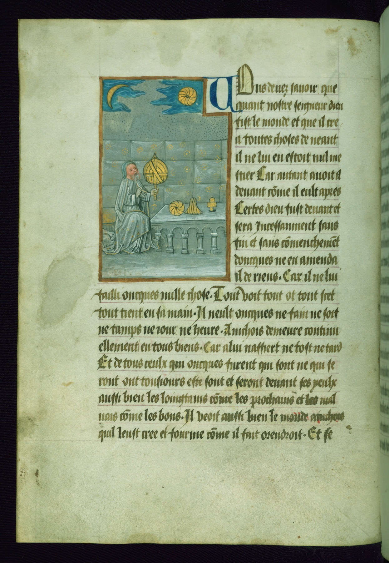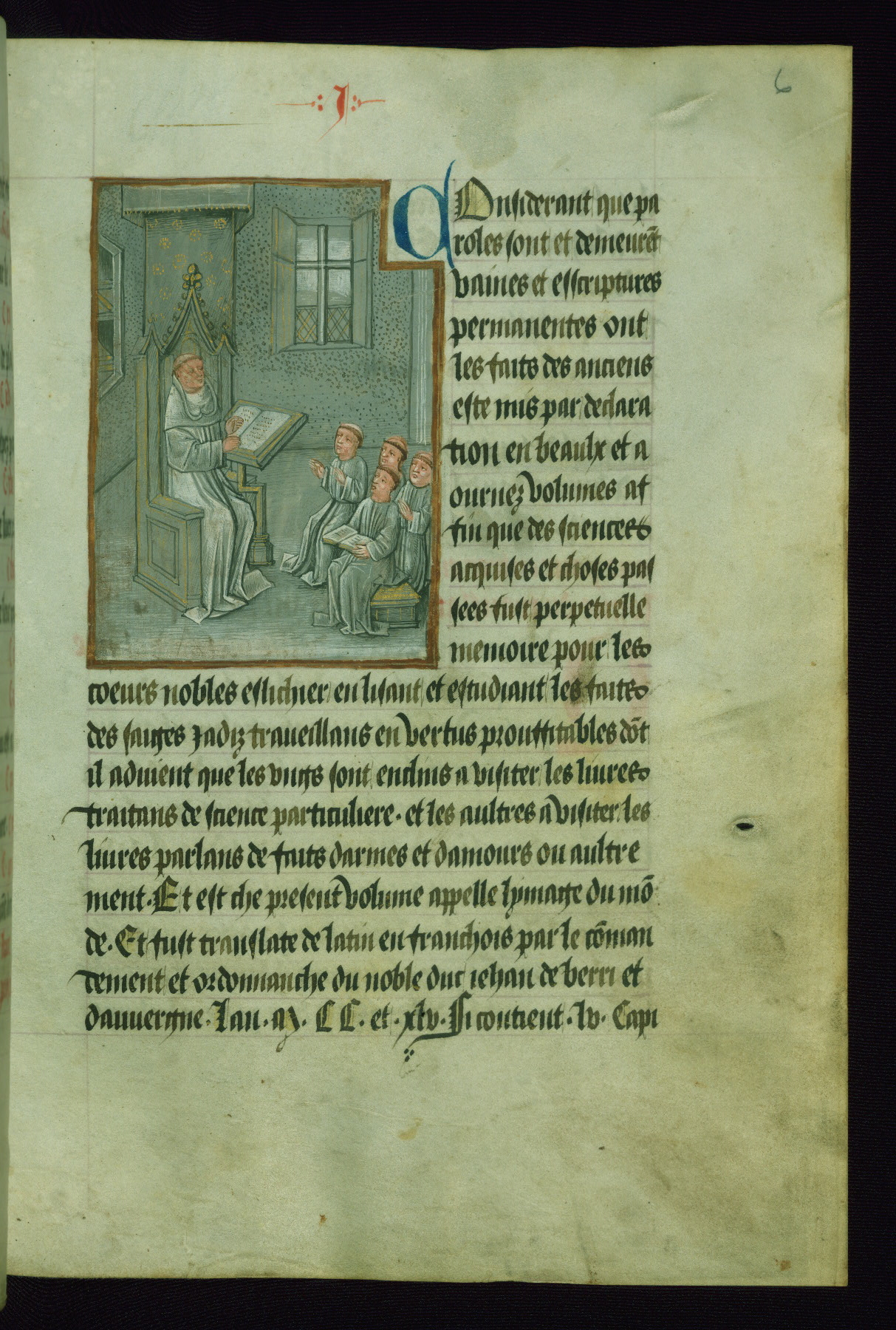 - Contents: Fol. 6r-v: Prologues of the translator: the first prologue declares that the book is a French translation entitled "ymage du monde" from the Latin text commissioned in 1245 by John, duke of Berry and Auvergne; fol. 6v explains that the organization of the text was accomplished in Bruges in 1464 ("MCCCC.lxiiii" with the second and last "C" erased, giving as apparent date "MCC.lxiiii")