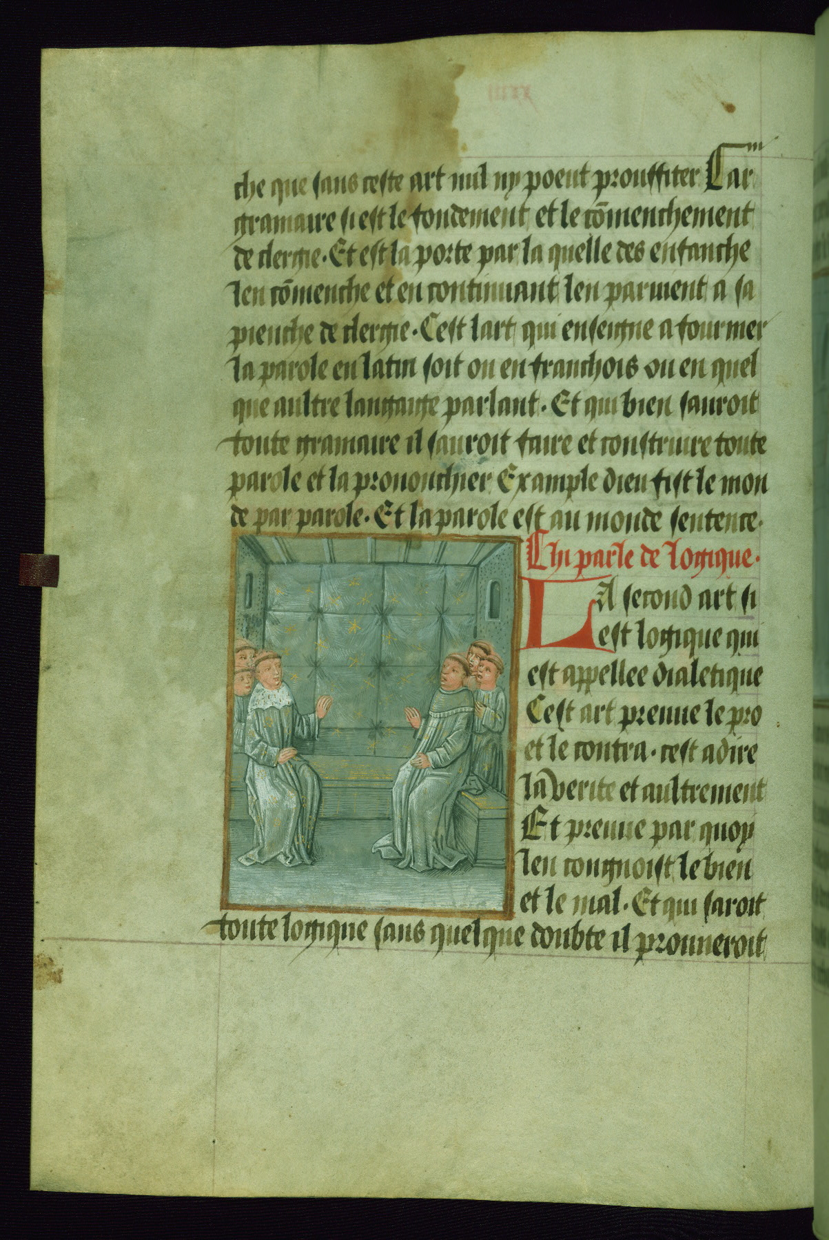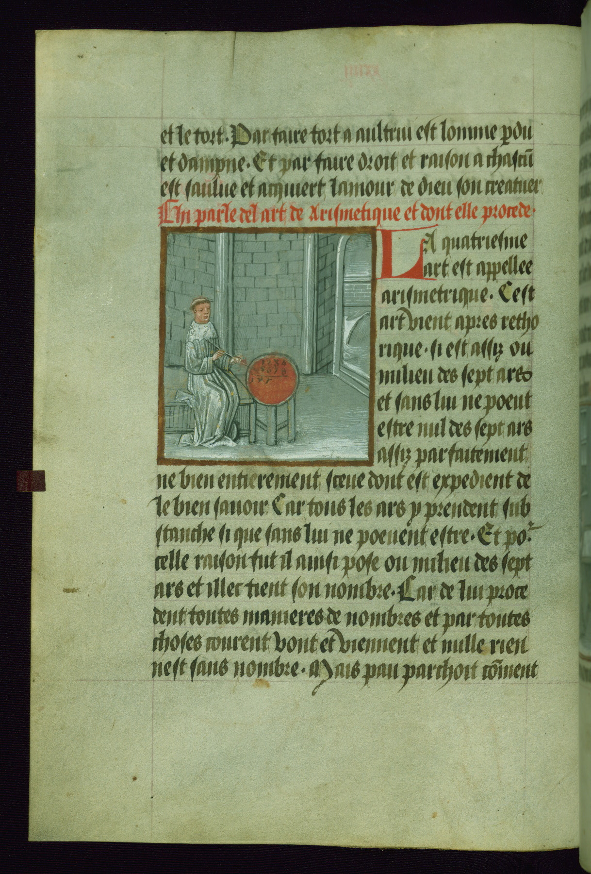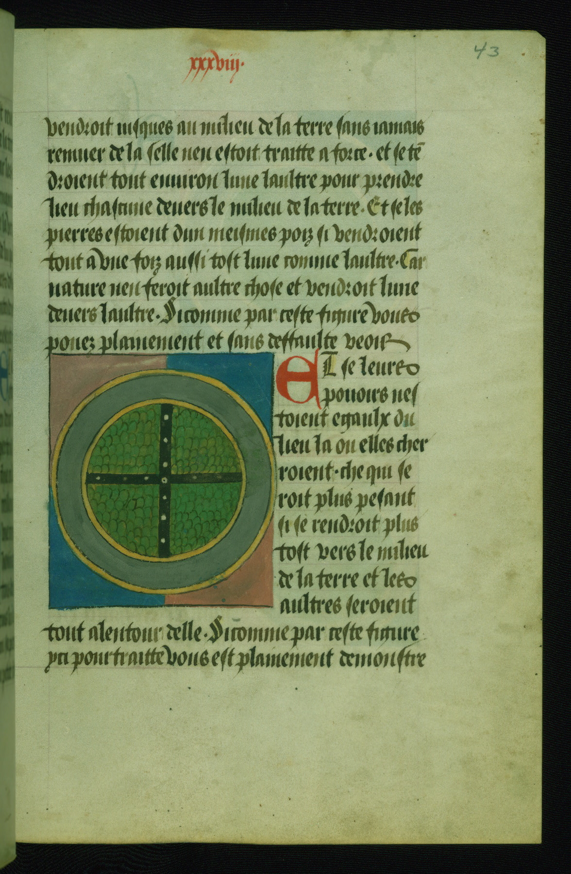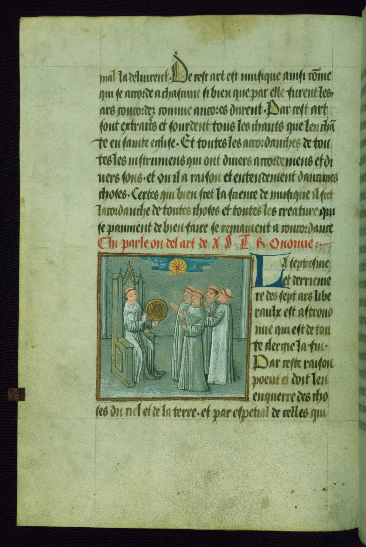 - Decoration note: One full-page illumination; 11 smaller figural miniatures in grisaille; 27 polychrome scientific diagrams; blue or red initials (2-6 lines) mark the major and minor divisions of the text; rubrics in red, text in dark brown ink