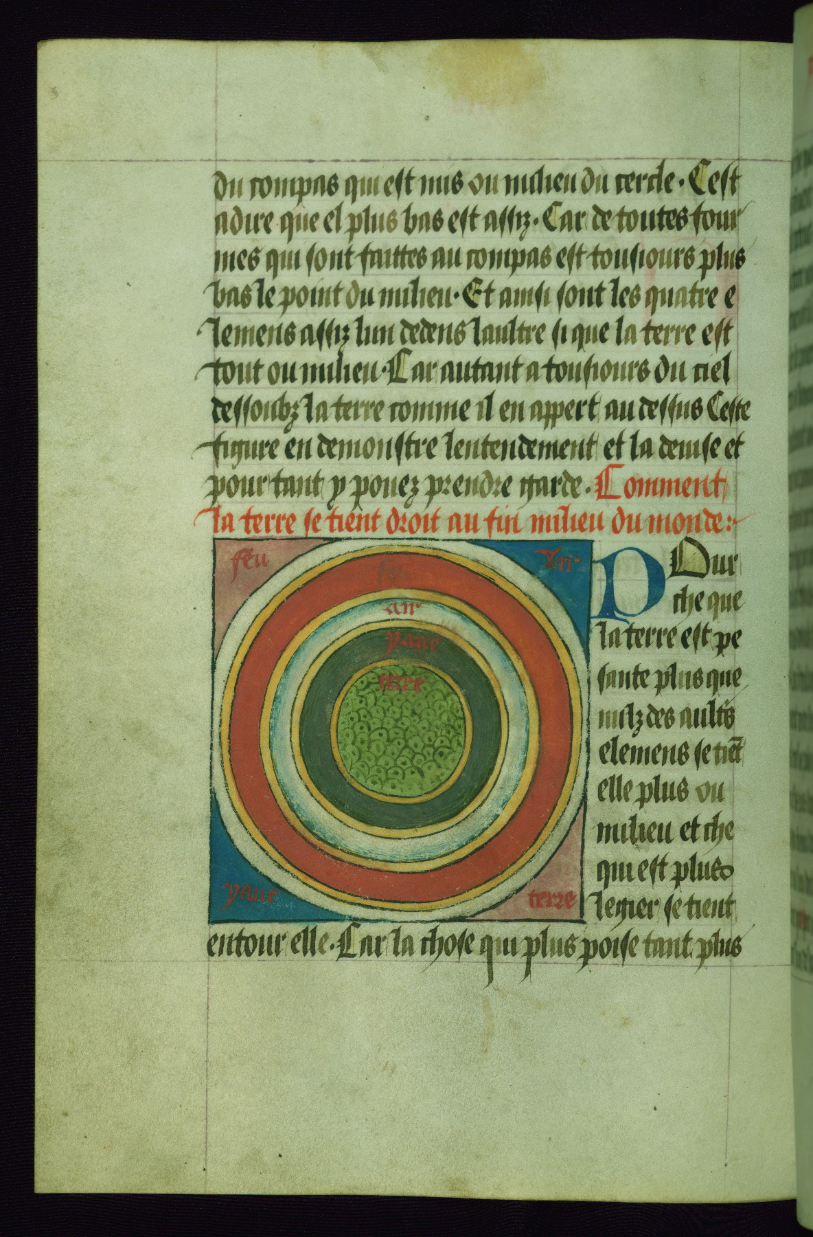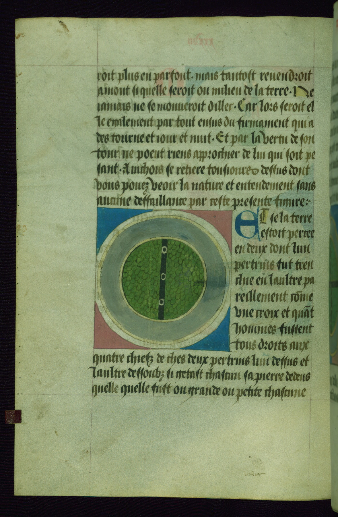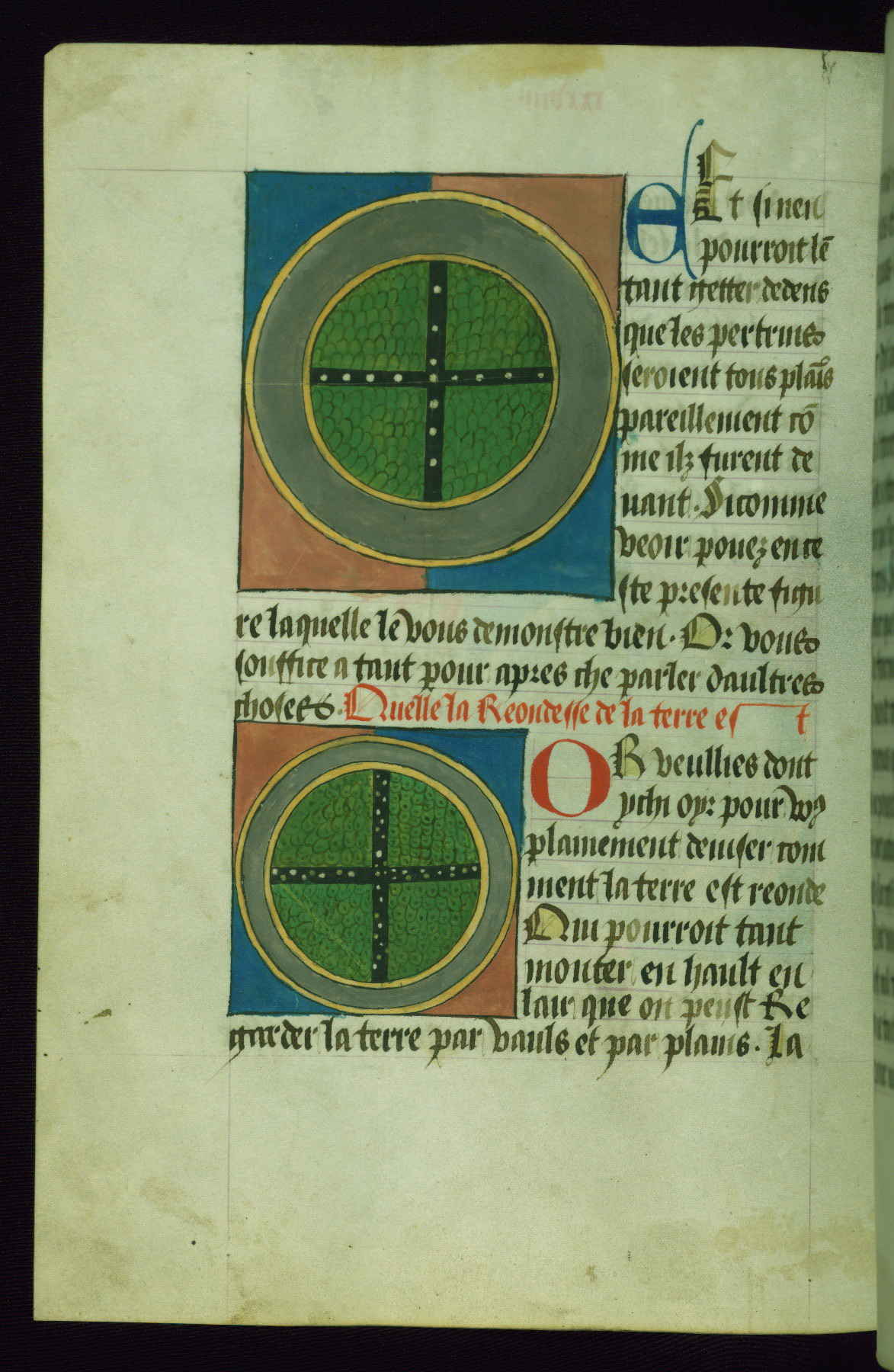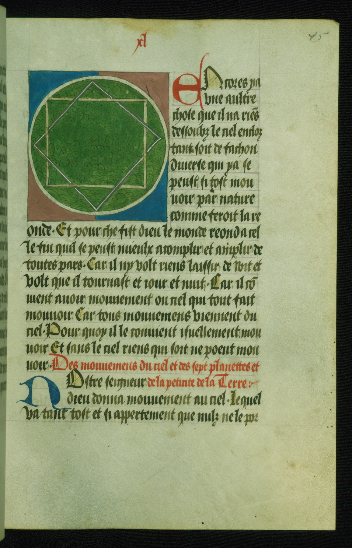 - Rubric: Fol. 46v: Chi commenche la seconde partie de che present liure Et declaire comment la terre est devisee et quelle part elle poeut estre habitee.