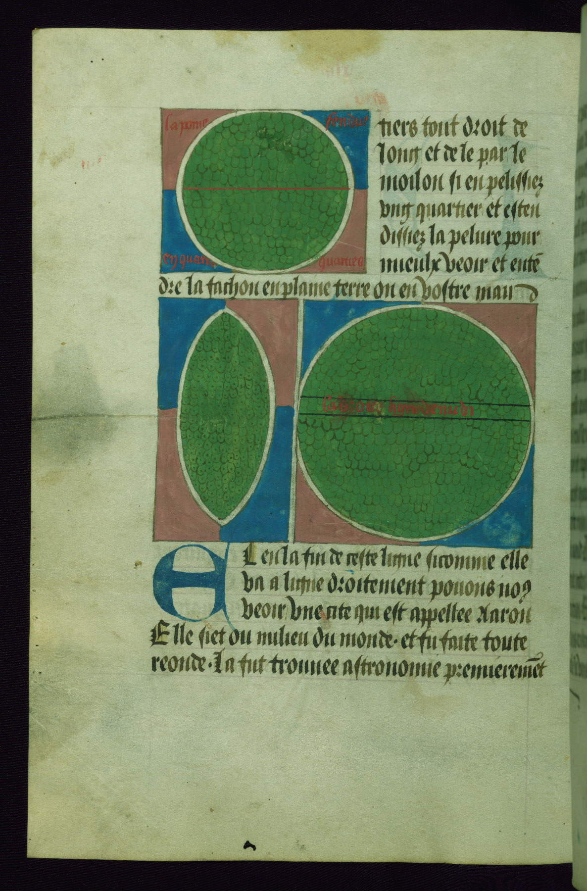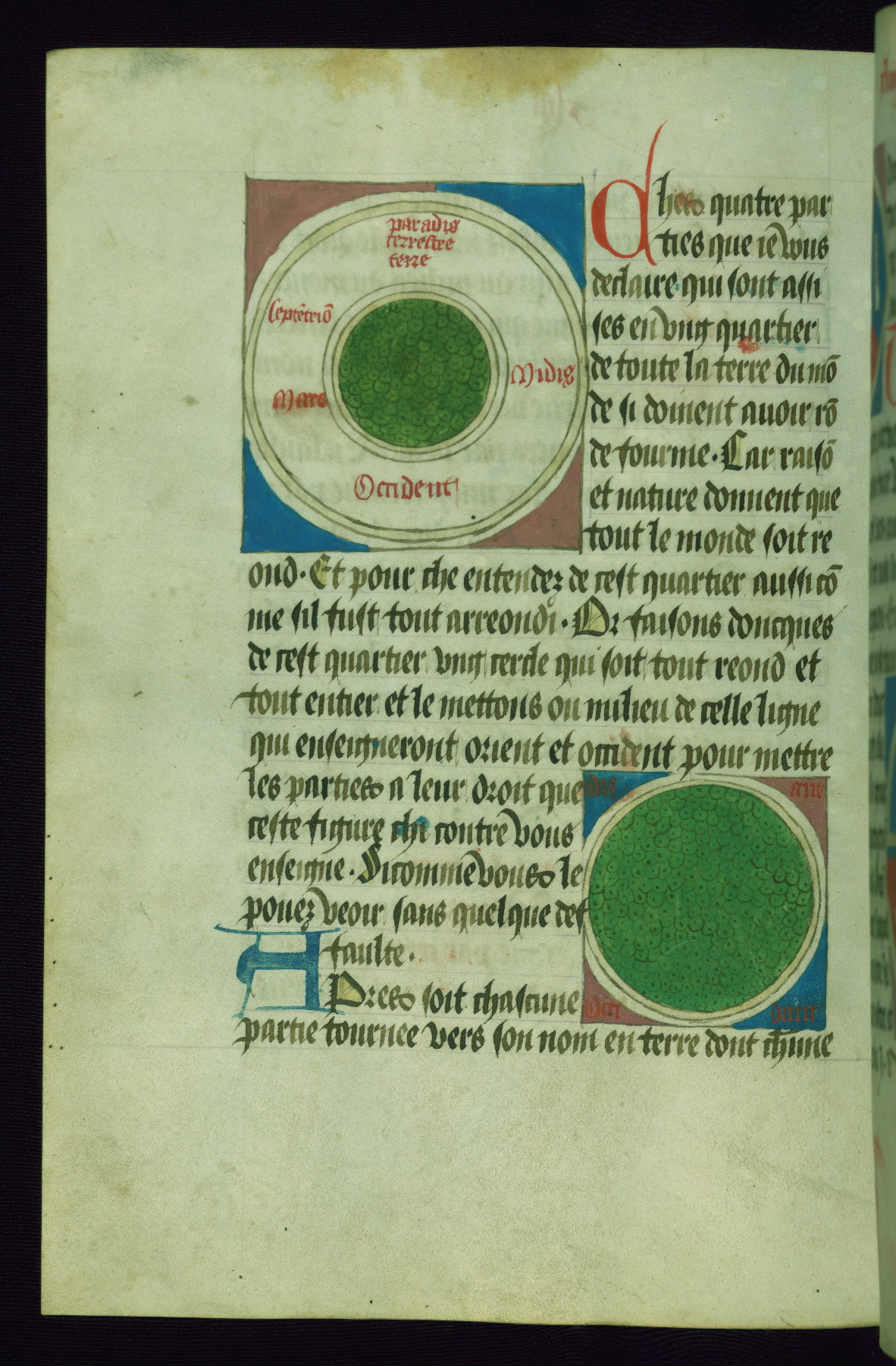 The diagram at the top left has inscriptions from center top clockwise: "Orians / Mars / Occidant"; the diagram below has a blue top half of the earth labeled: "Ayse le grant" at the center and "Oriant" below at the left; the lower half of the earth is divided into red and pink quadrants, respectively labeled: "Septentr[i]on" and "Midi"
