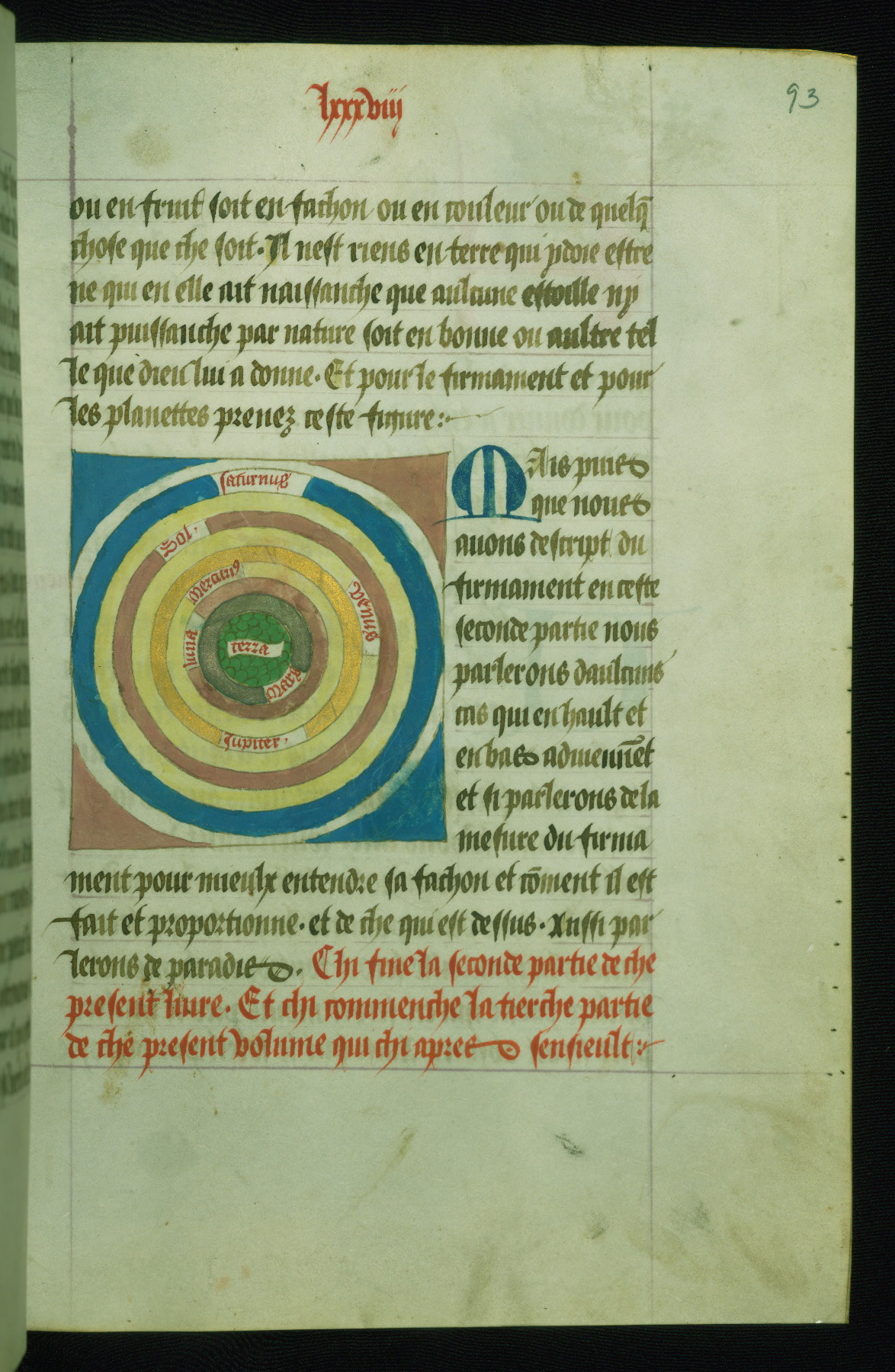 - Rubric: Fol. 93r: Chi fine la seconde partie de che present liure. Et chi commenche la tierche partie de che present volume qui chy apres sinsieult.