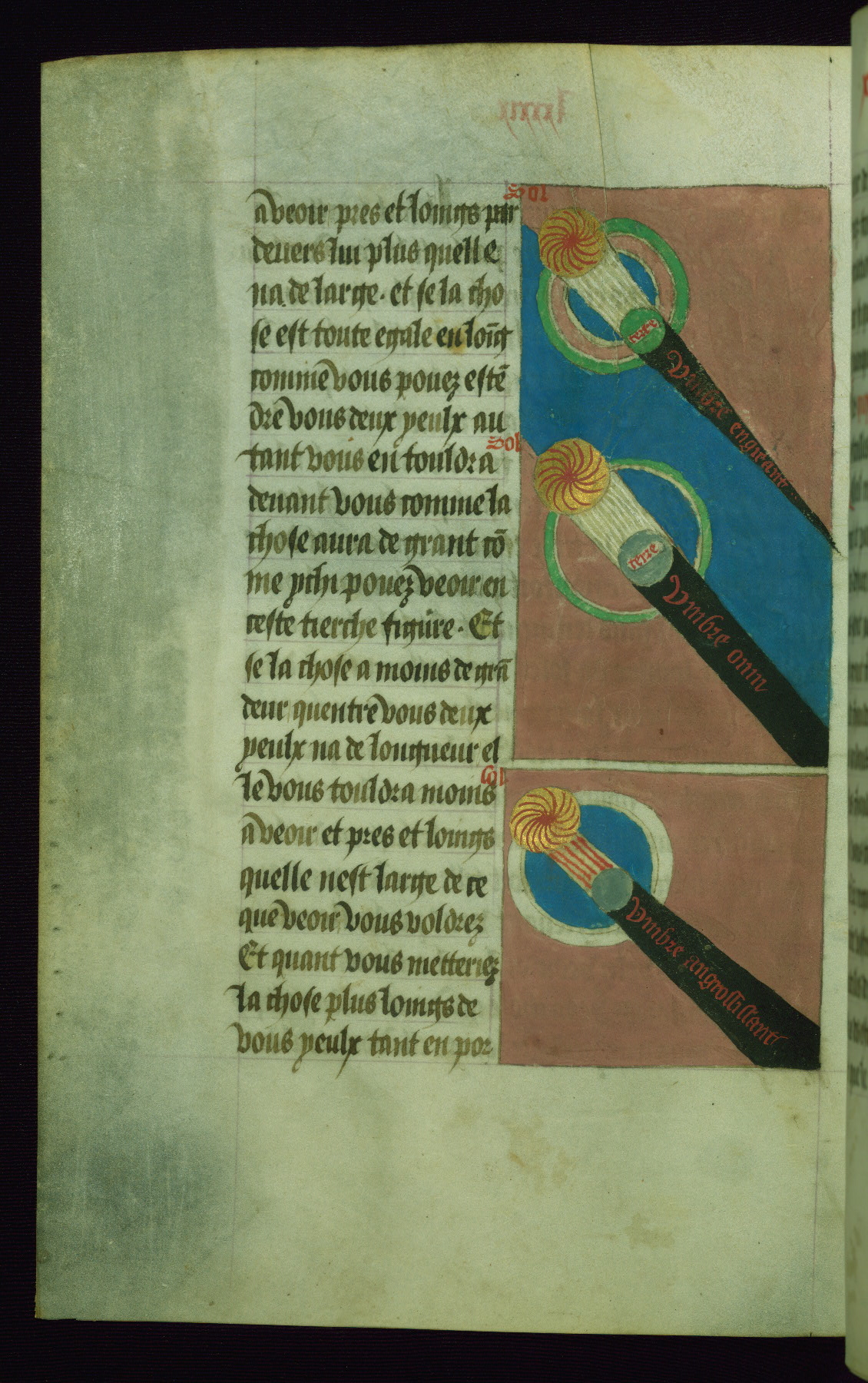 Basic components are a gold sun at top left labeled "Sol", a white area, a small earth labeled "Terra", and a black band of cast shadow. The three shadows are inscribed (from top down): "umbre engreant / umbre omn? / umbre angrossissant"