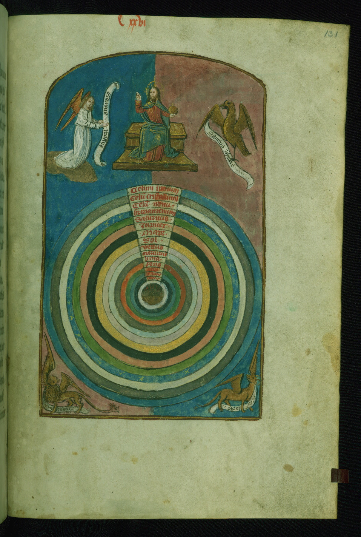 - Label: Concentric spheres of the universe labeled from the center to the top: "Terre," "Yaue," "Air," "Feus," "Luna," "Mercurius," "Venus," "Sol," "Mars," "Jupiter," "Saturnus," "Firmamentum," "Celum nonu[m]," "Celum cristallinum," "Celum imperium"; names of the Evangelists are inscribed on the scrolls held by the symbols
