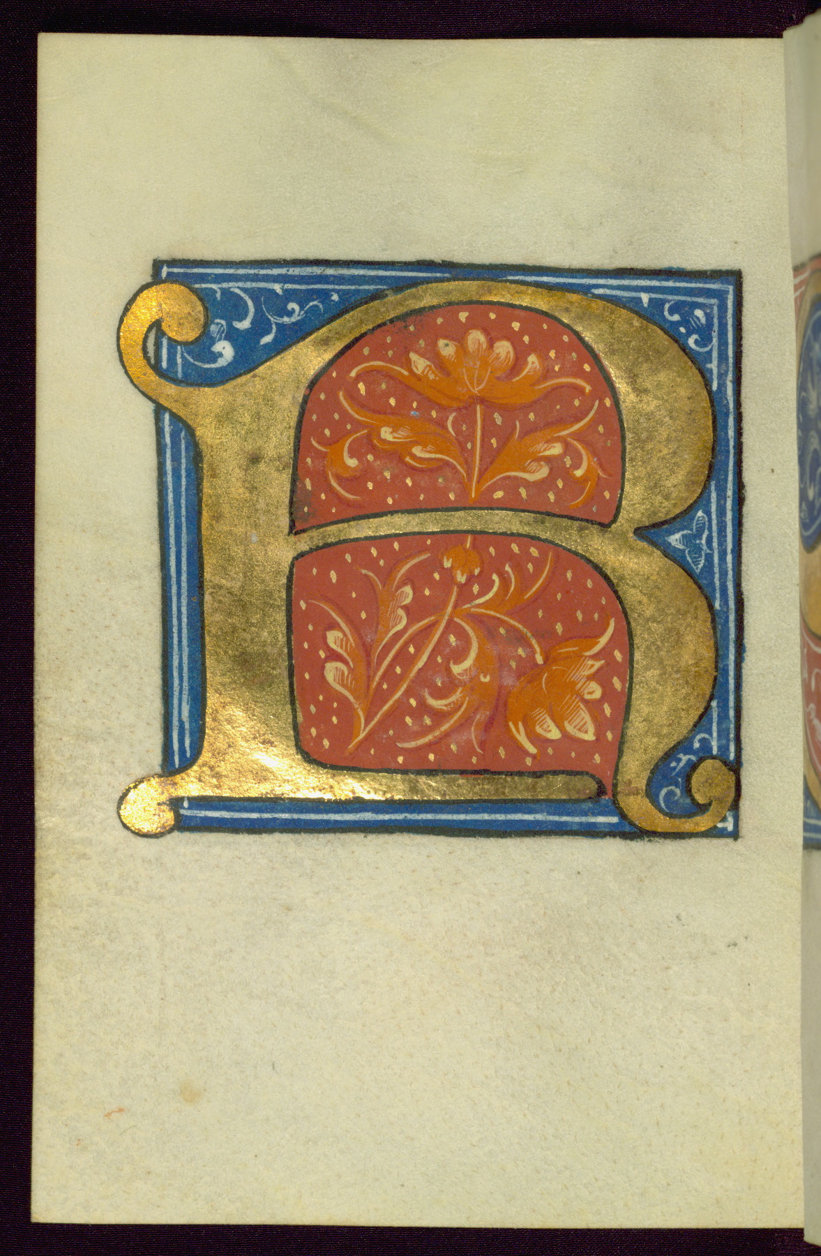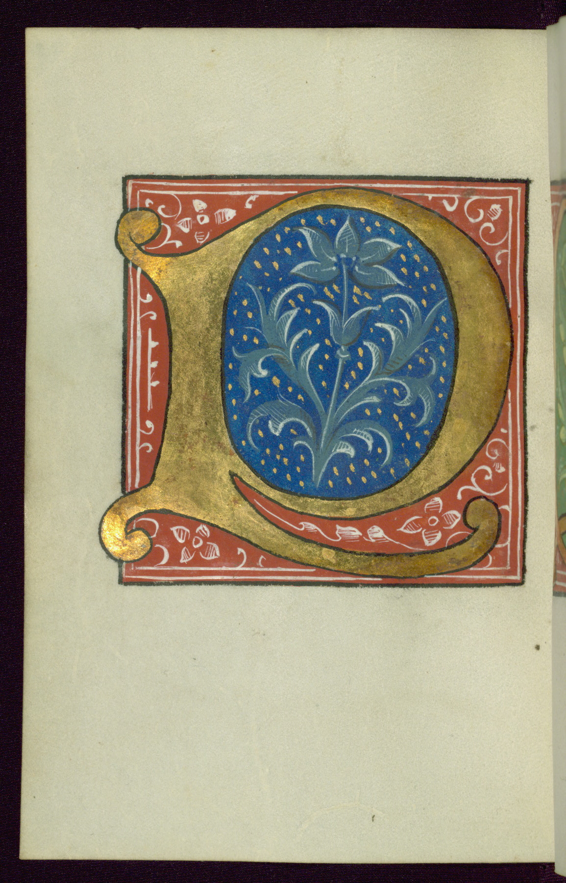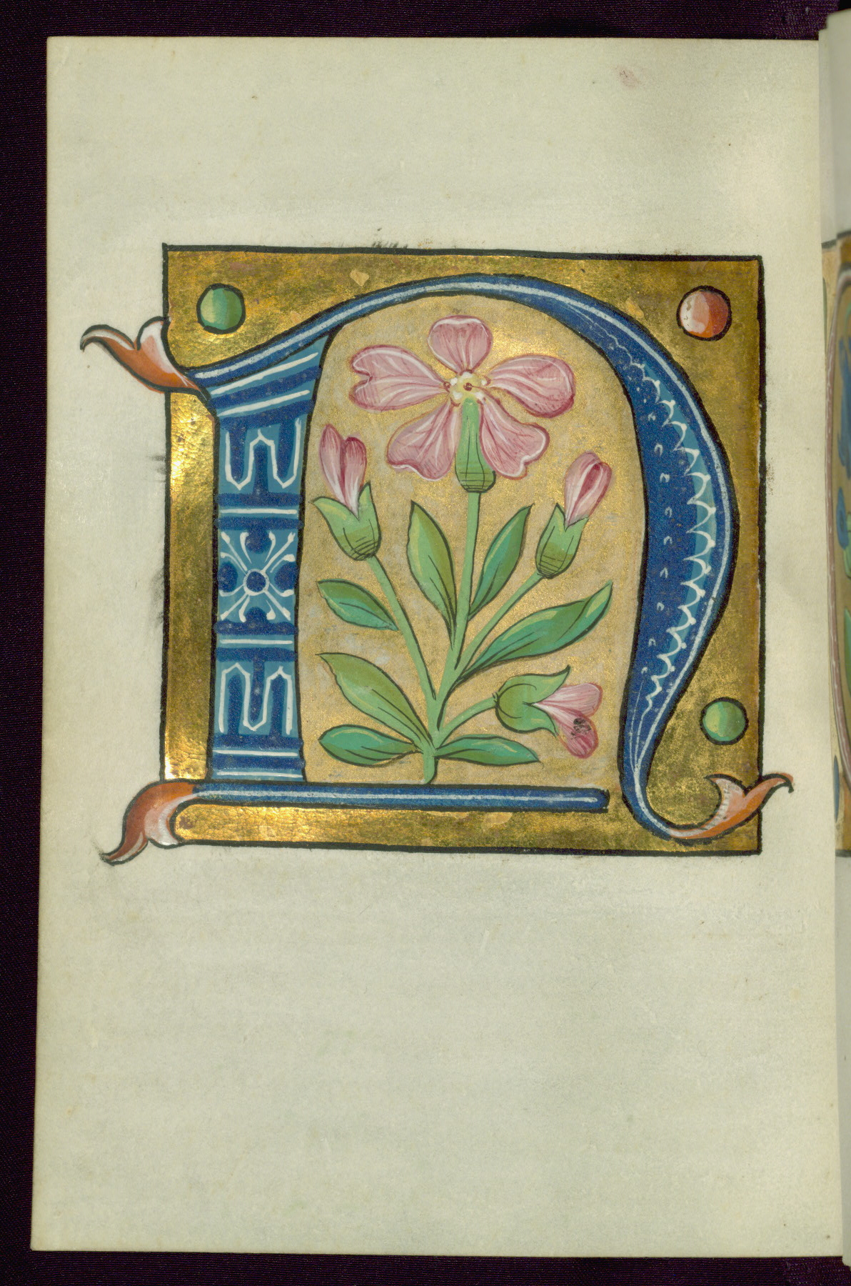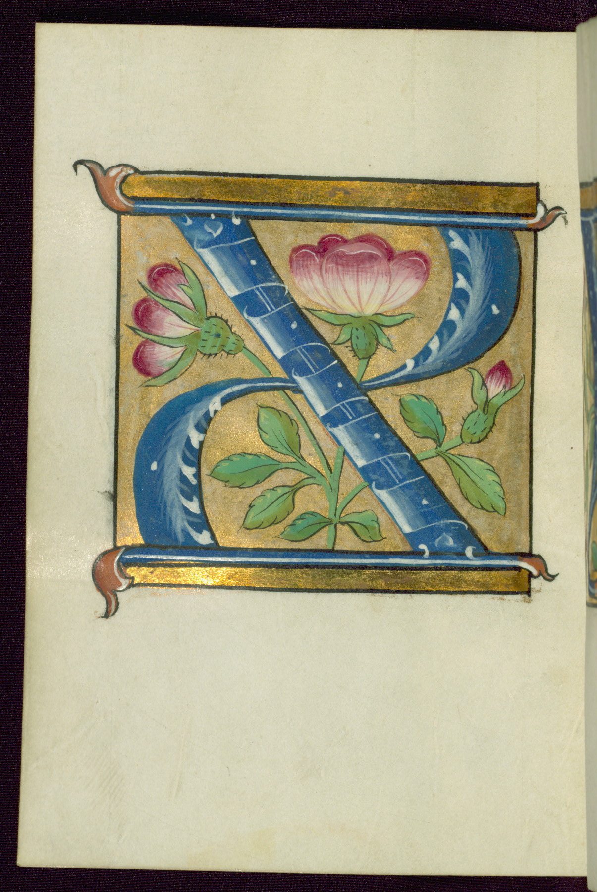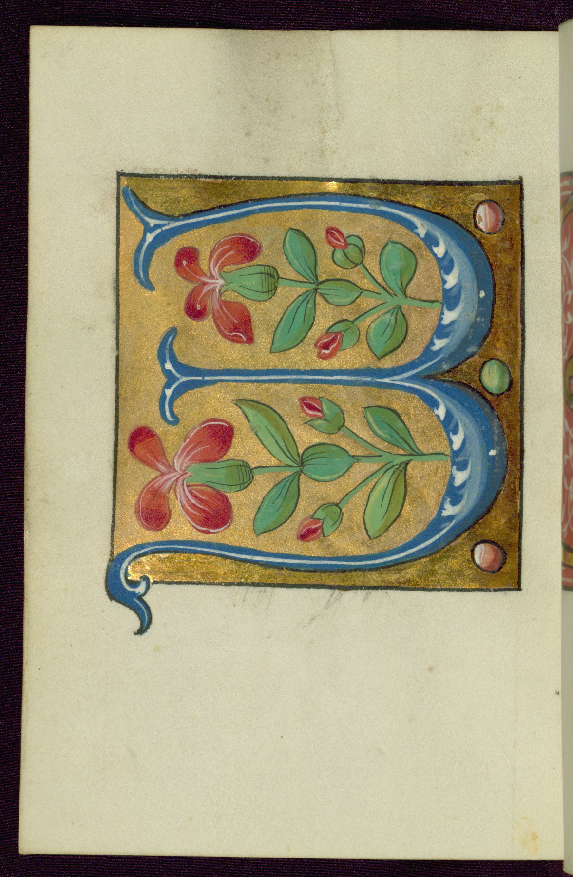 - Decoration note: Twenty-four illuminated letters of the medieval alphabet (excludes J and V) in two alternating styles; Style 1: found on fols. 7v-8r, 9v-10r, etc.; stylistically tied to French 16th century illuminations; blue or rose initials with white patterning, ending in blue, orange, or rose foliate terminals, outlined in black, on black-outlined backgrounds of burnished and/or liquid gold, two or four green disks in corners of the background, infill of naturalistic flowers and fruits; Style 2: found on fols. 8v-9r, 10v-11r, etc.; stylistically tied to Dutch 15th century initials; burnished gold intials with lobed terminals, outlined in black, backgrounds in blue and deep red with white foliate patterning, floral motifs in some infills with lead tin yellow and malachite green detailing; Impression from a rectangular plaque in the front endleaves, showing a seated nimbed figure, possibly the Virgin Mary and Christ child