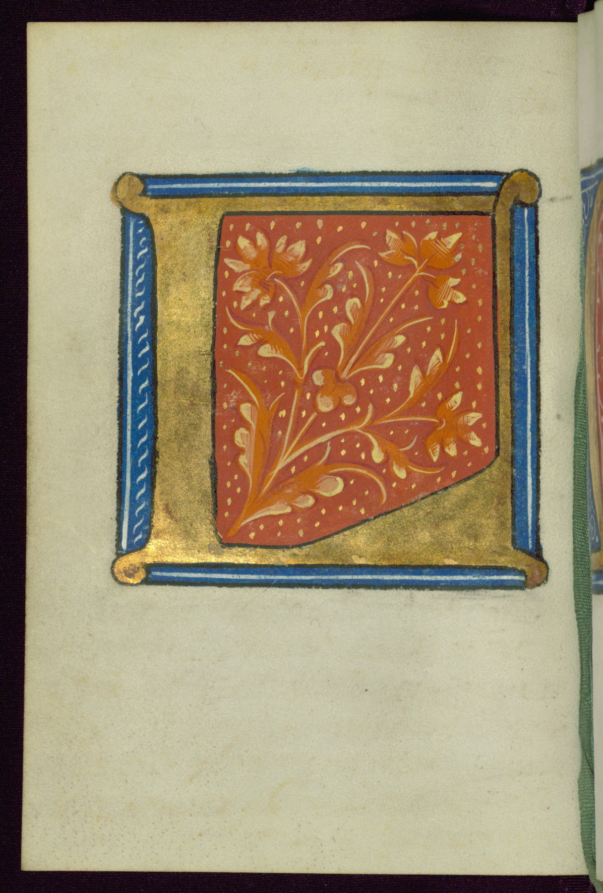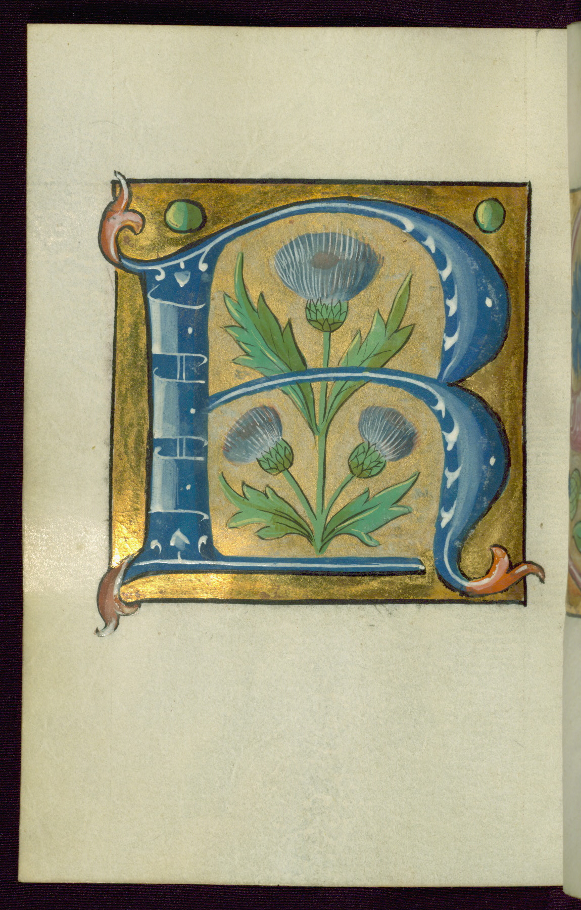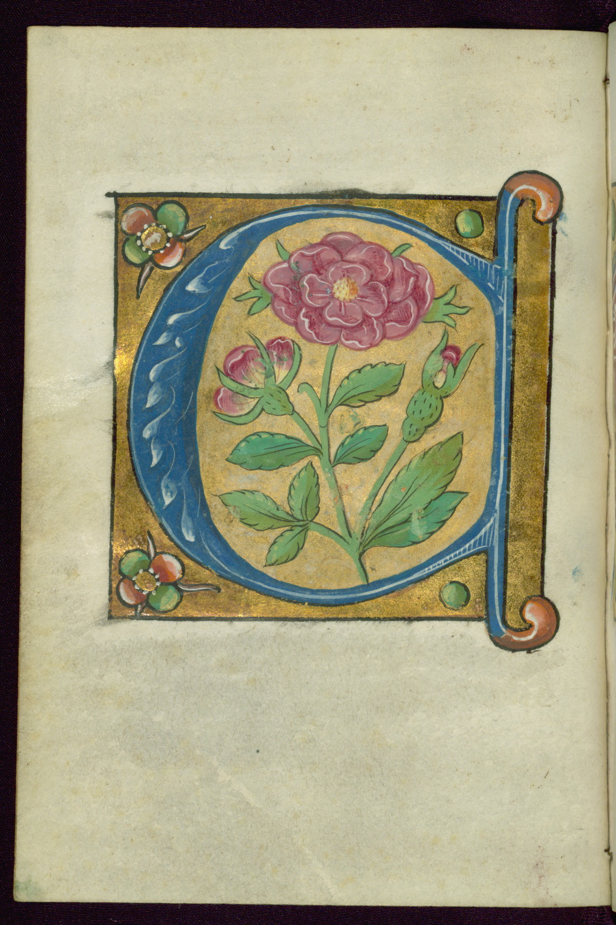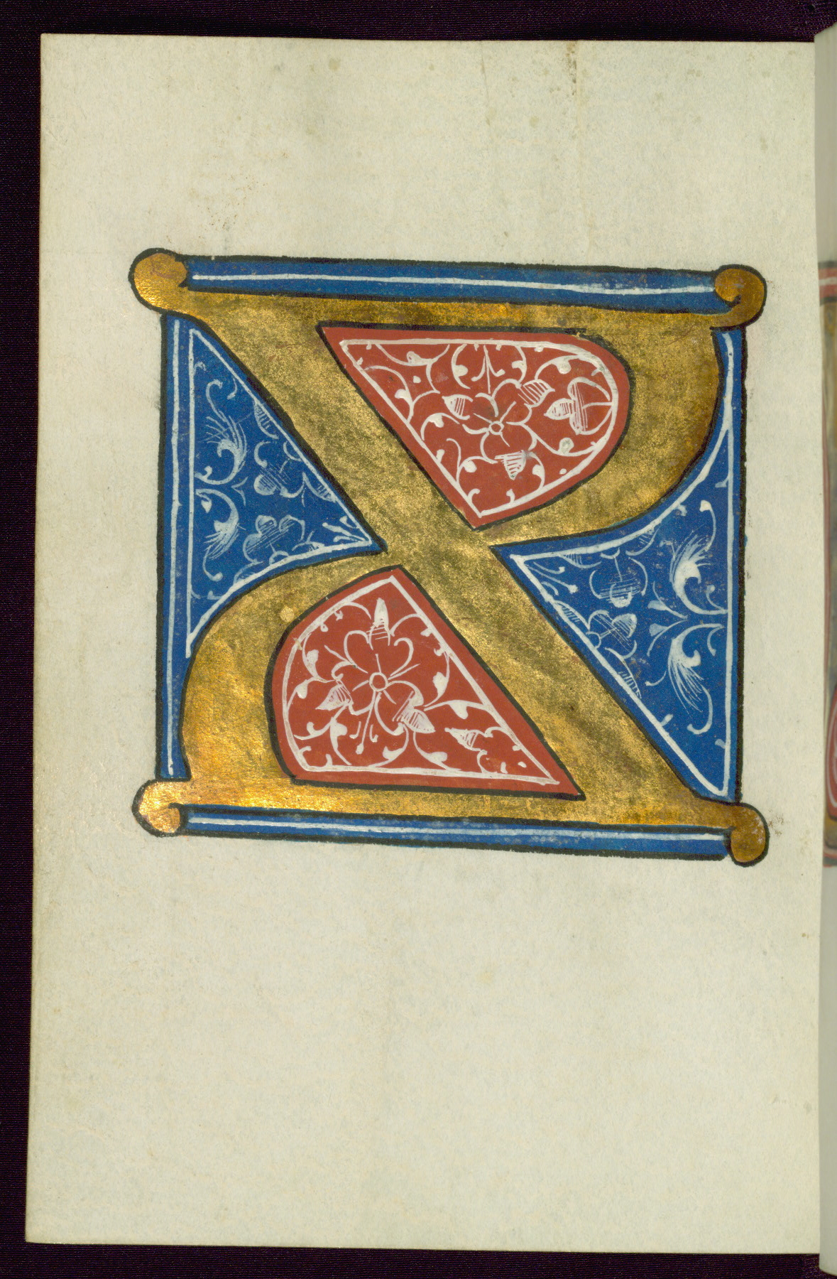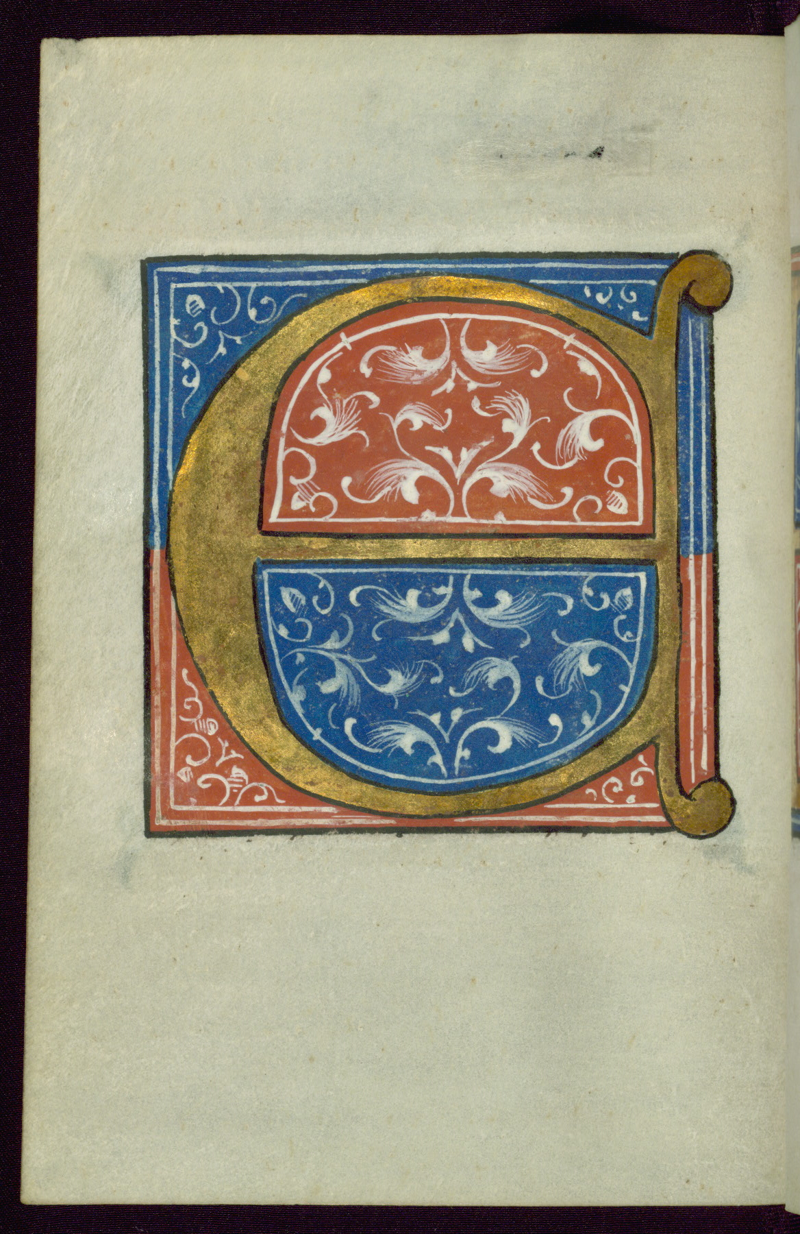 - Decoration note: Twenty-four illuminated letters of the medieval alphabet (excludes J and V) in two alternating styles; Style 1: found on fols. 7v-8r, 9v-10r, etc.; stylistically tied to French 16th century illuminations; blue or rose initials with white patterning, ending in blue, orange, or rose foliate terminals, outlined in black, on black-outlined backgrounds of burnished and/or liquid gold, two or four green disks in corners of the background, infill of naturalistic flowers and fruits; Style 2: found on fols. 8v-9r, 10v-11r, etc.; stylistically tied to Dutch 15th century initials; burnished gold intials with lobed terminals, outlined in black, backgrounds in blue and deep red with white foliate patterning, floral motifs in some infills with lead tin yellow and malachite green detailing; Impression from a rectangular plaque in the front endleaves, showing a seated nimbed figure, possibly the Virgin Mary and Christ child