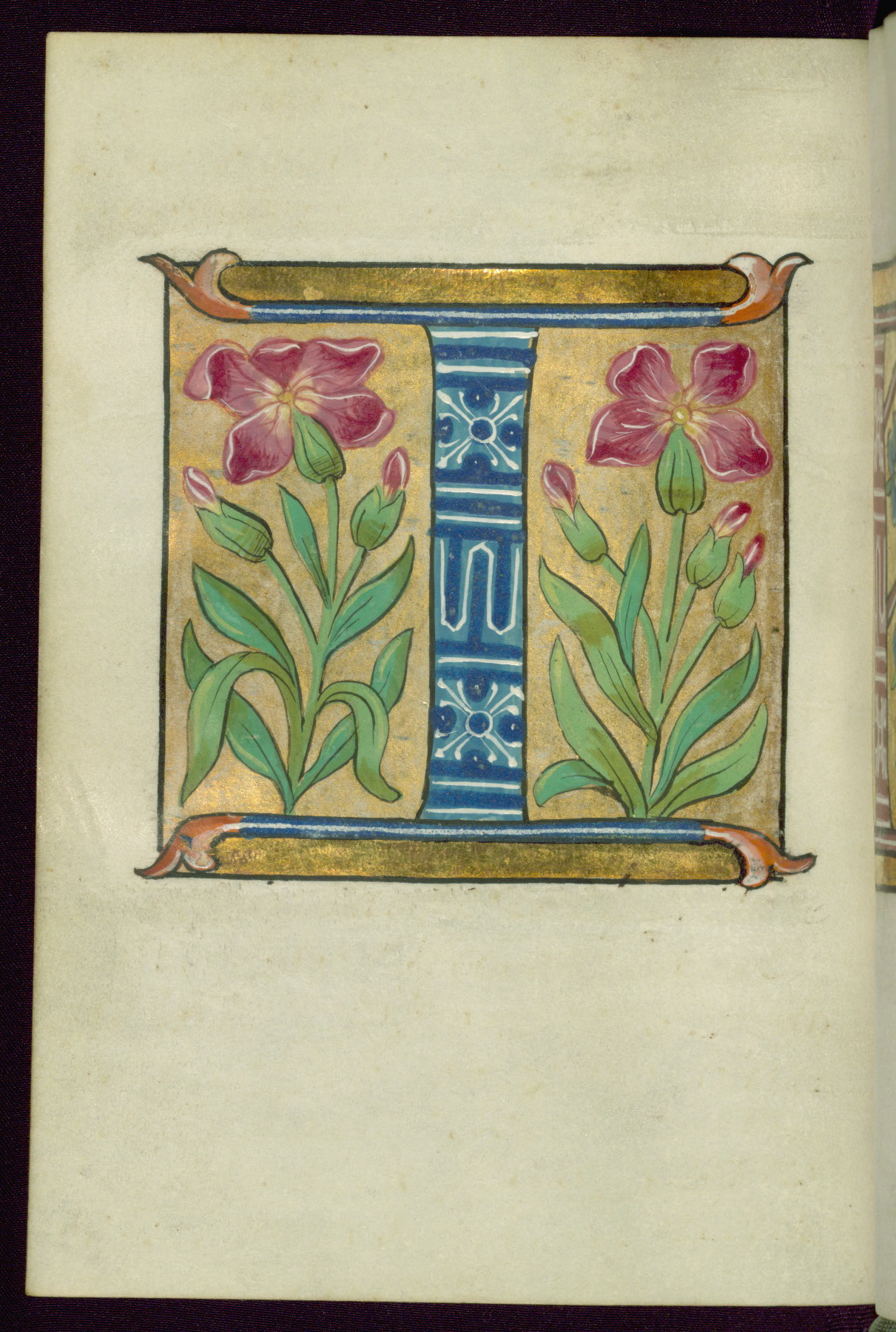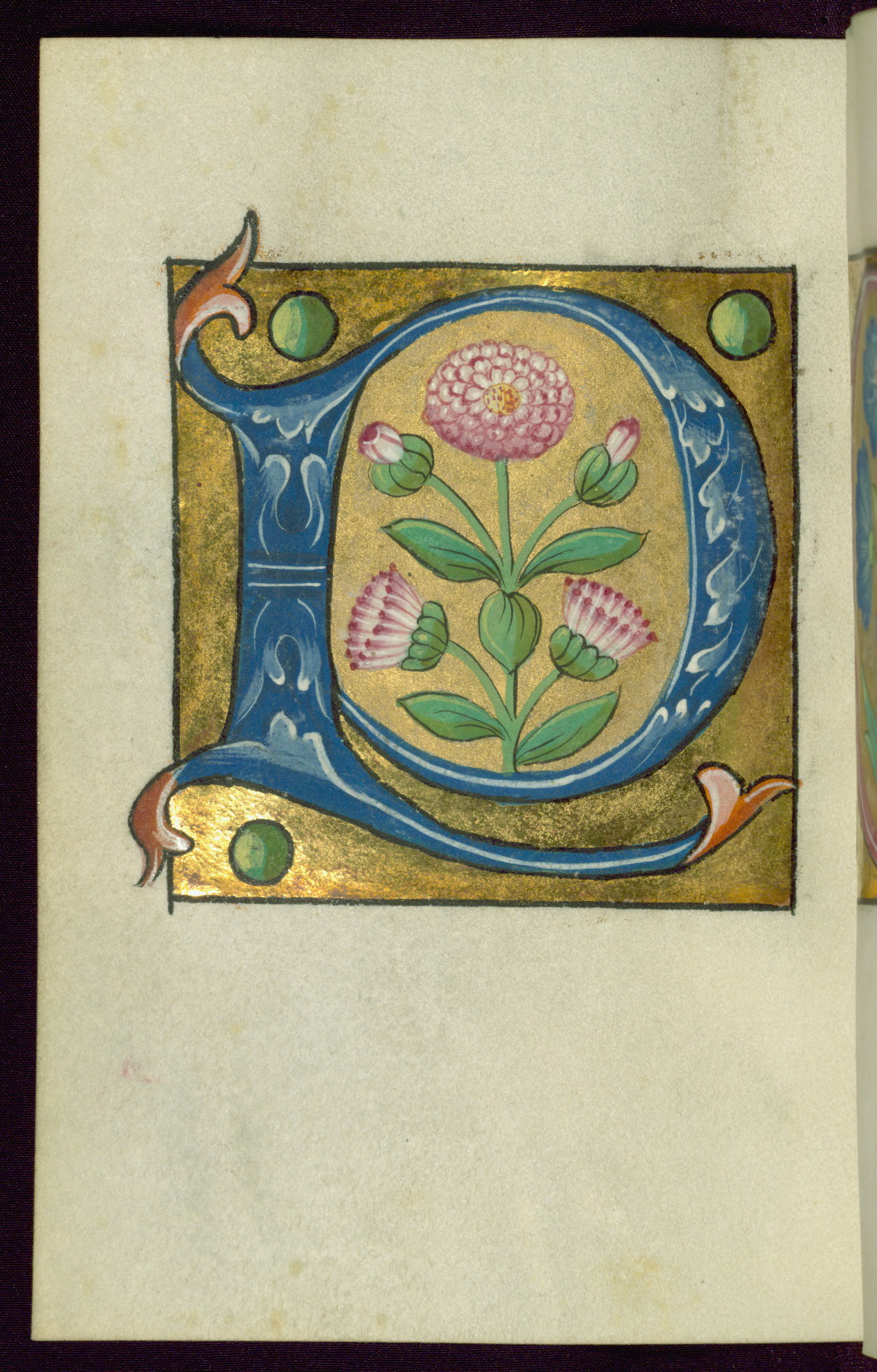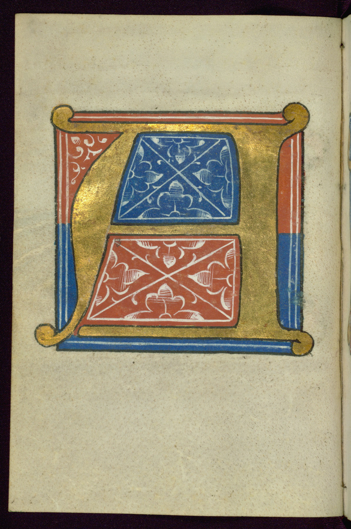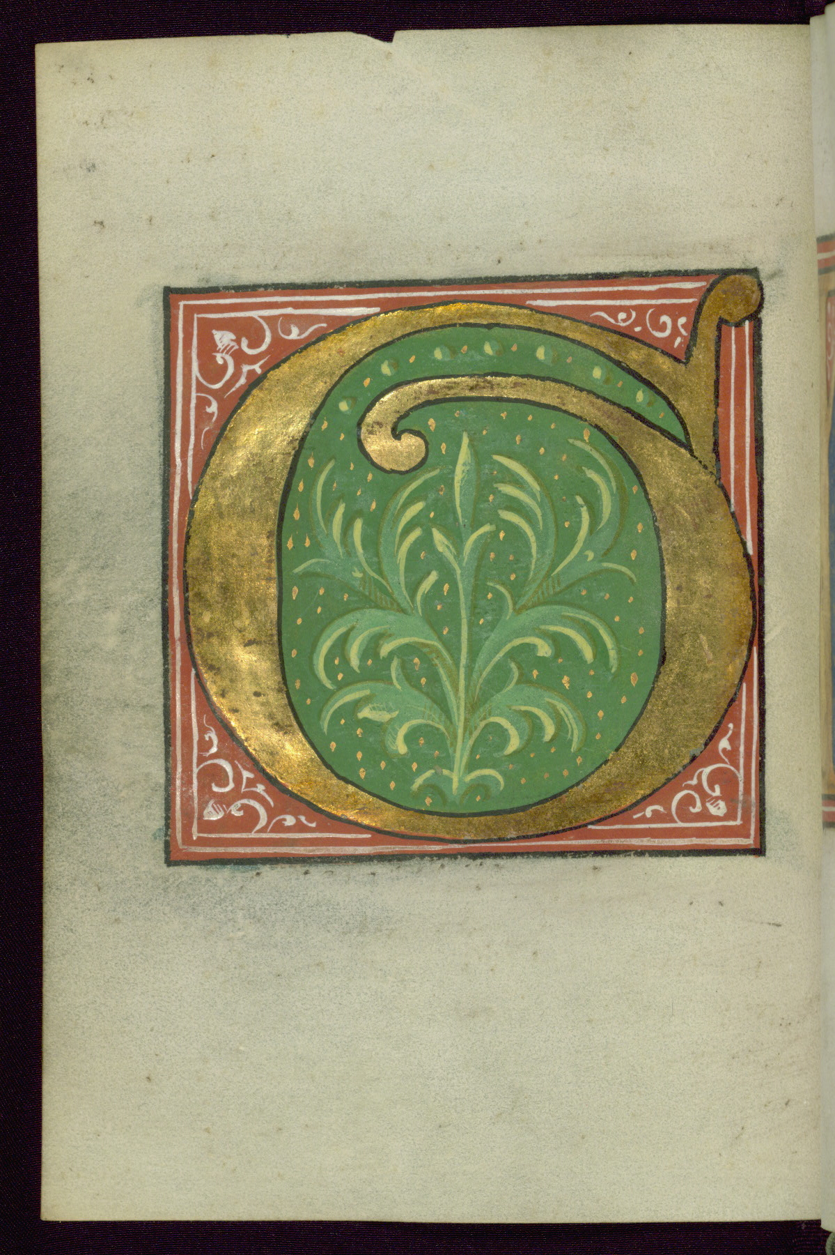 - Decoration note: Twenty-four illuminated letters of the medieval alphabet (excludes J and V) in two alternating styles; Style 1: found on fols. 7v-8r, 9v-10r, etc.; stylistically tied to French 16th century illuminations; blue or rose initials with white patterning, ending in blue, orange, or rose foliate terminals, outlined in black, on black-outlined backgrounds of burnished and/or liquid gold, two or four green disks in corners of the background, infill of naturalistic flowers and fruits; Style 2: found on fols. 8v-9r, 10v-11r, etc.; stylistically tied to Dutch 15th century initials; burnished gold intials with lobed terminals, outlined in black, backgrounds in blue and deep red with white foliate patterning, floral motifs in some infills with lead tin yellow and malachite green detailing; Impression from a rectangular plaque in the front endleaves, showing a seated nimbed figure, possibly the Virgin Mary and Christ child