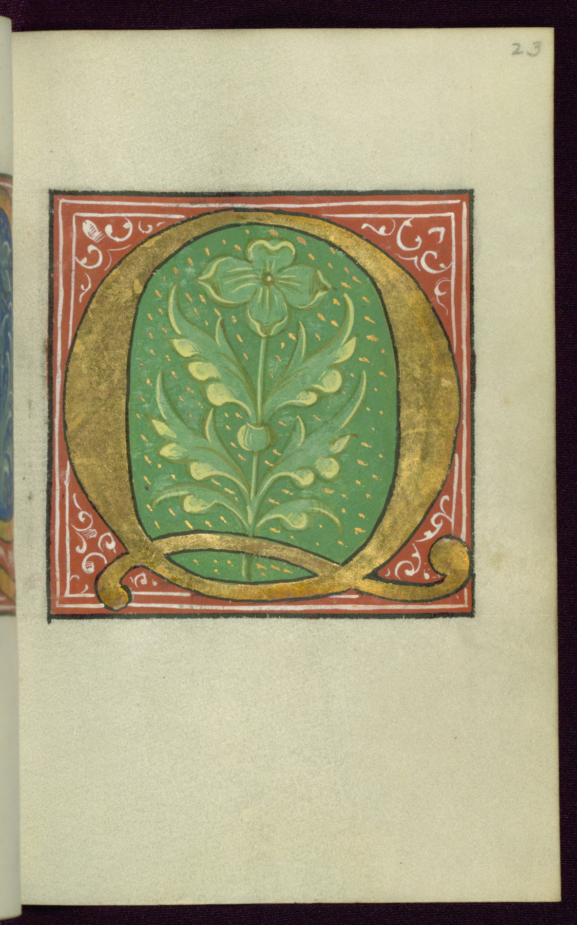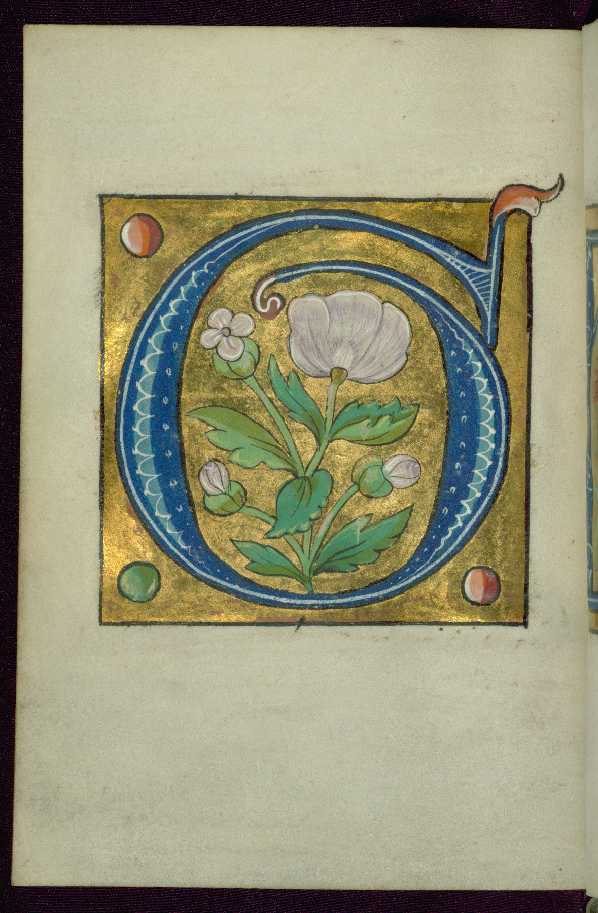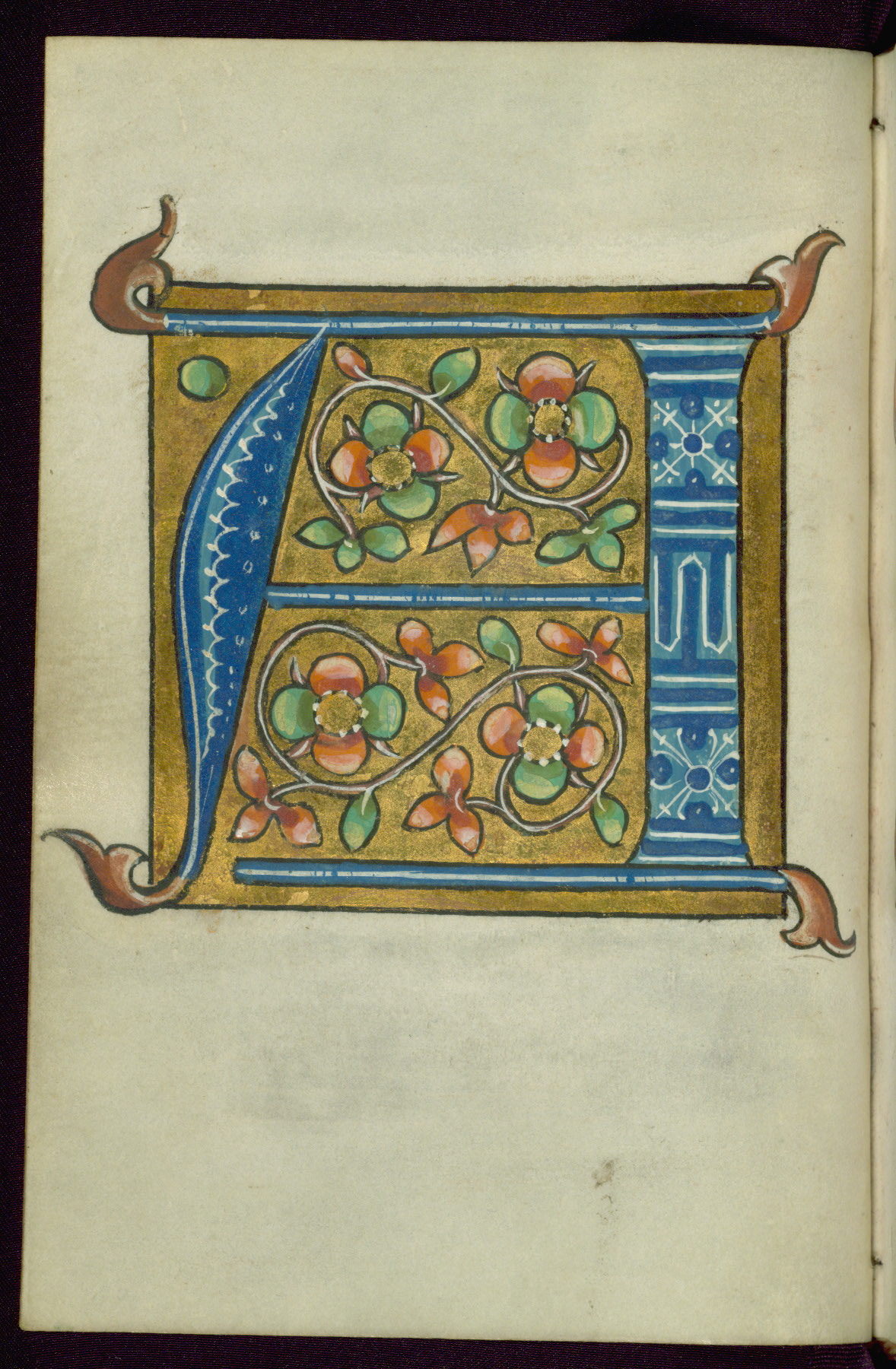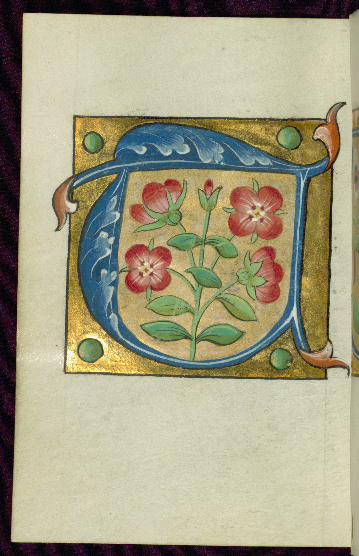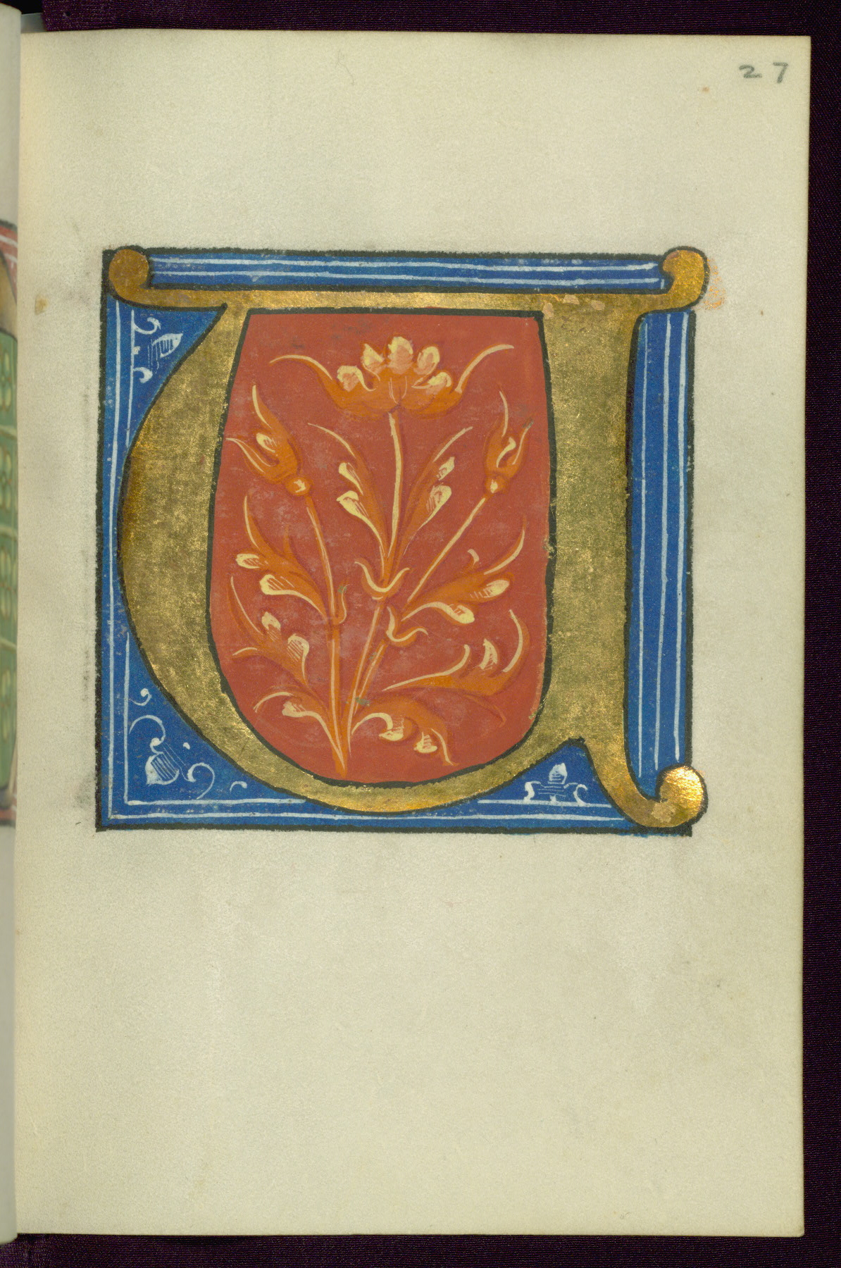 - Decoration note: Twenty-four illuminated letters of the medieval alphabet (excludes J and V) in two alternating styles; Style 1: found on fols. 7v-8r, 9v-10r, etc.; stylistically tied to French 16th century illuminations; blue or rose initials with white patterning, ending in blue, orange, or rose foliate terminals, outlined in black, on black-outlined backgrounds of burnished and/or liquid gold, two or four green disks in corners of the background, infill of naturalistic flowers and fruits; Style 2: found on fols. 8v-9r, 10v-11r, etc.; stylistically tied to Dutch 15th century initials; burnished gold intials with lobed terminals, outlined in black, backgrounds in blue and deep red with white foliate patterning, floral motifs in some infills with lead tin yellow and malachite green detailing; Impression from a rectangular plaque in the front endleaves, showing a seated nimbed figure, possibly the Virgin Mary and Christ child