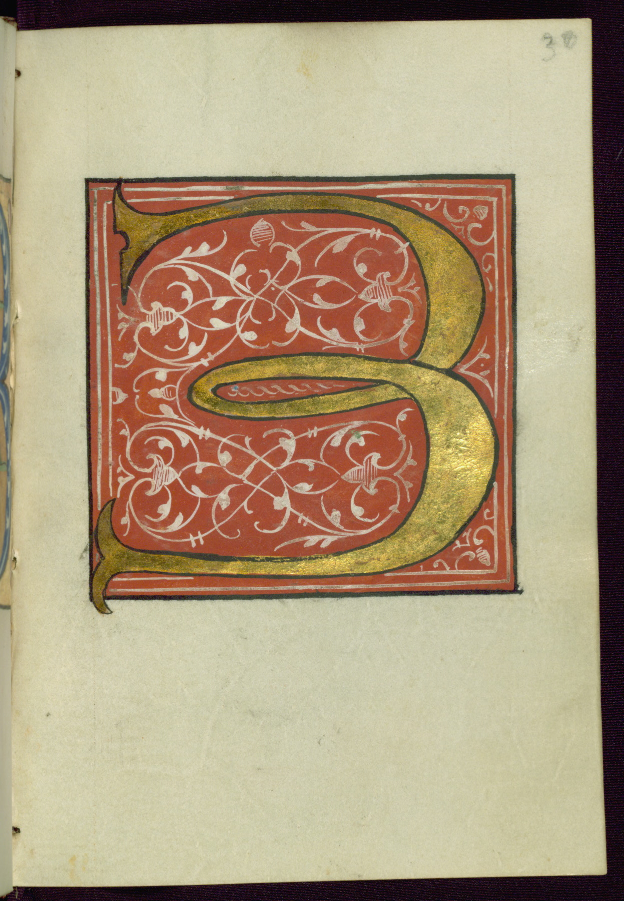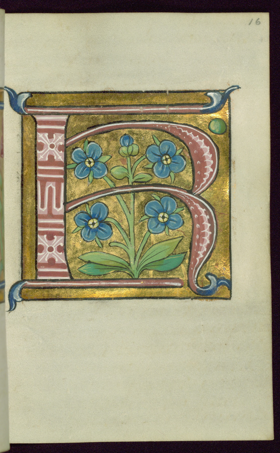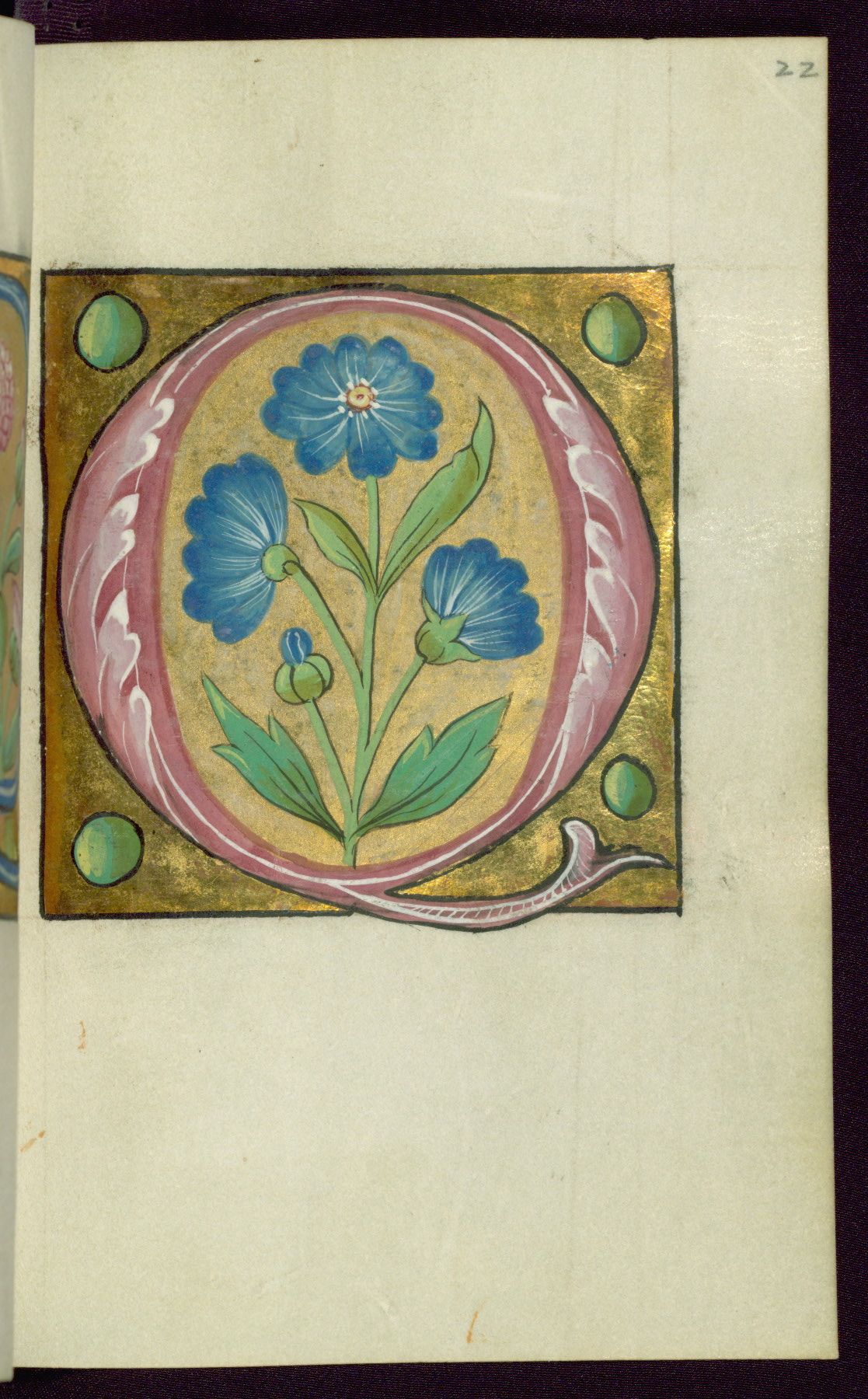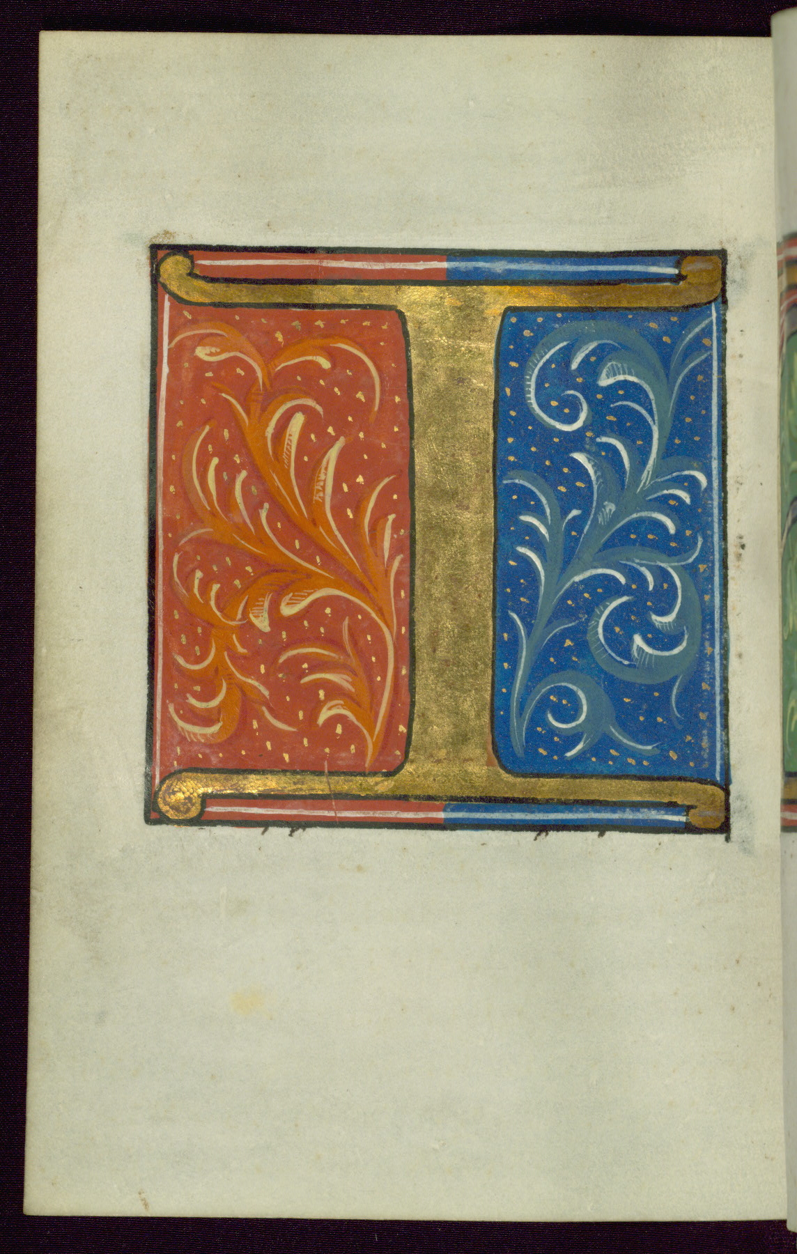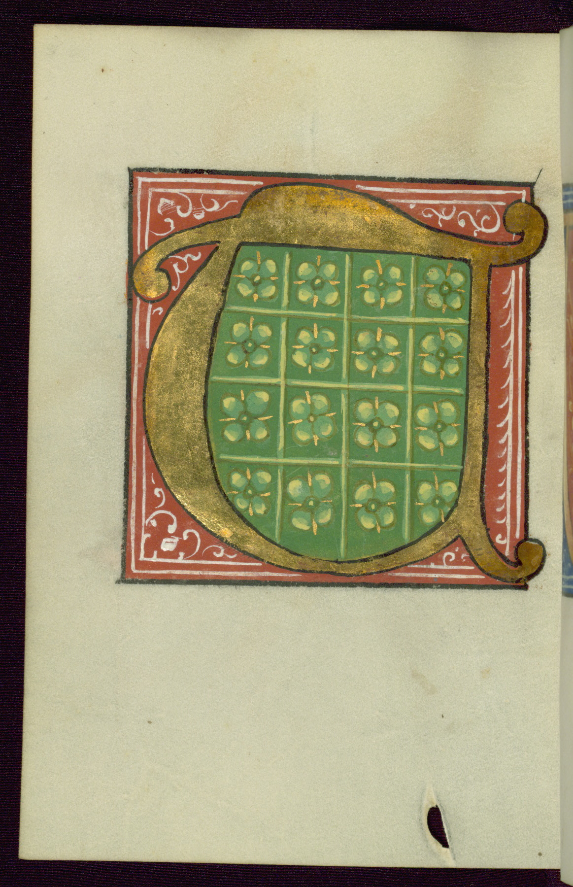 - Decoration note: Twenty-four illuminated letters of the medieval alphabet (excludes J and V) in two alternating styles; Style 1: found on fols. 7v-8r, 9v-10r, etc.; stylistically tied to French 16th century illuminations; blue or rose initials with white patterning, ending in blue, orange, or rose foliate terminals, outlined in black, on black-outlined backgrounds of burnished and/or liquid gold, two or four green disks in corners of the background, infill of naturalistic flowers and fruits; Style 2: found on fols. 8v-9r, 10v-11r, etc.; stylistically tied to Dutch 15th century initials; burnished gold intials with lobed terminals, outlined in black, backgrounds in blue and deep red with white foliate patterning, floral motifs in some infills with lead tin yellow and malachite green detailing; Impression from a rectangular plaque in the front endleaves, showing a seated nimbed figure, possibly the Virgin Mary and Christ child