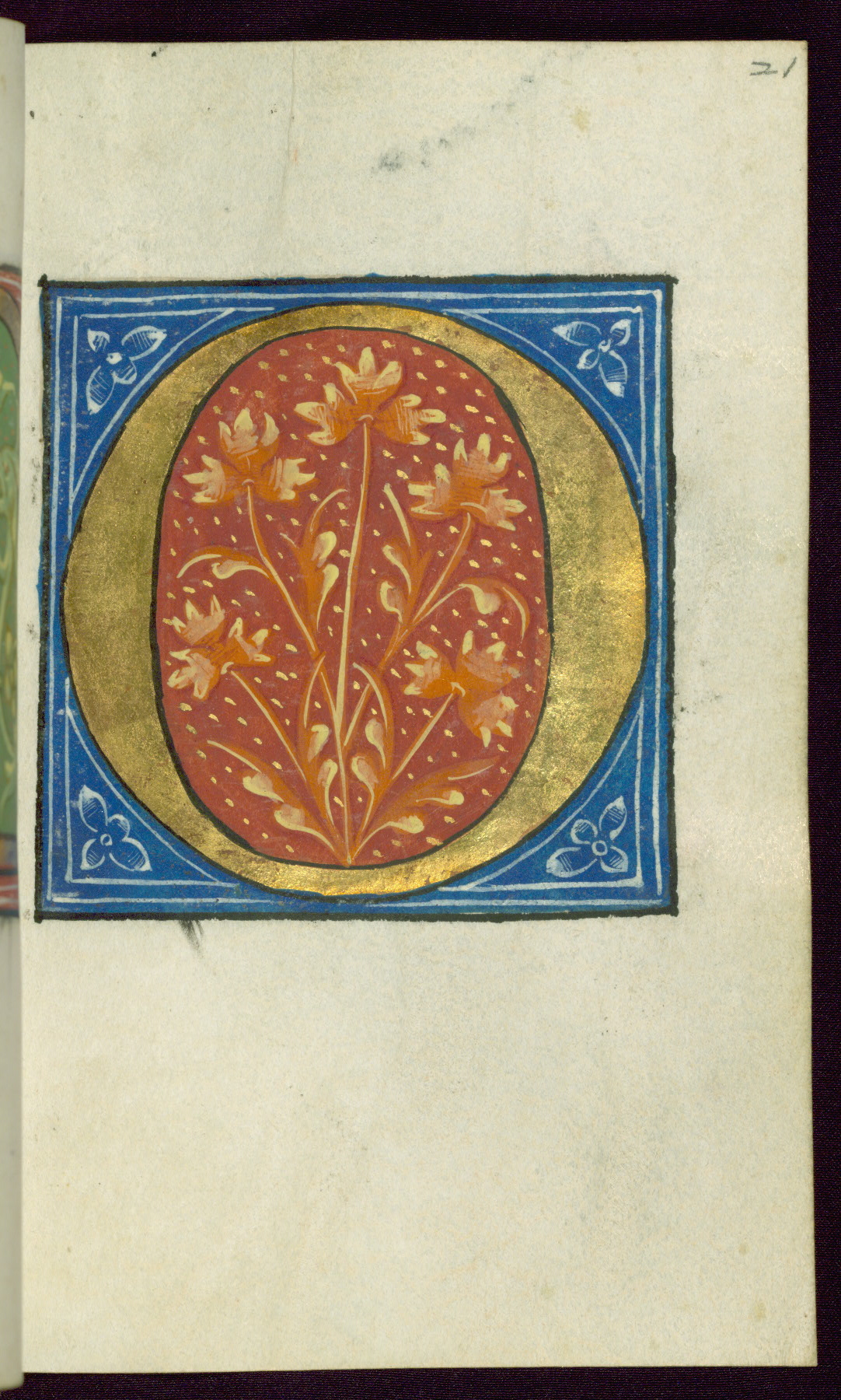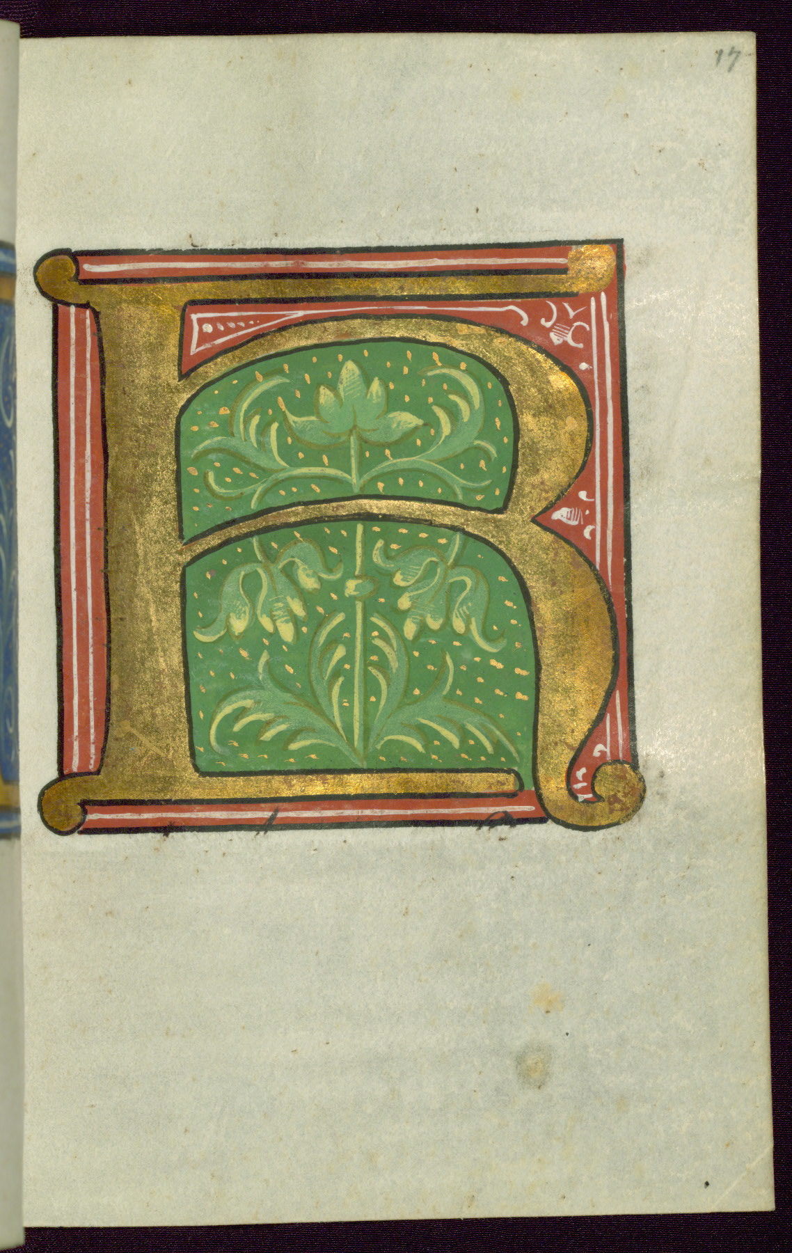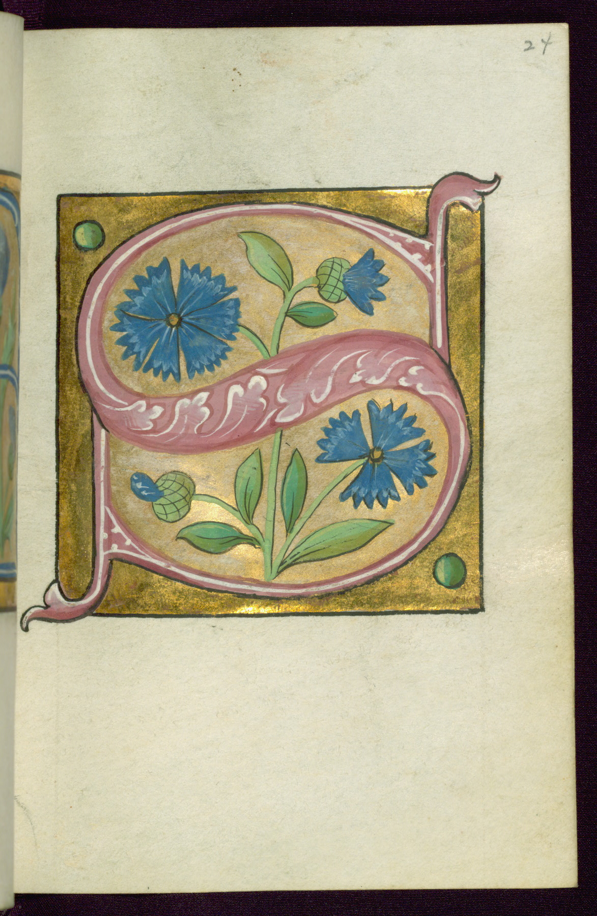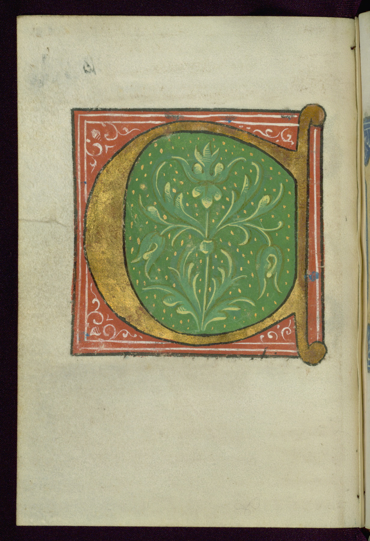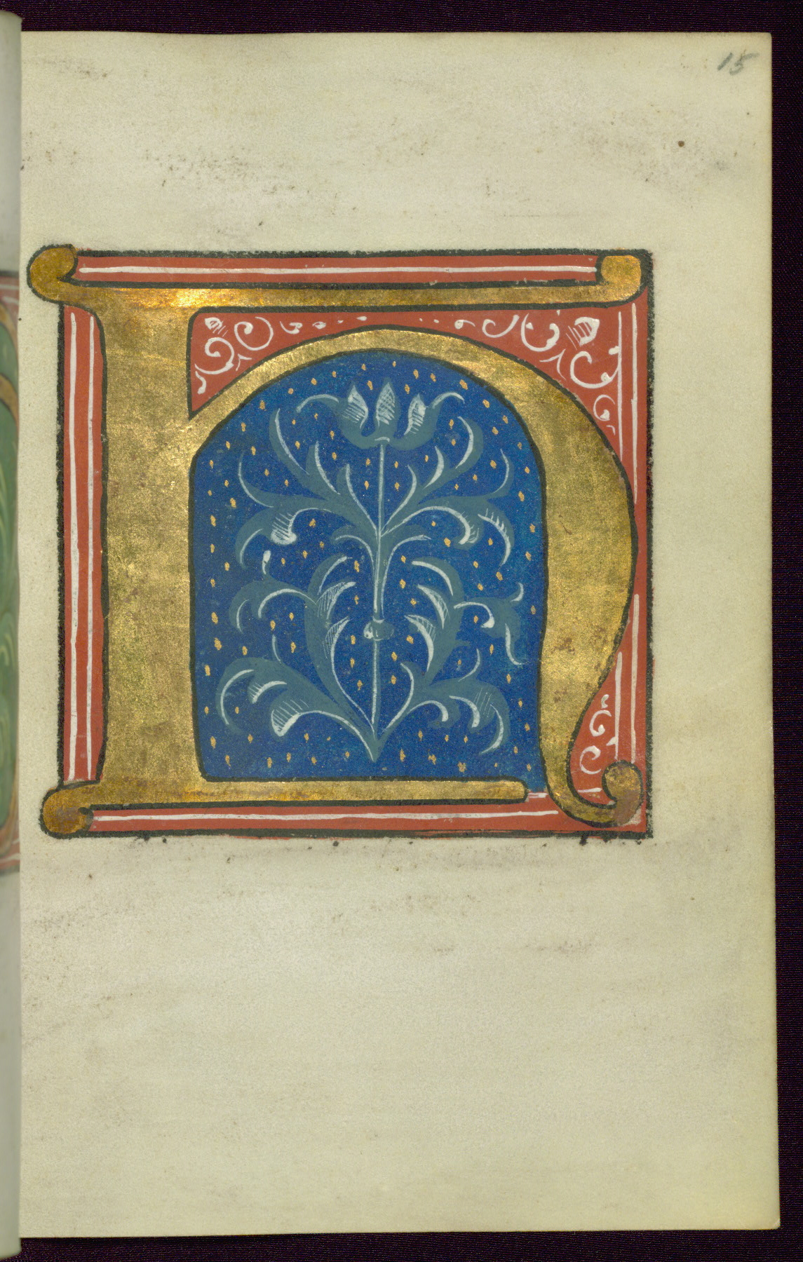 - Decoration note: Twenty-four illuminated letters of the medieval alphabet (excludes J and V) in two alternating styles; Style 1: found on fols. 7v-8r, 9v-10r, etc.; stylistically tied to French 16th century illuminations; blue or rose initials with white patterning, ending in blue, orange, or rose foliate terminals, outlined in black, on black-outlined backgrounds of burnished and/or liquid gold, two or four green disks in corners of the background, infill of naturalistic flowers and fruits; Style 2: found on fols. 8v-9r, 10v-11r, etc.; stylistically tied to Dutch 15th century initials; burnished gold intials with lobed terminals, outlined in black, backgrounds in blue and deep red with white foliate patterning, floral motifs in some infills with lead tin yellow and malachite green detailing; Impression from a rectangular plaque in the front endleaves, showing a seated nimbed figure, possibly the Virgin Mary and Christ child