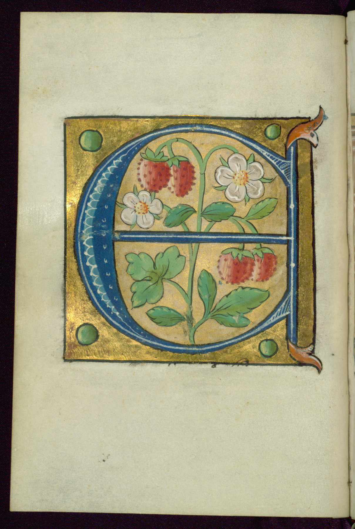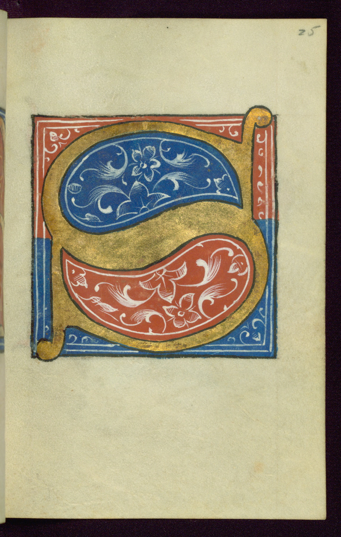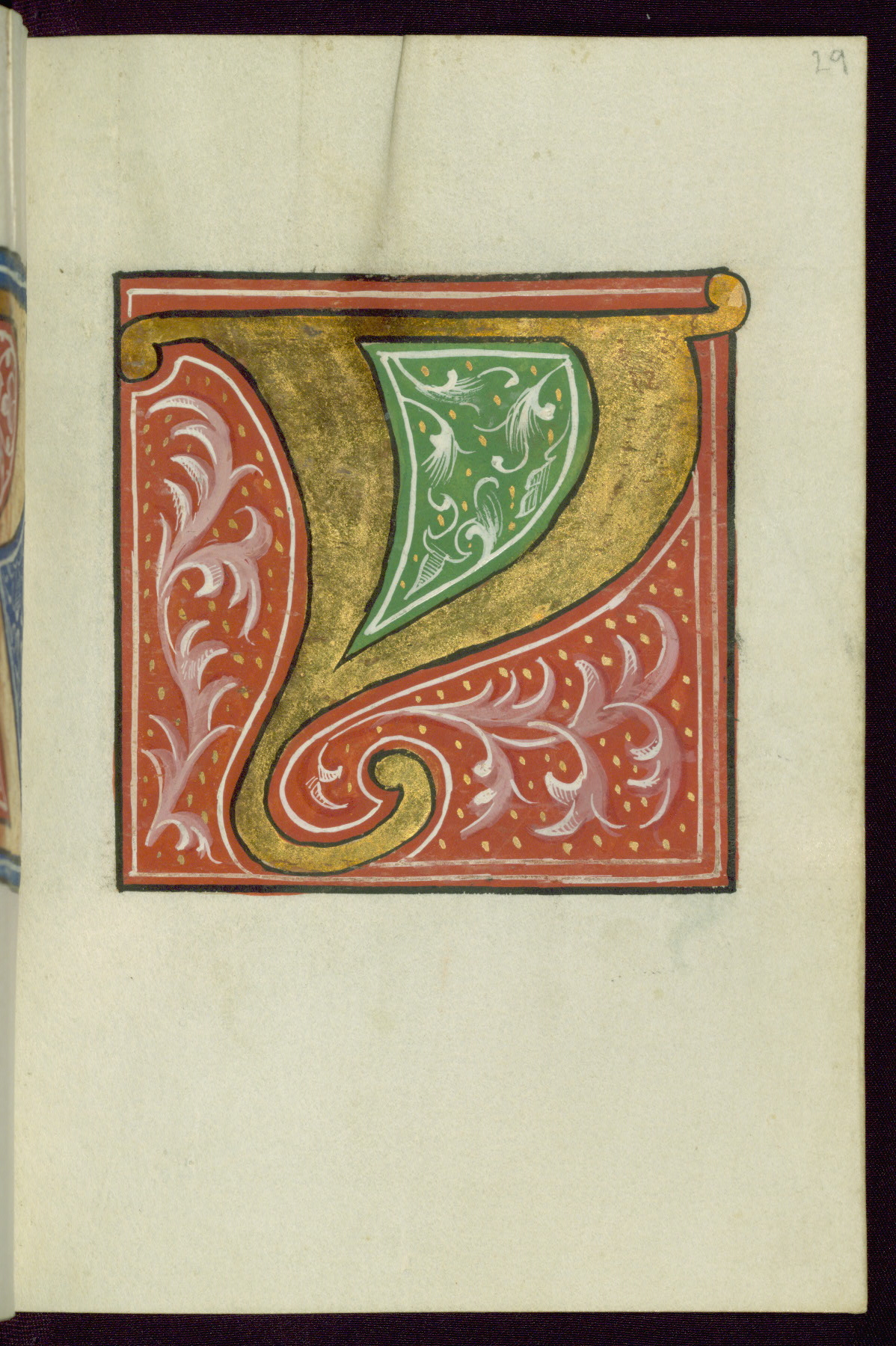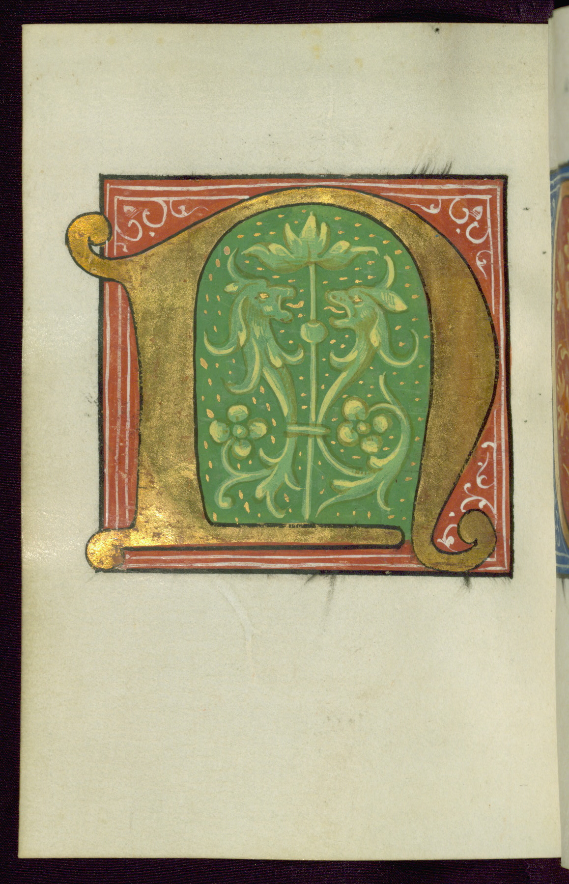 - Decoration note: Twenty-four illuminated letters of the medieval alphabet (excludes J and V) in two alternating styles; Style 1: found on fols. 7v-8r, 9v-10r, etc.; stylistically tied to French 16th century illuminations; blue or rose initials with white patterning, ending in blue, orange, or rose foliate terminals, outlined in black, on black-outlined backgrounds of burnished and/or liquid gold, two or four green disks in corners of the background, infill of naturalistic flowers and fruits; Style 2: found on fols. 8v-9r, 10v-11r, etc.; stylistically tied to Dutch 15th century initials; burnished gold intials with lobed terminals, outlined in black, backgrounds in blue and deep red with white foliate patterning, floral motifs in some infills with lead tin yellow and malachite green detailing; Impression from a rectangular plaque in the front endleaves, showing a seated nimbed figure, possibly the Virgin Mary and Christ child